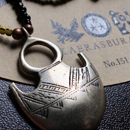 中央の革紐部分にアンティークパドレビーズにシルバー、ヤクの歯、アフリカブラスにアンティークのスカンクビーズ、ベル、バナナの種、アンティークシードビーズ、留め部分にカレンシルバーを使用したtribalネッ...