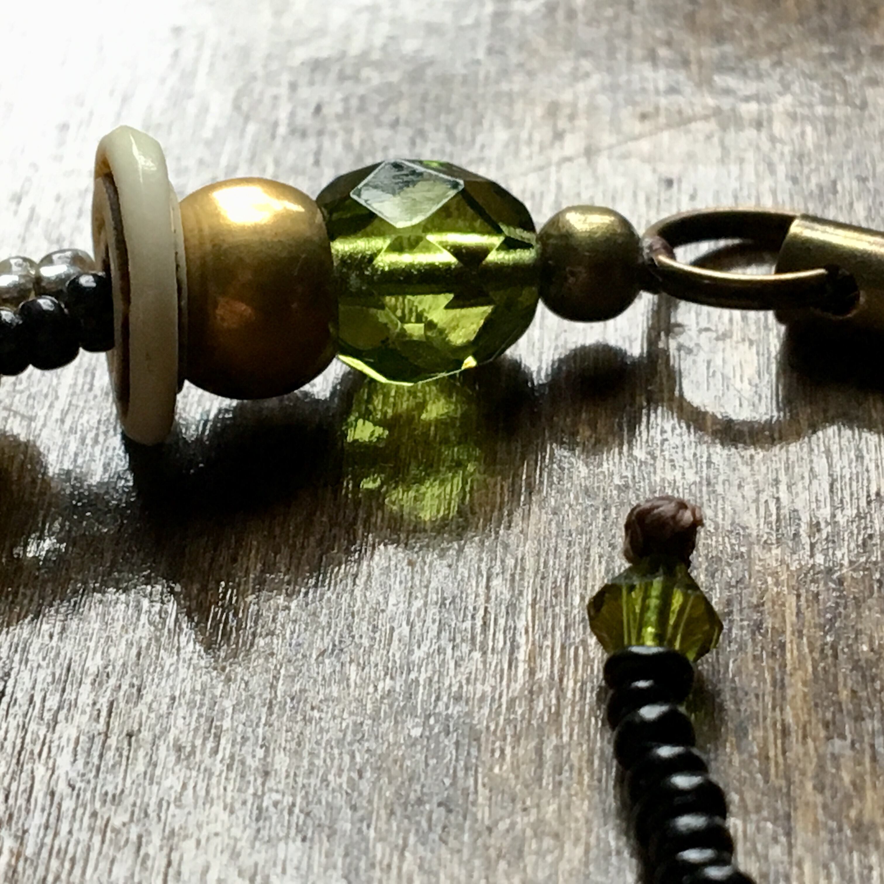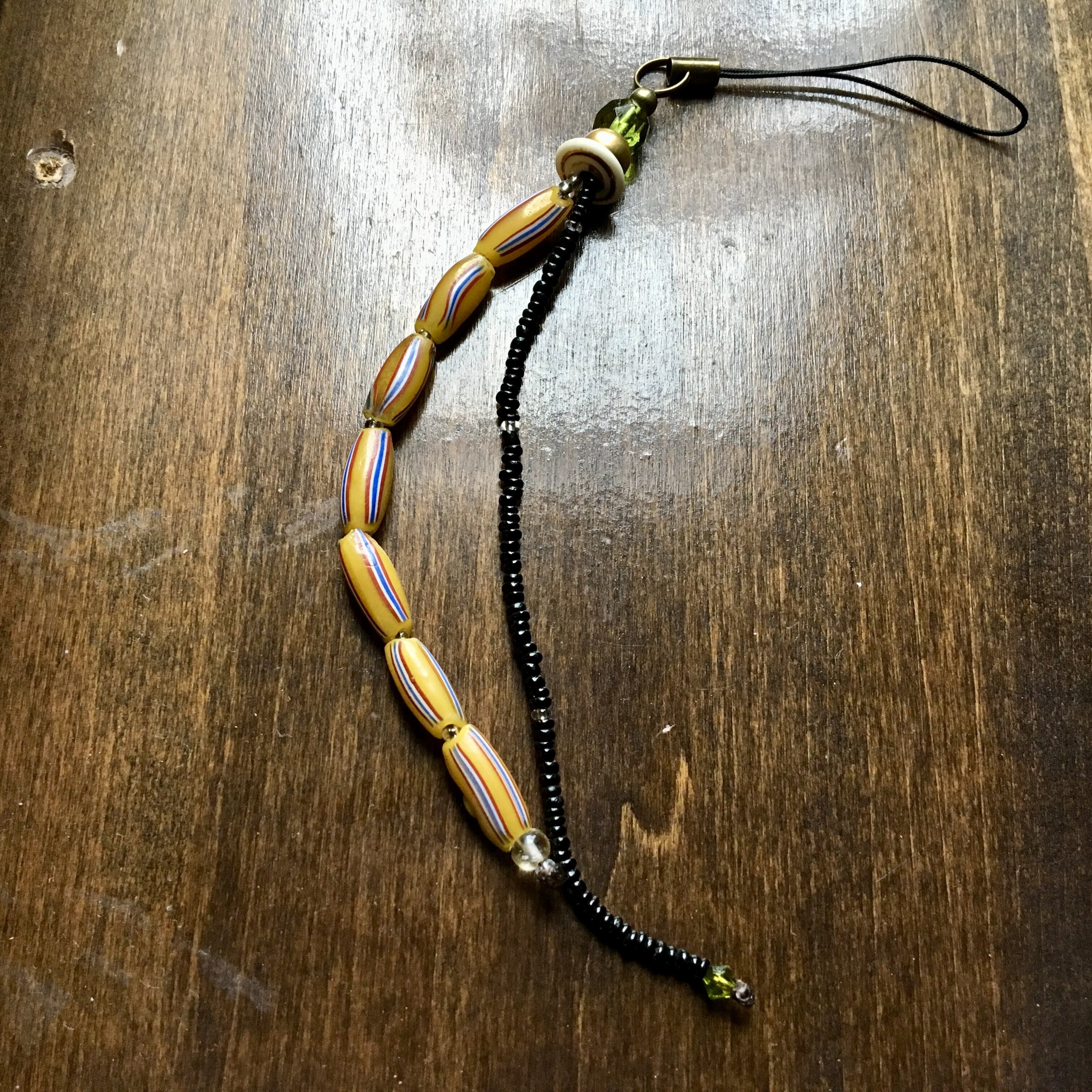 アンティークビーズの筋玉にシードビーズ、ヴィンテージのグリーンビーズを使用した、2連ストラップになります。