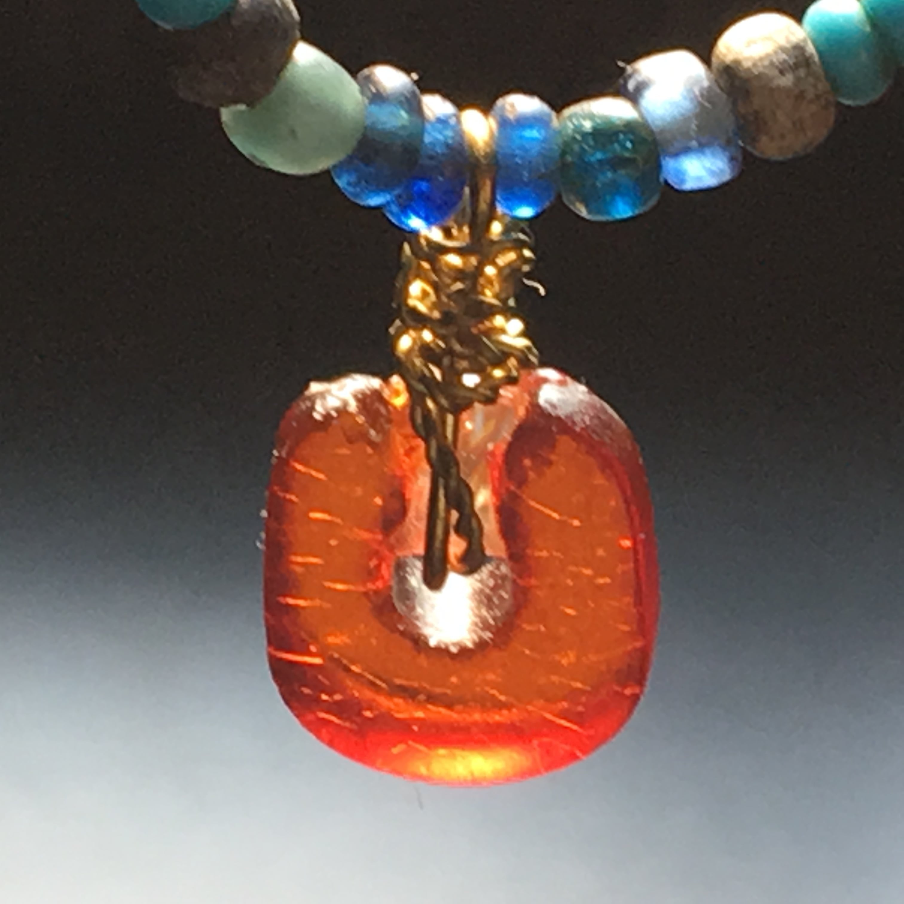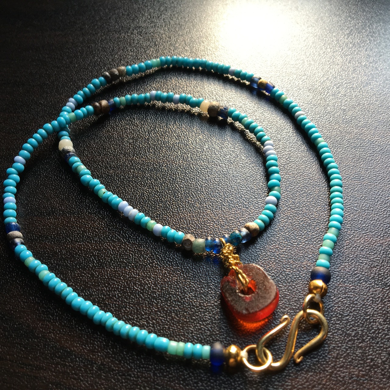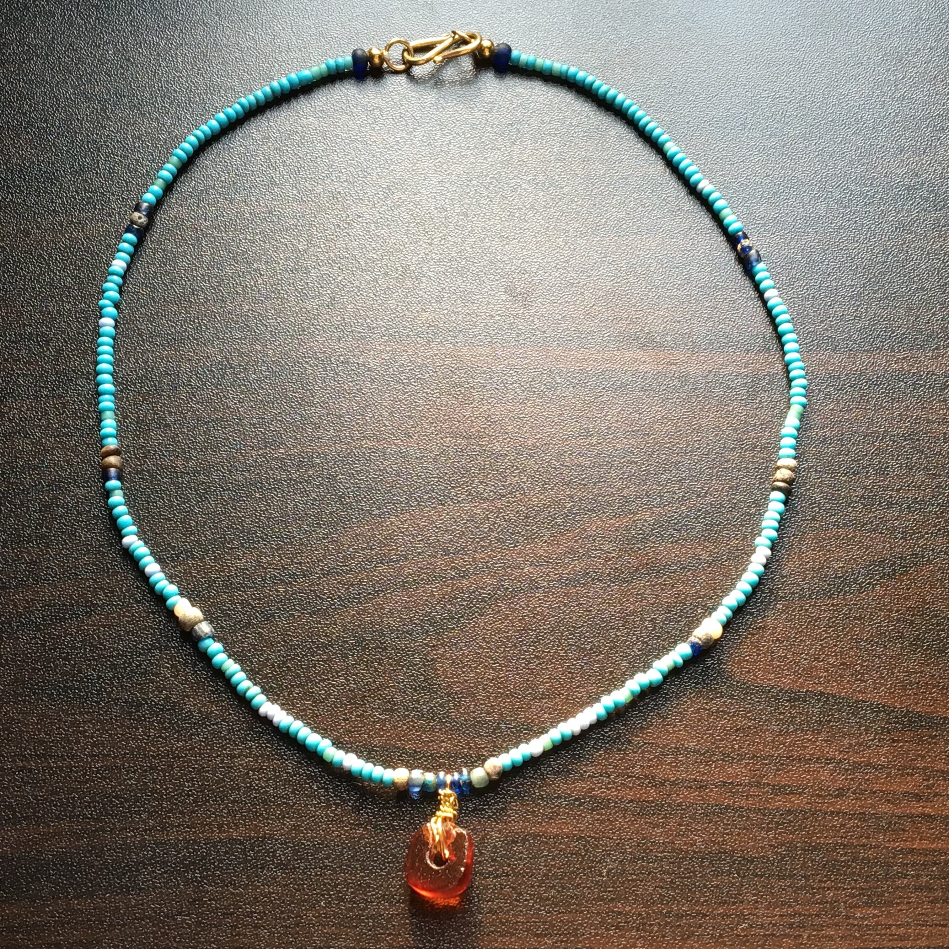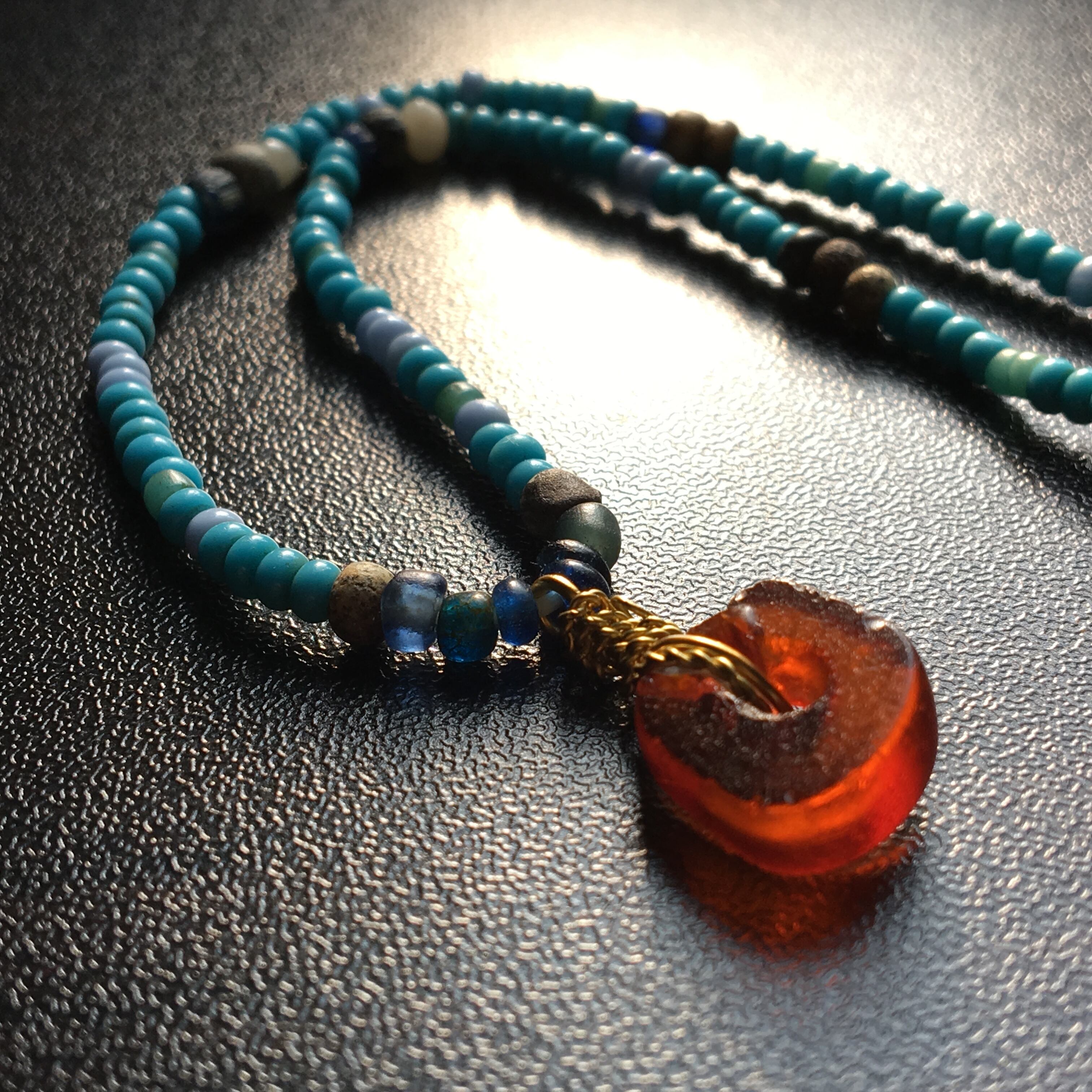 アンティークのシードブルービーズに古代ローマンビーズ、TOPに補修ありのアンティークアンバー琥珀を使用したネックレスに仕上げました。
