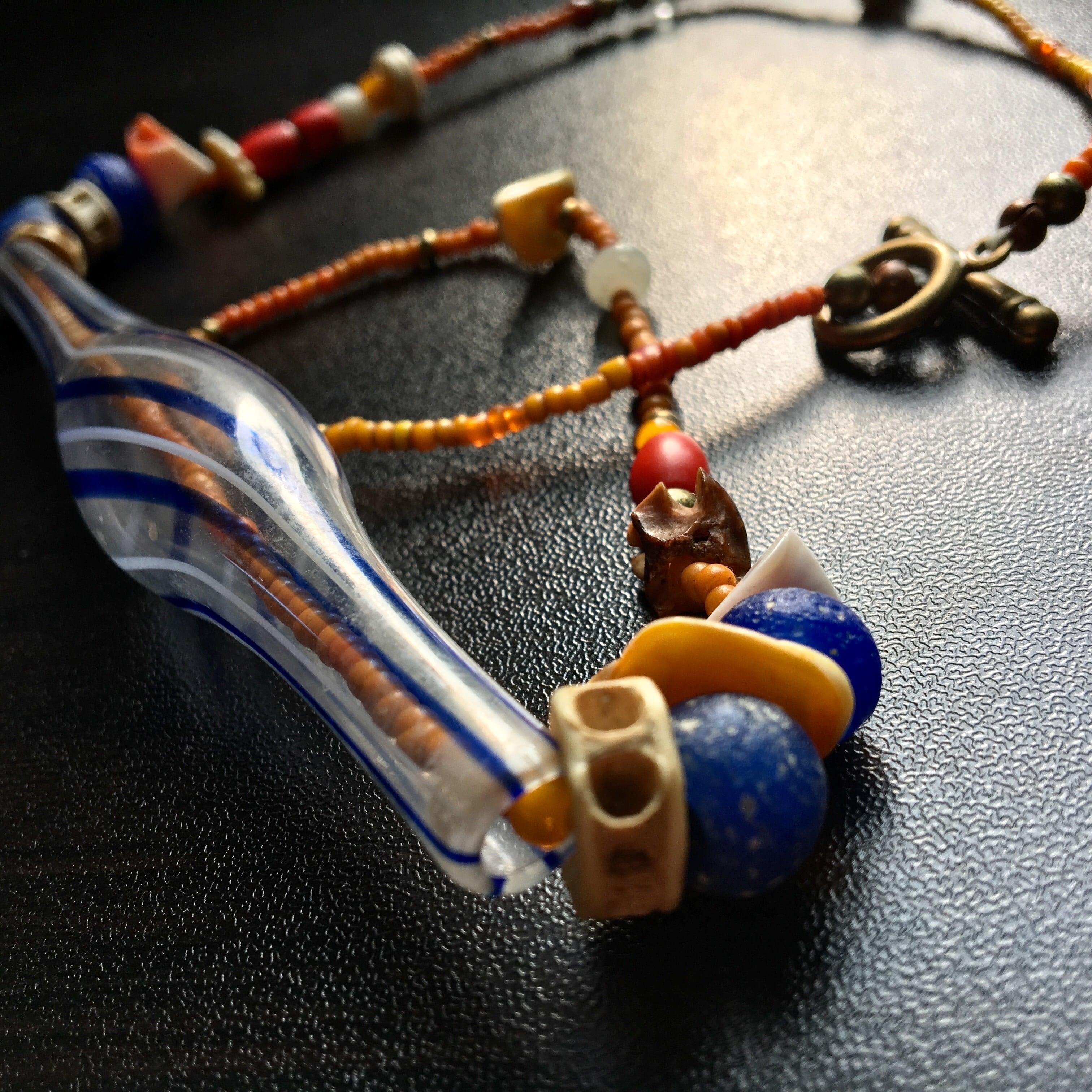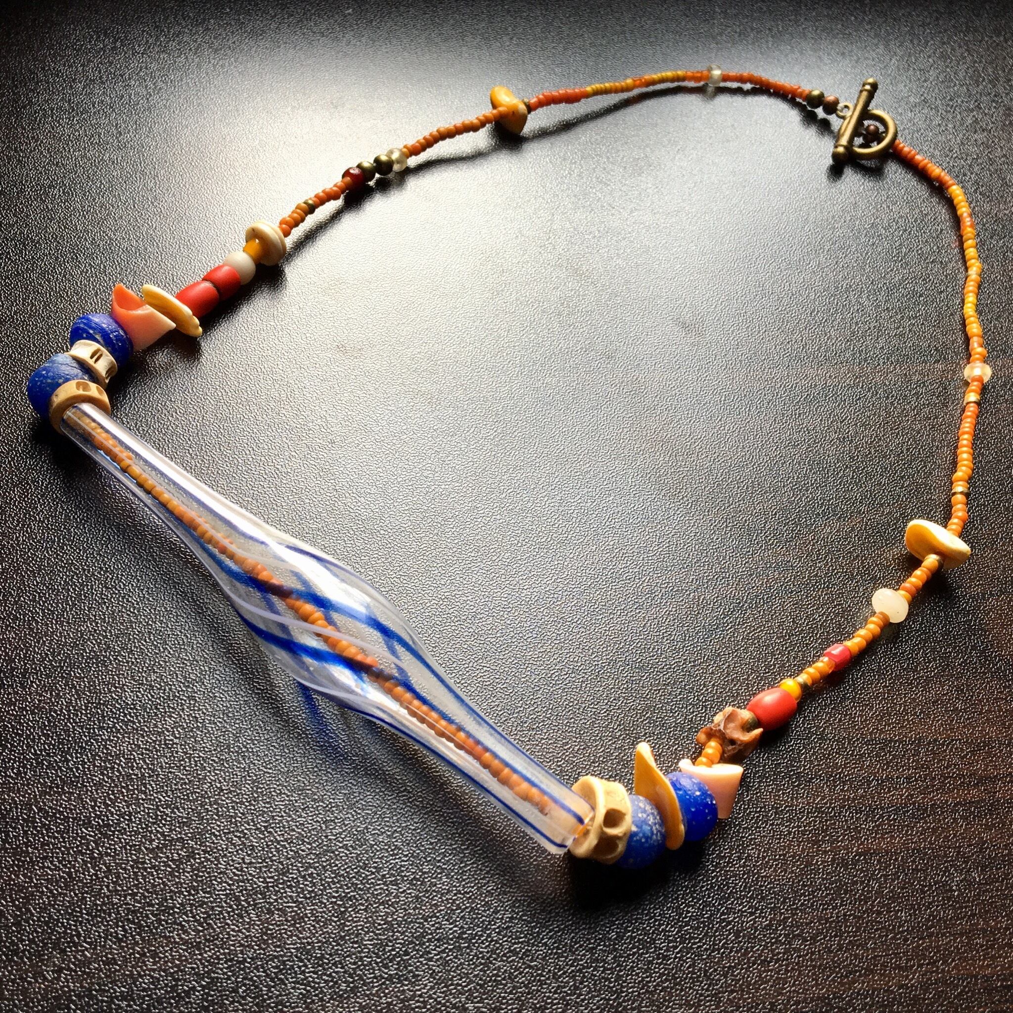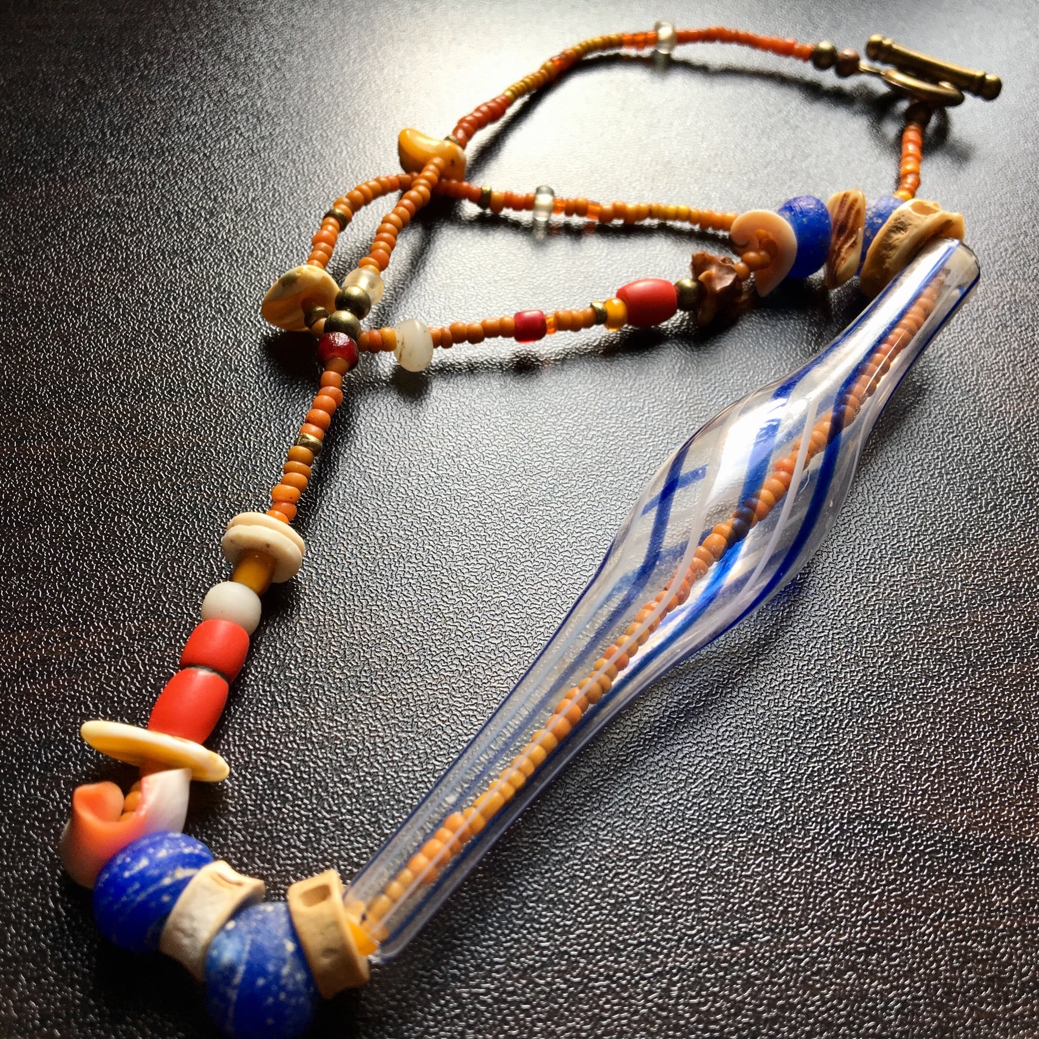 希少なコレクタブルビーズ「ジャックリース」とても美しいフォルムの吹きガラス、ブルーはドゴン族、アフリカヘビ骨、貝、魚の骨、少数民族に伝わったオレンジのシードビーズ、赤色はネパールのタマン族を使用したプリミティブネックレス作品!