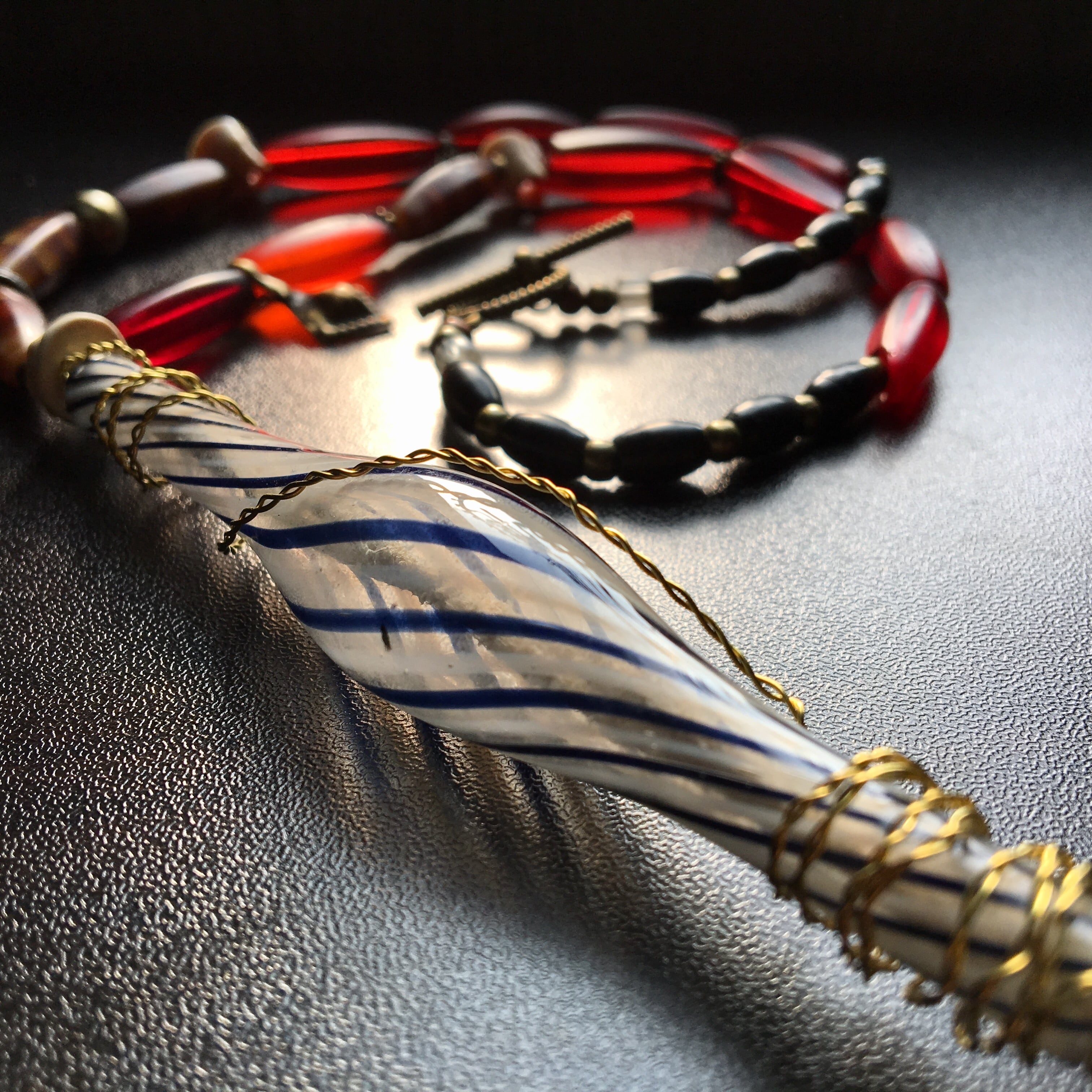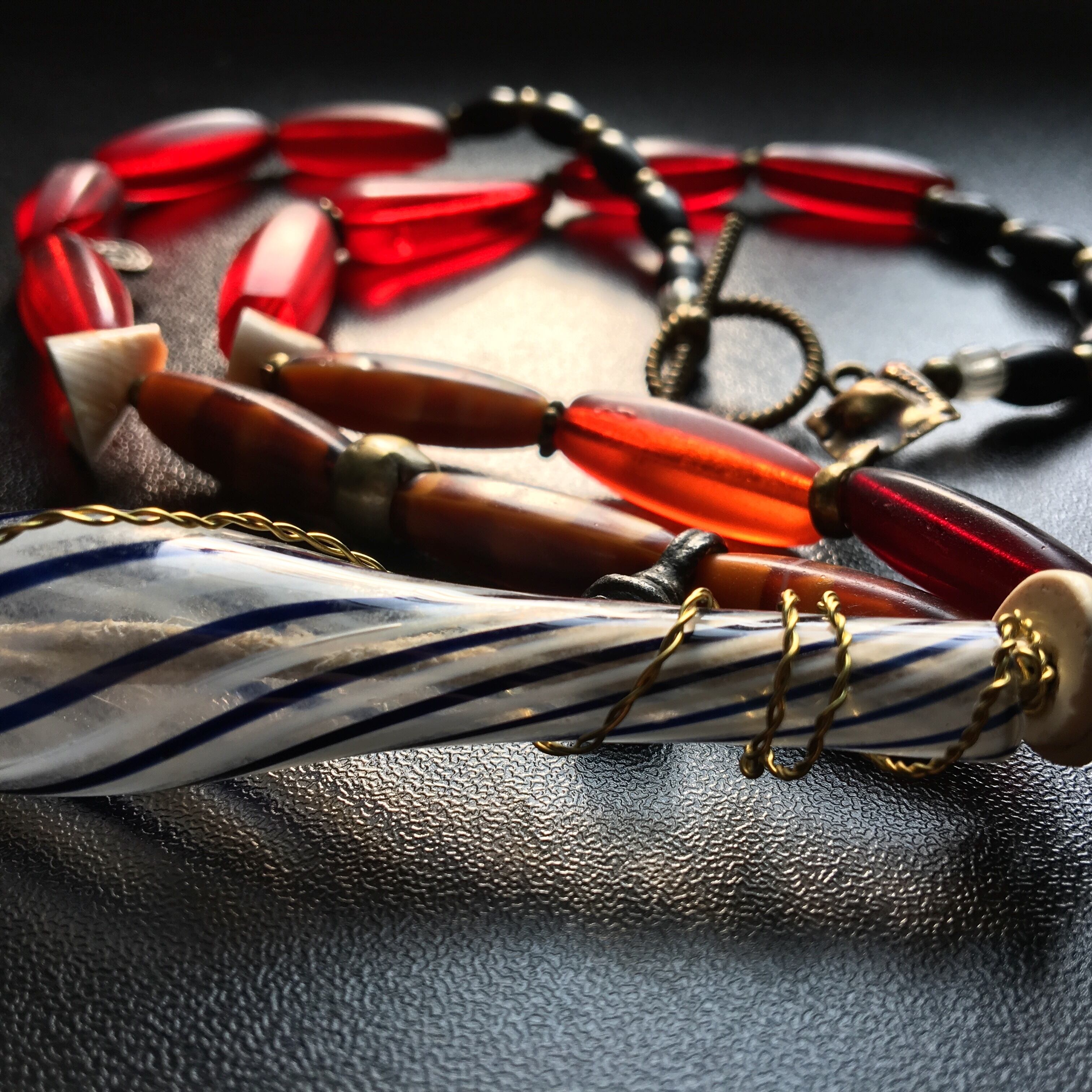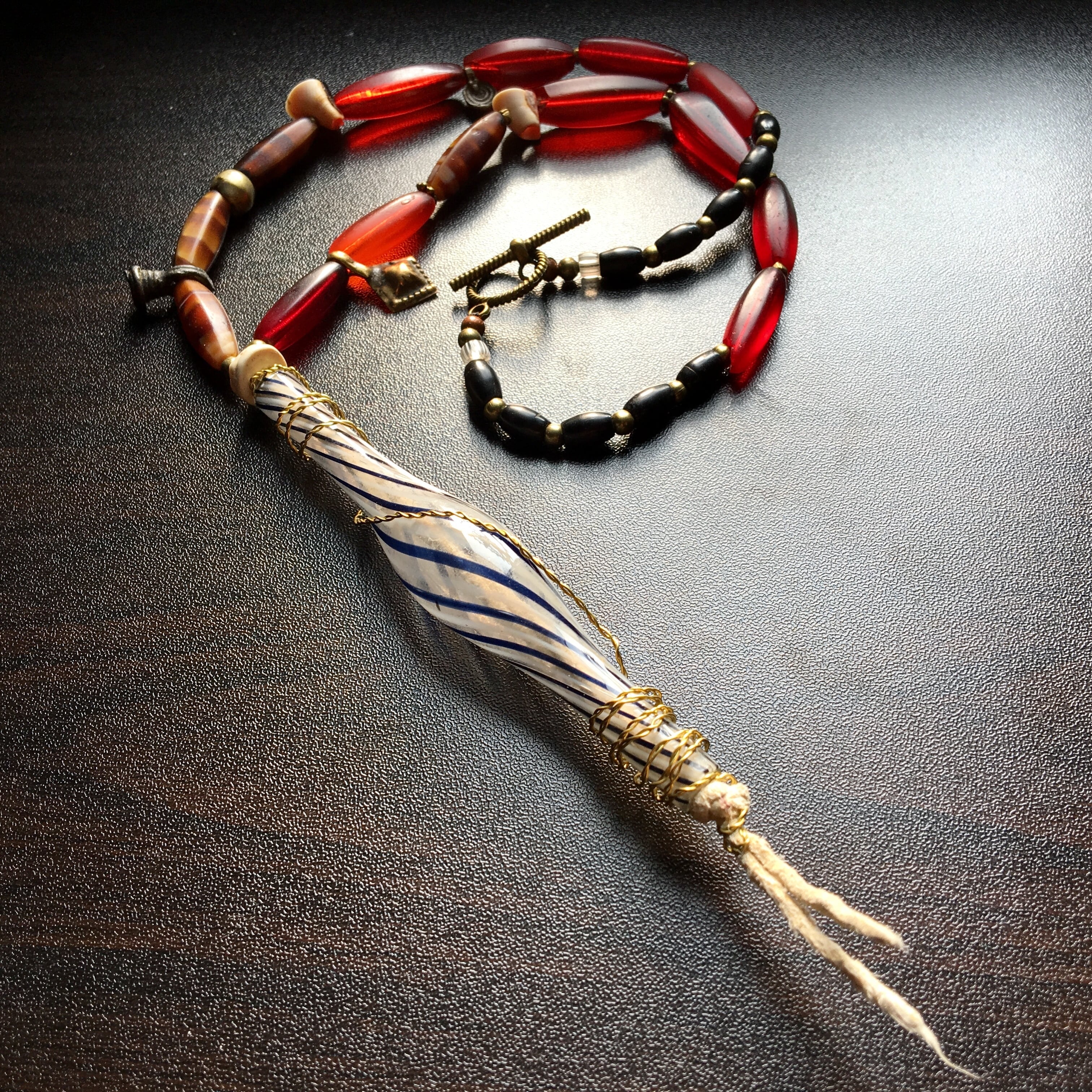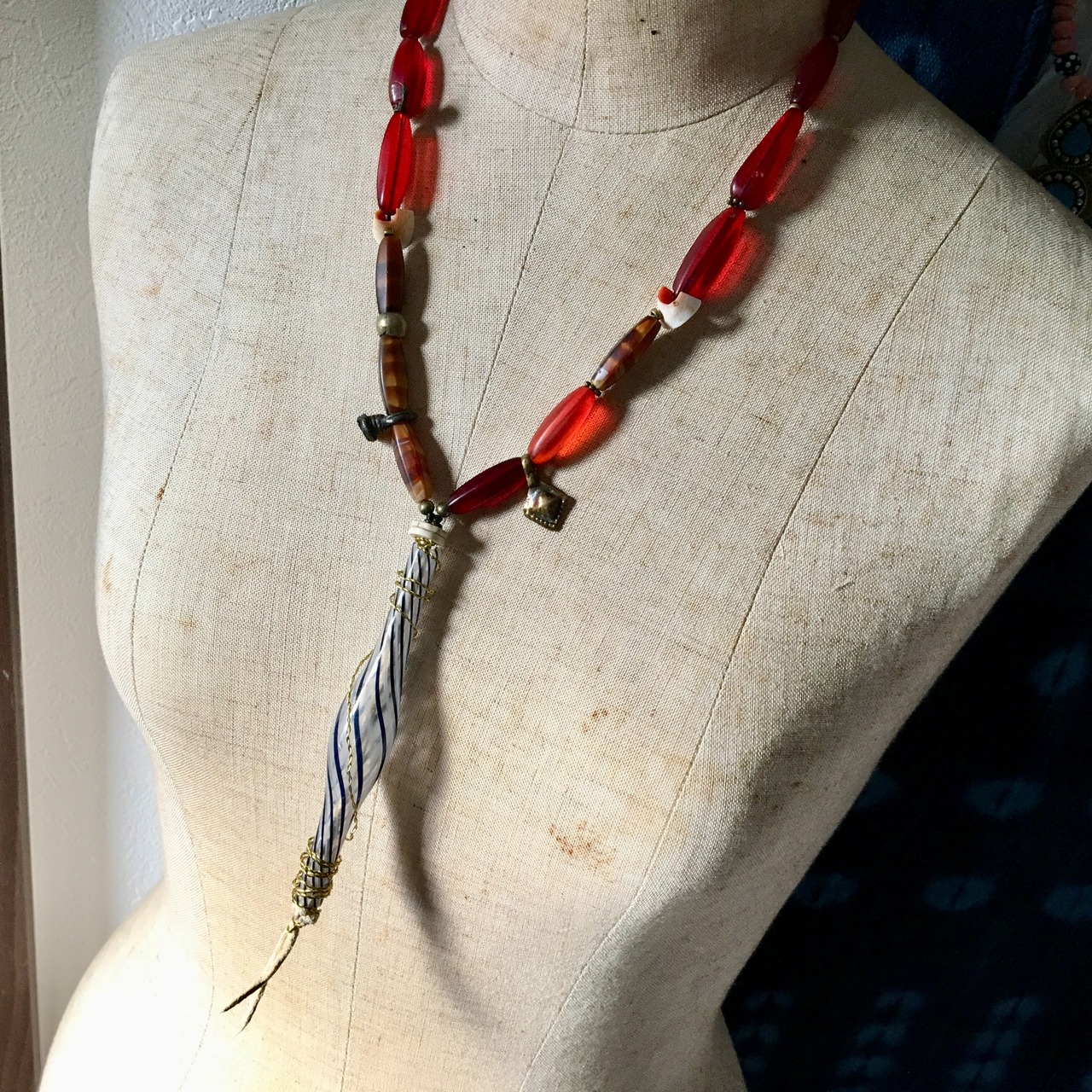 フォルムが美しい吹きガラス、希少なコレクタブルビーズ、ジャックリース(小さなかけ補修あり)にボヘミアの赤が美しいビーズ、貝、チン族ブラスをプラスしたトライバルネックレス!赤を基調としたこの仕様のネックレス、とってもお気に入りです!