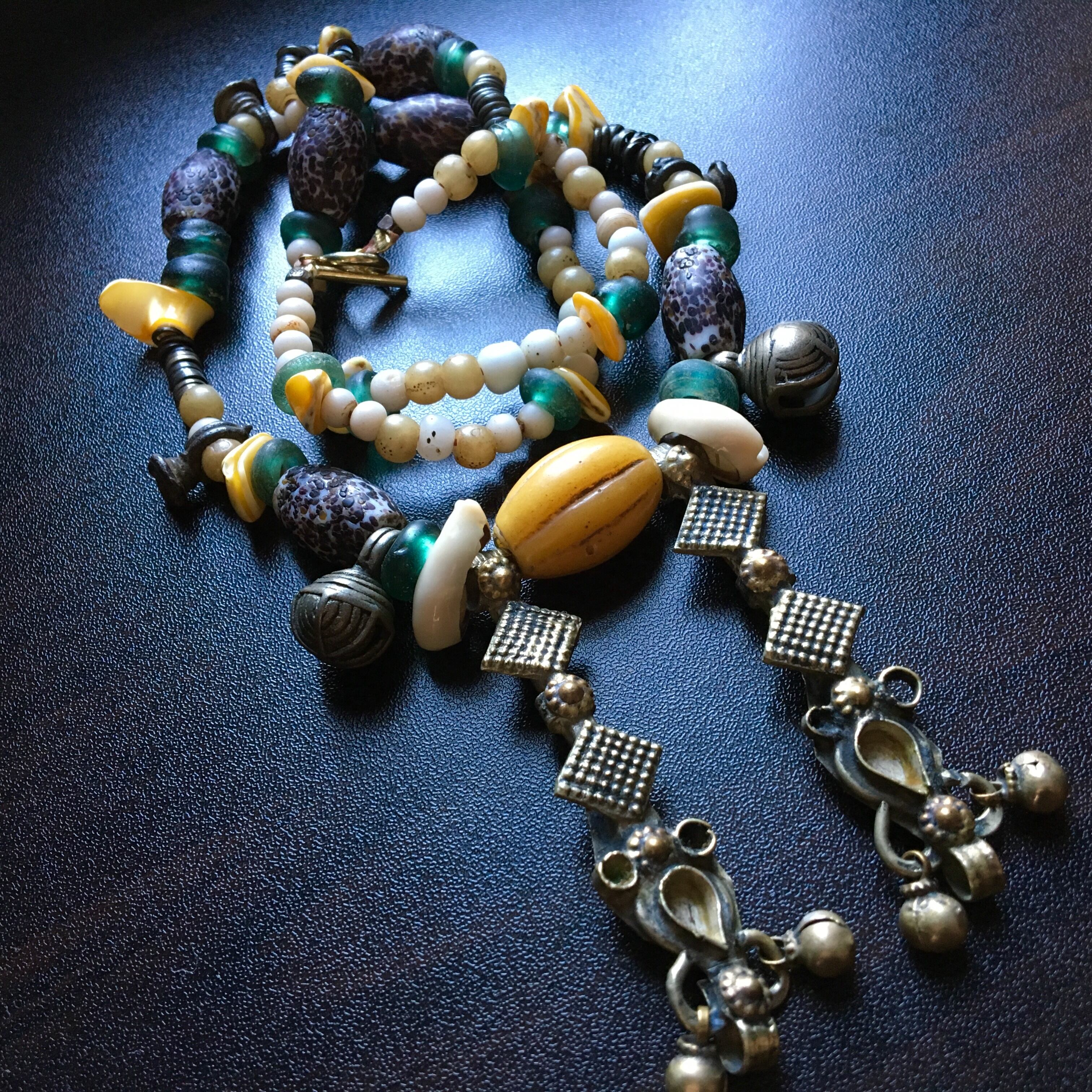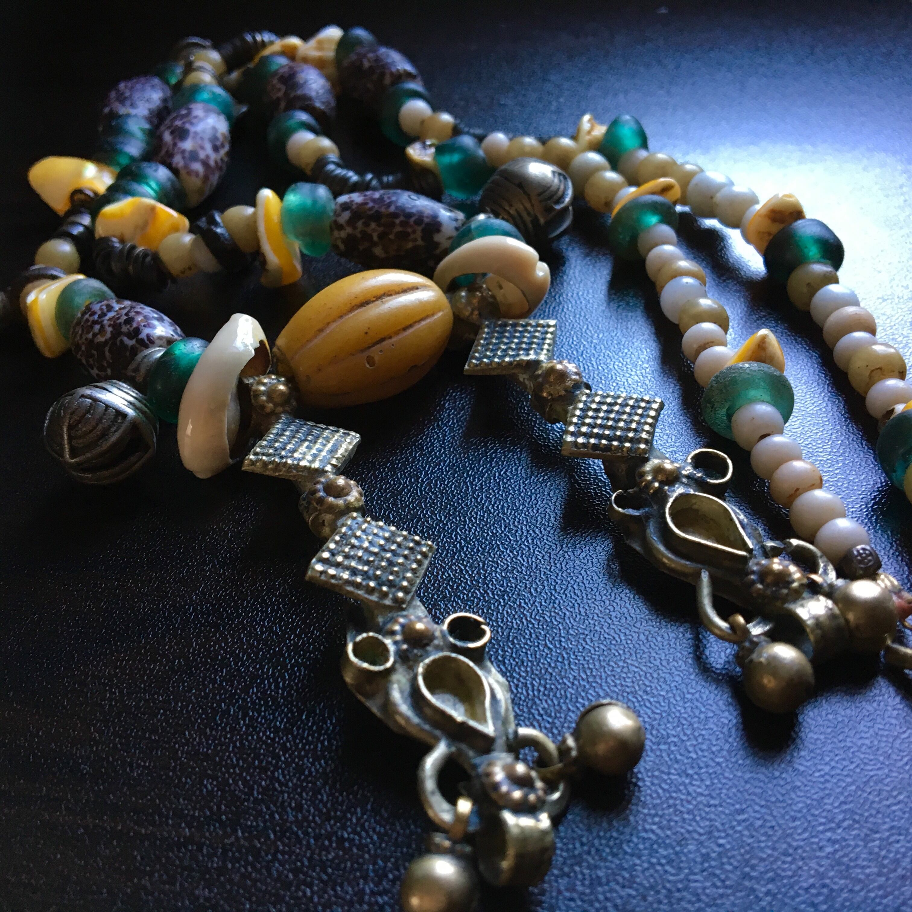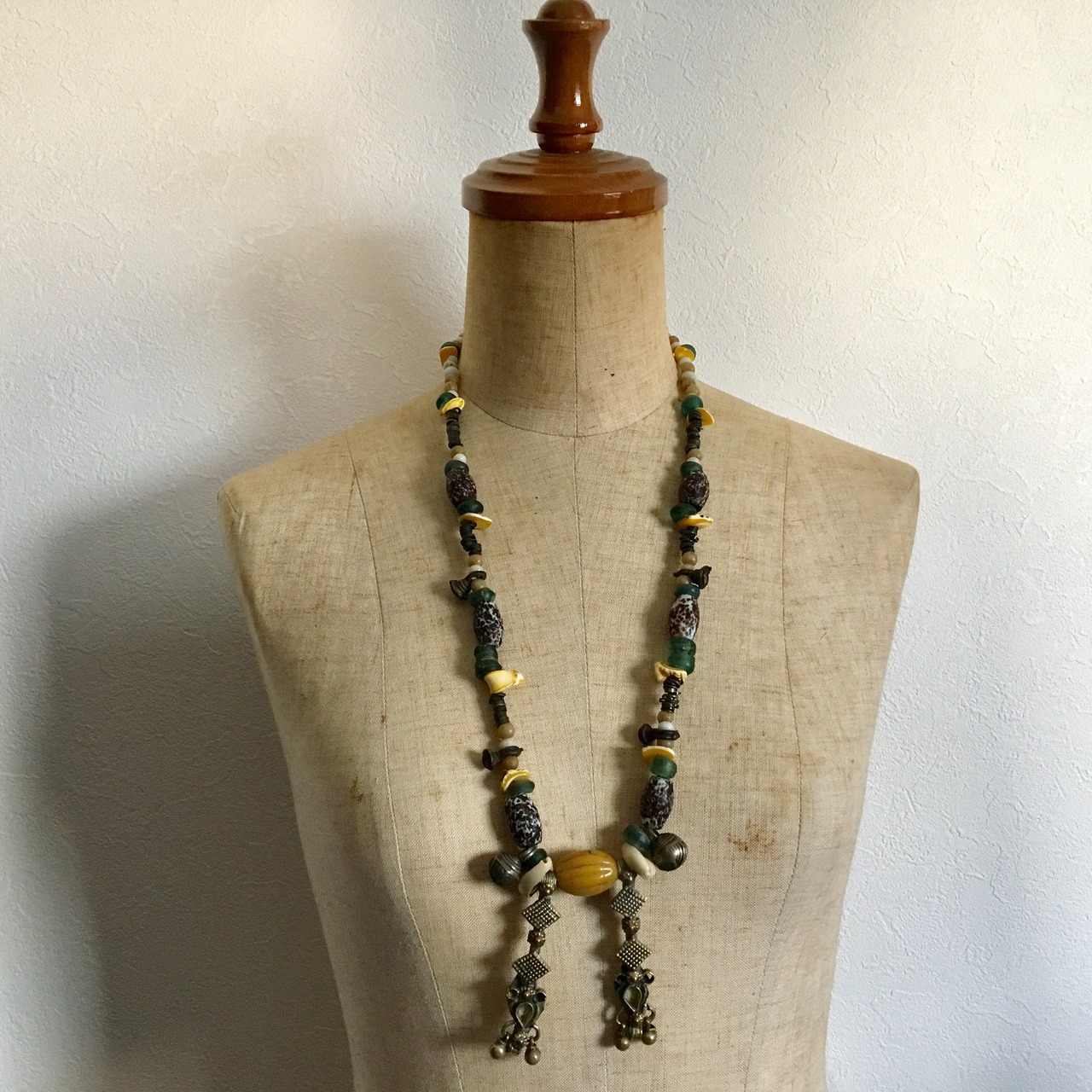 パプアニューギニア渡りのメロン玉にメタルパーツ、チン族ベル、ドゴン族グリーンドーナッツビーズ、白色はタマン族ビーズ、子安貝を使用したトライバルネックレス作品!