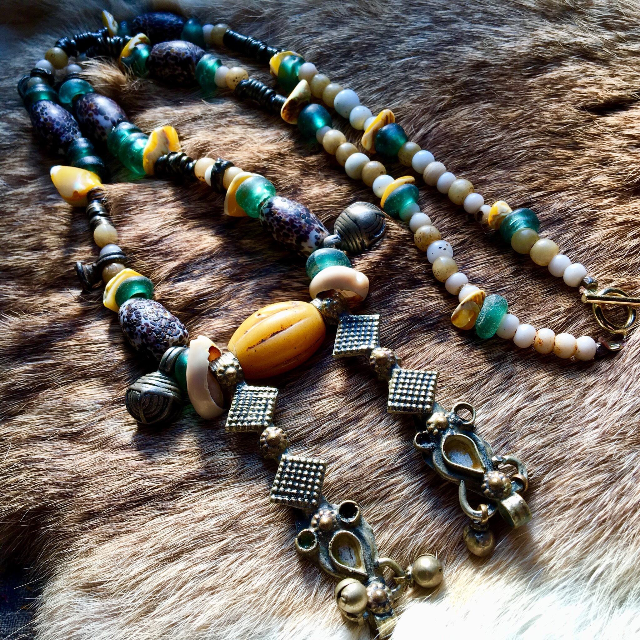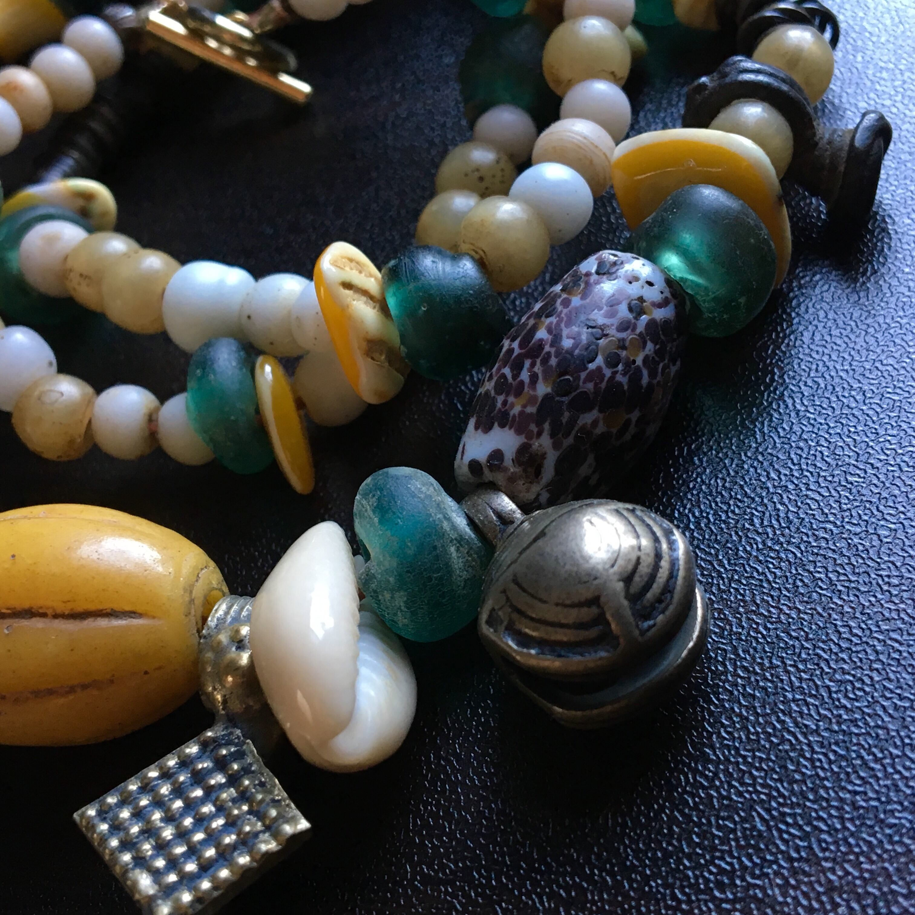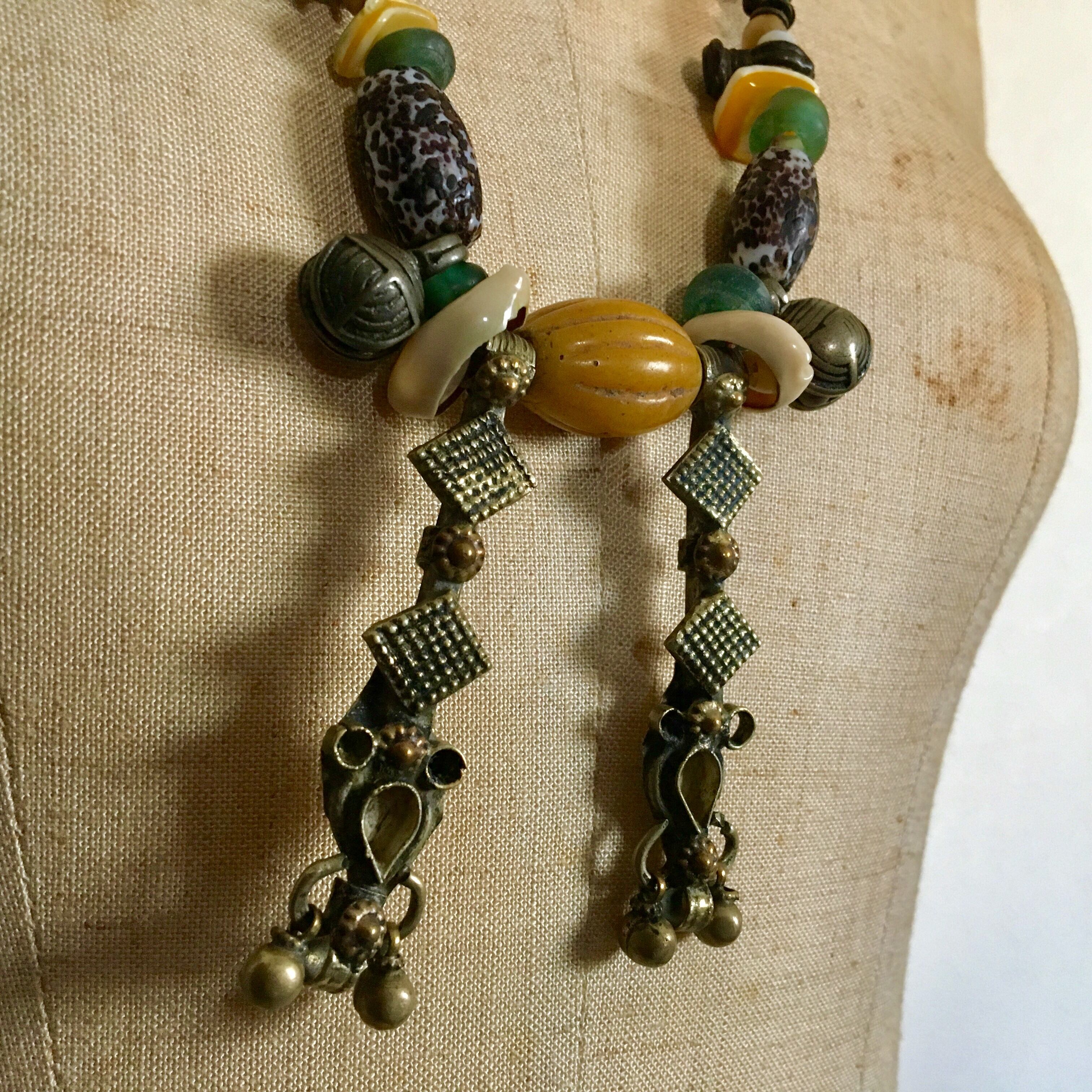 パプアニューギニア渡りのメロン玉にメタルパーツ、チン族ベル、ドゴン族グリーンドーナッツビーズ、白色はタマン族ビーズ、子安貝を使用したトライバルネックレス作品!