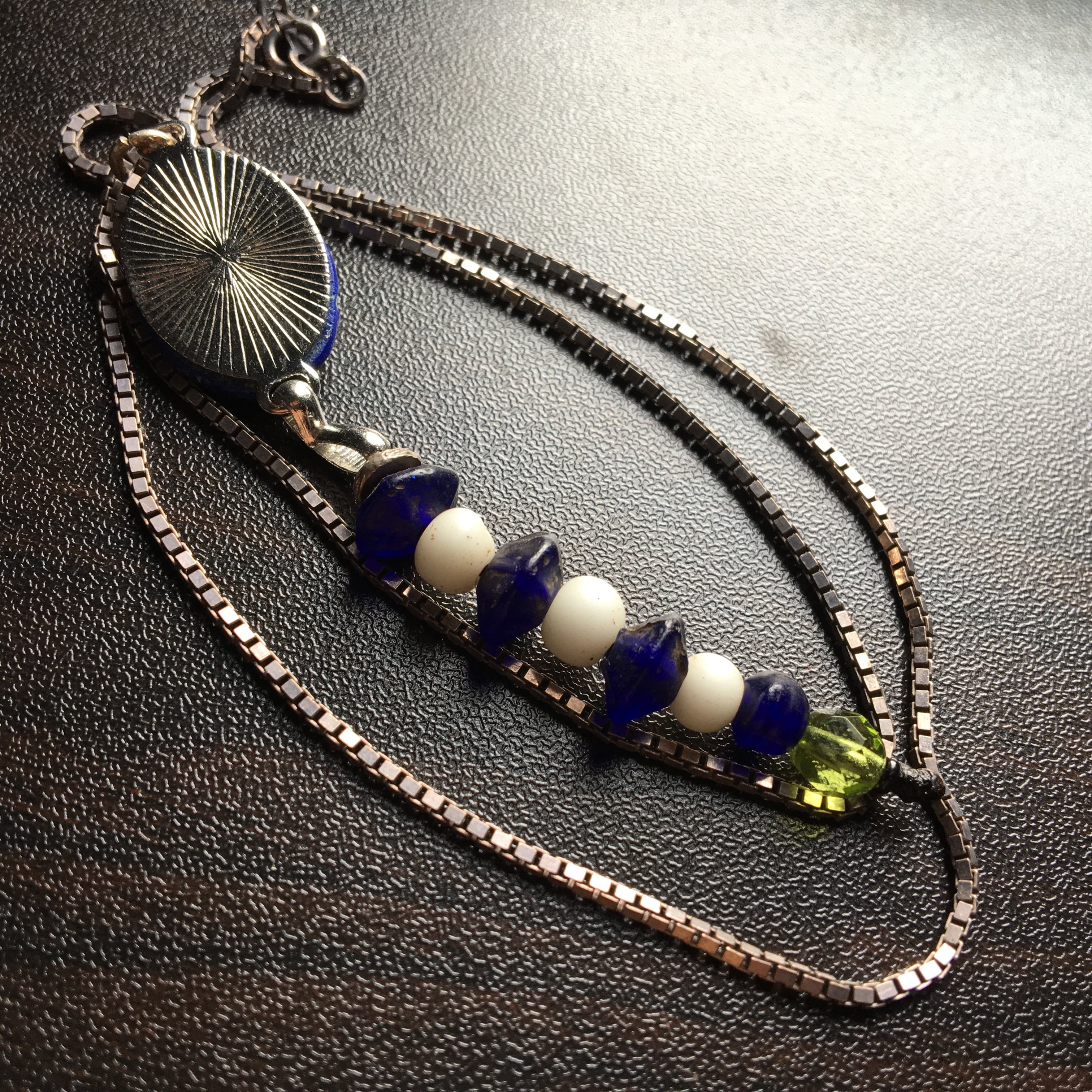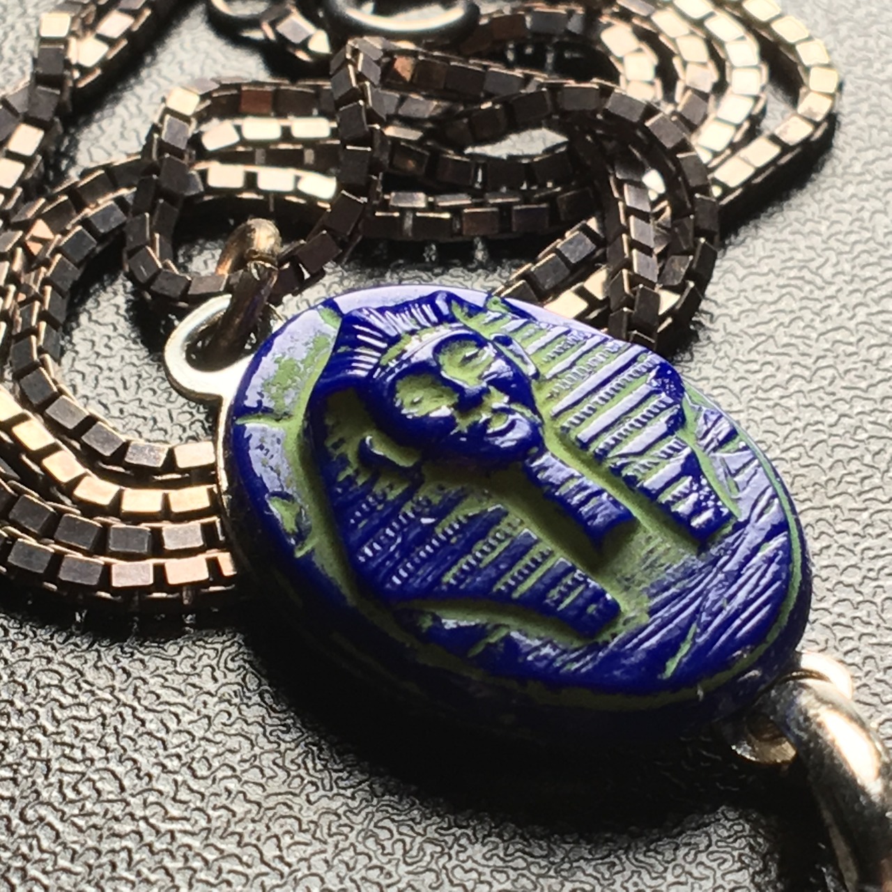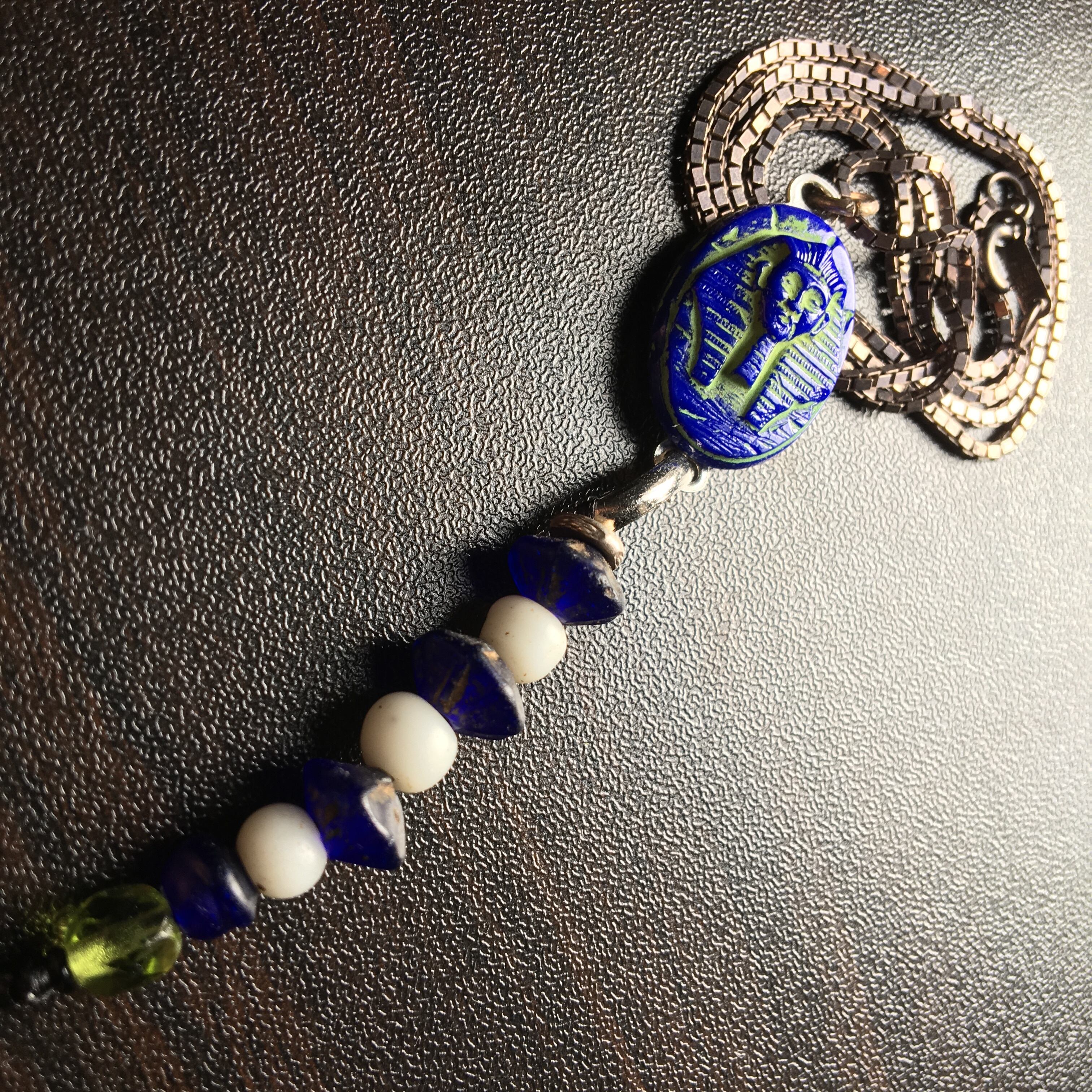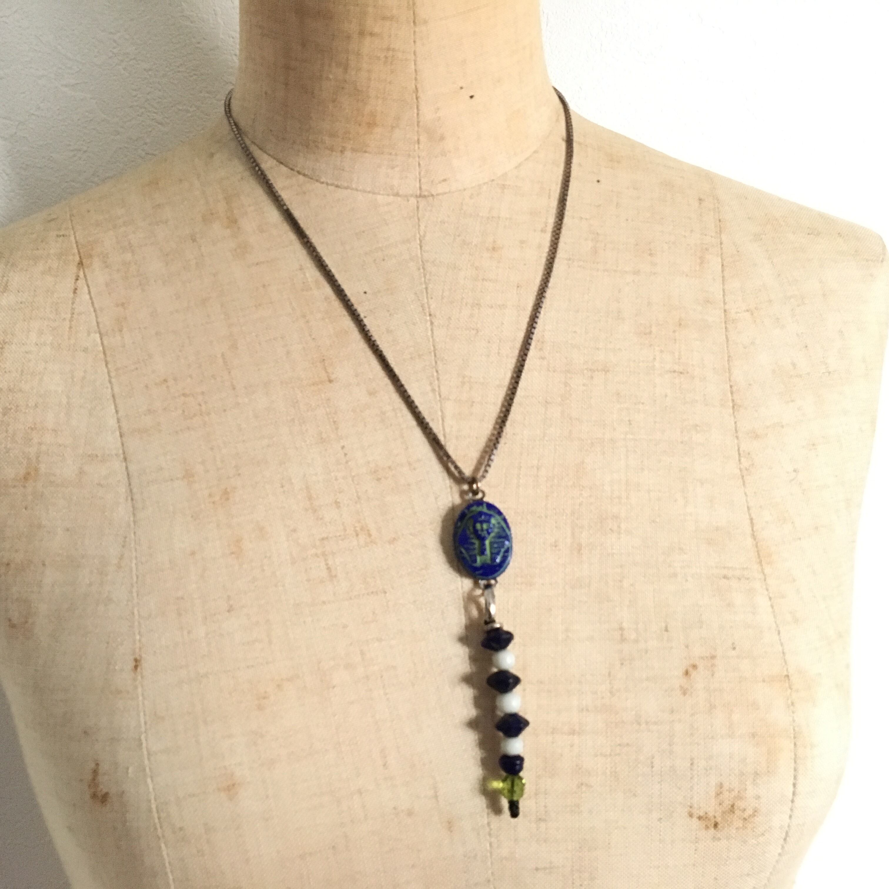 古代エジプトのリバイバル、アールデコ、チェコヴィンテージファラオTOPにタマン族のビーズ、ヴィンテージグリーンビーズ、チェーンを使用したネックレスになります。縦に伸びたデザインがお洒落です!このリバイバルガラスはとても好きなジャンルです!