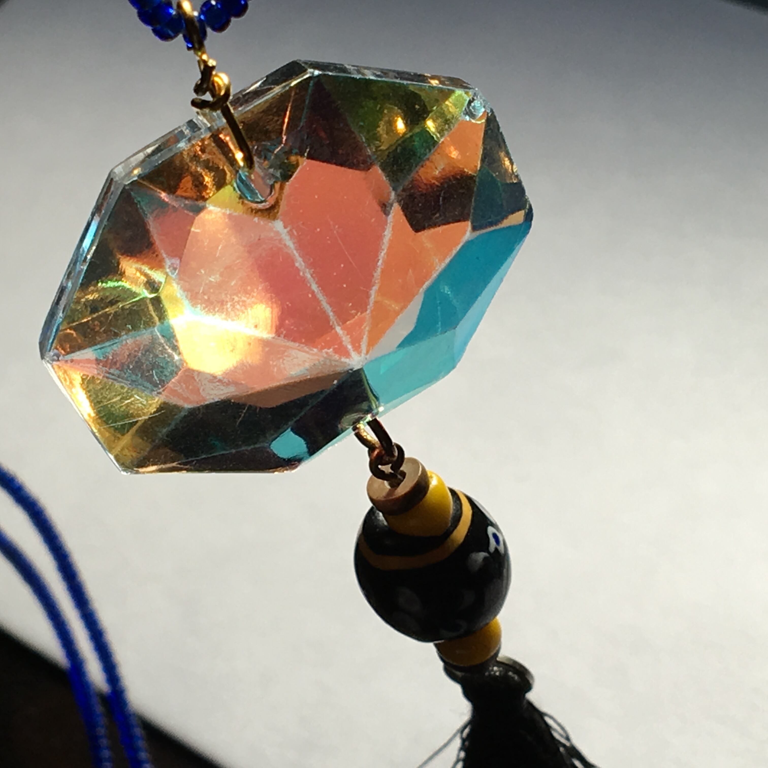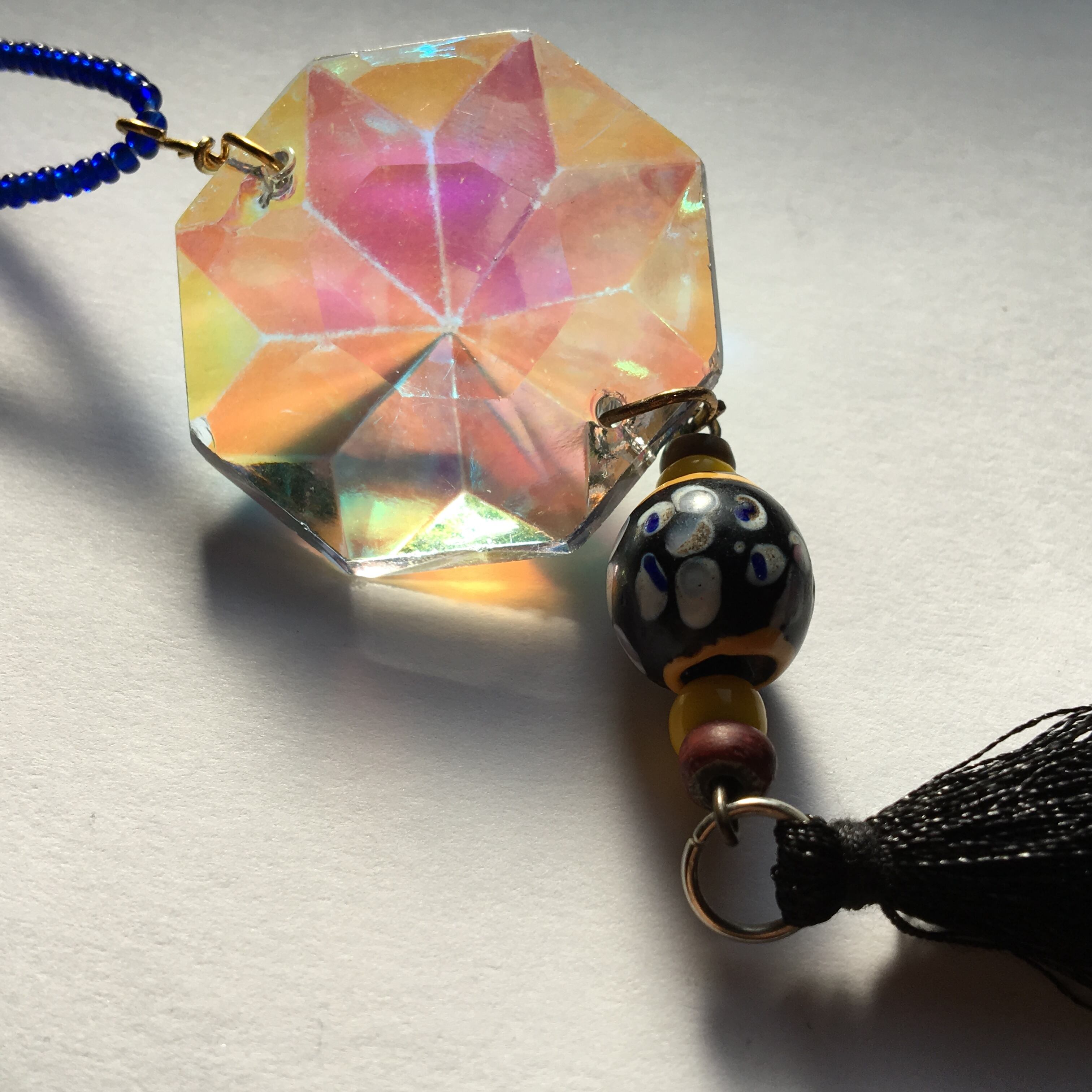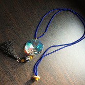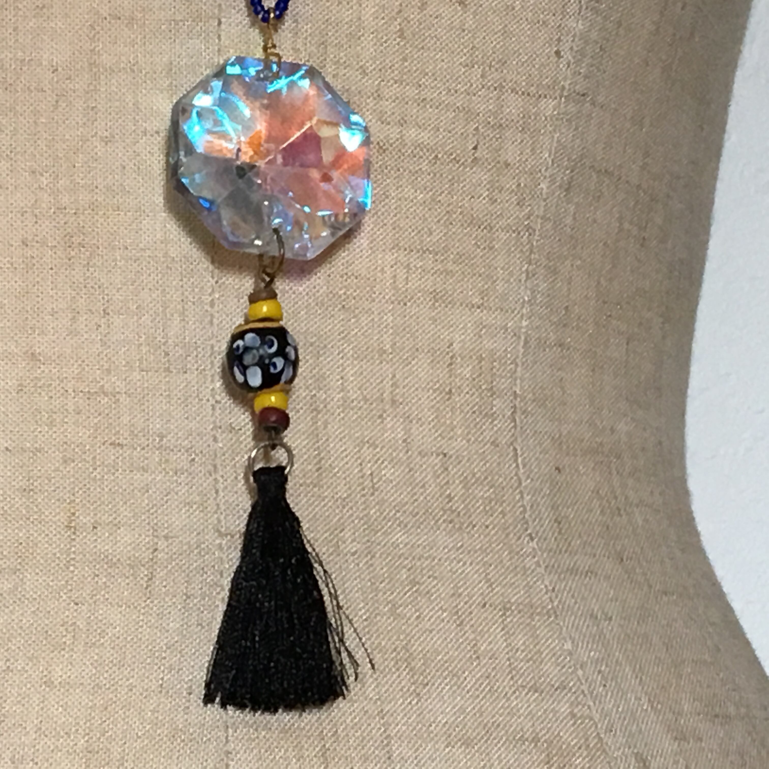 ヴィンテージのシャンデリアパーツをアクセサリーに取り込み、アンティークアイビーズスカンクイエローラインにブルーのシードビーズ、ワンポイントに可愛らしいてんとう虫ビーズ、タッセルを使用したフェメニンなネックレスに仕上がってます!
