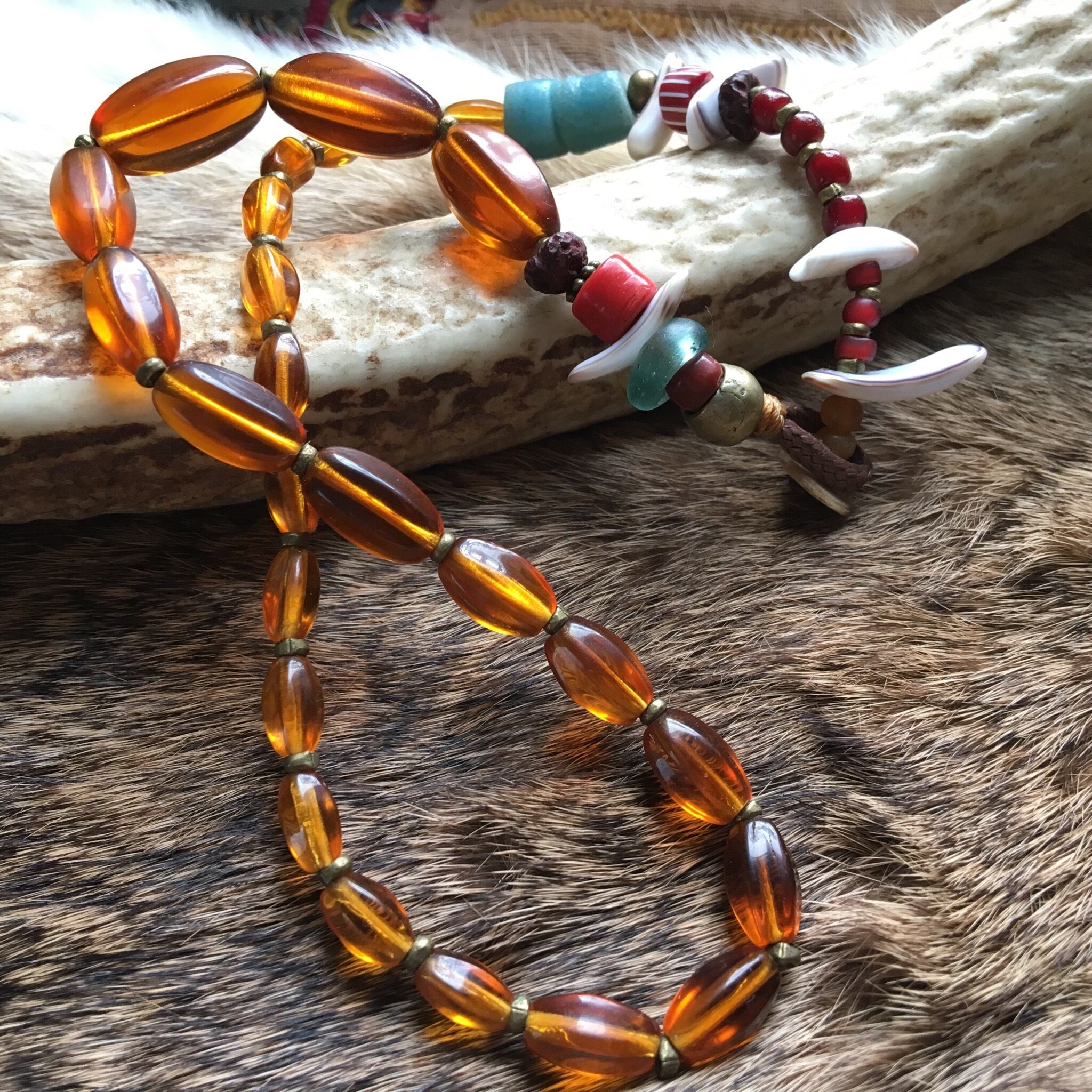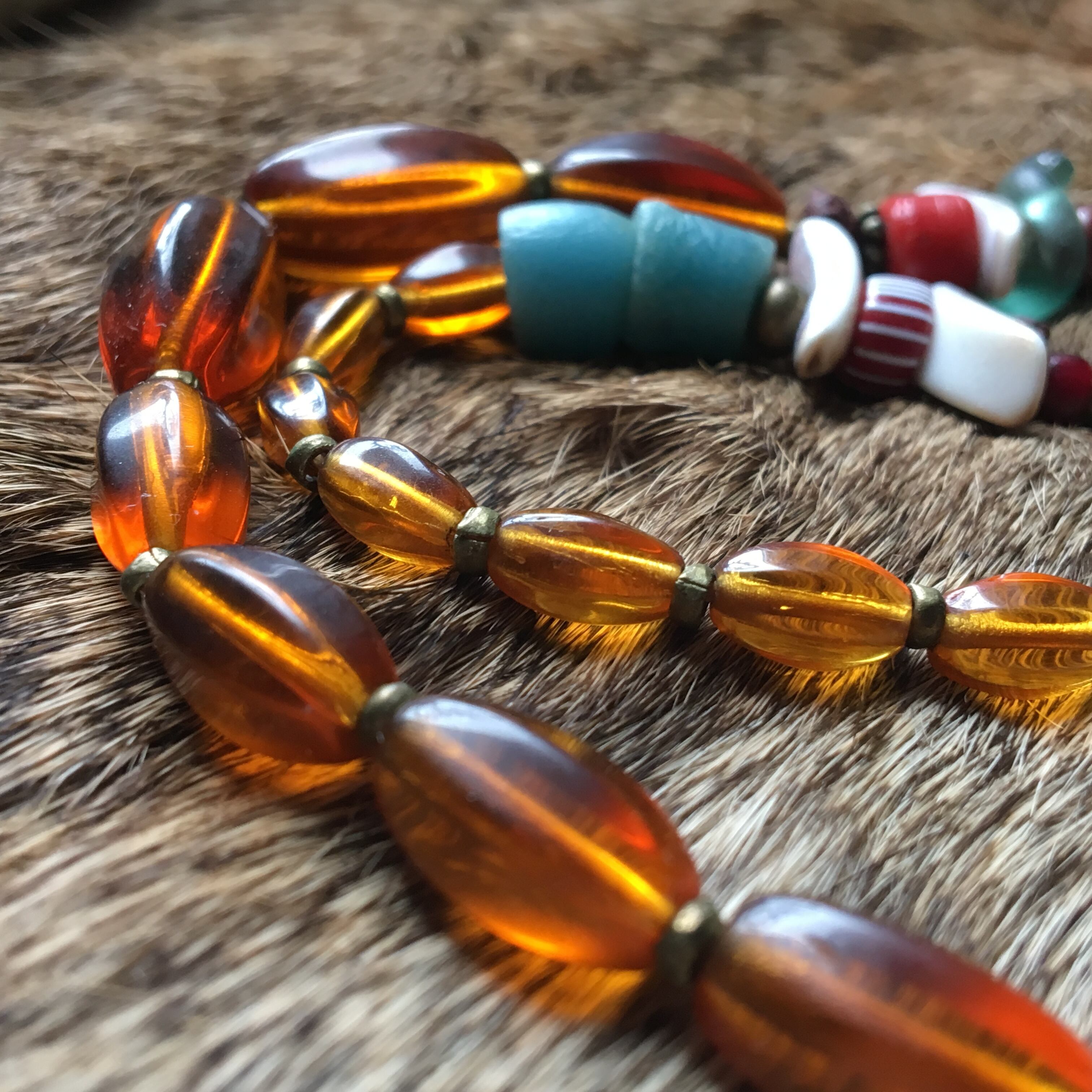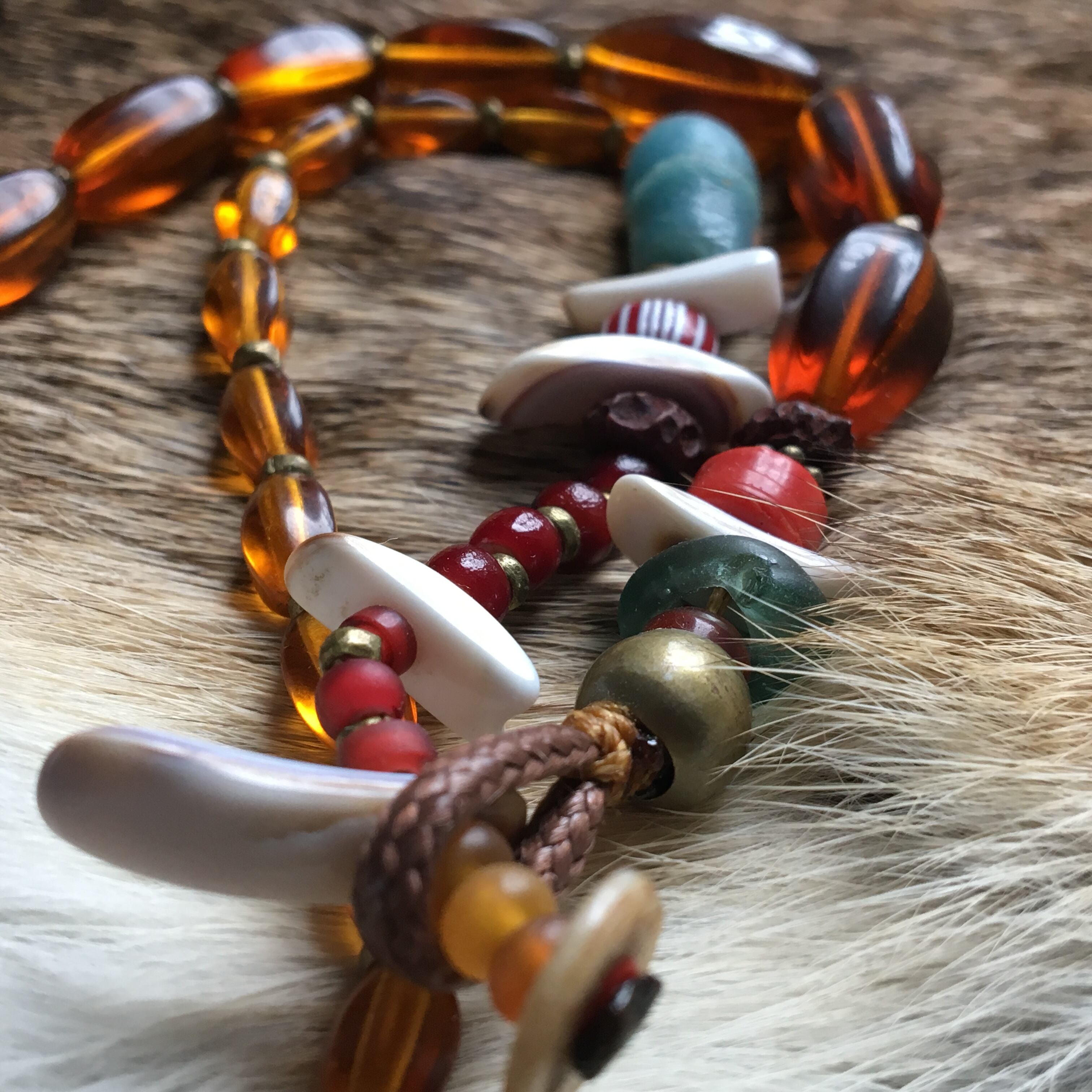 アンティークのボヘミアブラウン大小のグラデーションが素敵!エンド部分にかけてベルチッタ、アフリカ再生ガラス、ドゴン族レアグリーンドーナッツ、アフリカアンティークブラスにワインレッドのグーズベリー、ホワイトハーツ、シェルを使用したトライバルネックレス作品に仕上げました!