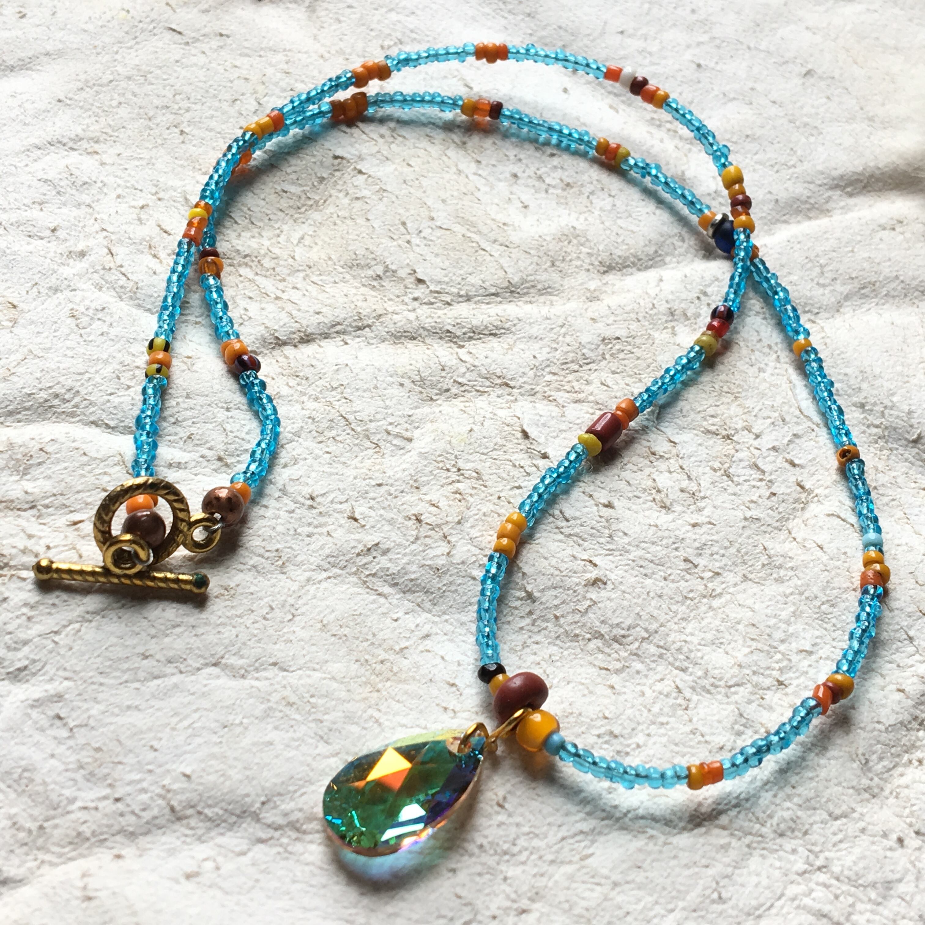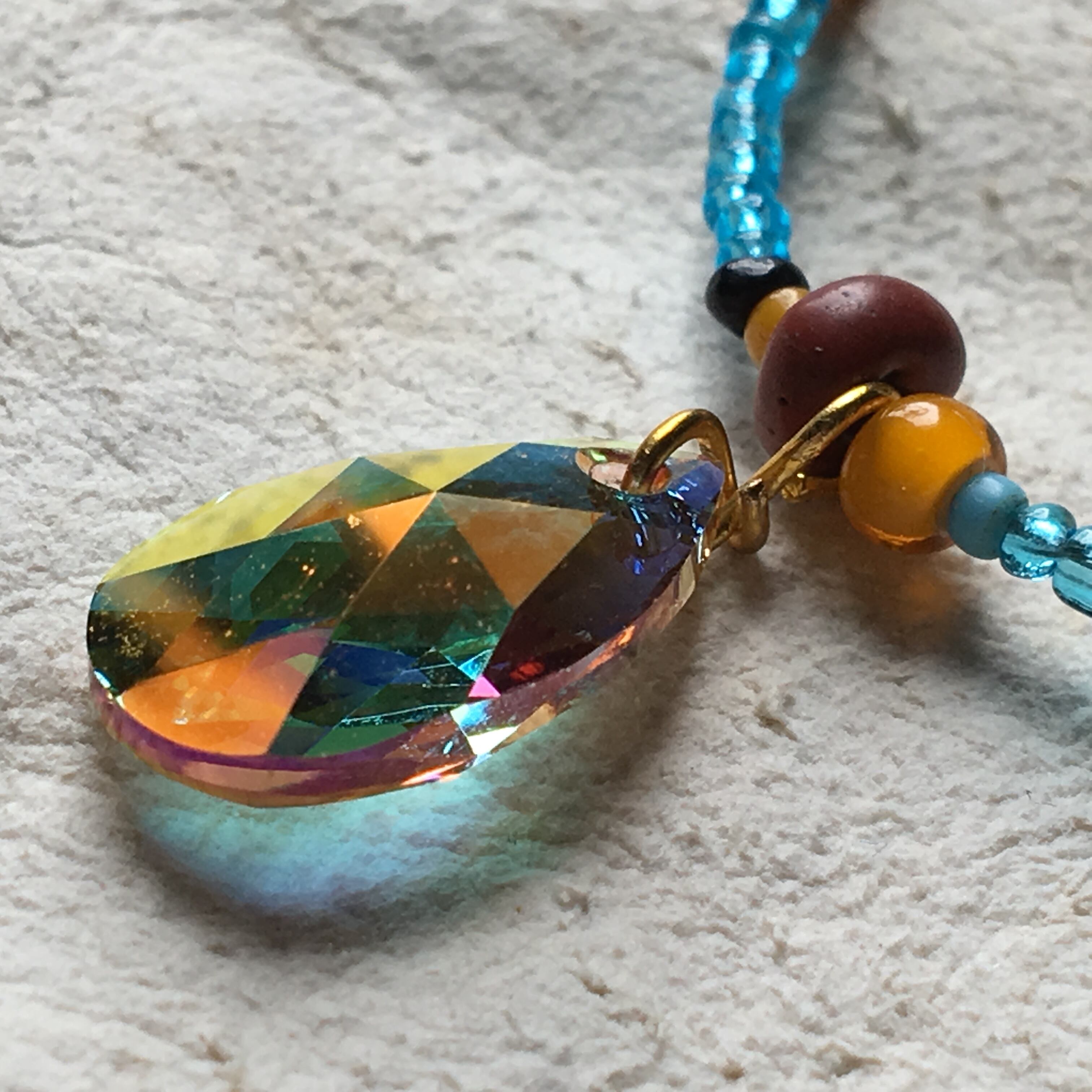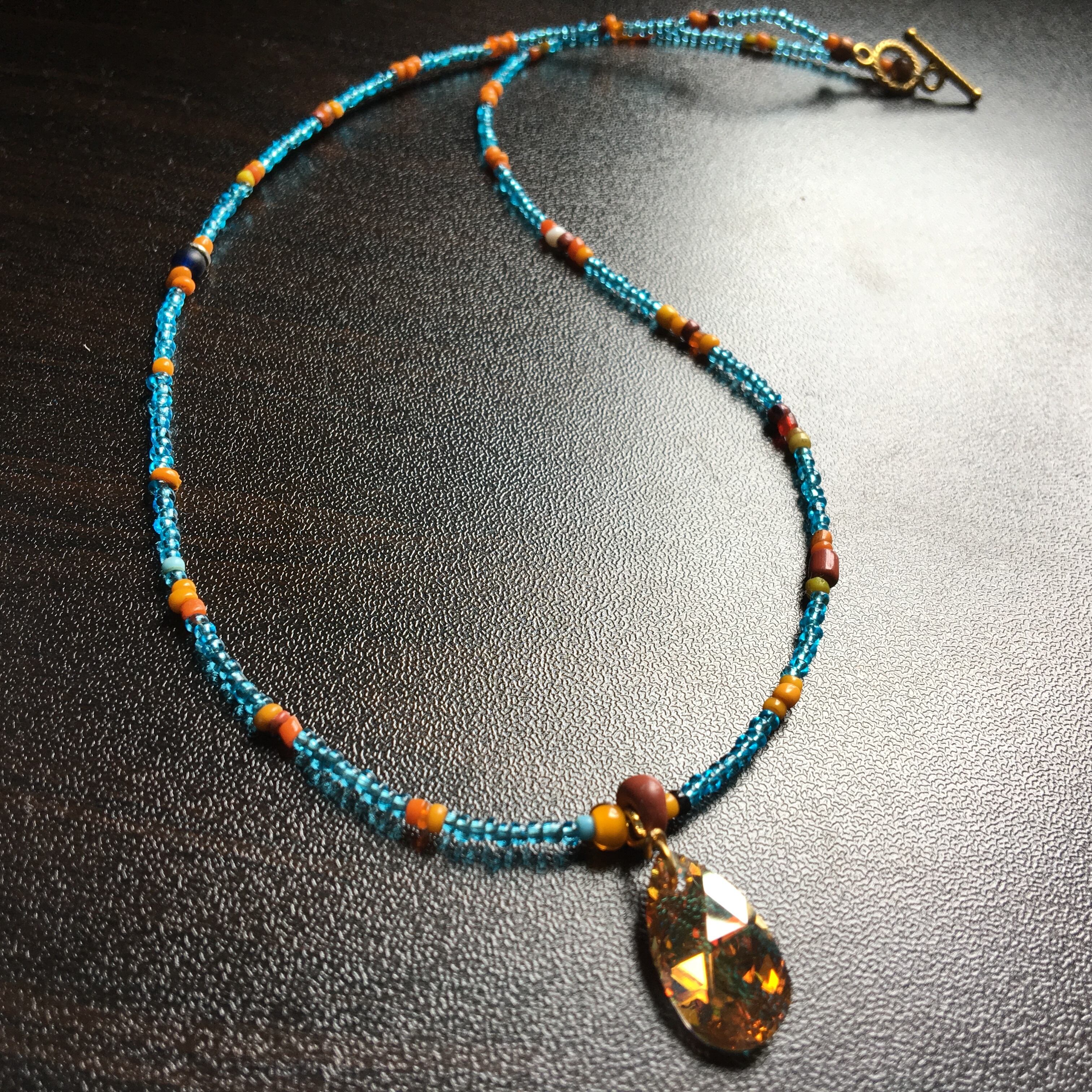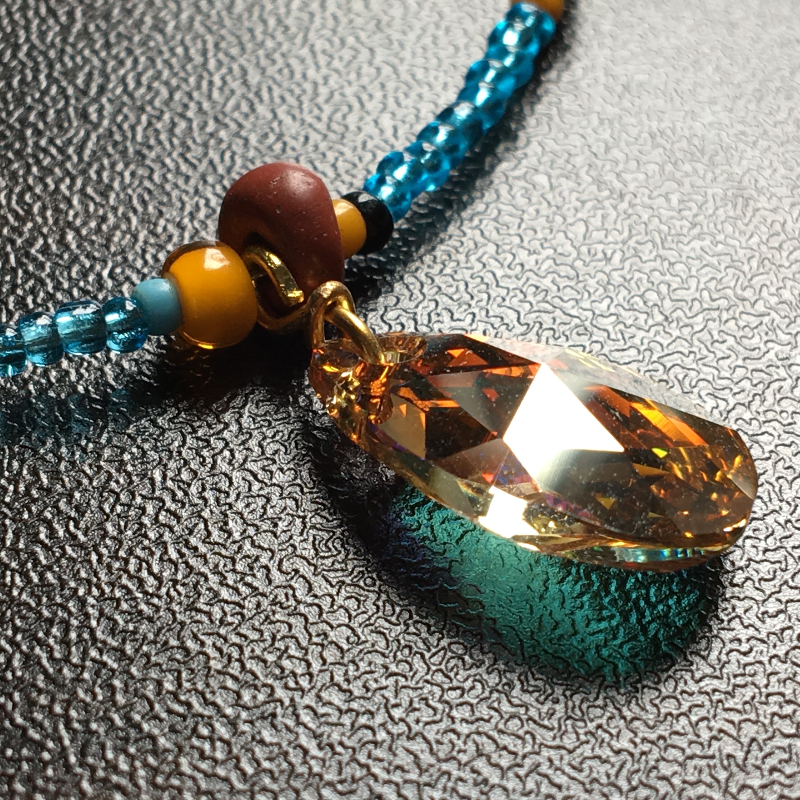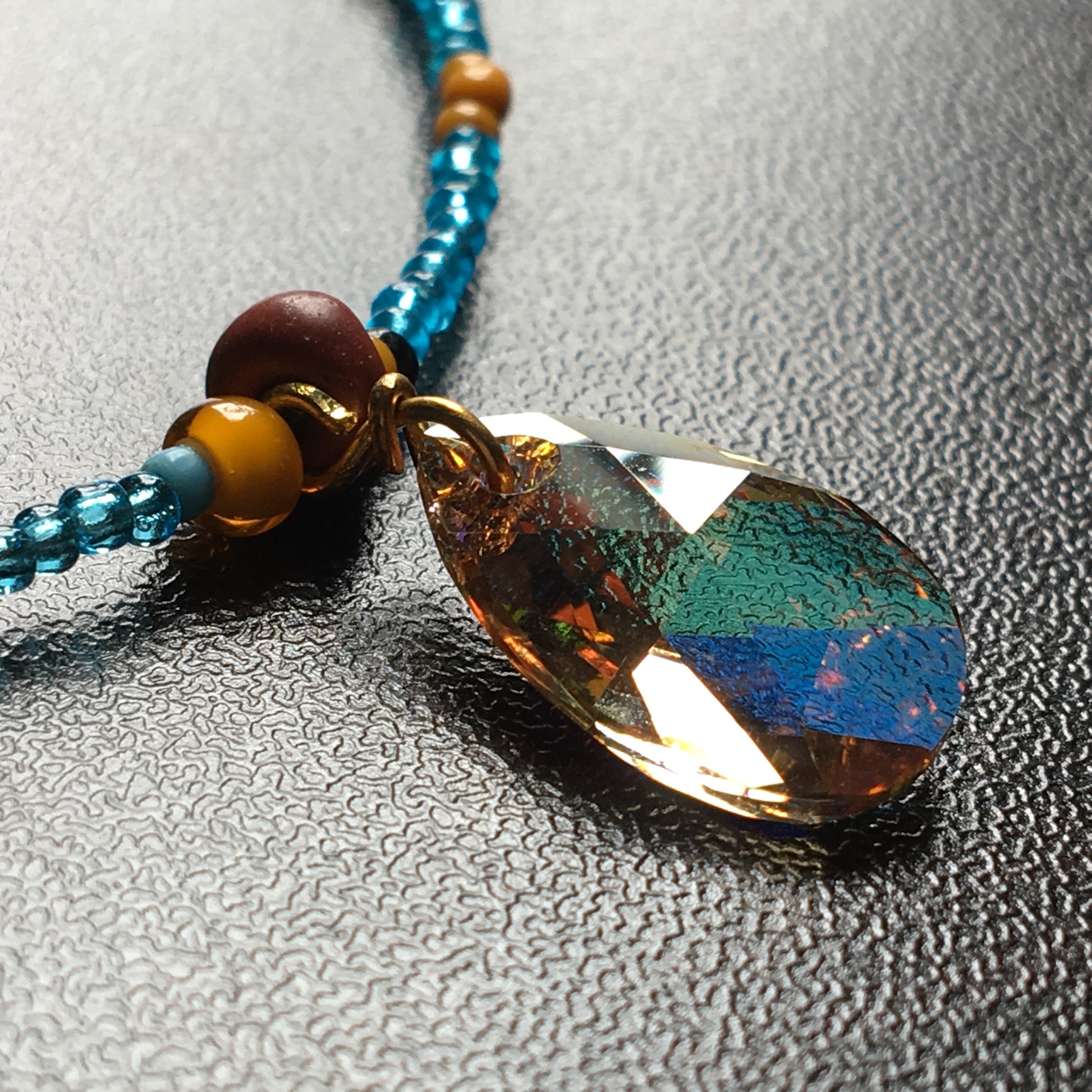 角度を変えると素敵な表情と煌めきを見せる魅惑のスワロフスキーTOPにアンティークシードビーズを使用したネックレス作品。