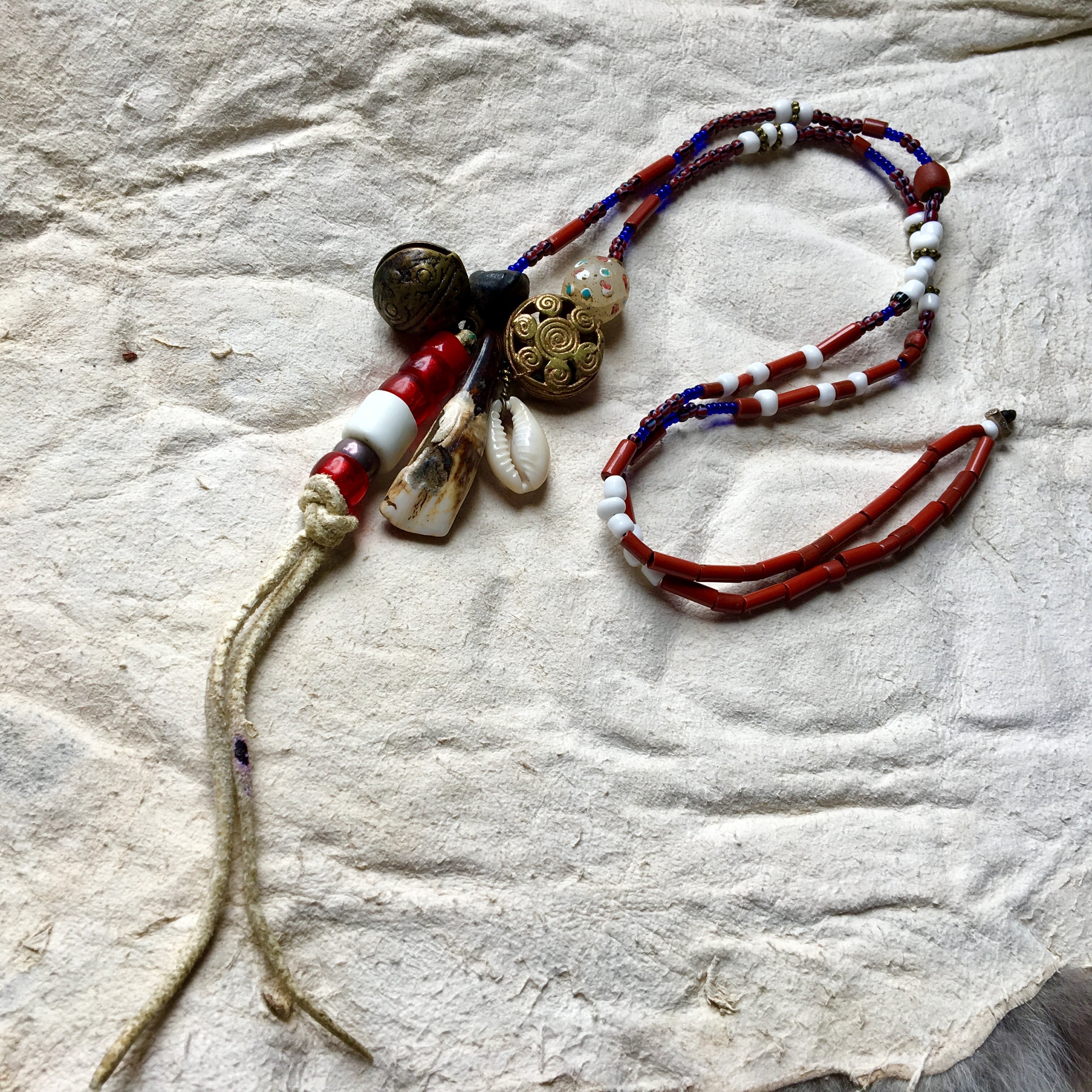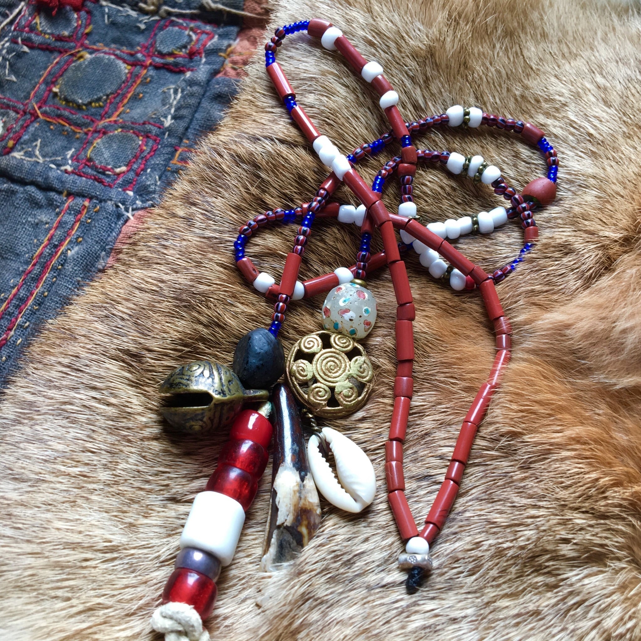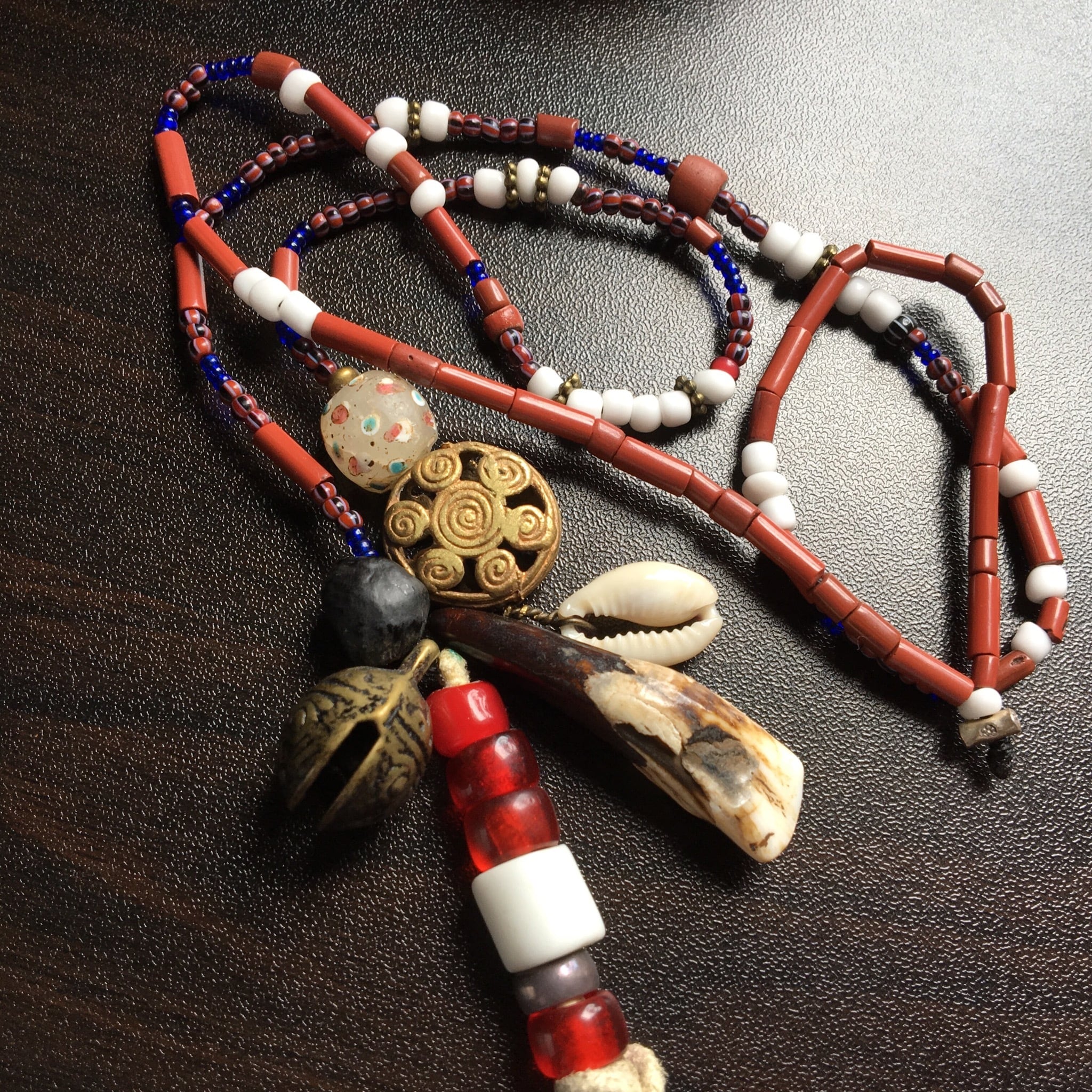 【No.162】tribal ネックレス スカンク ヤクの歯 antiqueシードビーズ 鈴 子安貝 バナナの種 カレンシルバー パドレ アフリカ ブラス