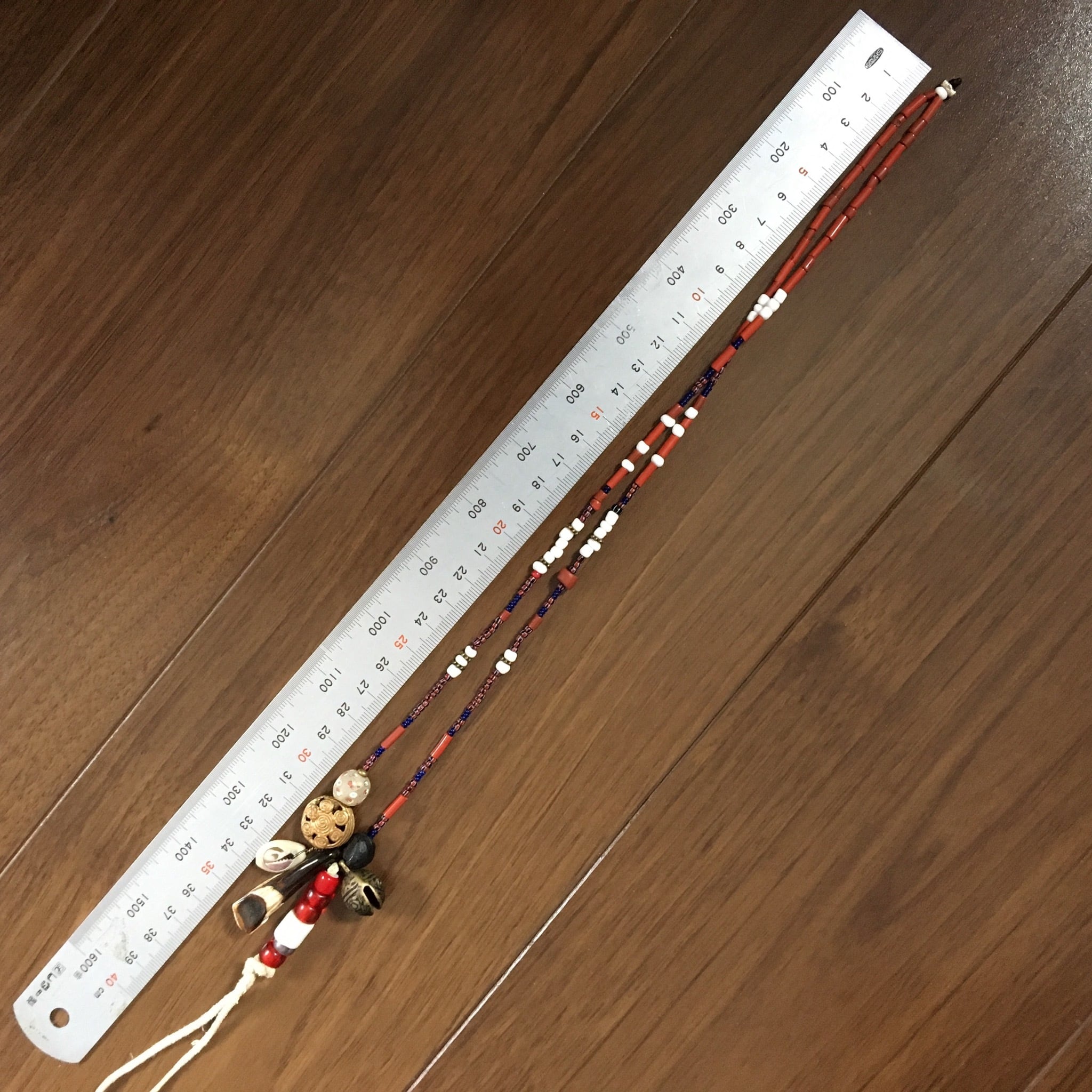中央の革紐部分にアンティークパドレビーズにシルバー、ヤクの歯、アフリカブラスにアンティークのスカンクビーズ、ベル、バナナの種、アンティークシードビーズ、留め部分にカレンシルバーを使用したtribalネックレス作品。そのまま被る形です。