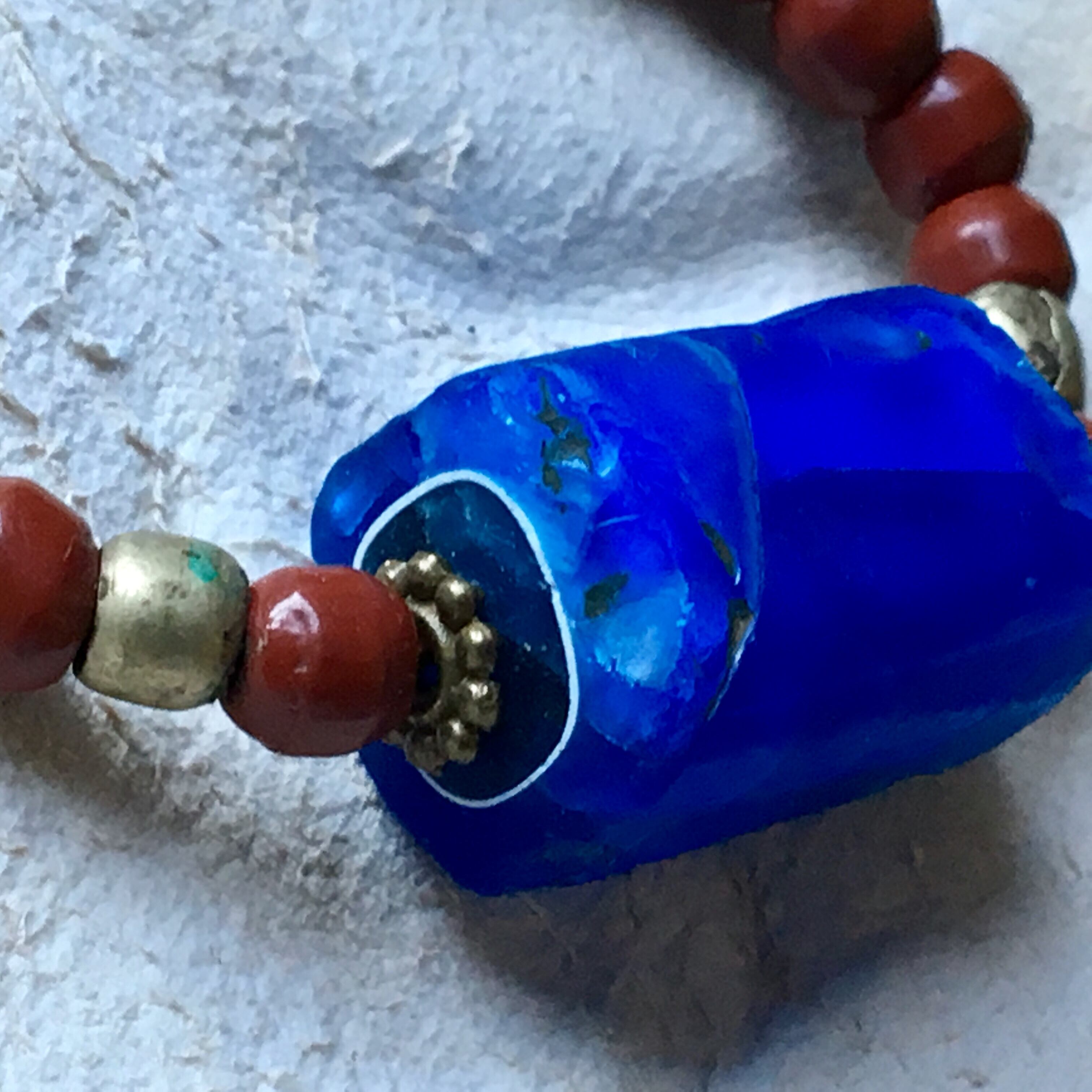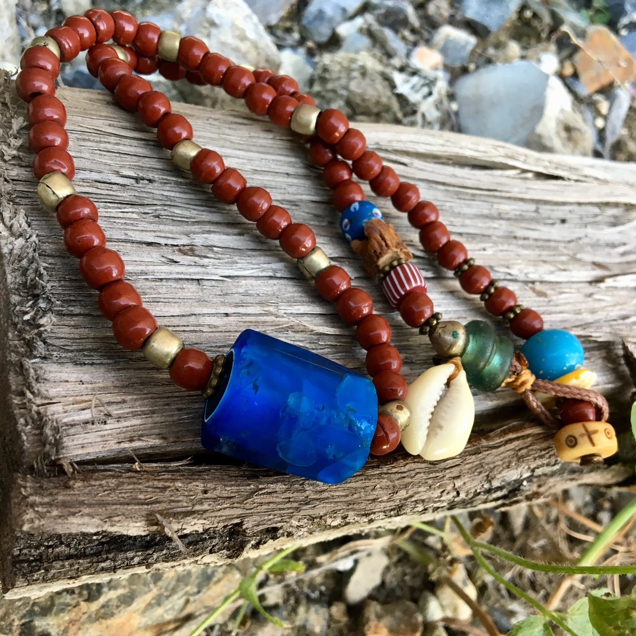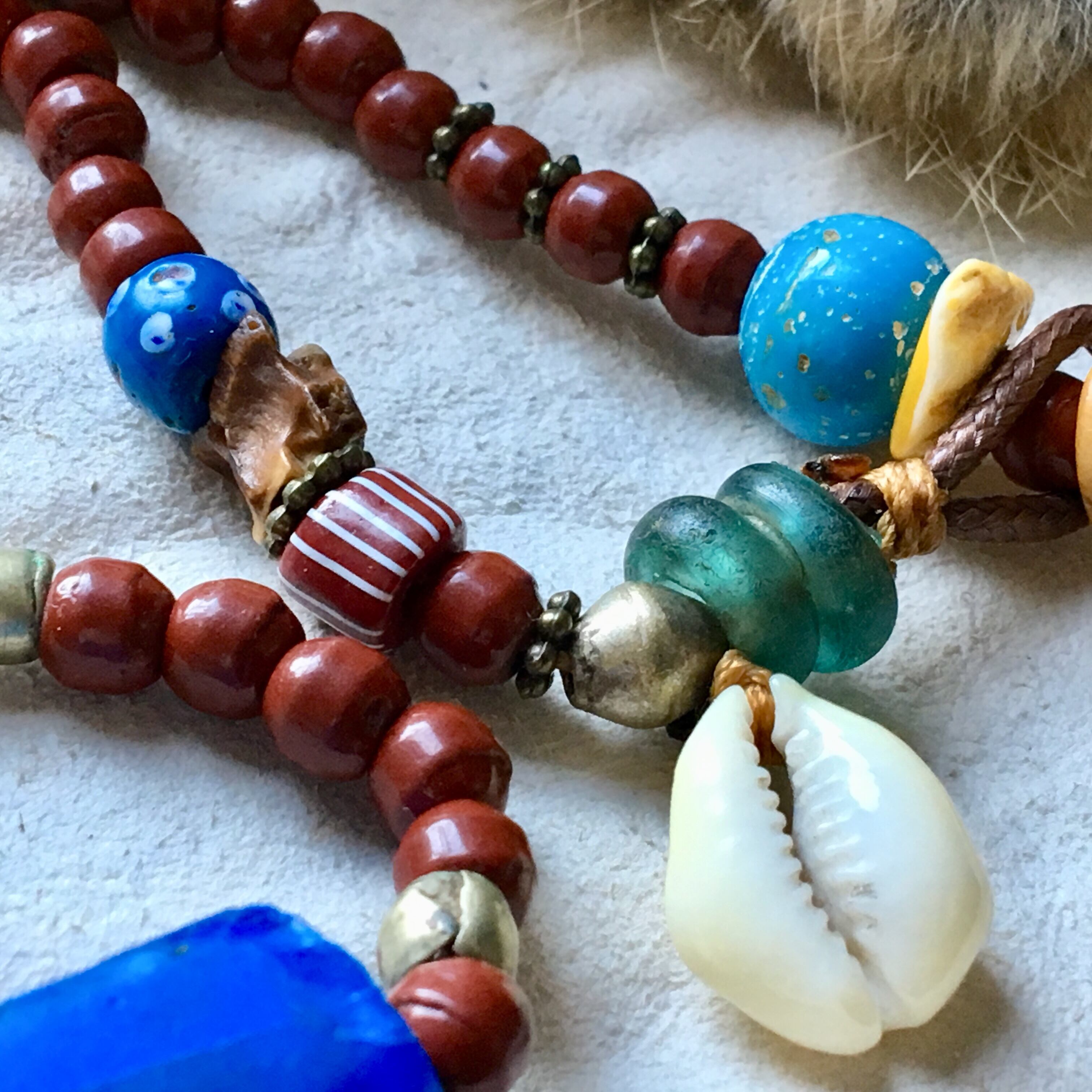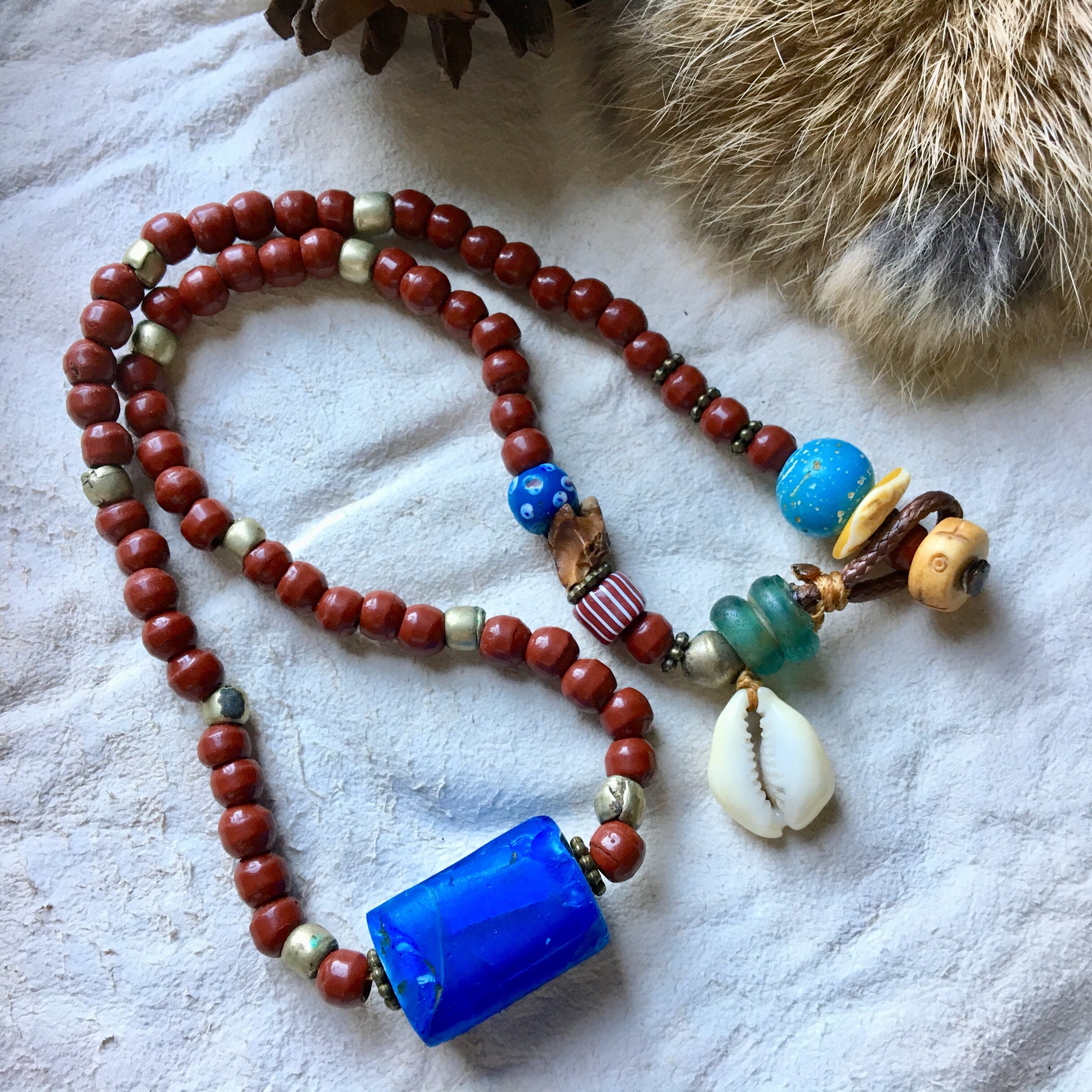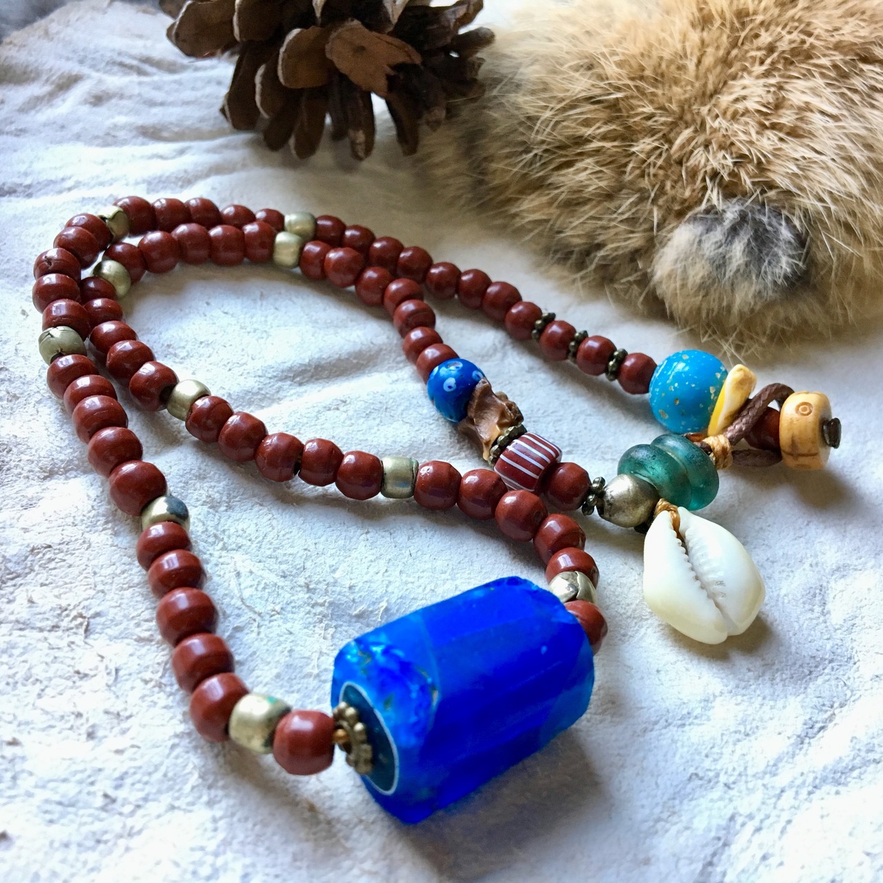 【No.169】ロイヤルブルー antique ヌエバカディス トライバルネックレス ボヘミアプロッサービーズ ドゴン族 子安貝