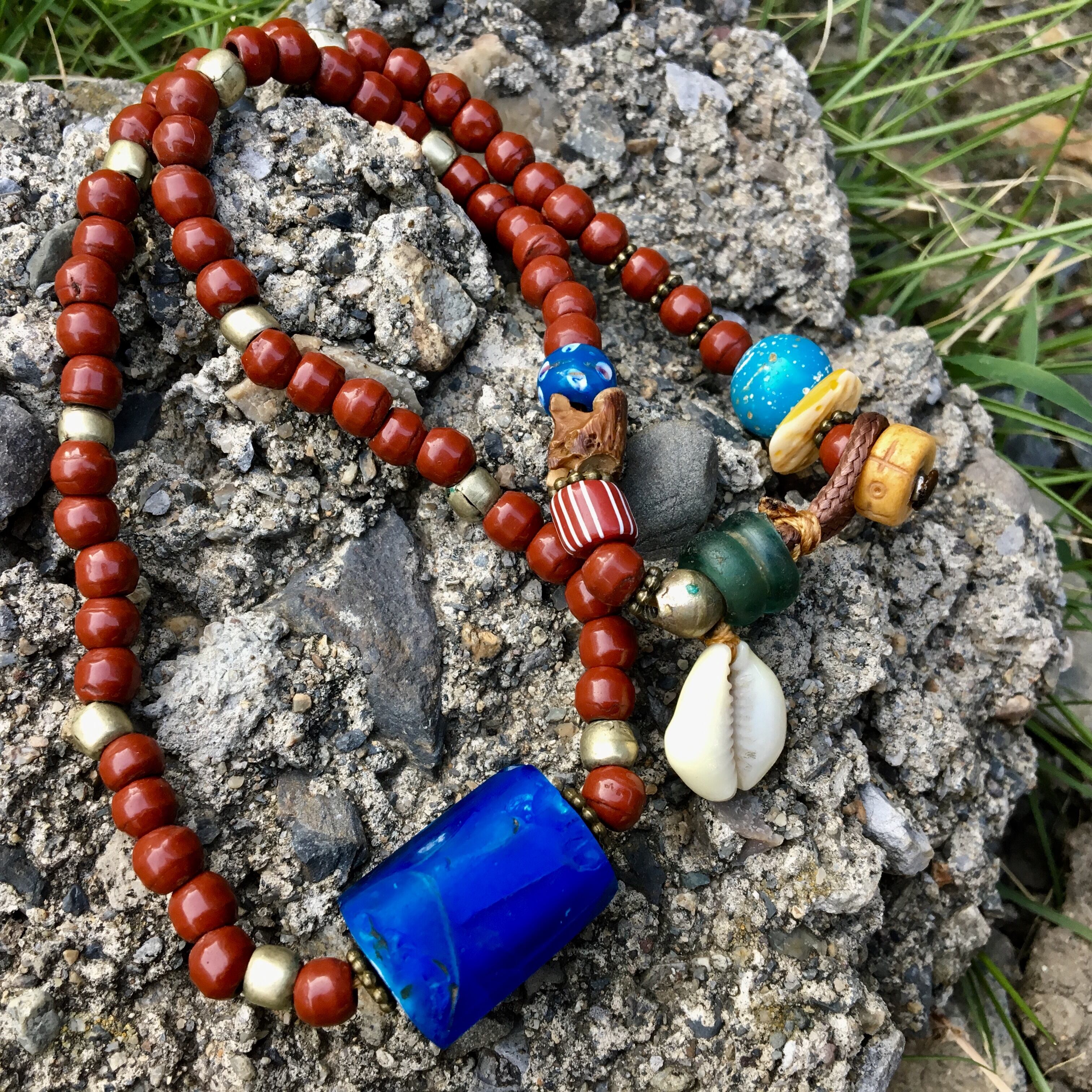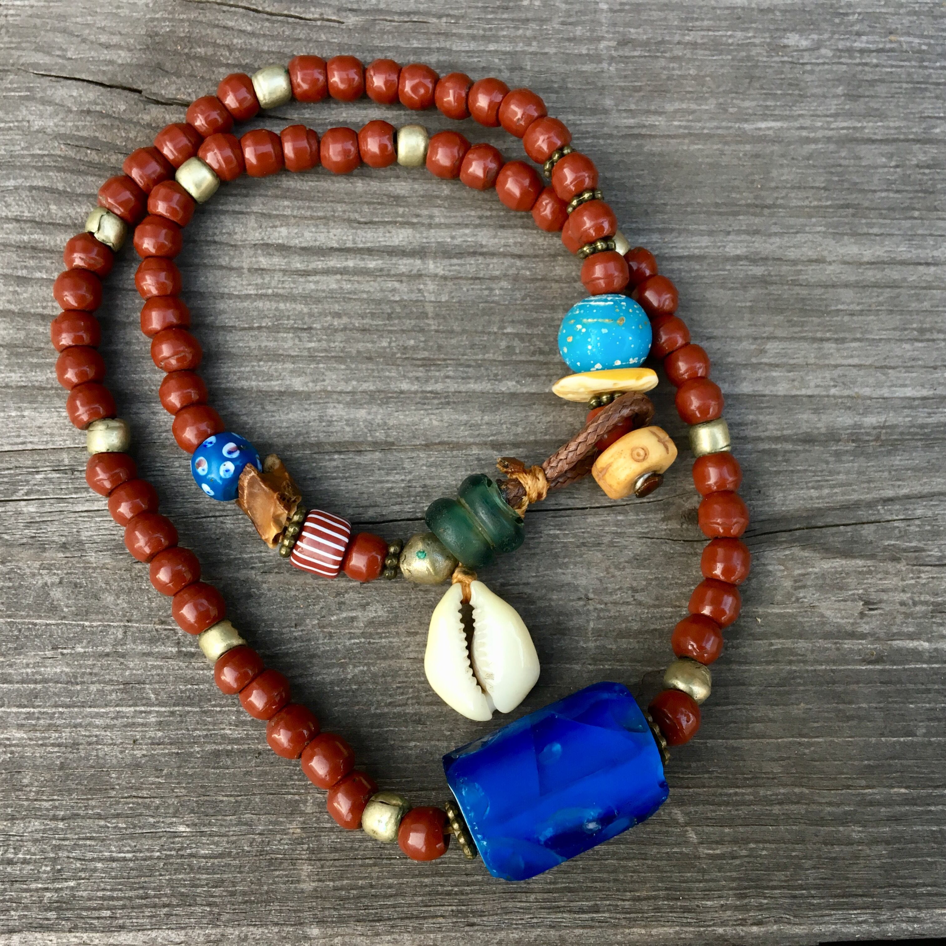 1800〜1900年代ヌエバカディスをTOPにブラウンのボヘミアプロッサービーズ、ブラス、スカンクビーズ、ドゴン族レアカラードーナッツ型グリーンビーズ、アフリカのスネークボーン、ワインレッドグーズベリー、子安貝、留め具にはヤクボーンを使用したトライバルネックレス作品。