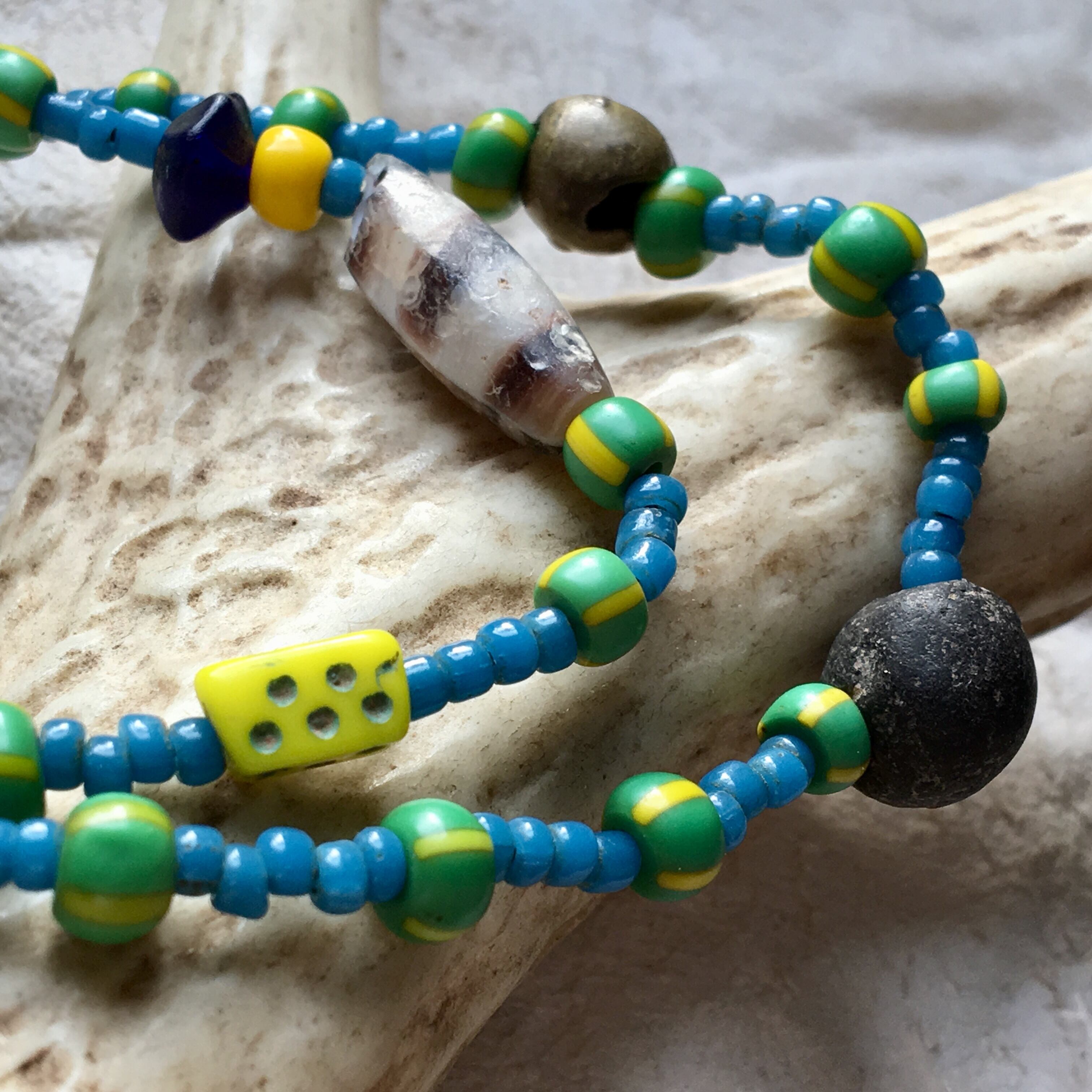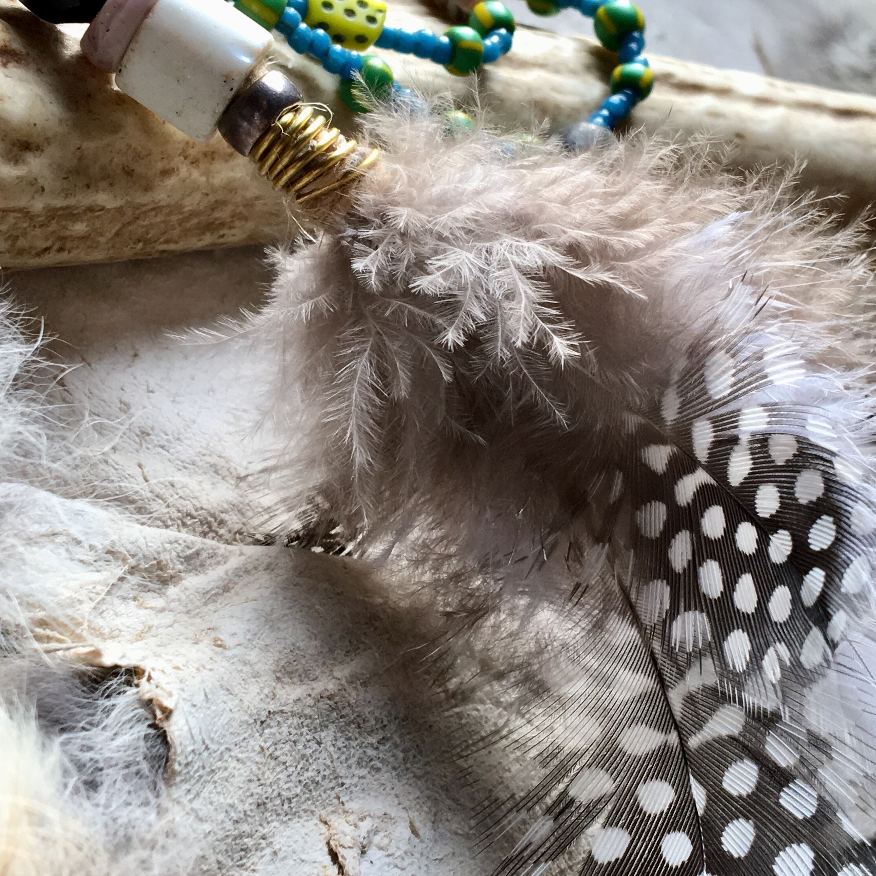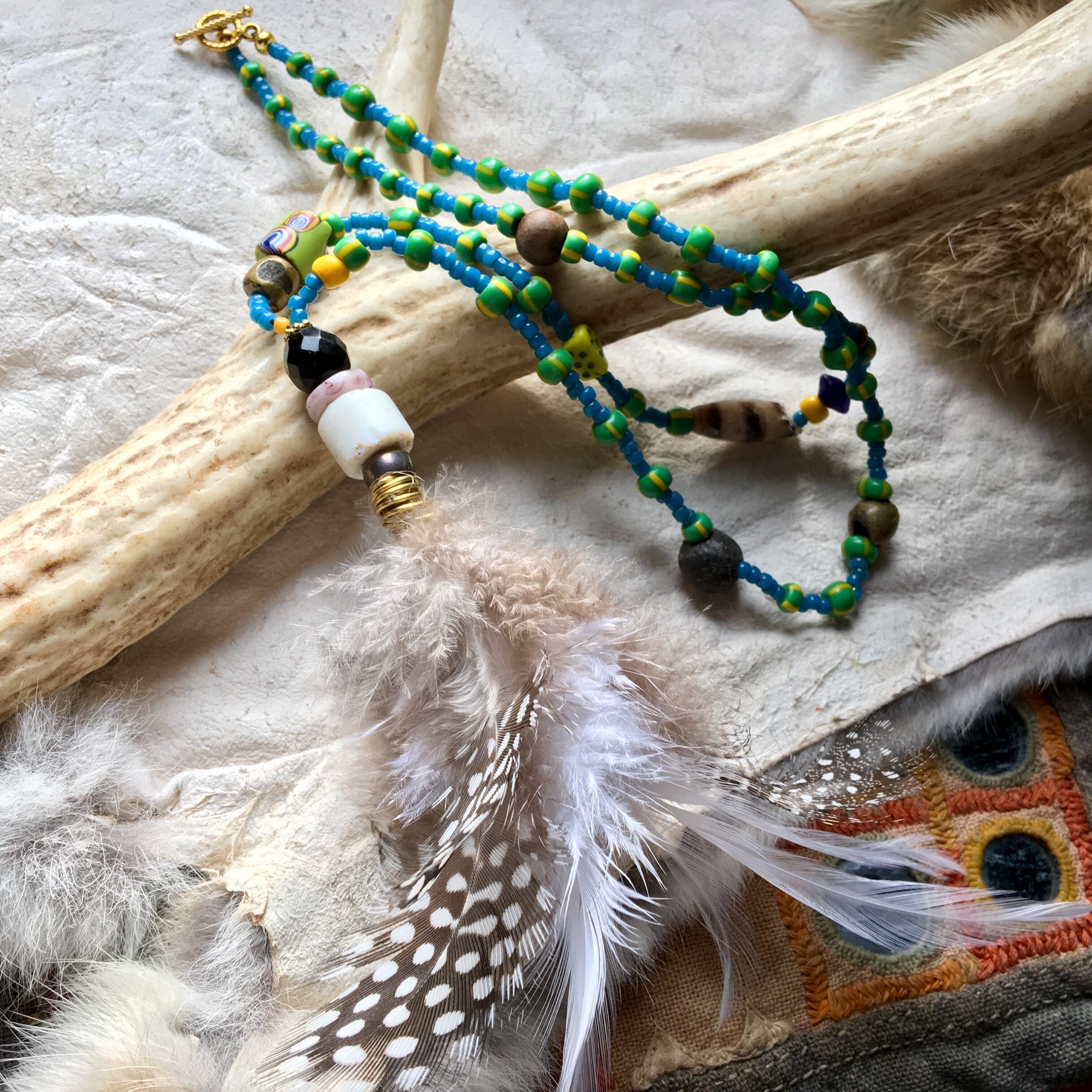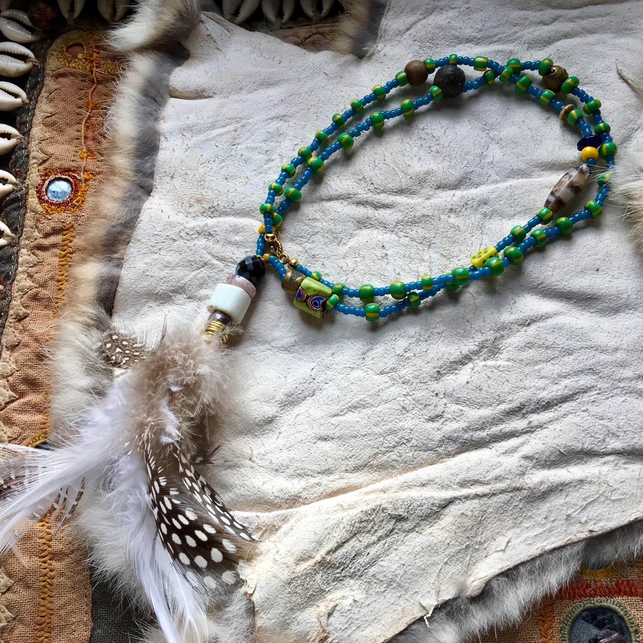 アンティークブルーシードビーズにアンティークボヘミアビーズ、フェザー、アンティークアフリカトレードビーズミルフィオリ、アンティークアフリカブラス、カンネビーズを使用したトライバルネックレス作品。