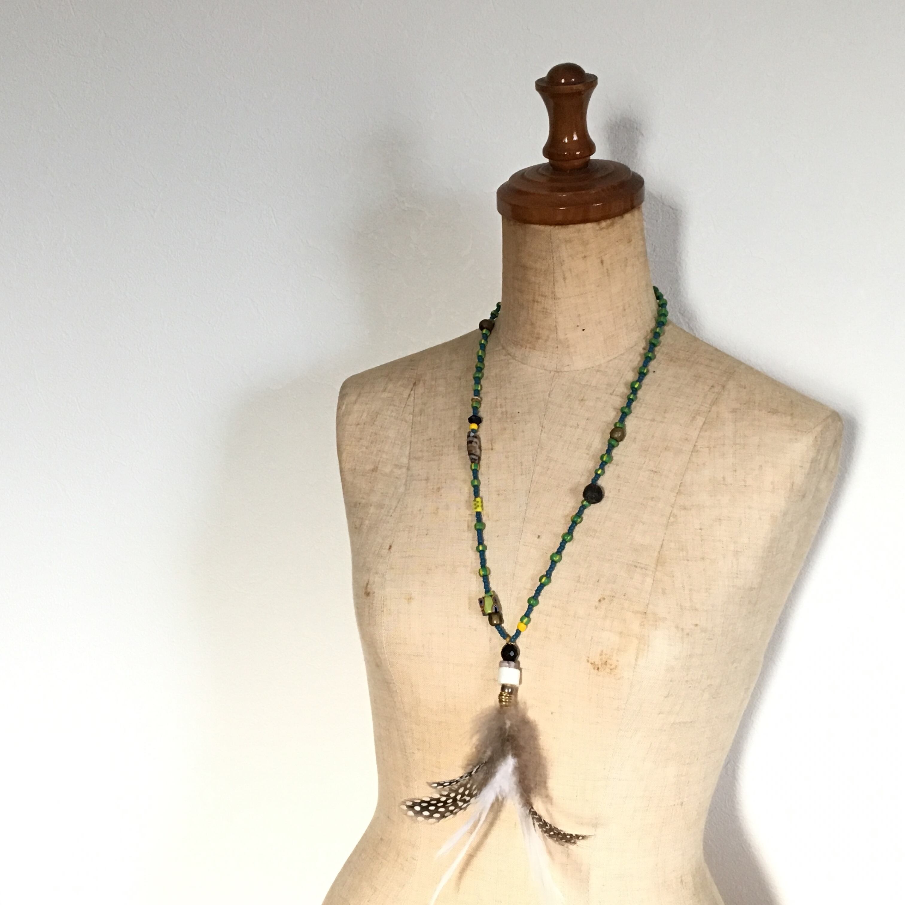 【No.187】空を仰ぐ antique beads フェザー トライバル ネックレス カンネ ボヘミア ミルフィオリ アフリカ ブラス