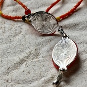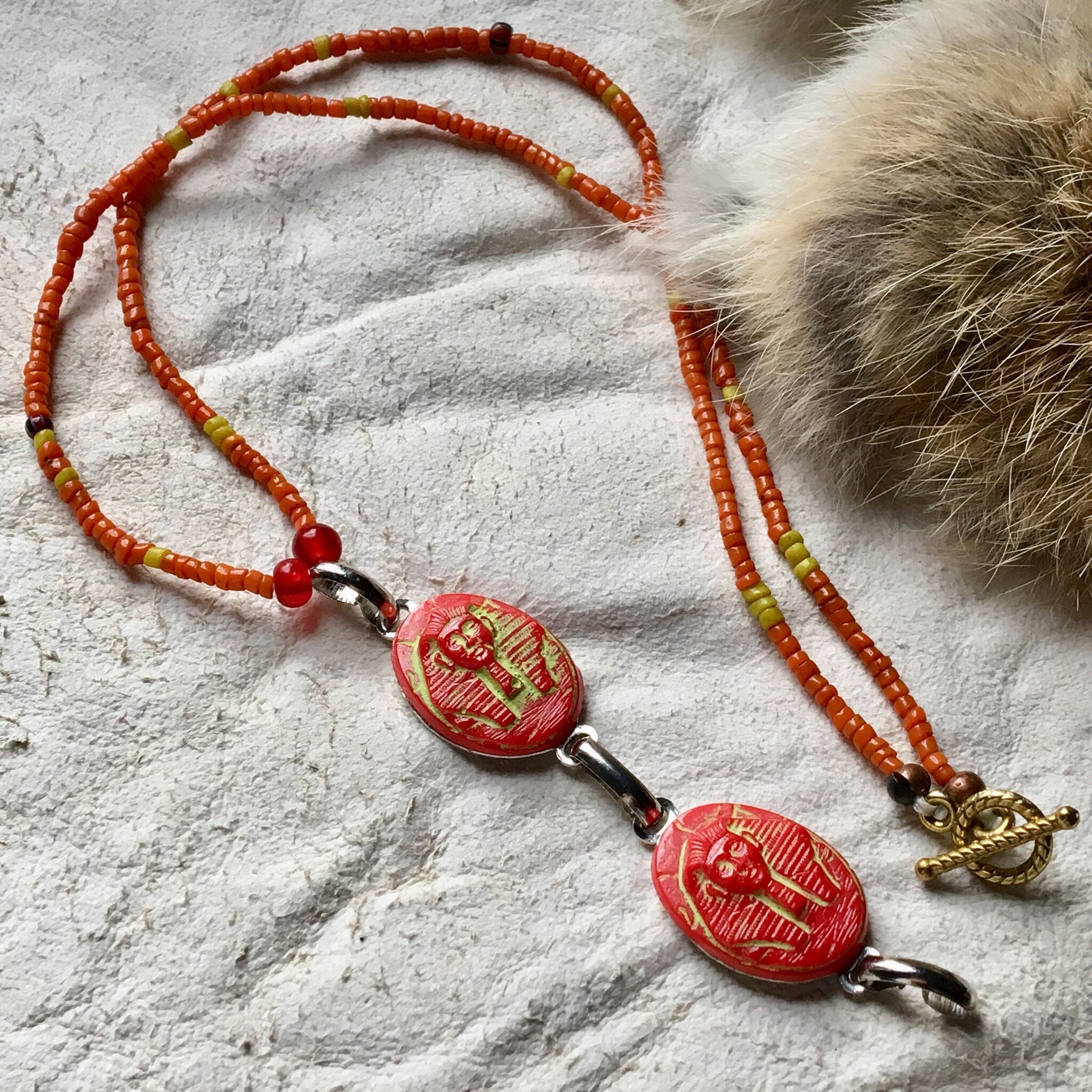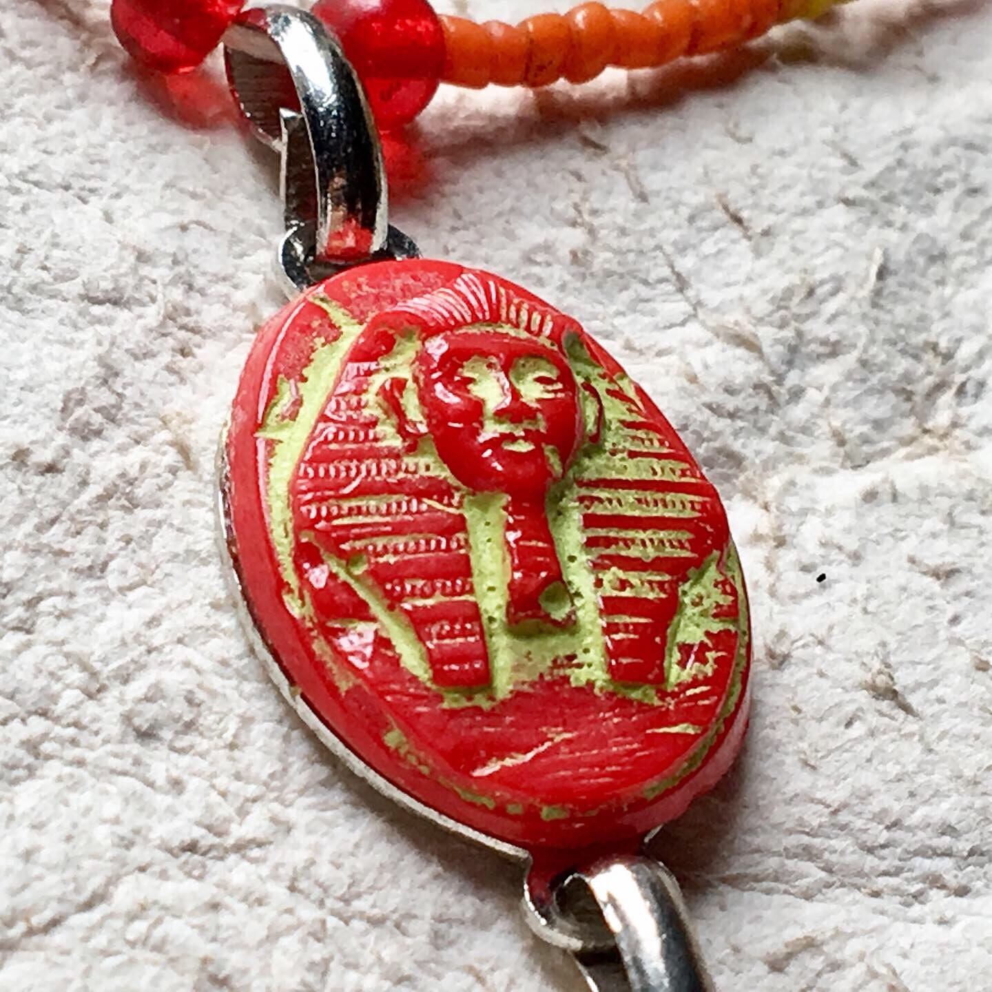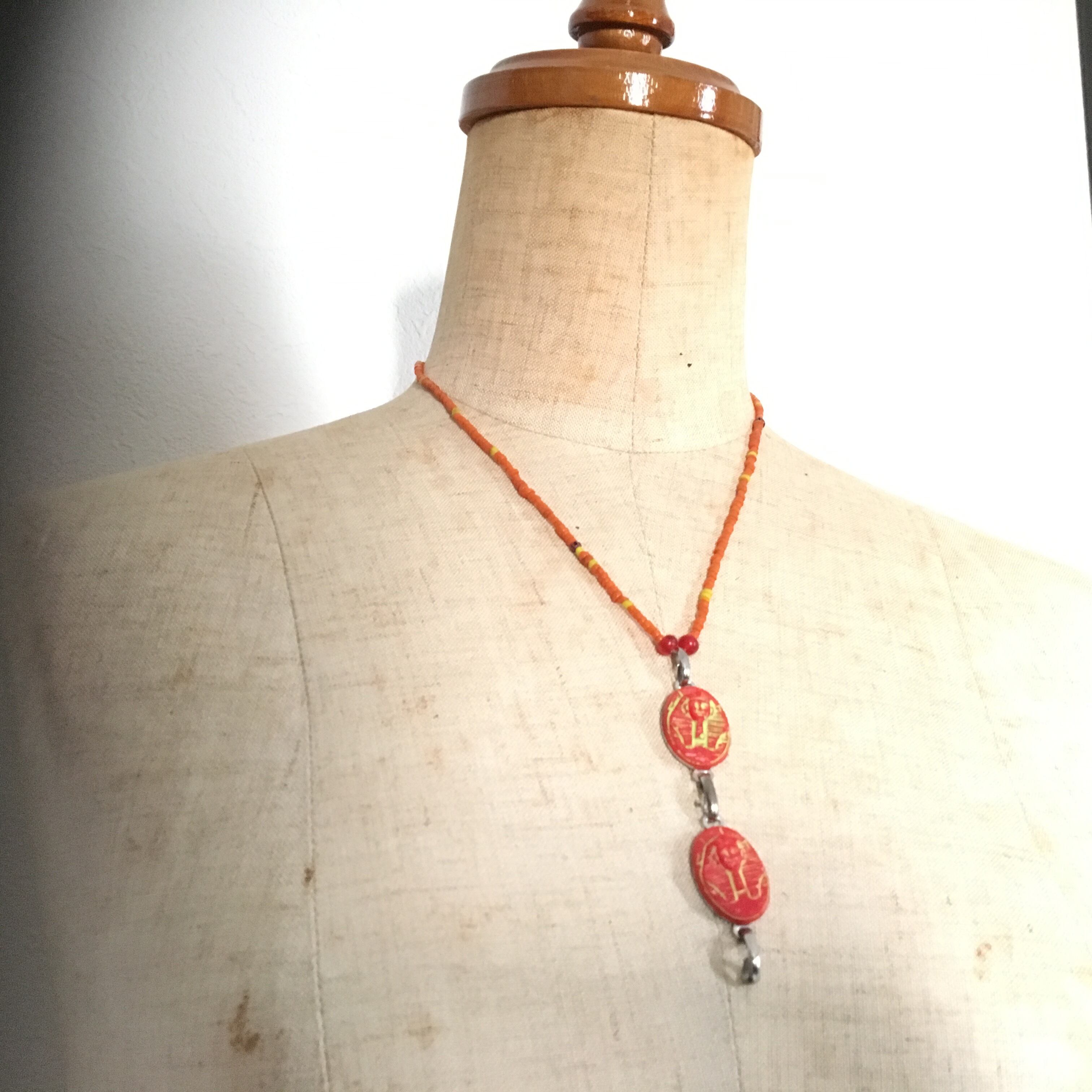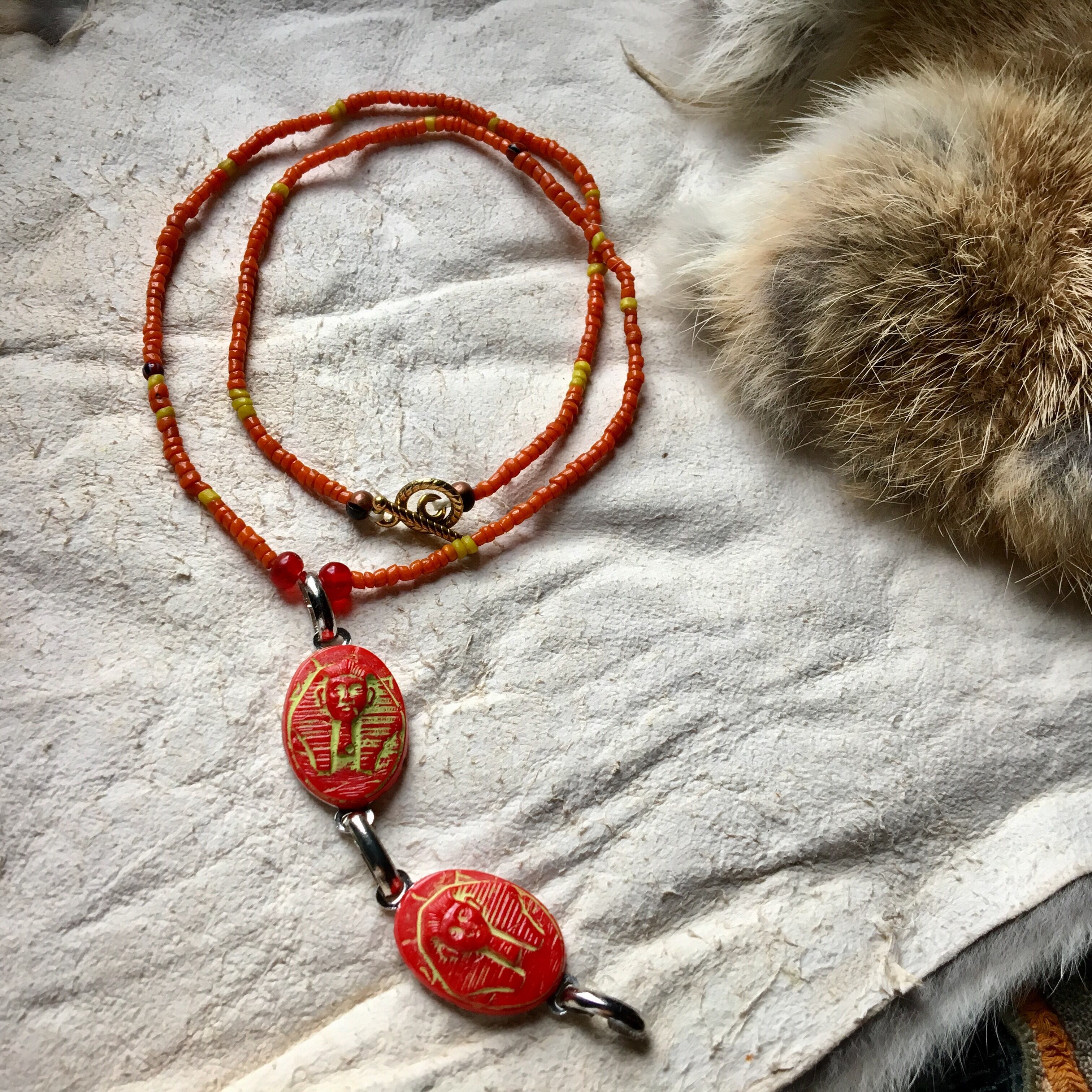 古代エジプトのリバイバル、アールデコ、チェコヴィンテージファラオTOPをダブル使いにアンティークの少数民族シードビーズを使用したネックレスになります。縦に伸びたデザインがお洒落に揺れ動きます!このリバイバルガラスはとても好きなジャンルです!