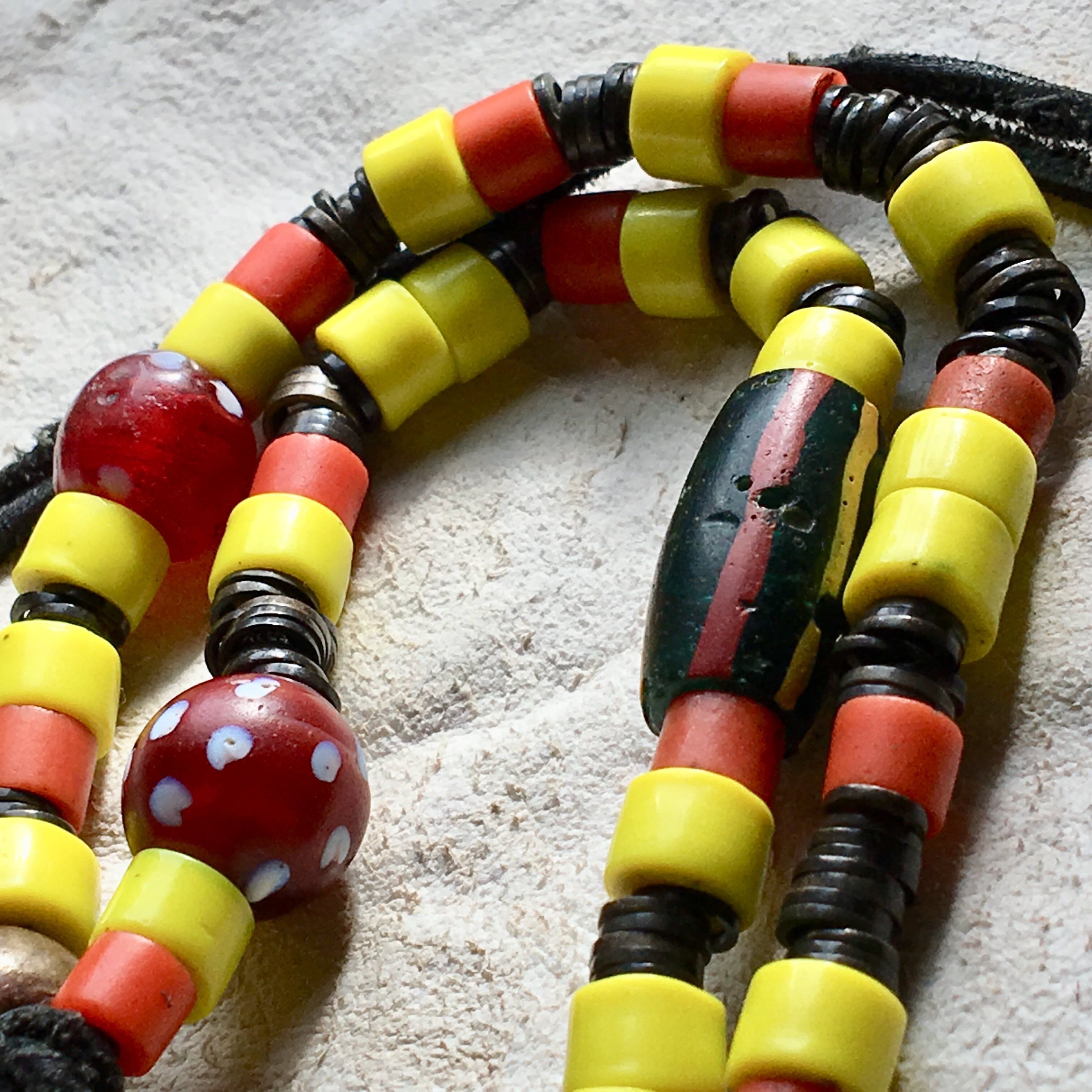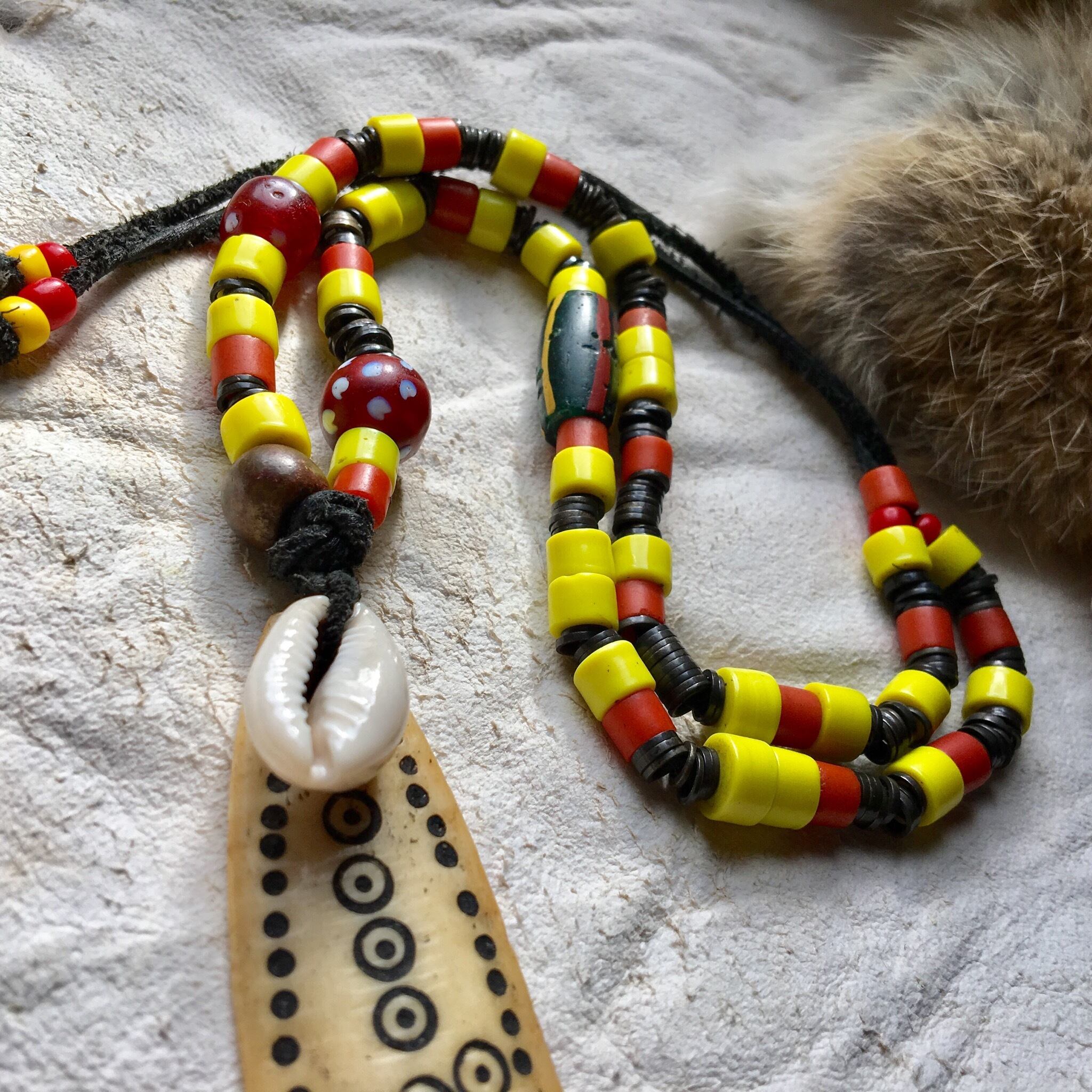 動物の骨オールドTOPにアンティークビーズ、スカンク、筋玉、アンティークのチン族輪っかブラスを使用したトライバルネックレス作品。