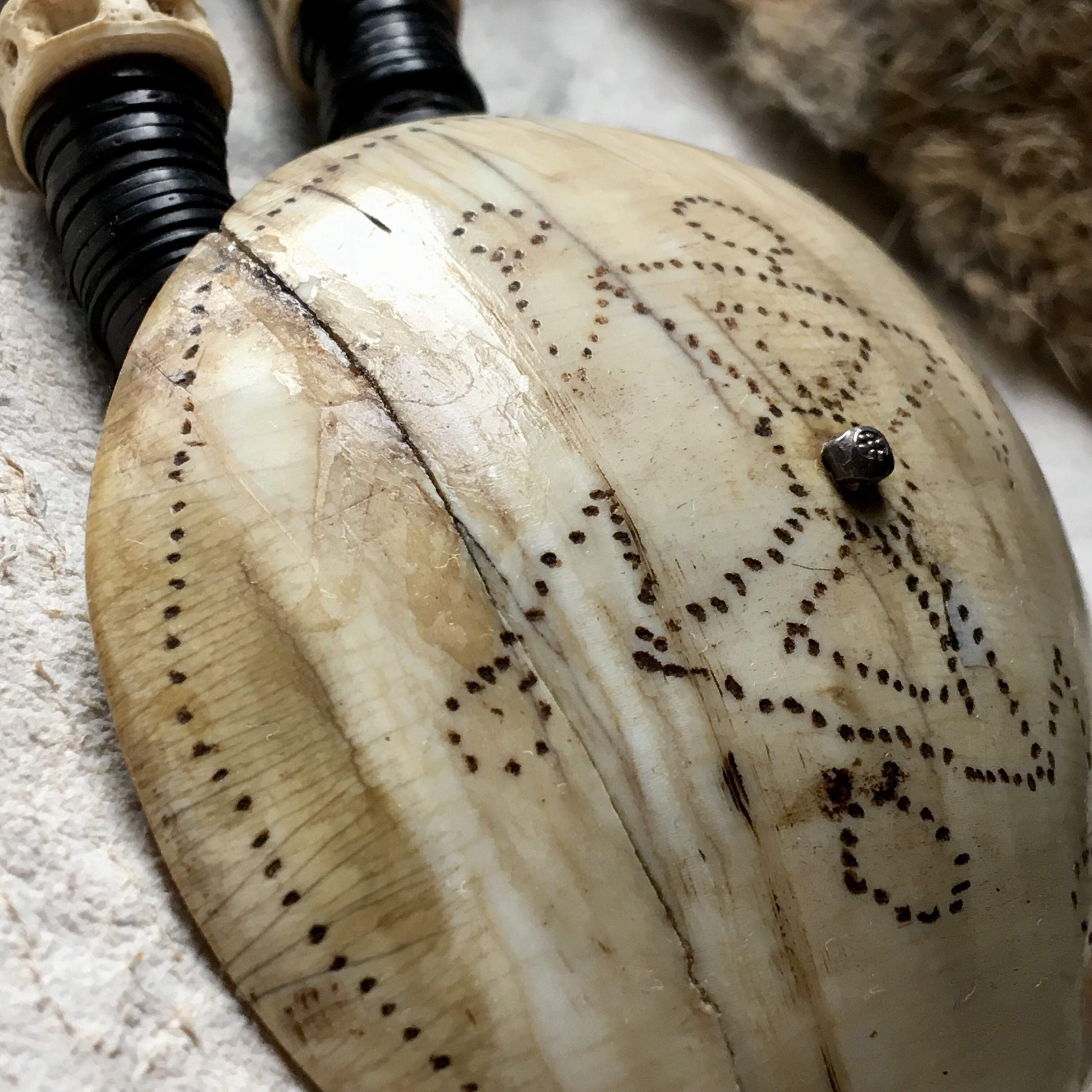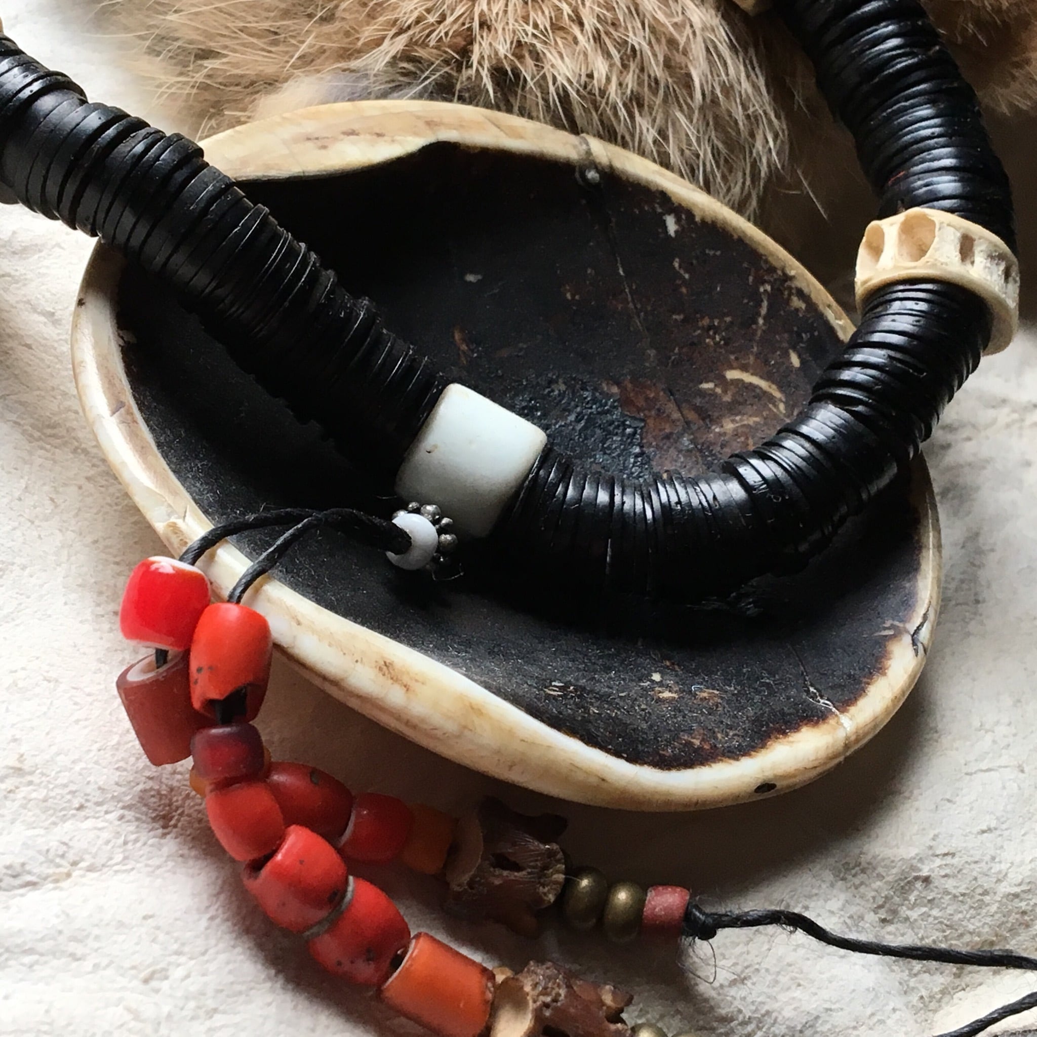 アンティークのアフリカレコード盤ビーズにスカンク、魚の骨、アンティークマサイピンクビーズ、アンティークタマン族の赤いビーズにホワイトハーツ、アフリカアンティークのスネークを使用したプリミティブなネックレス作品。