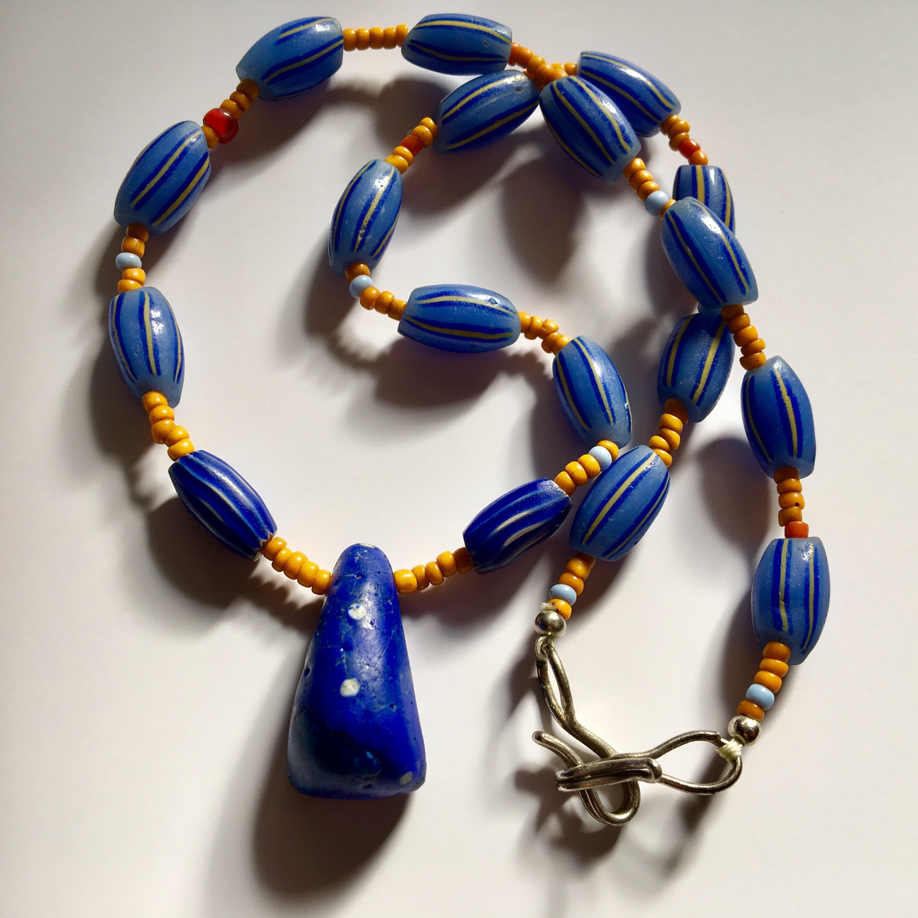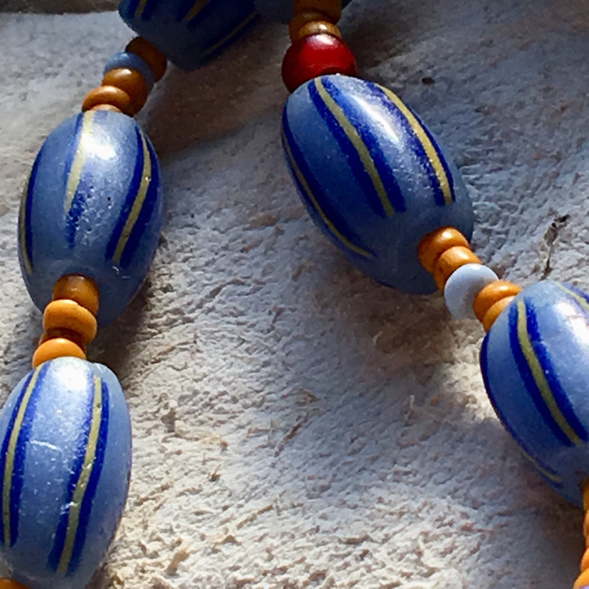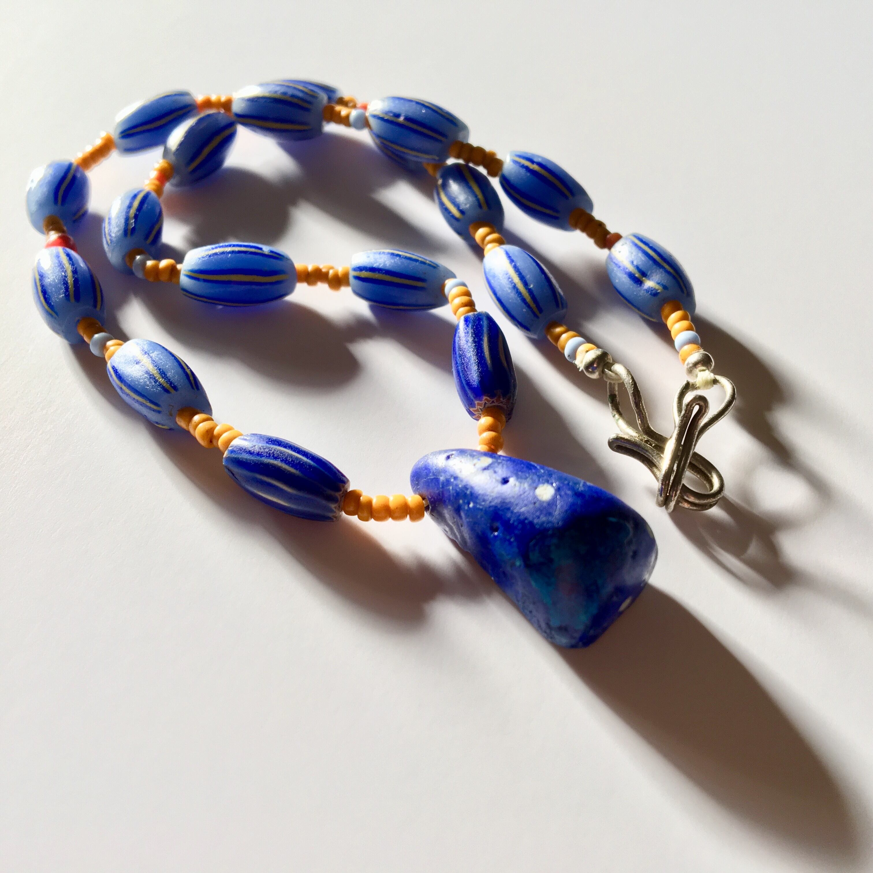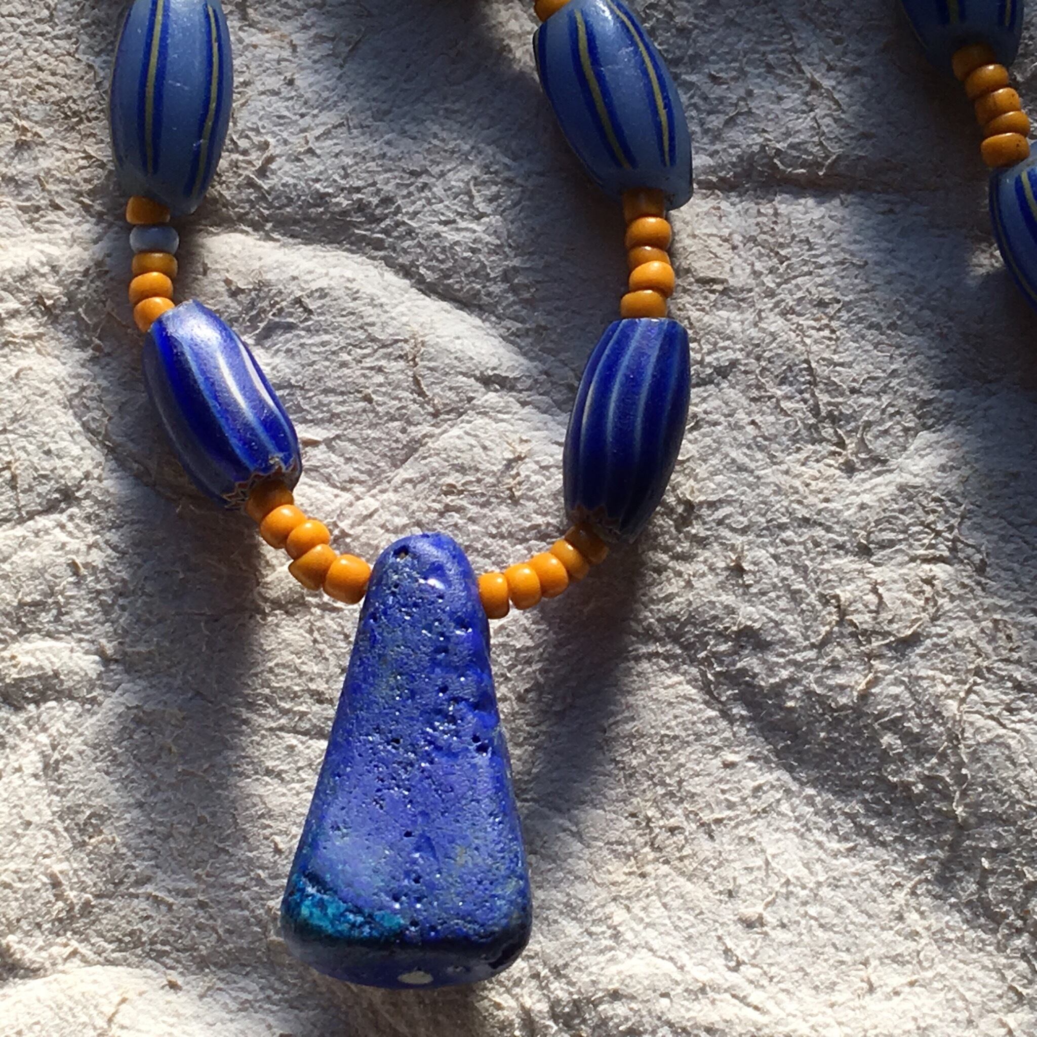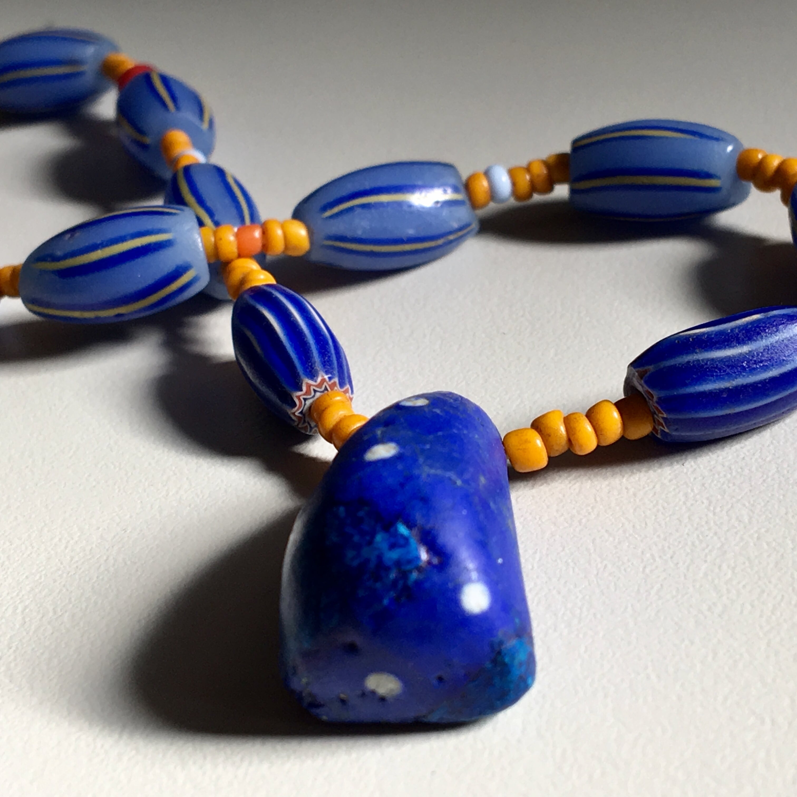 モーリタニア、コレクタブル希少なアンティークのアフリカ再生玉キファビーズをTOPにアンティークのカンネ筋玉に少数民族のオレンジシード、アンティークシェブロンを仕様したネックレス作品。