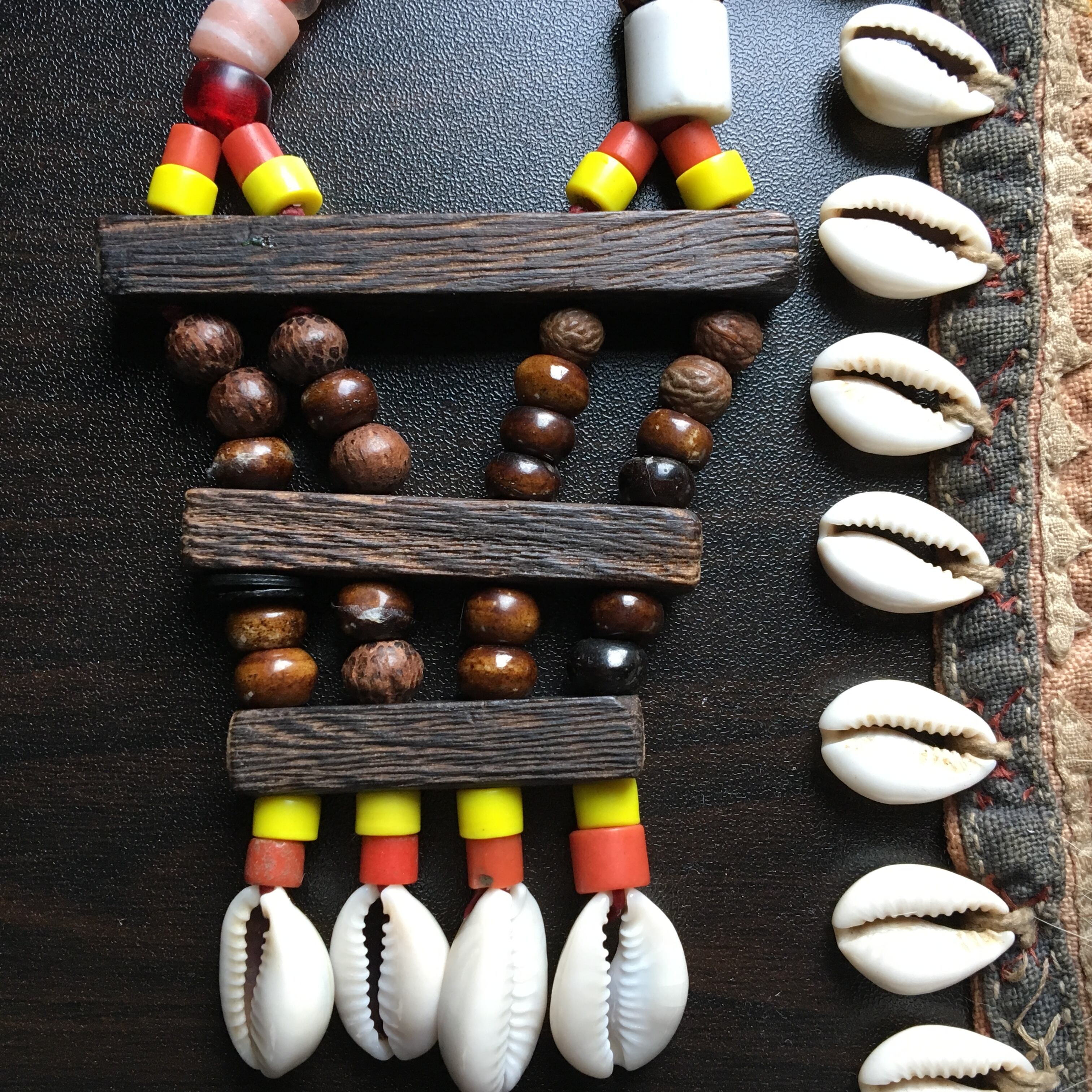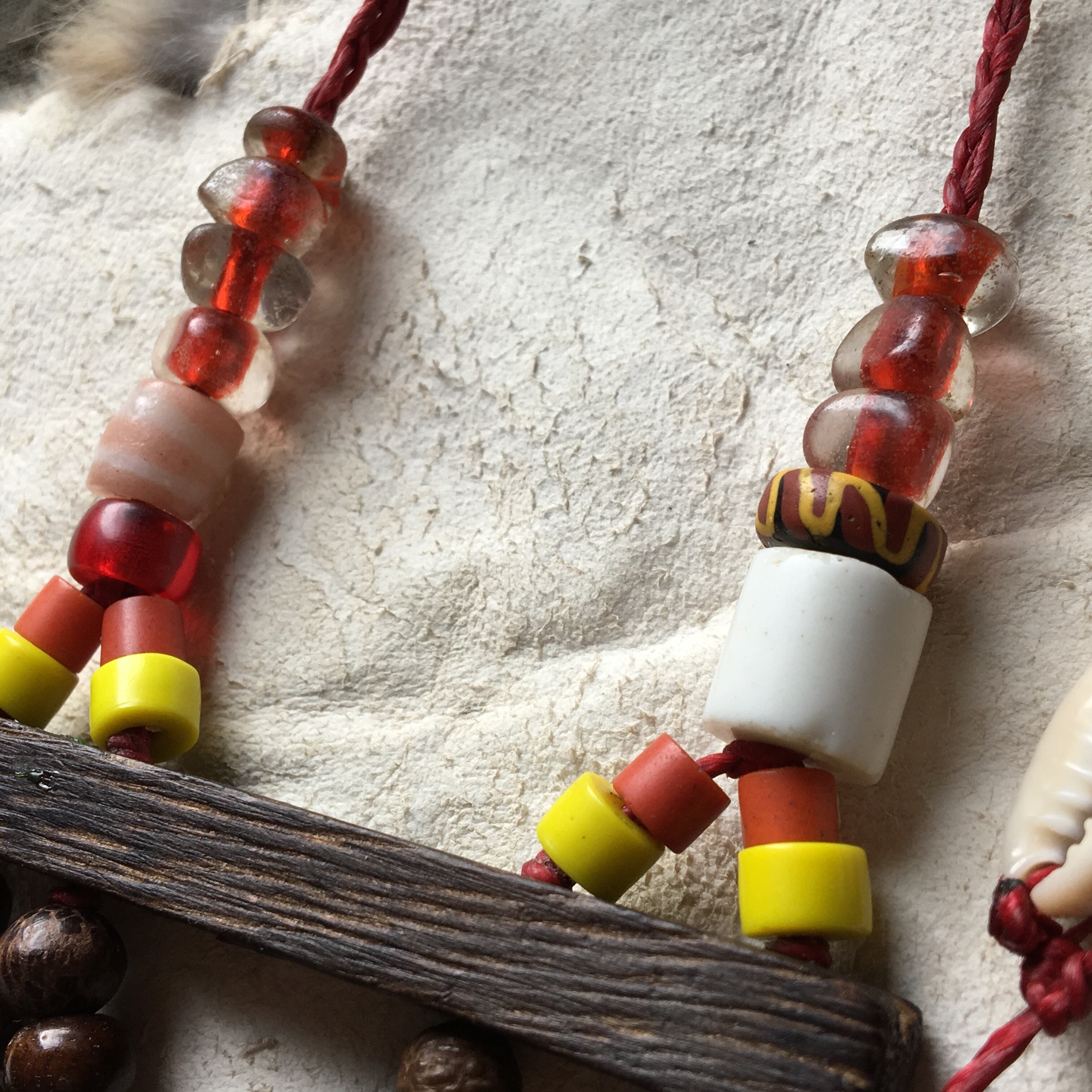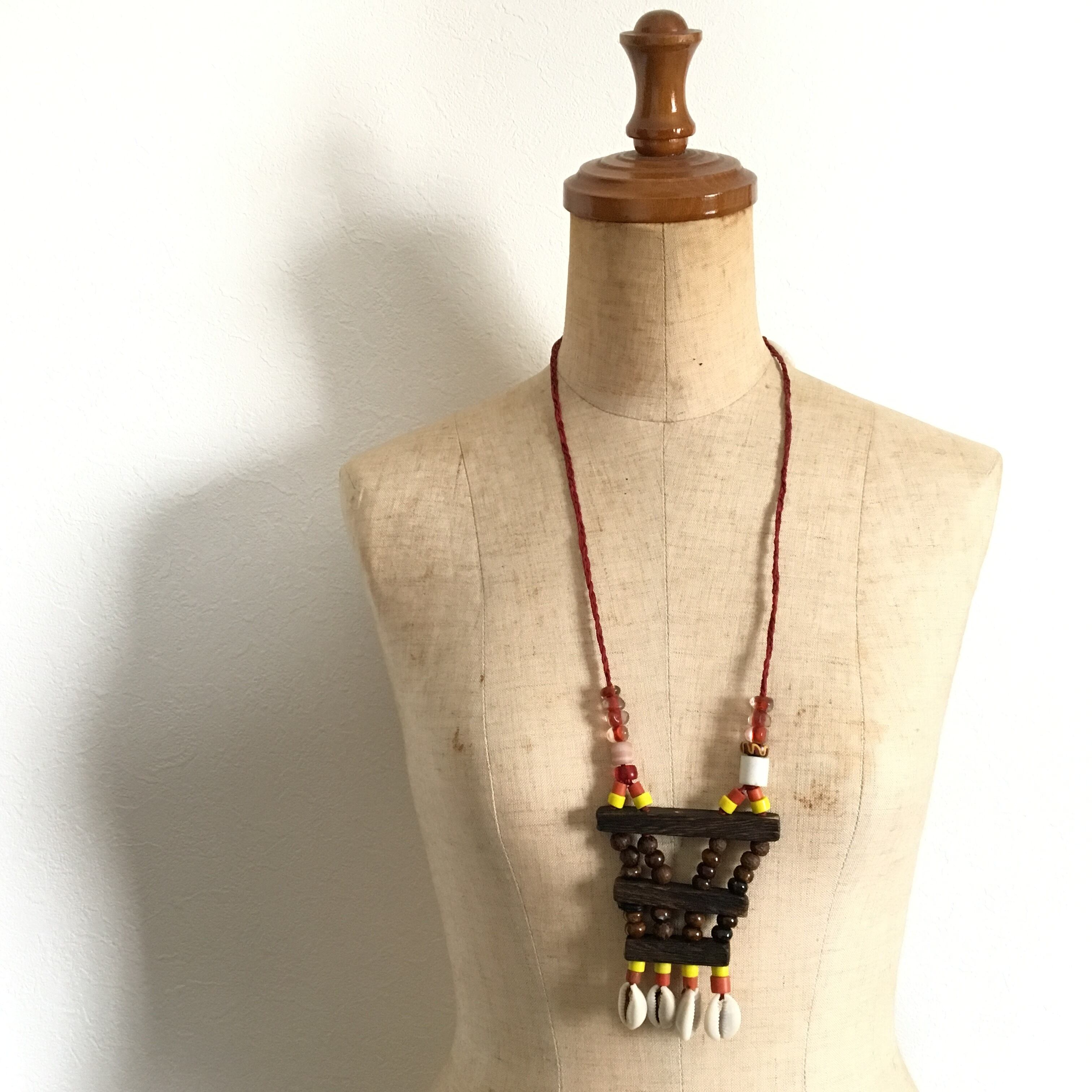 ナガ族三角形ビーズにアンティークの黄色&オレンジビーズ、現代のウッドビーズ、焼き目を入れて制作した三本の木、菩提樹、ウェーブ模様が素敵なヴェネチア産のアンティークビーズ平らなフォルム&ホワイトビーズ、パドレビーズ、子安貝を使用したプリミティブネックレス作品。