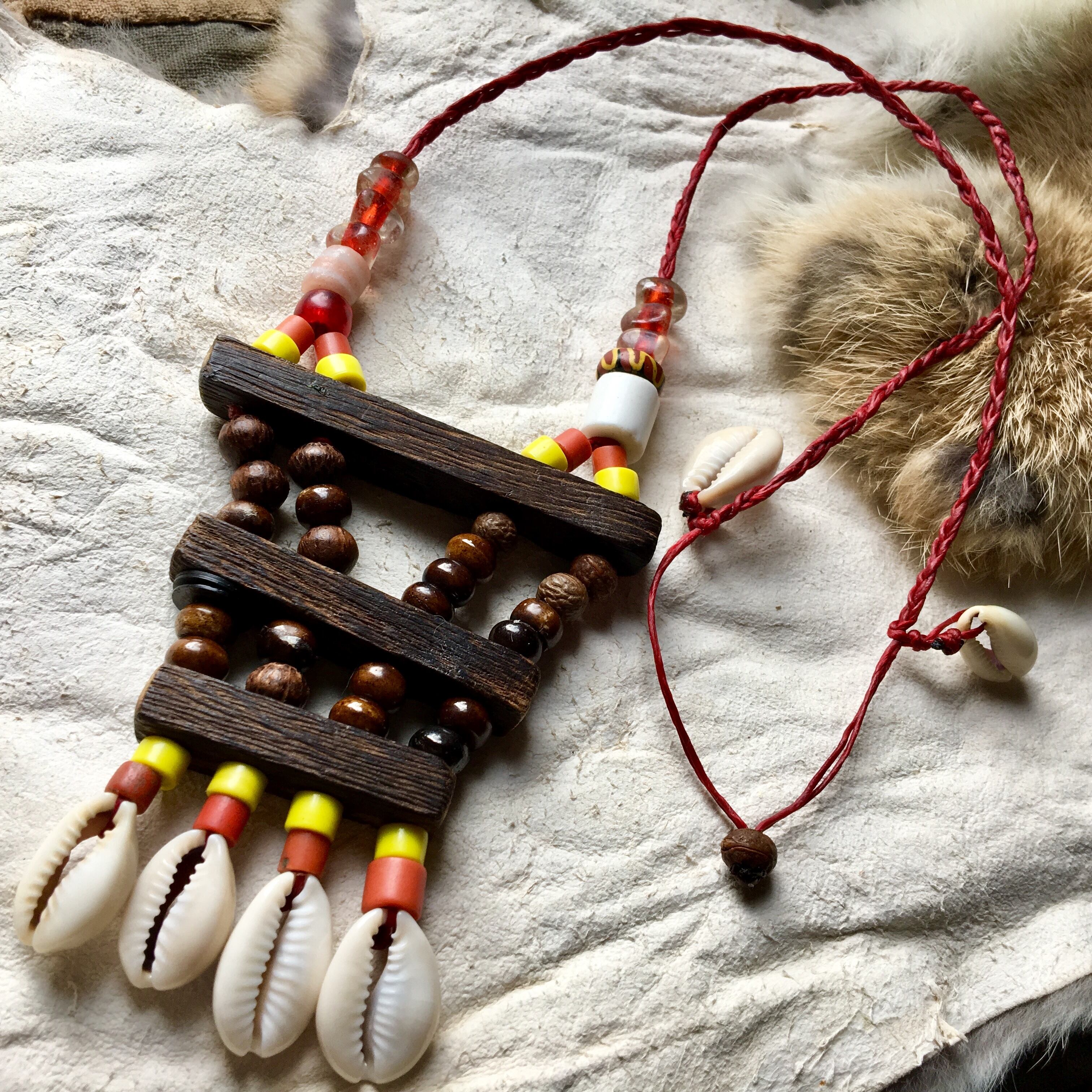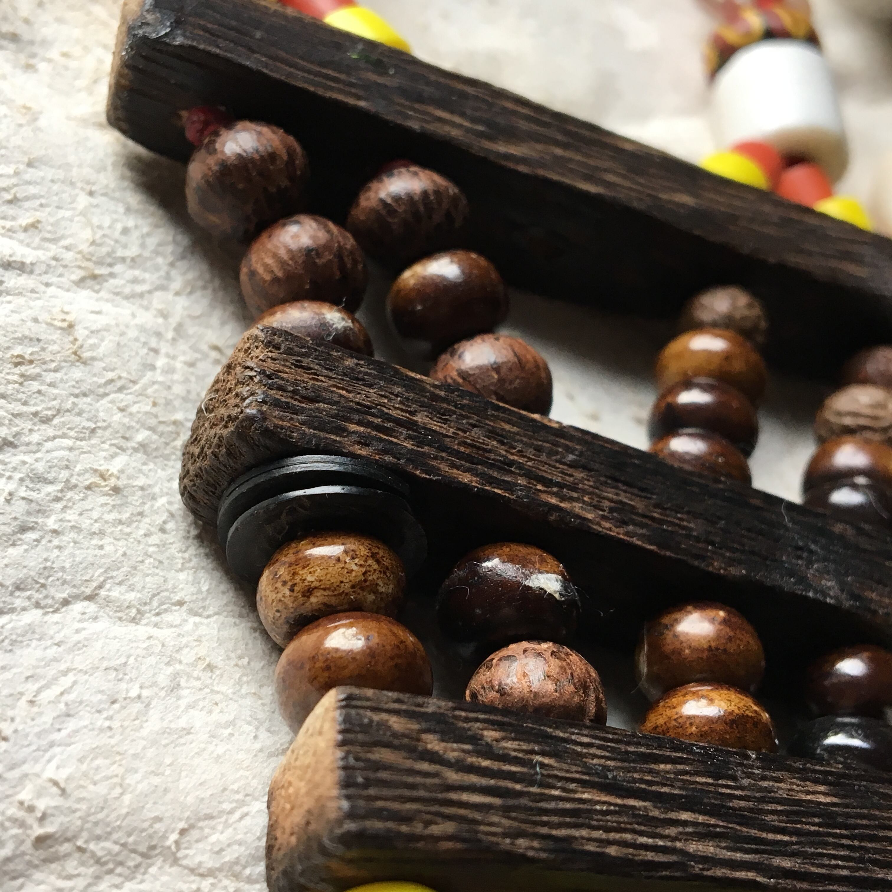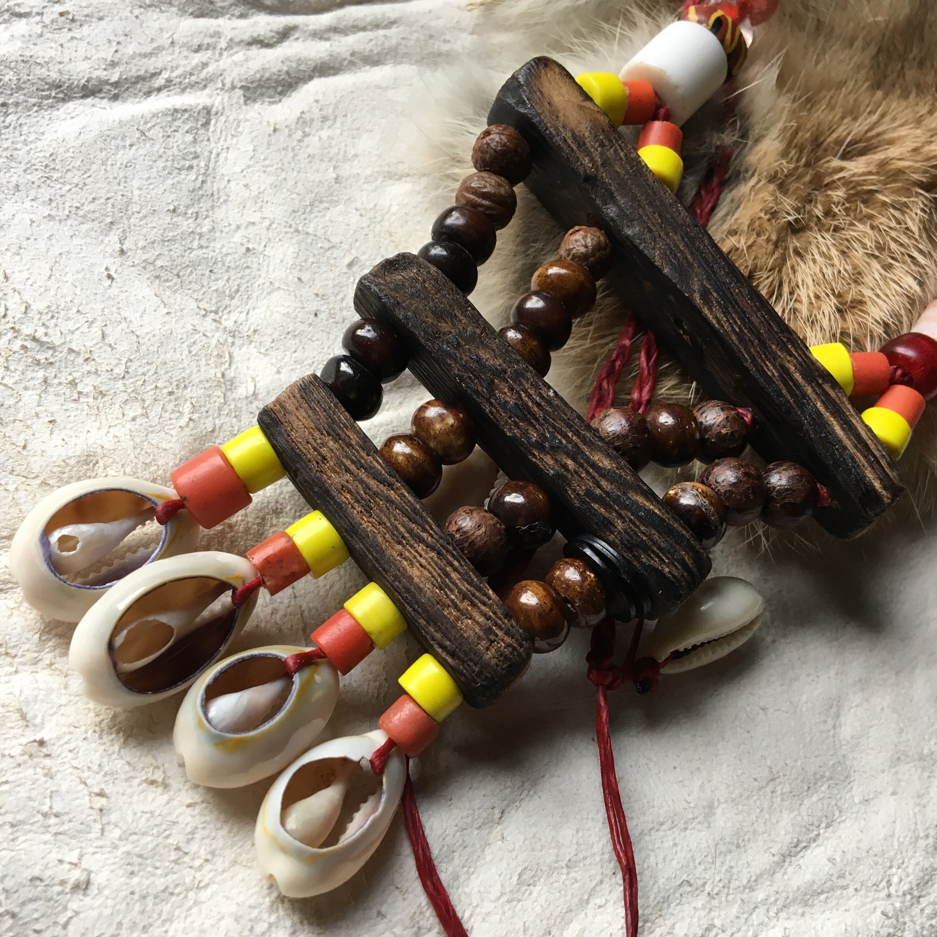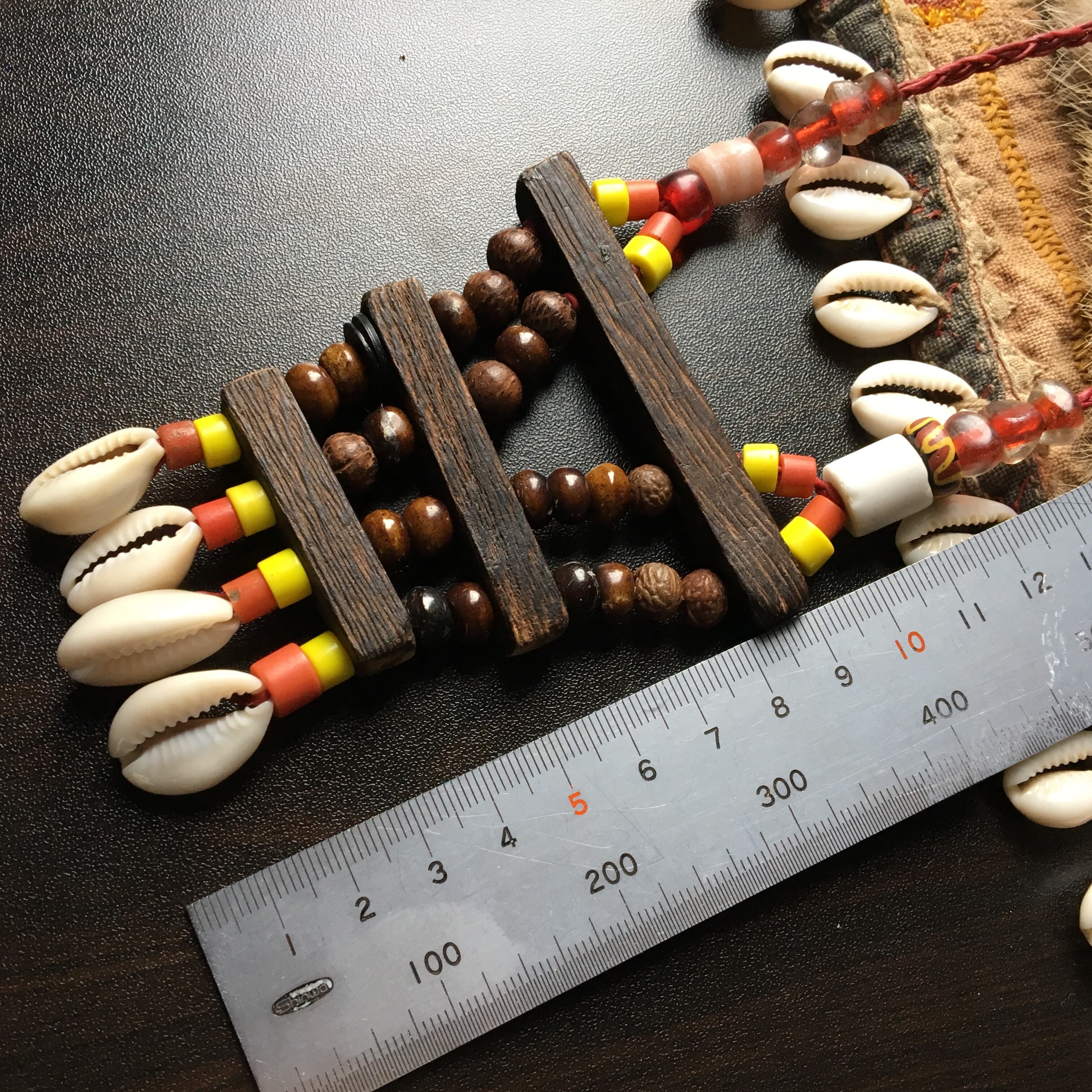 ナガ族三角形ビーズにアンティークの黄色&オレンジビーズ、現代のウッドビーズ、焼き目を入れて制作した三本の木、菩提樹、ウェーブ模様が素敵なヴェネチア産のアンティークビーズ平らなフォルム&ホワイトビーズ、パドレビーズ、子安貝を使用したプリミティブネックレス作品。