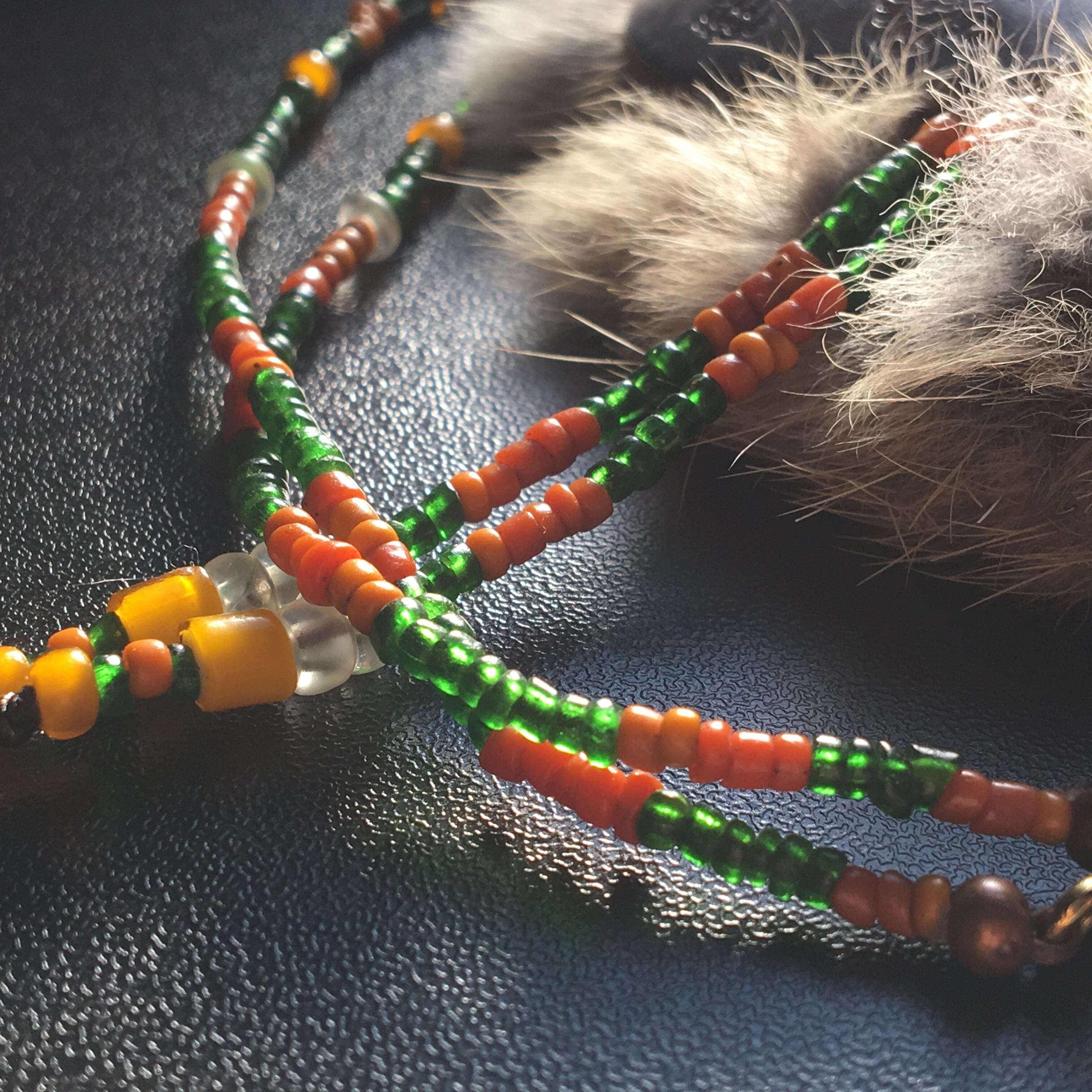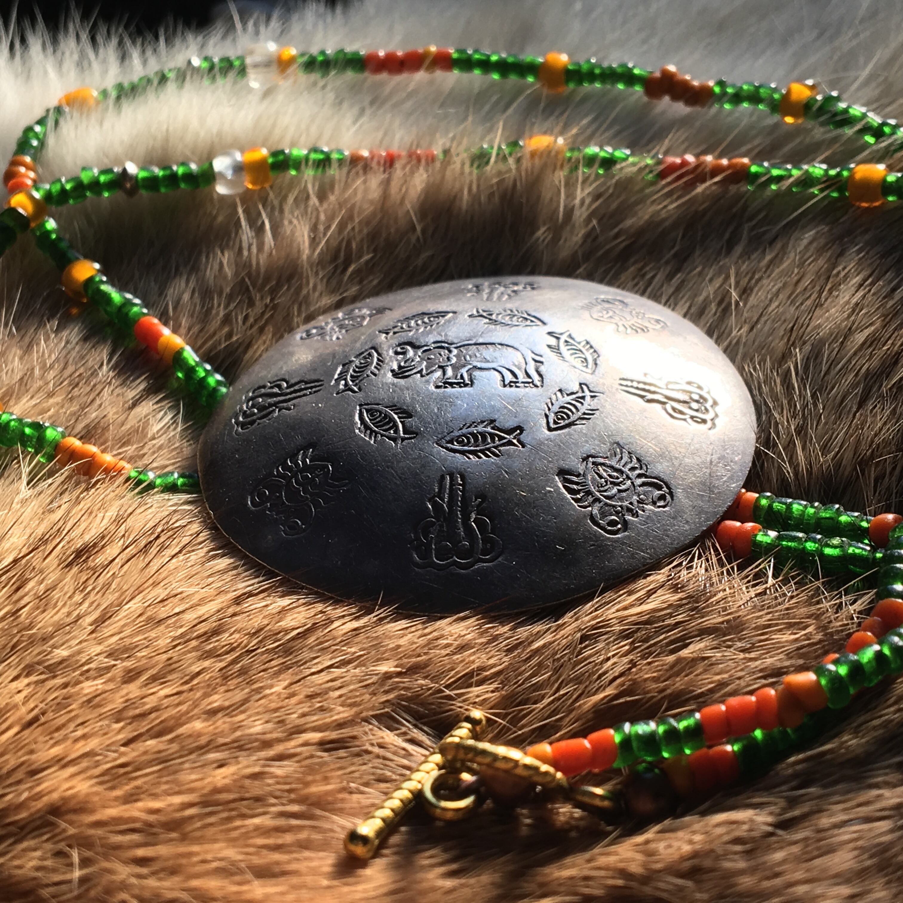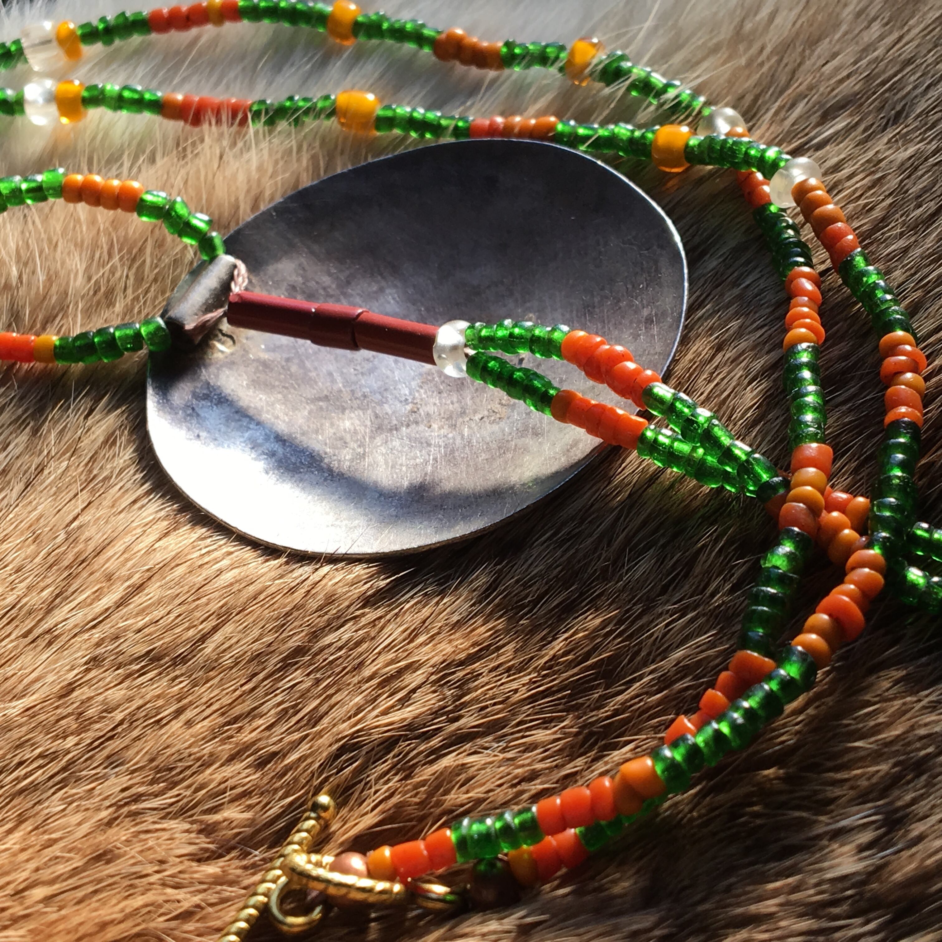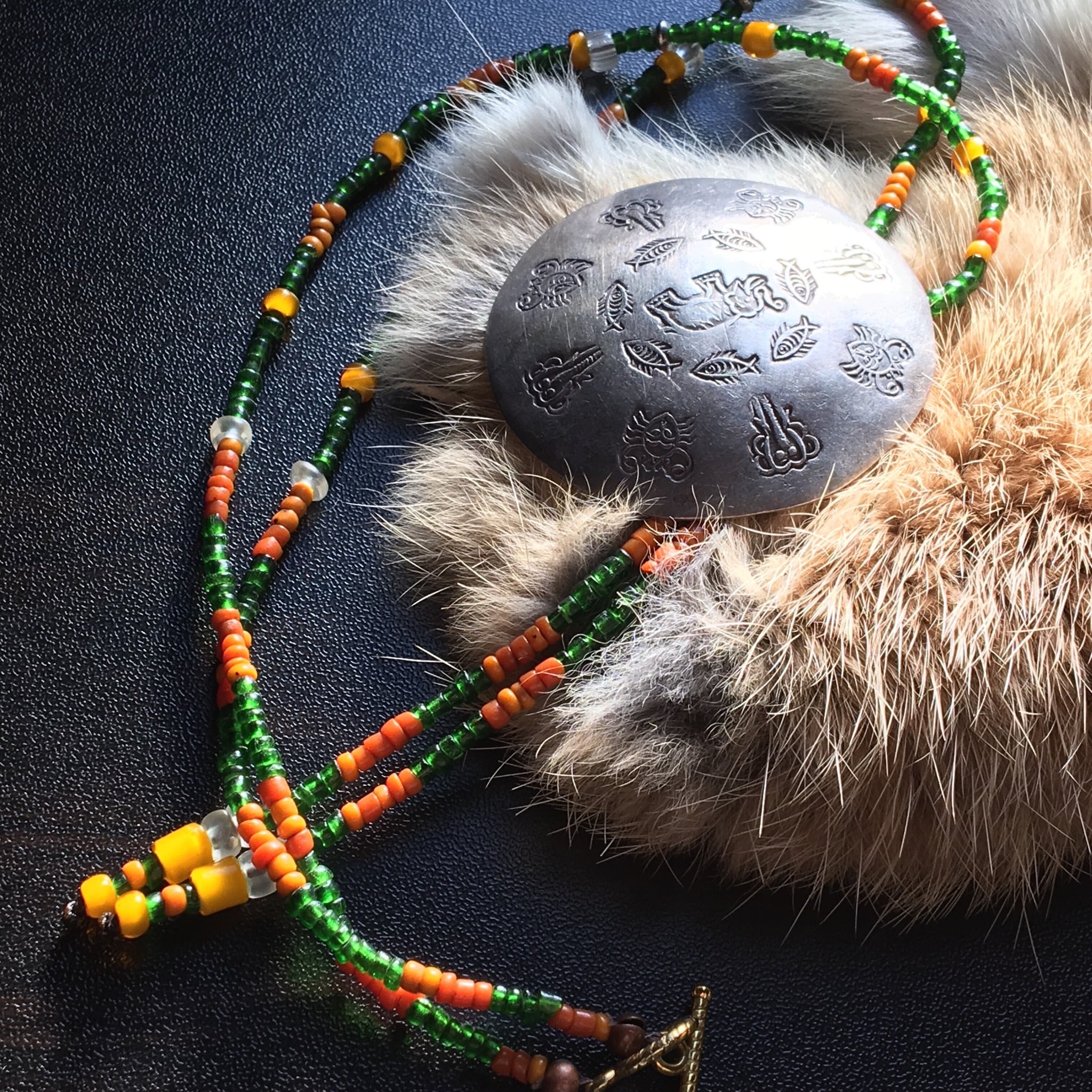 アンティークのシードビーズに大きめTOPのカレンシルバーを使用したネックレス作品。