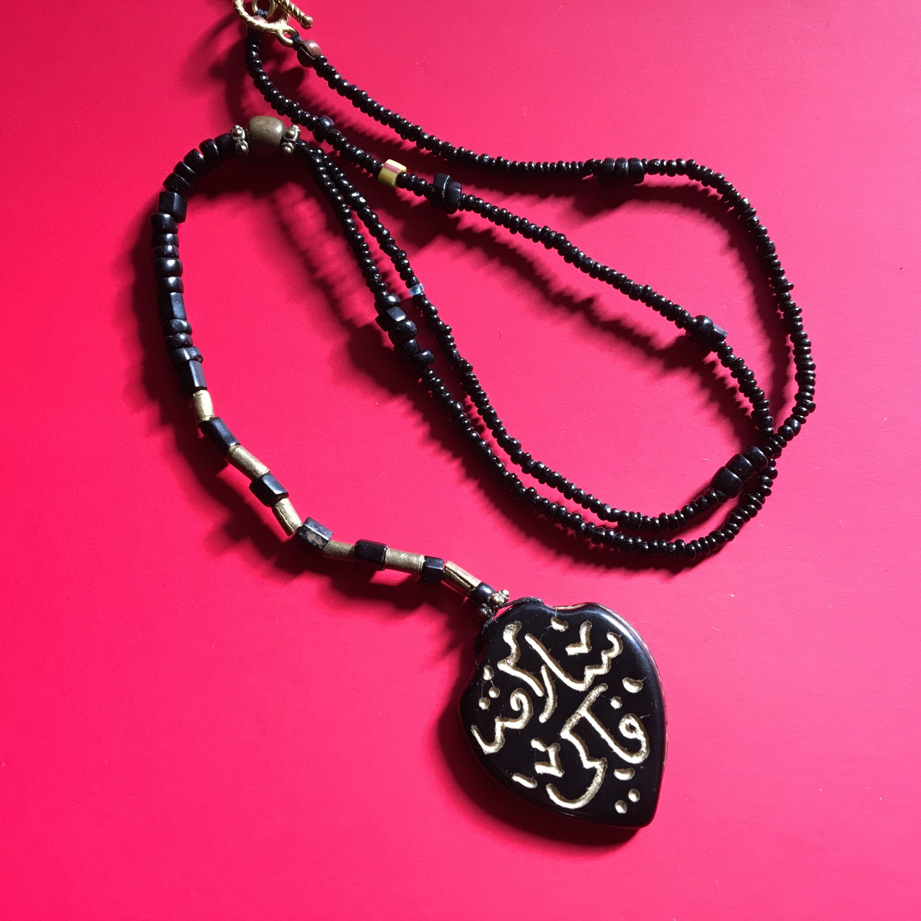 アンティークボヘミアハッジビーズにヴェネチアブラックビーズ、ブラスビーズを使用したネックレス作品。