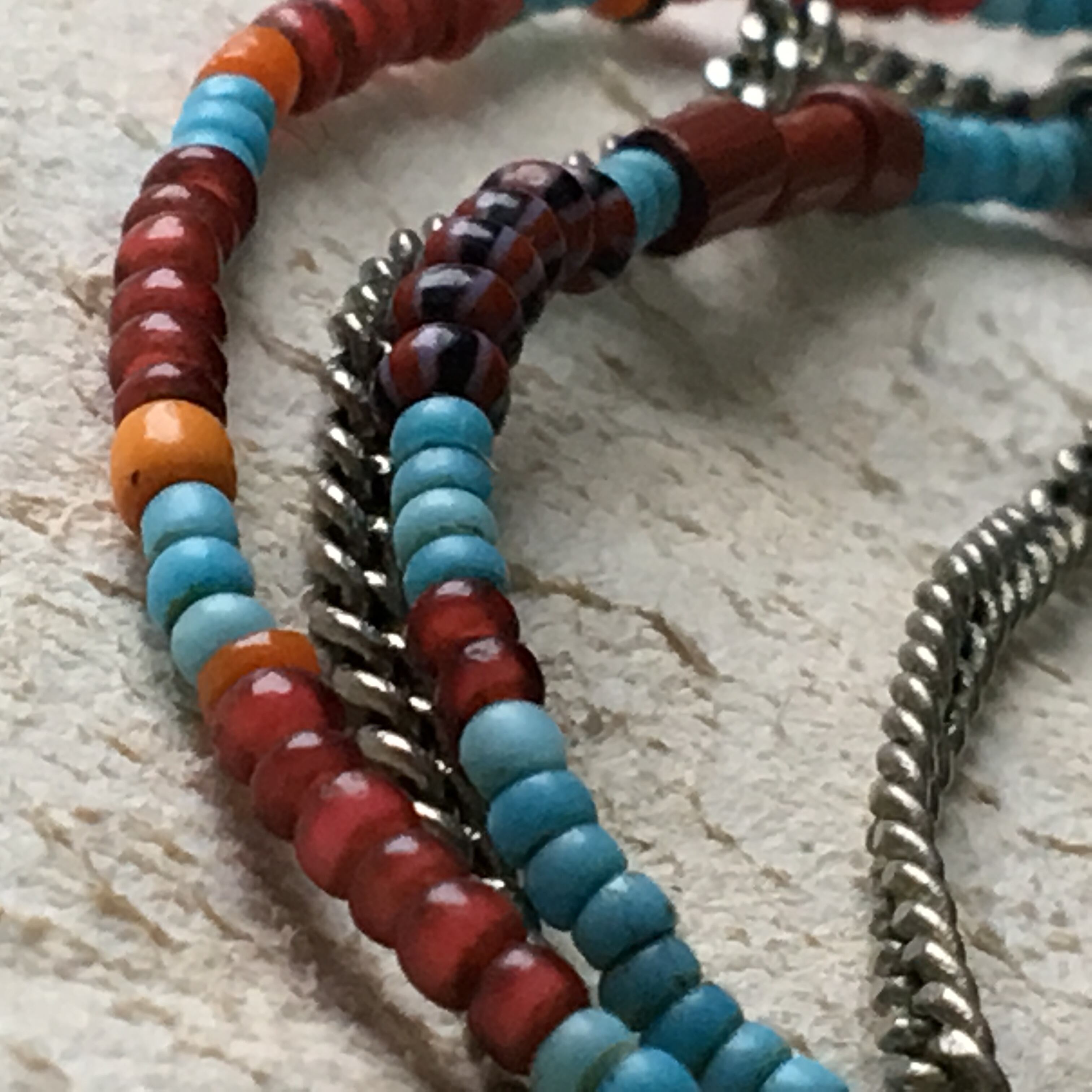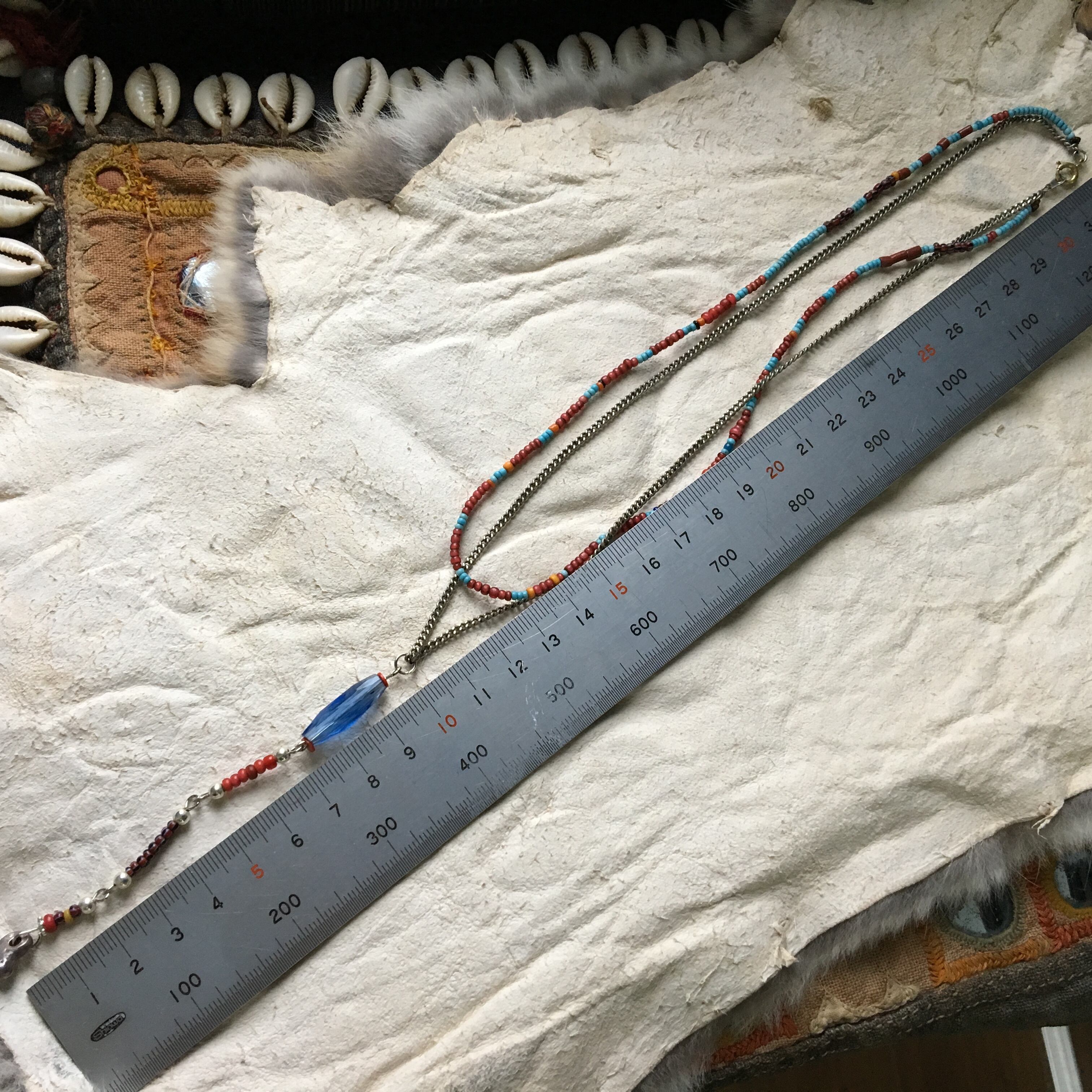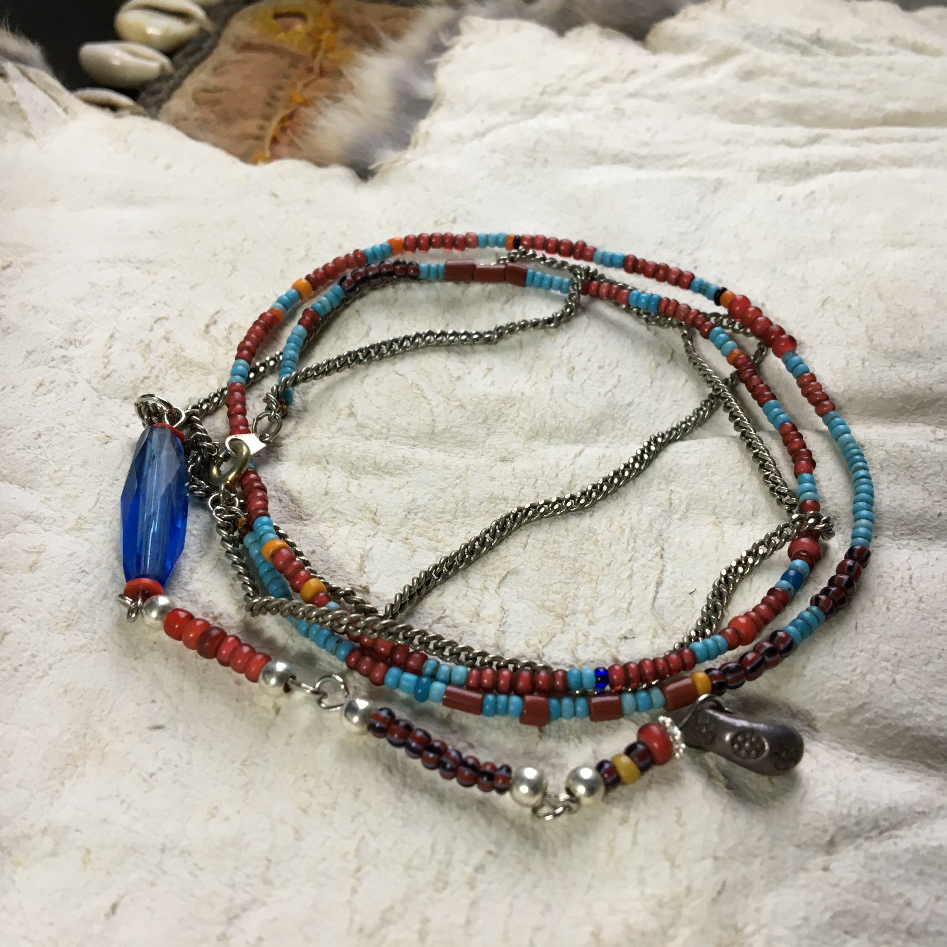 【No.214】antique ロシアンブルー 金赤 ホワイトハーツ シードビーズ チェーン カレンシルバー 2連 ネックレス