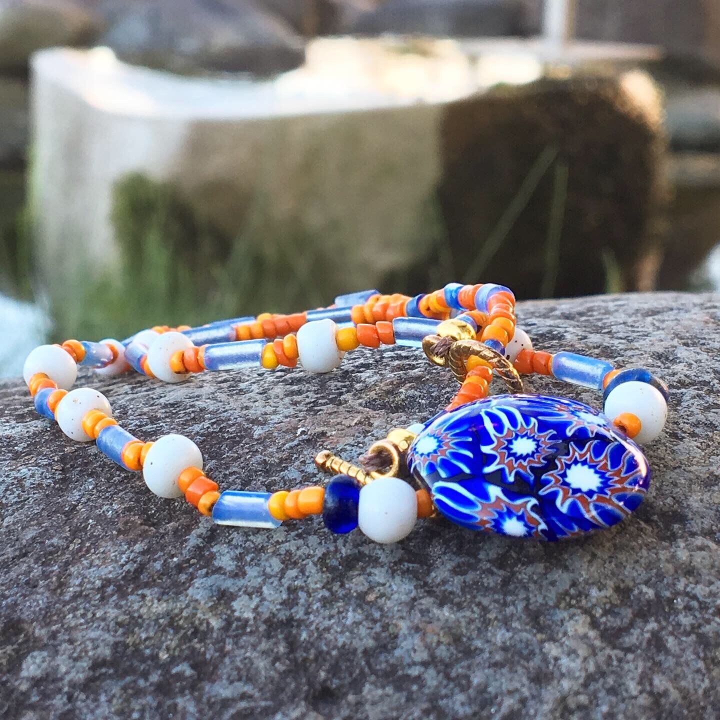 1950年代のオールドフラットシェブロンをTOPに少数民族のオレンジアンティークビーズ、タマン族のホワイトビーズ、ヴェネチアアンティークシリンダー型ブルービーズで仕上げた作品。