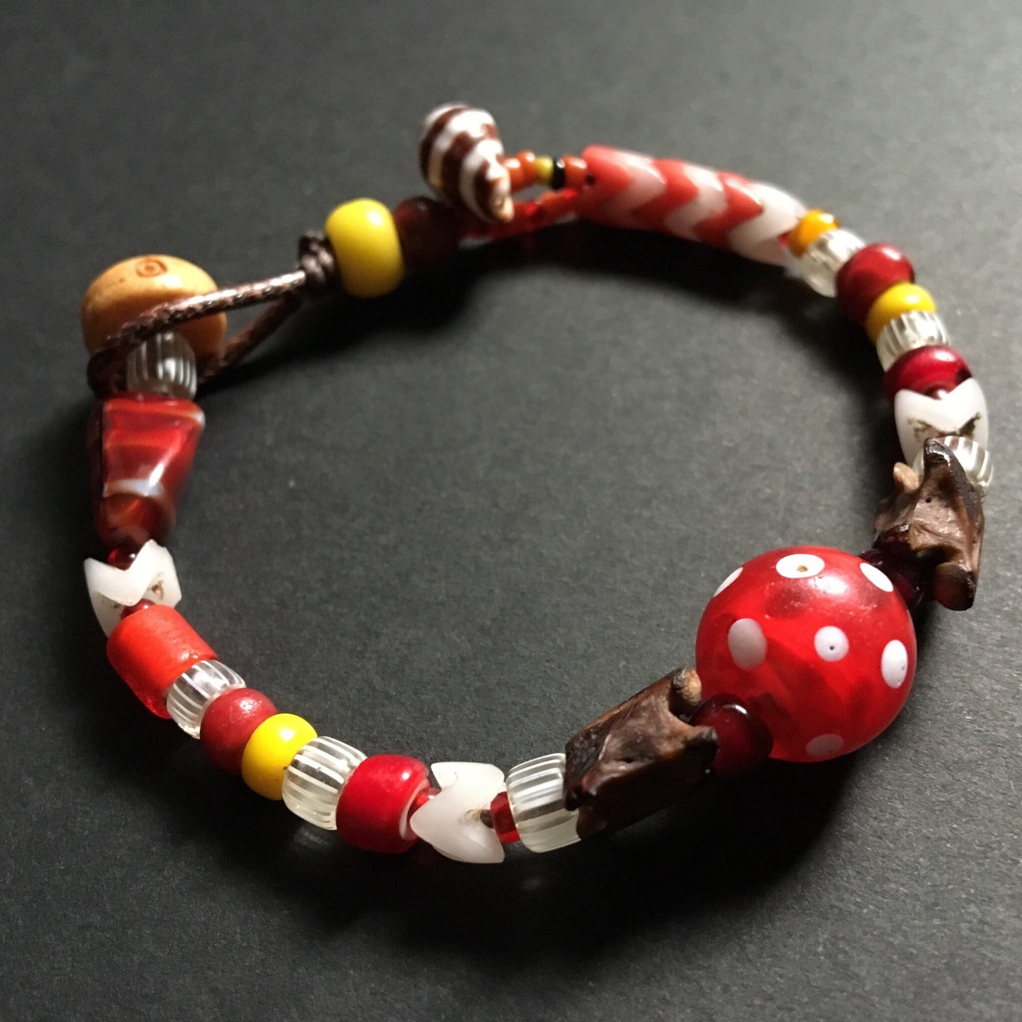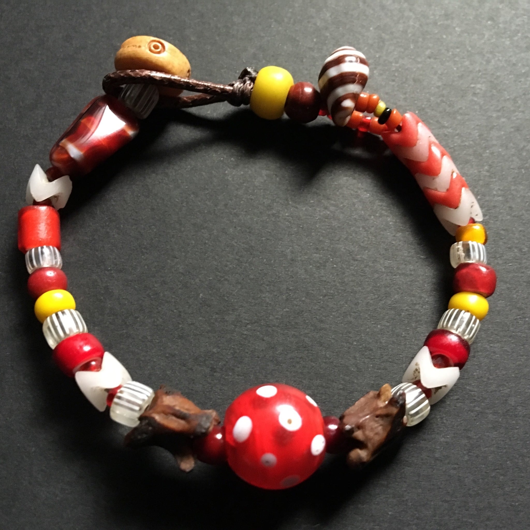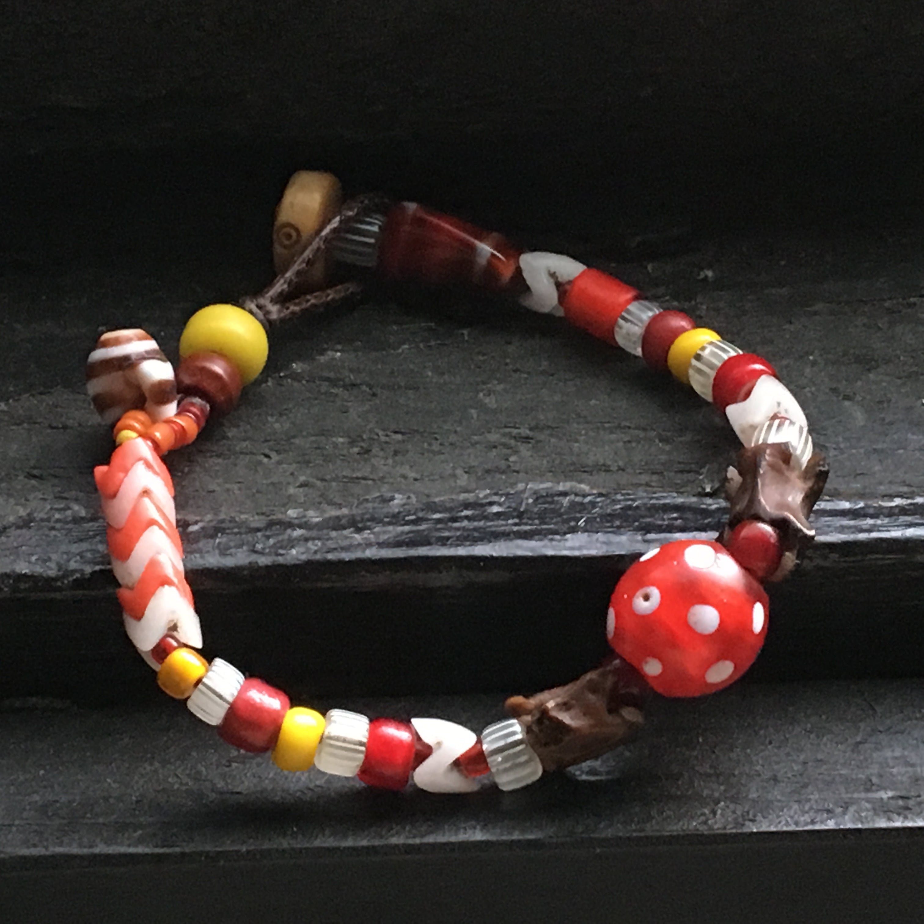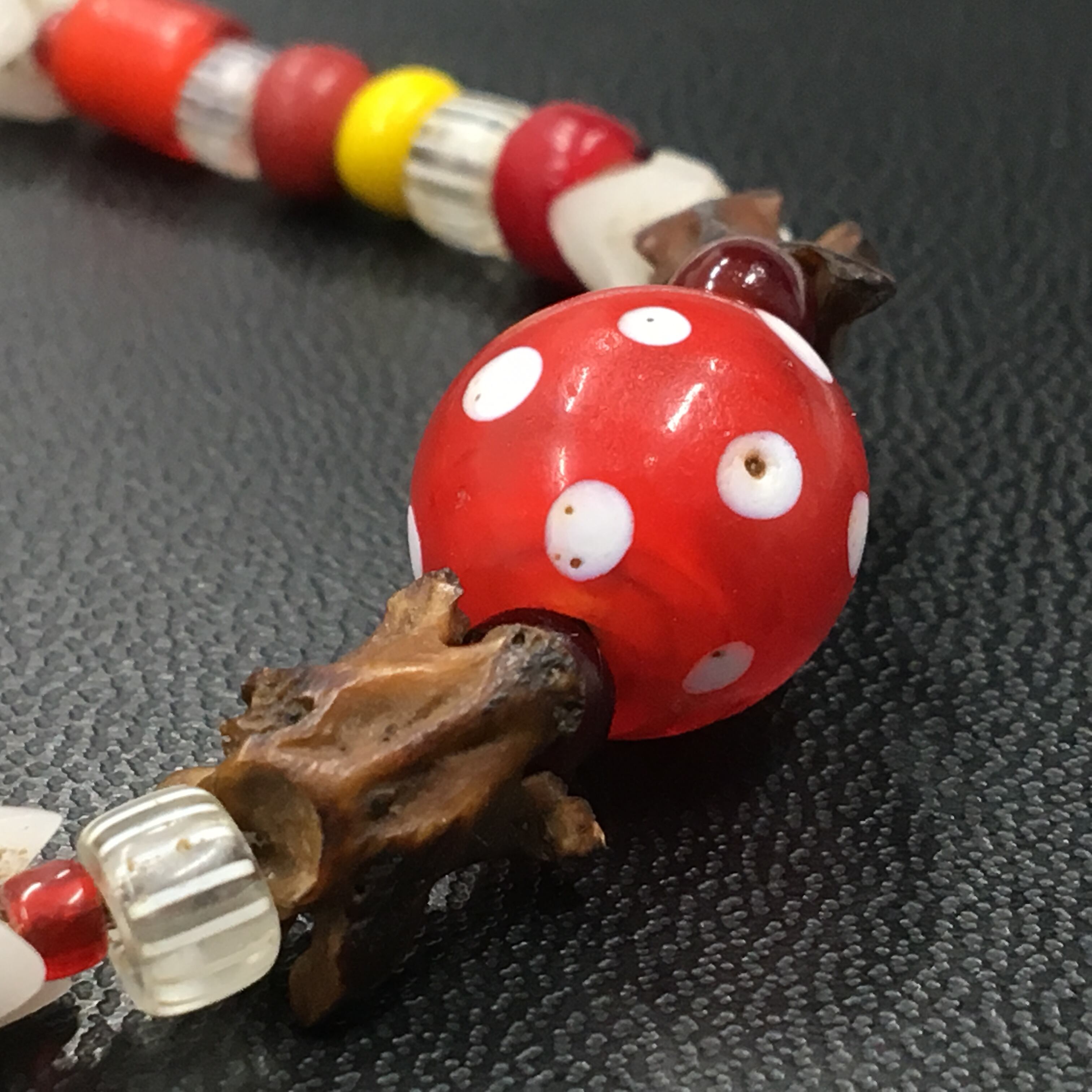 ヴェネチア産アンティークのスカンクをTOPにアフリカ蛇骨を挟み、金赤ホワイトハーツ、グーズベリー、ボヘミアビーズ、スネークビーズ、シードビーズ、パドレイエロービーズ、プロッサービーズ、貝殻を使用した護符ブレスレット作品。