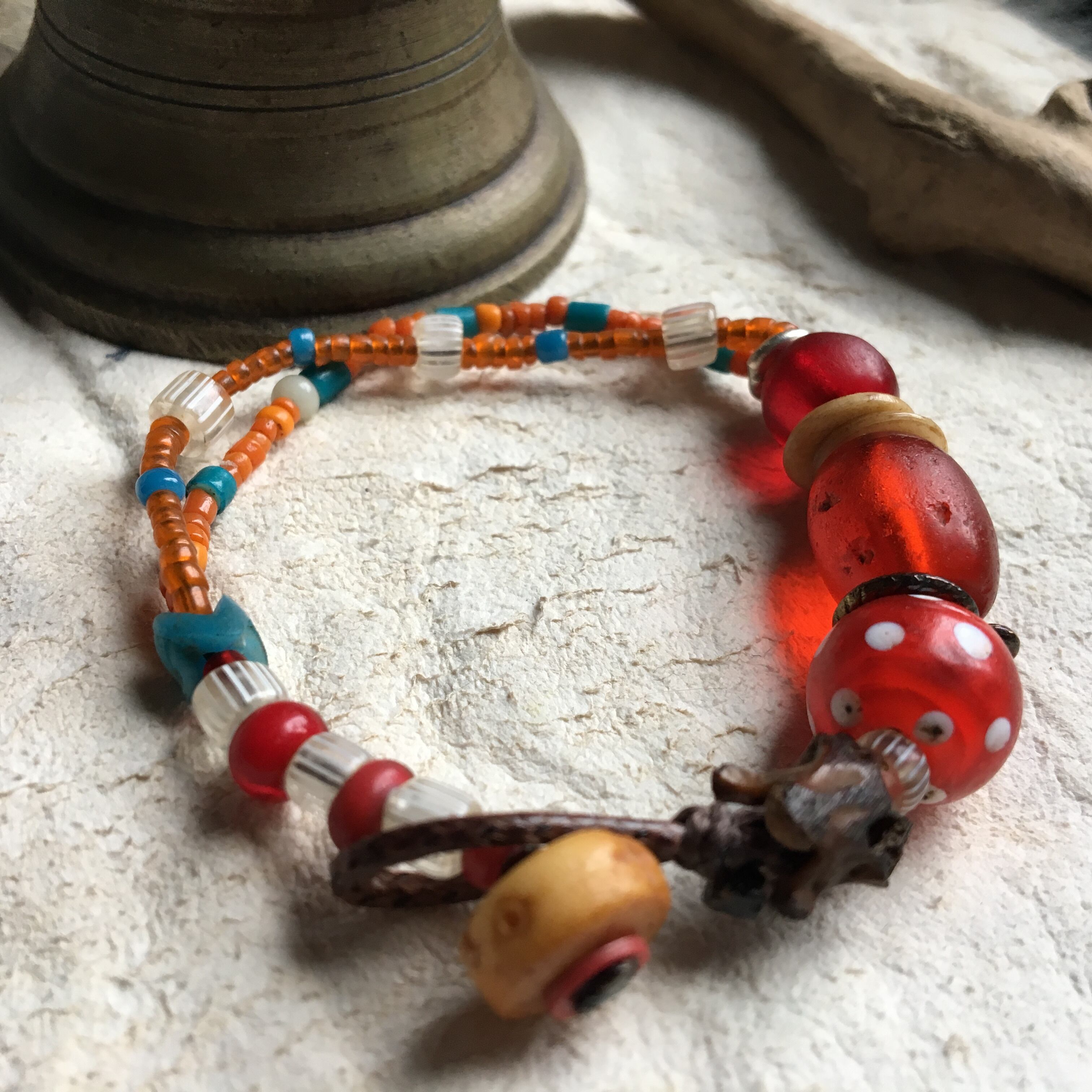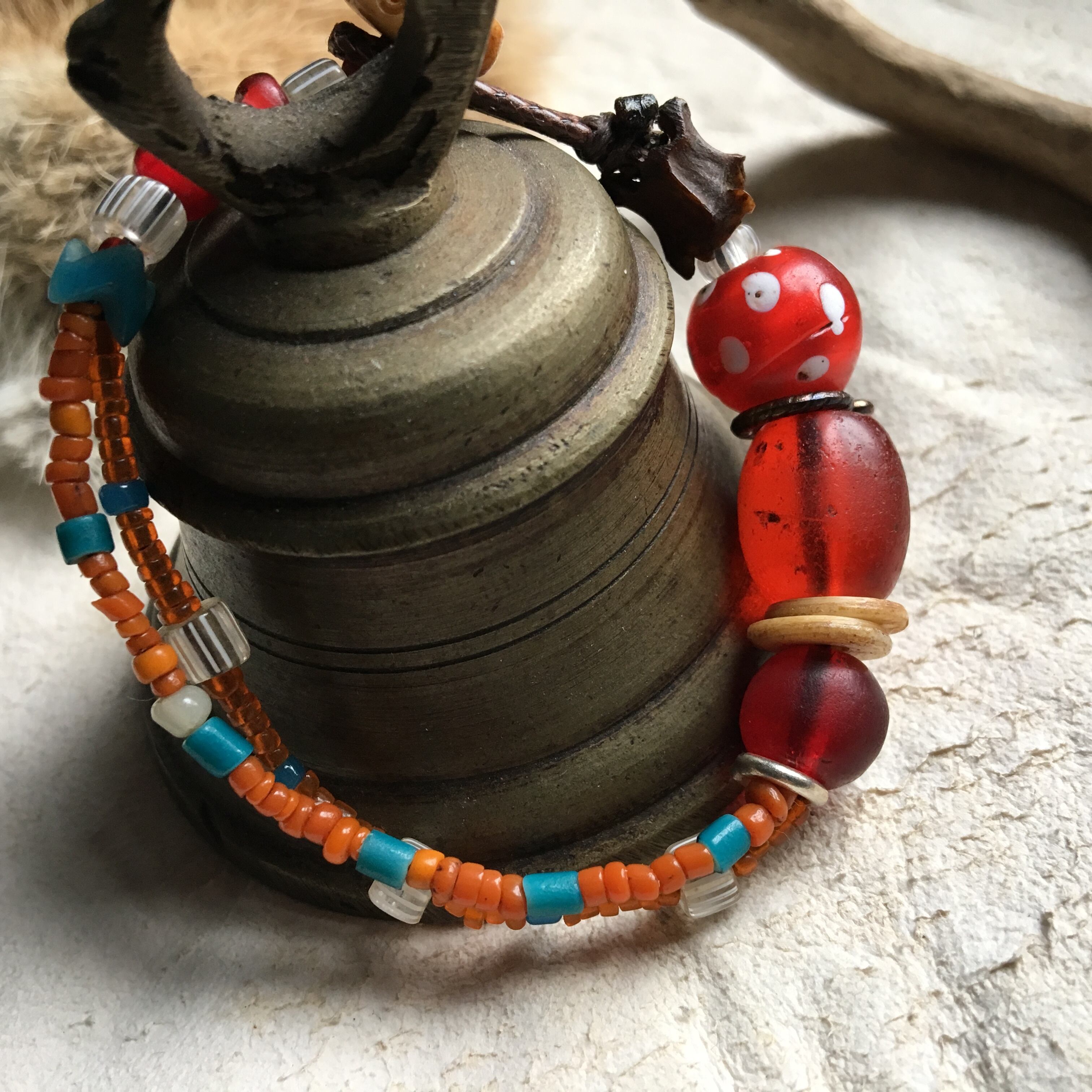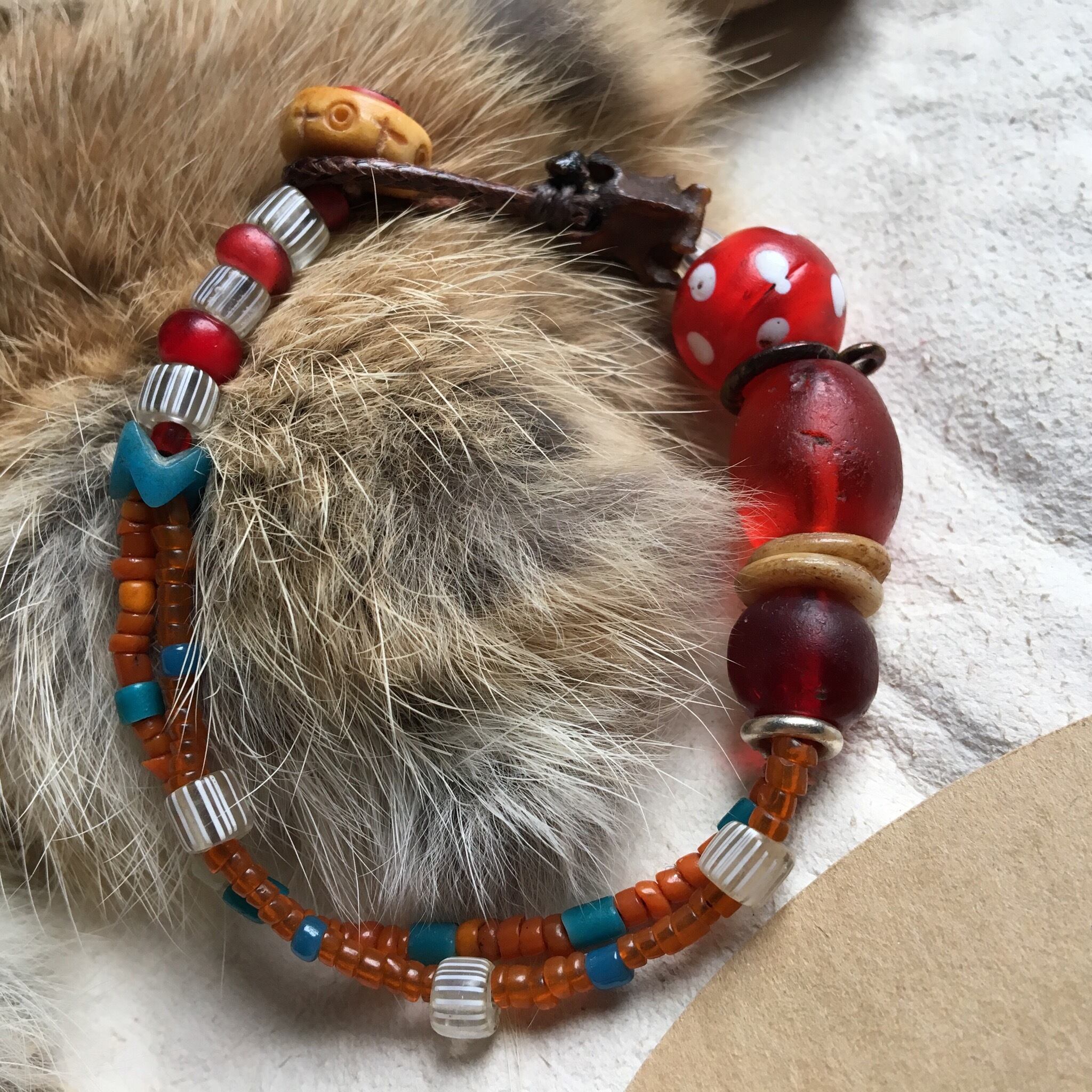 【No.240】『赤い衝動』自分で+α 変則2連 antique スカンク 希少レアなブルーホワイトハーツ ボヘミアレッド シードビーズ 蛇骨 グーズベリー トライバル ブレスレット