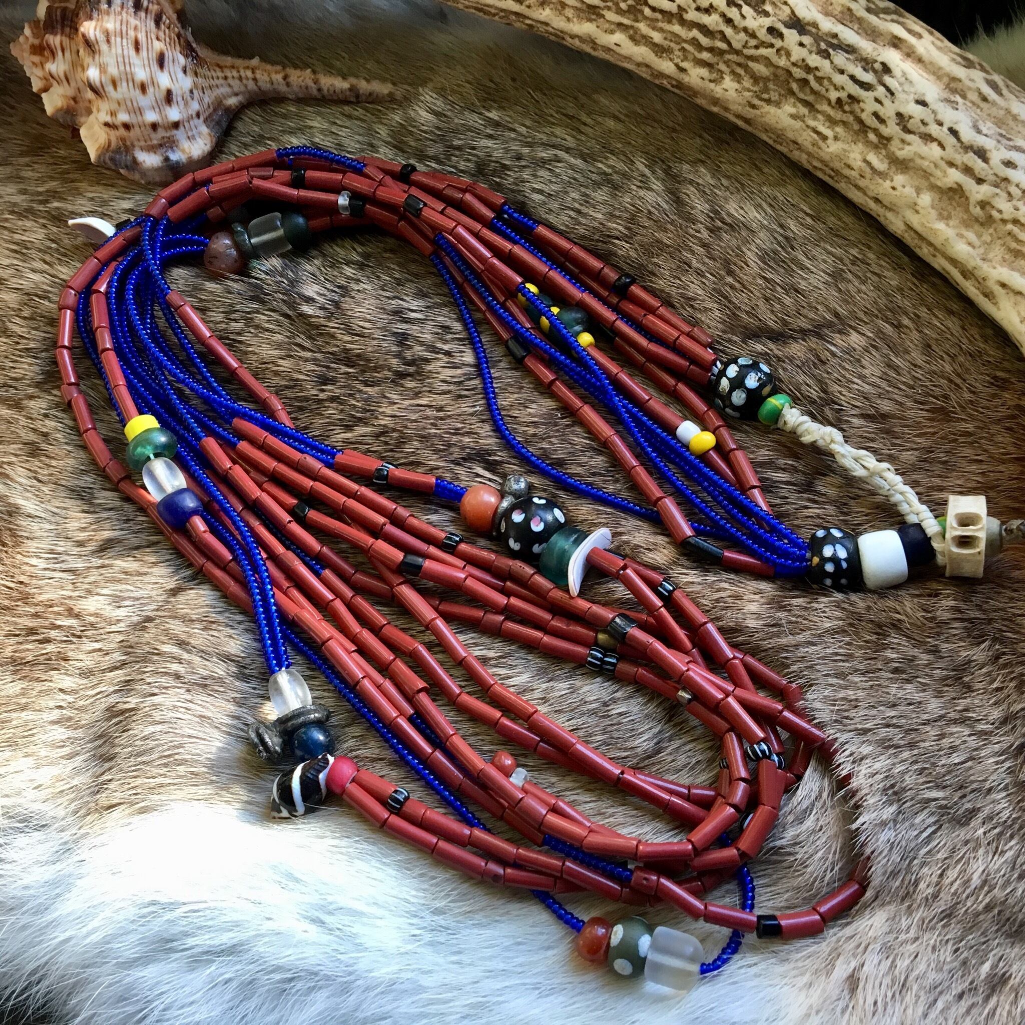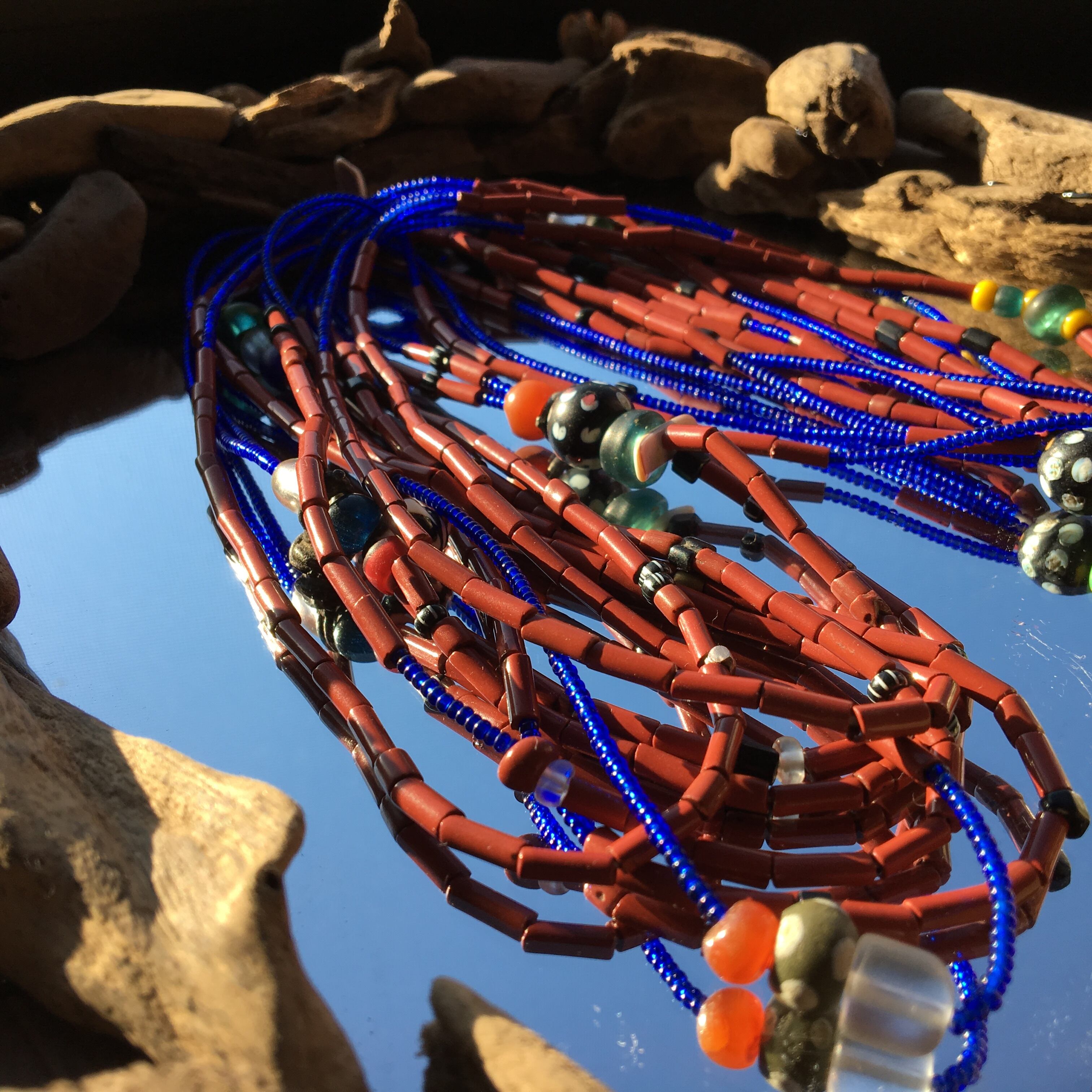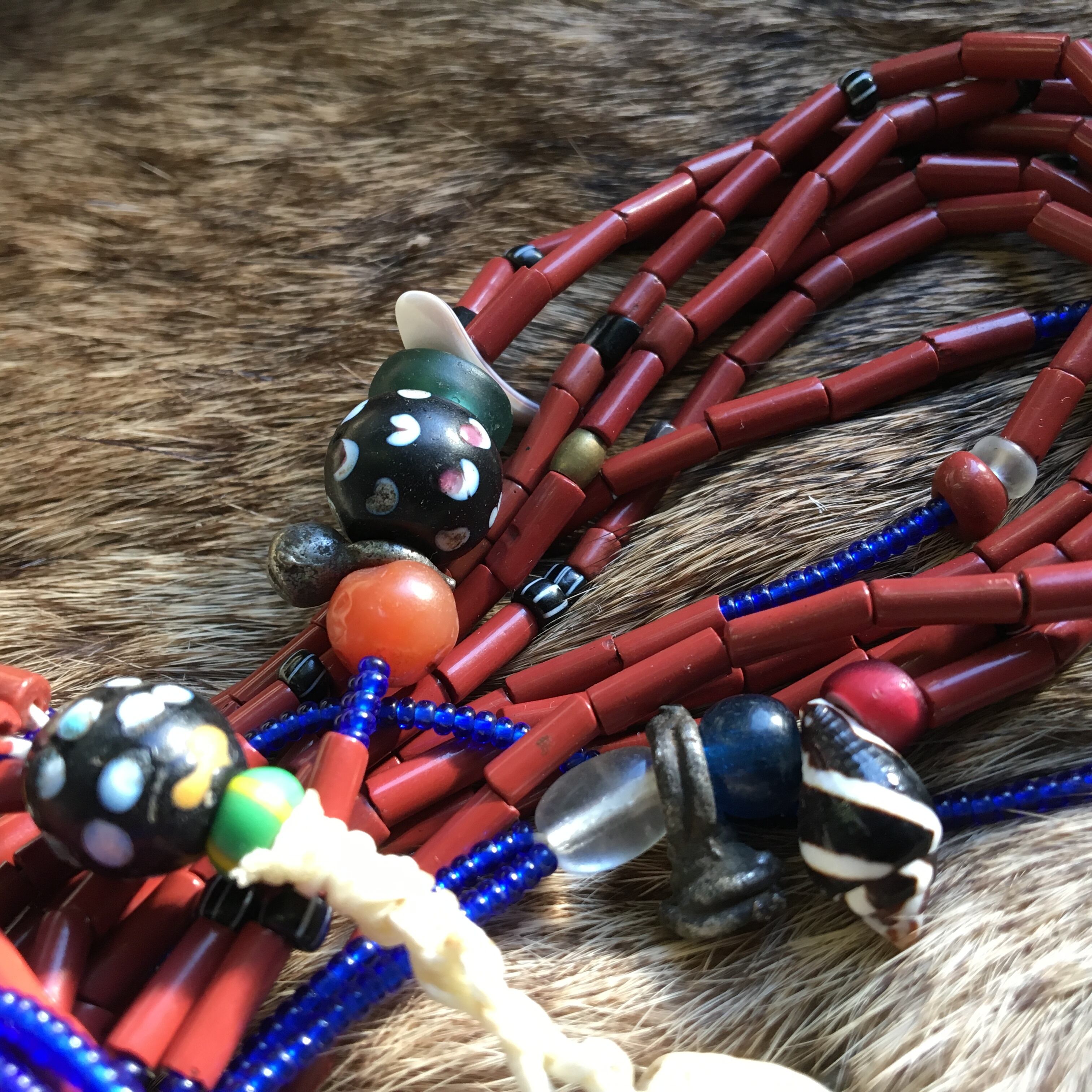 素材はアンティークのベネチア産1900年代シリンダー型レンガカラービーズ、ブルーシードビーズ、スカンクビーズ、チン族のアンティークブラス、少数民族のアンティーク瑪瑙、ドゴン族の希少カラーアンティークドーナッツ型グリーンビーズ、貝殻、ブラックグーズベリー、ボヘミアクリアビーズ、留め具には魚の骨などを使用した時間をかけて直感と即興で作り上げました。