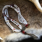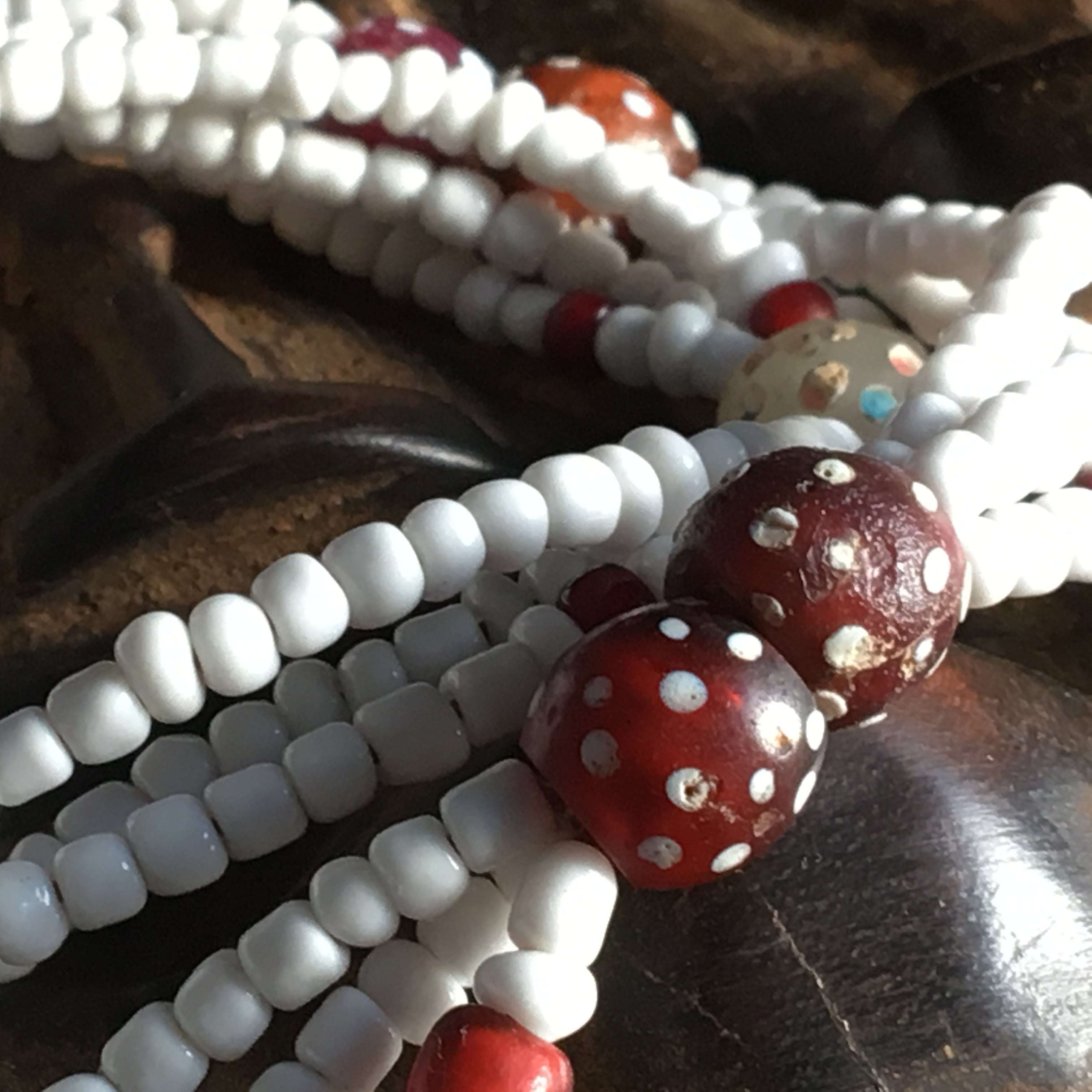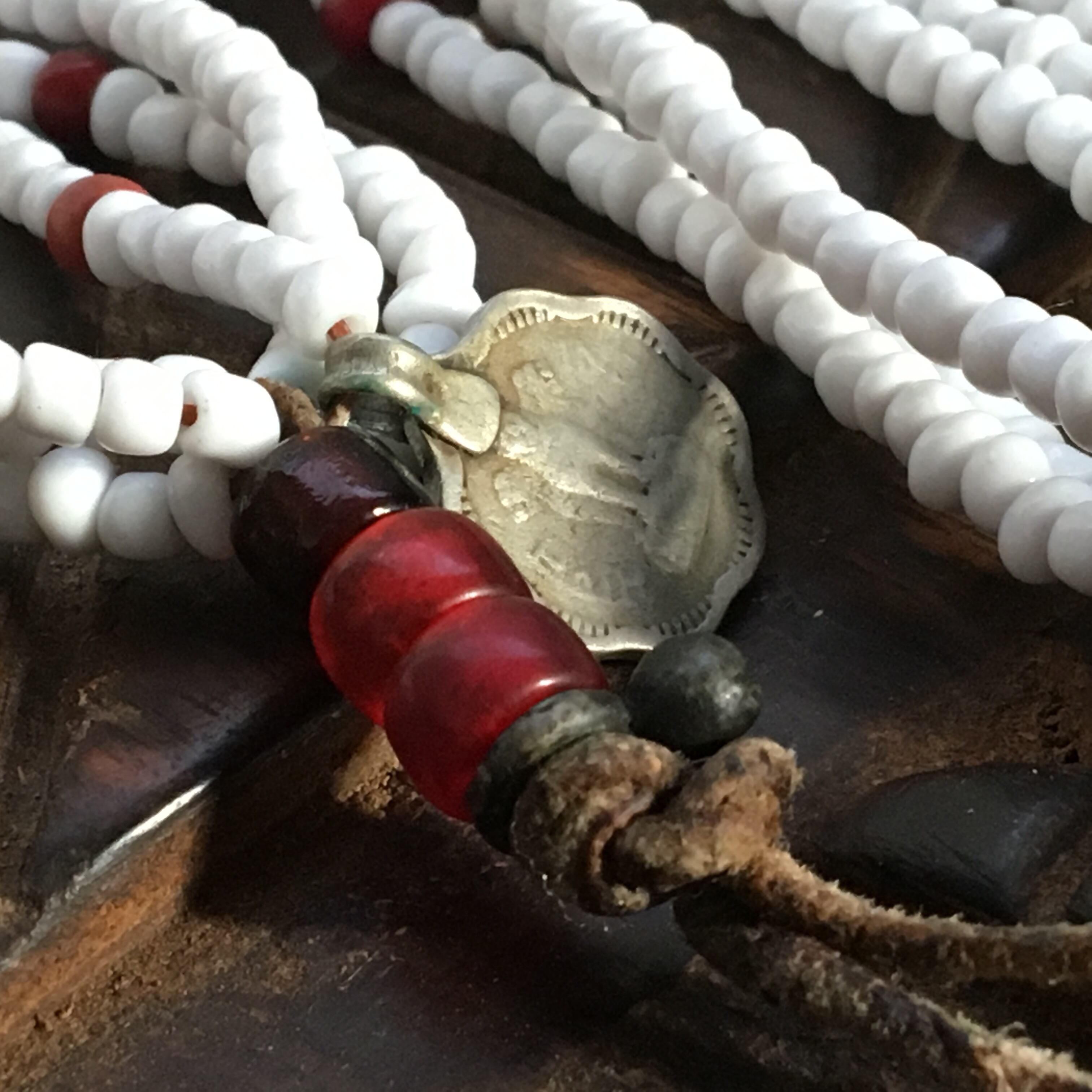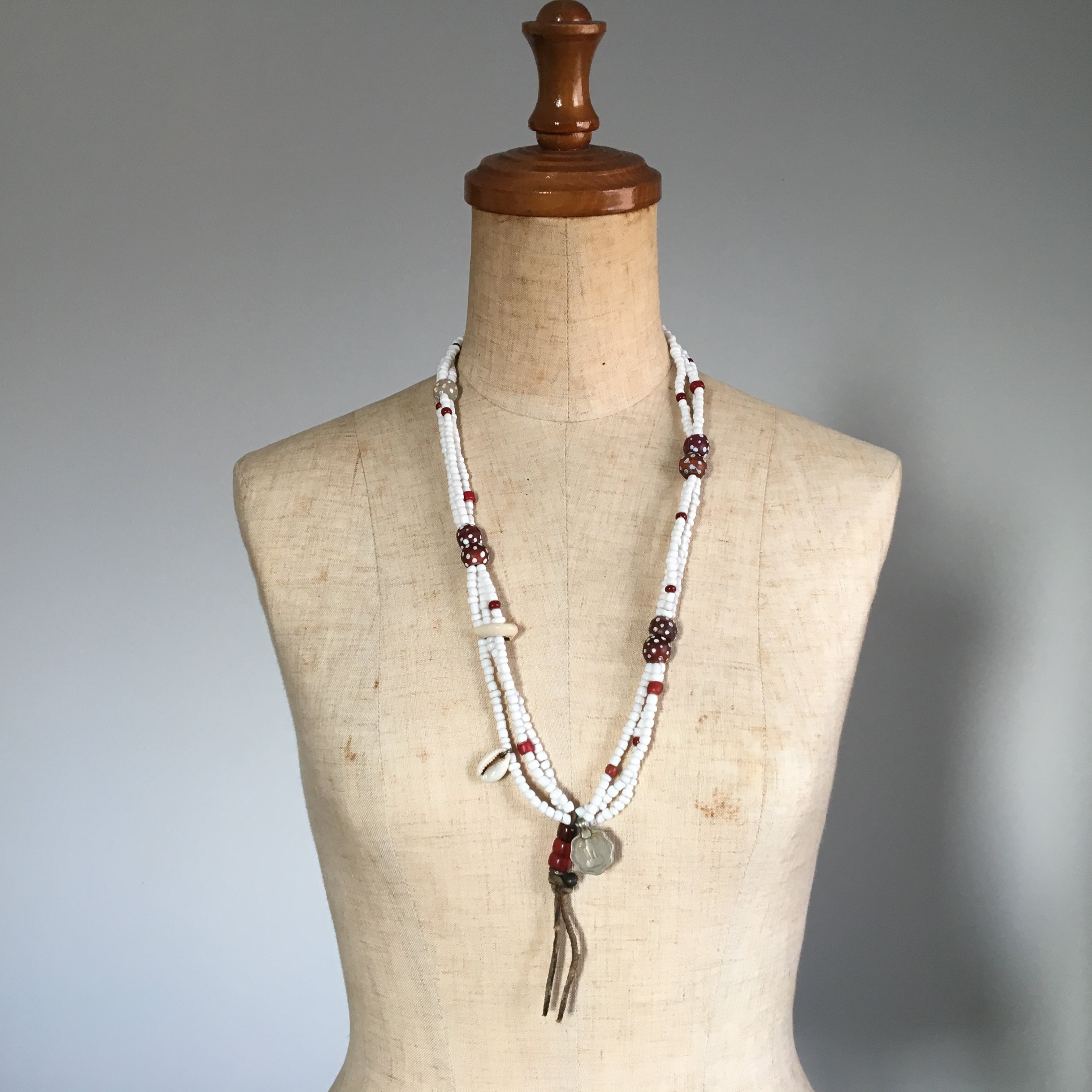色味が渋目なアンティークのレッドスカンクビーズに乳白色スカンク、レッドパドレビーズ、ホワイトハーツ、アフガニスタンコイン、ビンテージor現代ホワイトビーズ、TOPに革紐、子安貝にチン族ブラスをプラスしたトライバル多連ネックレス作品。