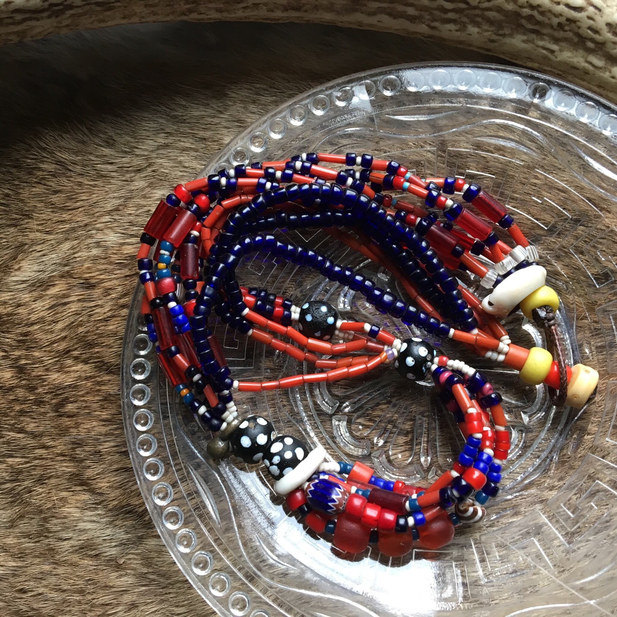 アンティークビーズをこれでもかッ‼︎っというぐらい使い多連型に、ホワイトハーツやビルマビーズ、スカンク、グーズベリー、子安貝、チン族ブラスパーツ、シェブロン、ボヘミアビーズなどを使用しています。