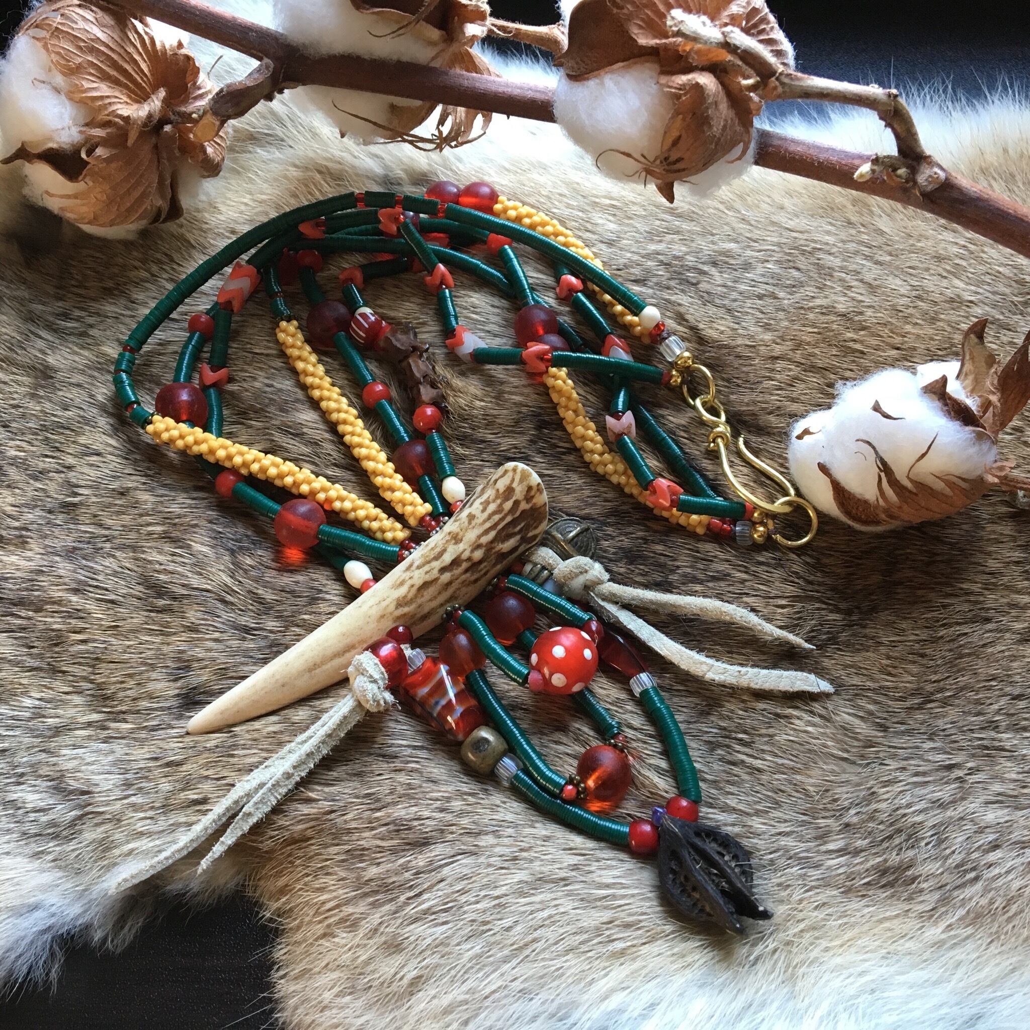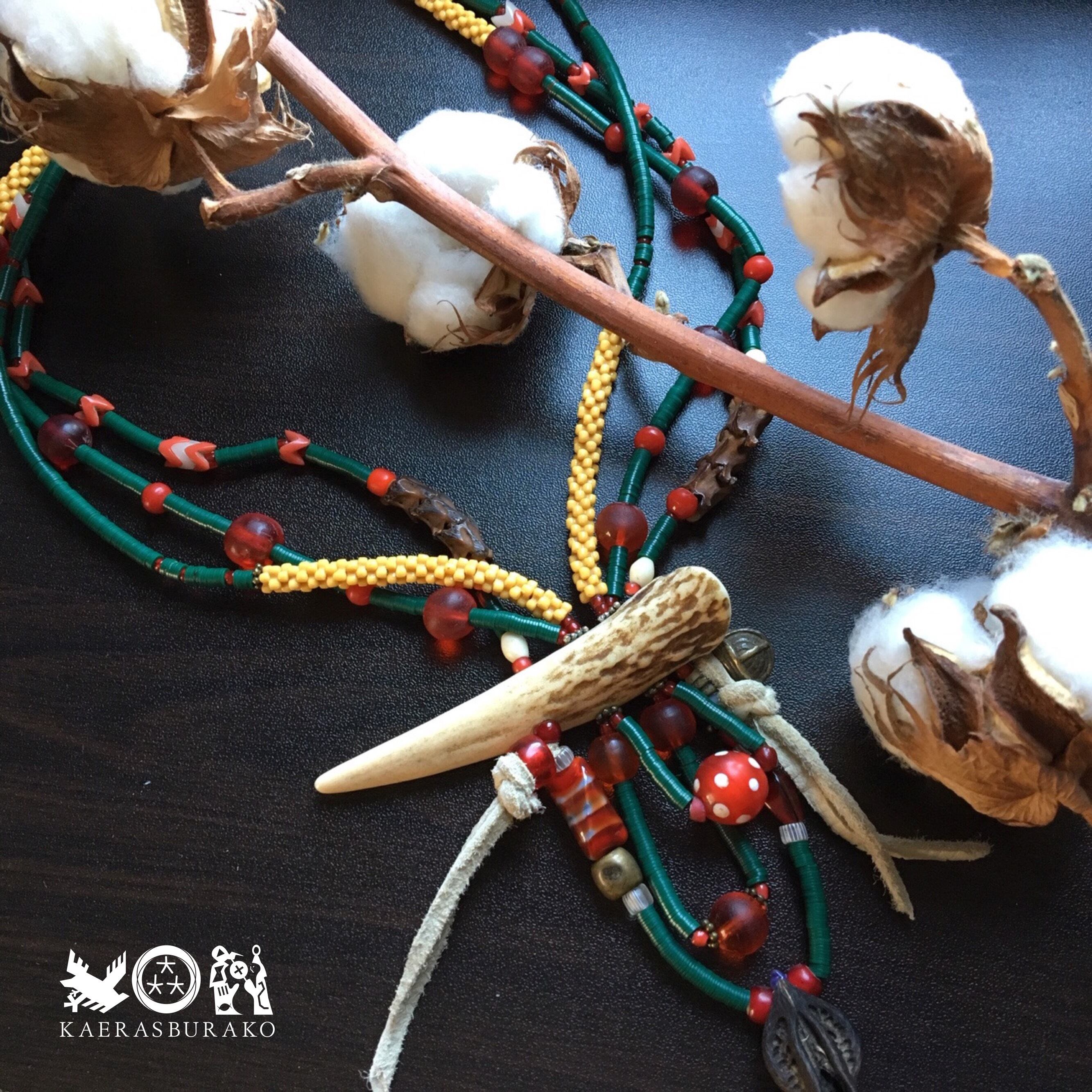穴あけ研磨を施した鹿角を角に見立て、1900年代アフリカアンティークのレコード盤ビーズを緑龍の鱗に、アンティークフラワービーズイエローでお腹の部分を、アンティークベネチア 産スカンクビーズで目を表し、ボクシカタ猫爪を爪or牙に見立て、革紐でヒゲに、チン族ベルで雷鳴を轟かし、アフリカアンティークの蛇骨、ボヘミアスネークボーンで龍を連想させています、他にもアンティークレッドグーズベリー、ホワイトハーツ、アンティークボヘミアレッドビーズ、アフリカブラスを使用したまさに芸術性の高い作品に仕上がりました。