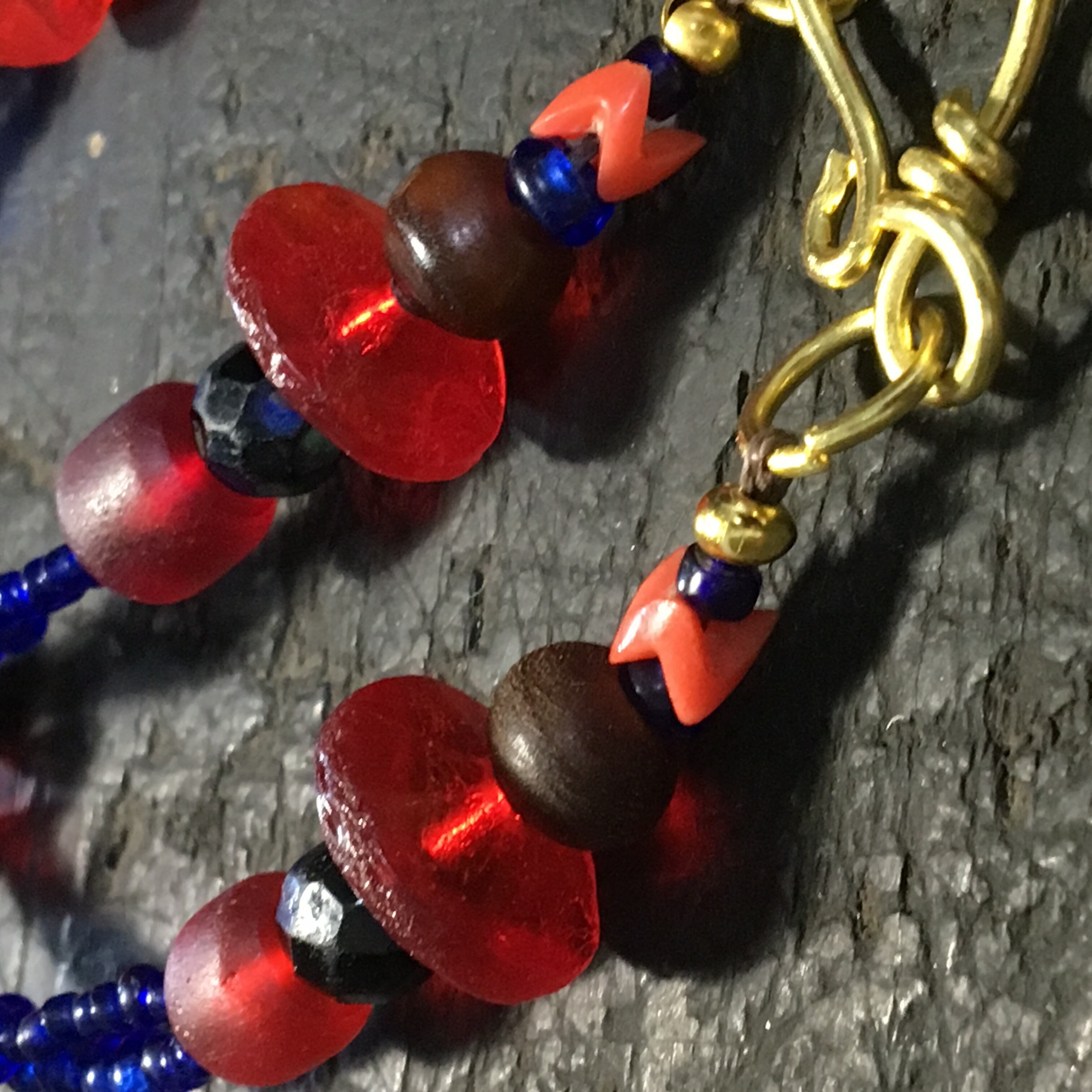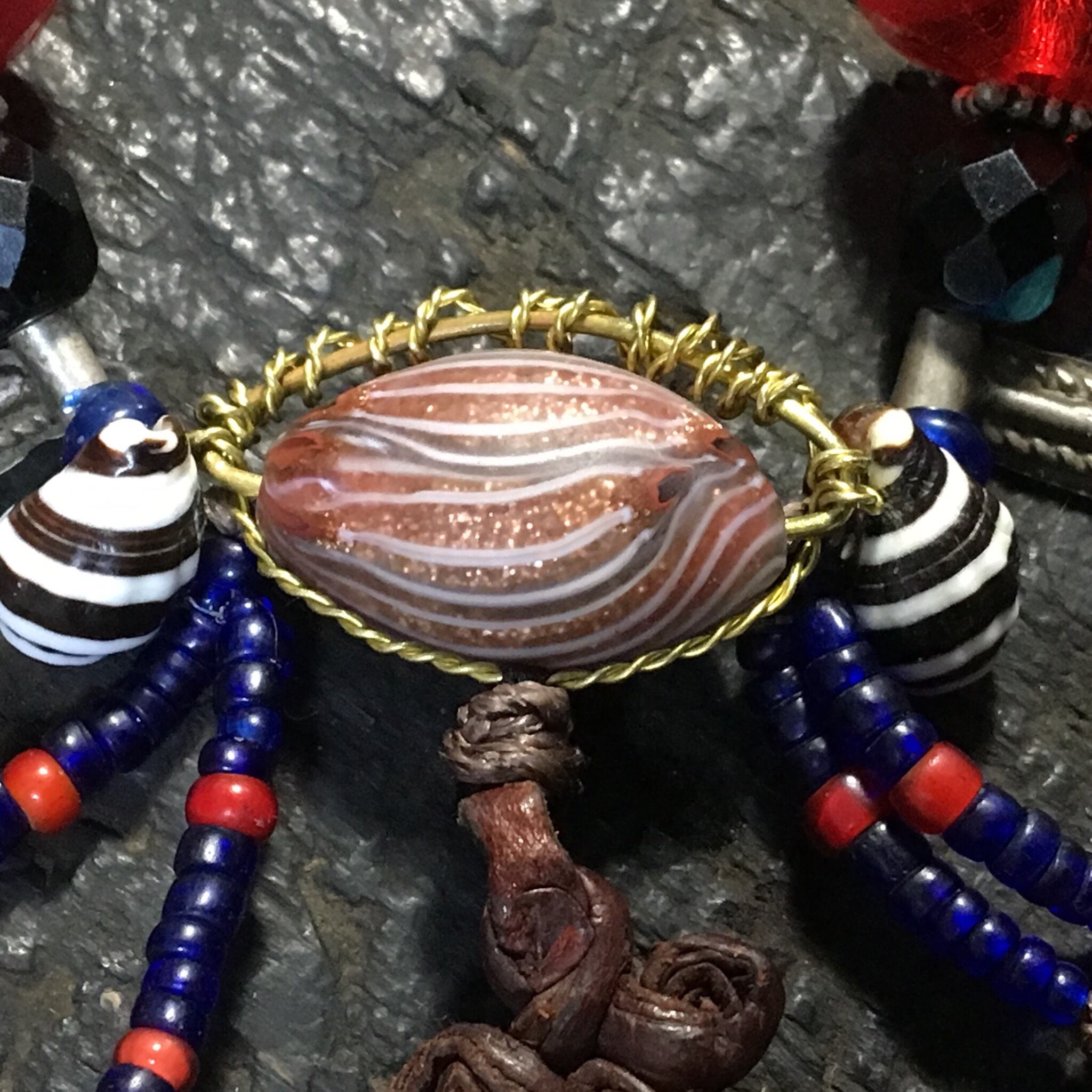 目にはベネチア産ムラーノ島1900年代初期、超希少伝説のアントニオバッカーリアンティークビーズを使用、このマットな肌デザインはタコイカに見えたのでインスピレーションが浮かびました。他ベネチアアンティークビーズにボヘミアンビーズ、アンティークビルマブルービーズ、オールドメタル、アンティークボヘミア産スネークボーンビーズ、煌めきが素敵なチェコ産のビンテージファイヤーポリッシュ、子安貝で吸盤ニョロニョロを再現致しましたw