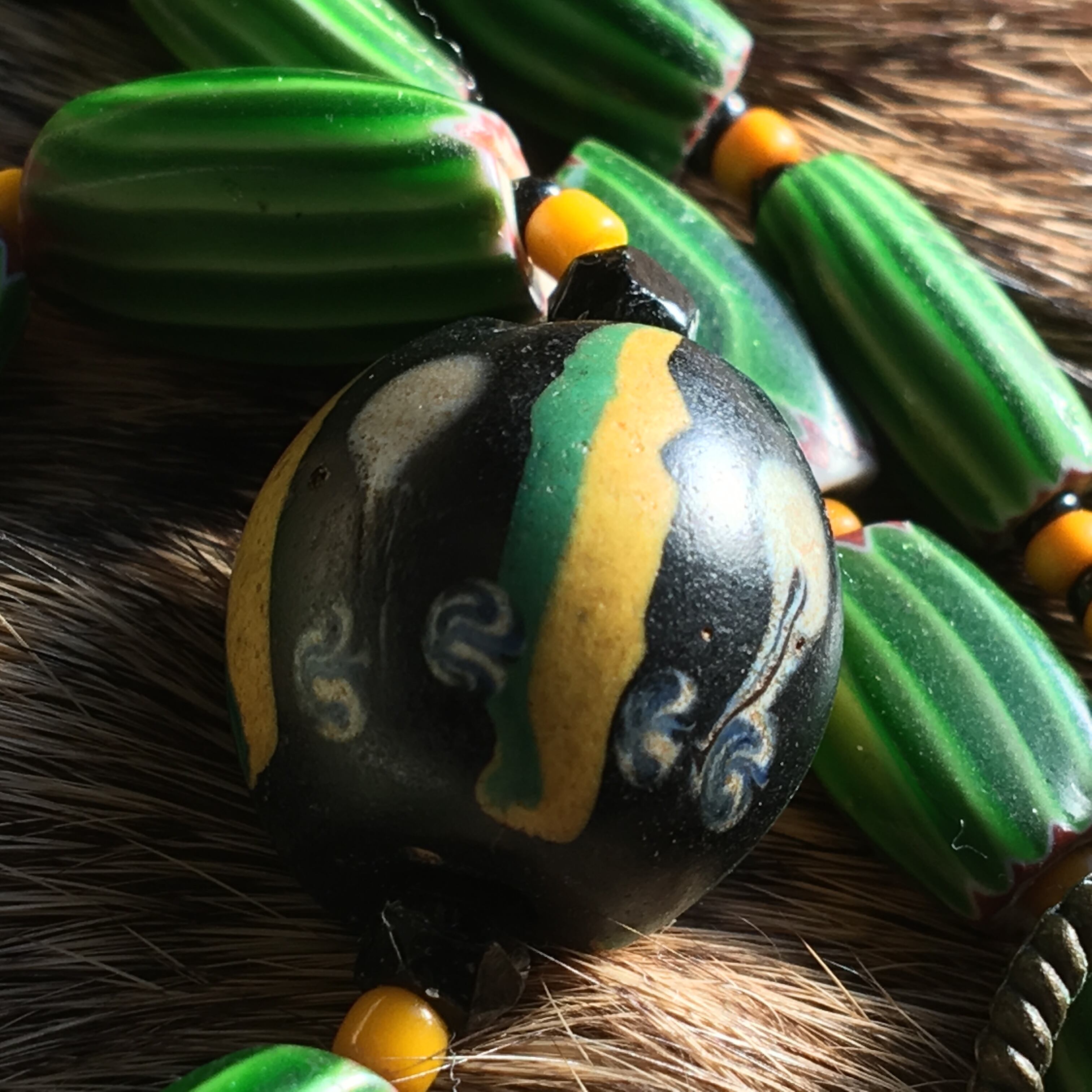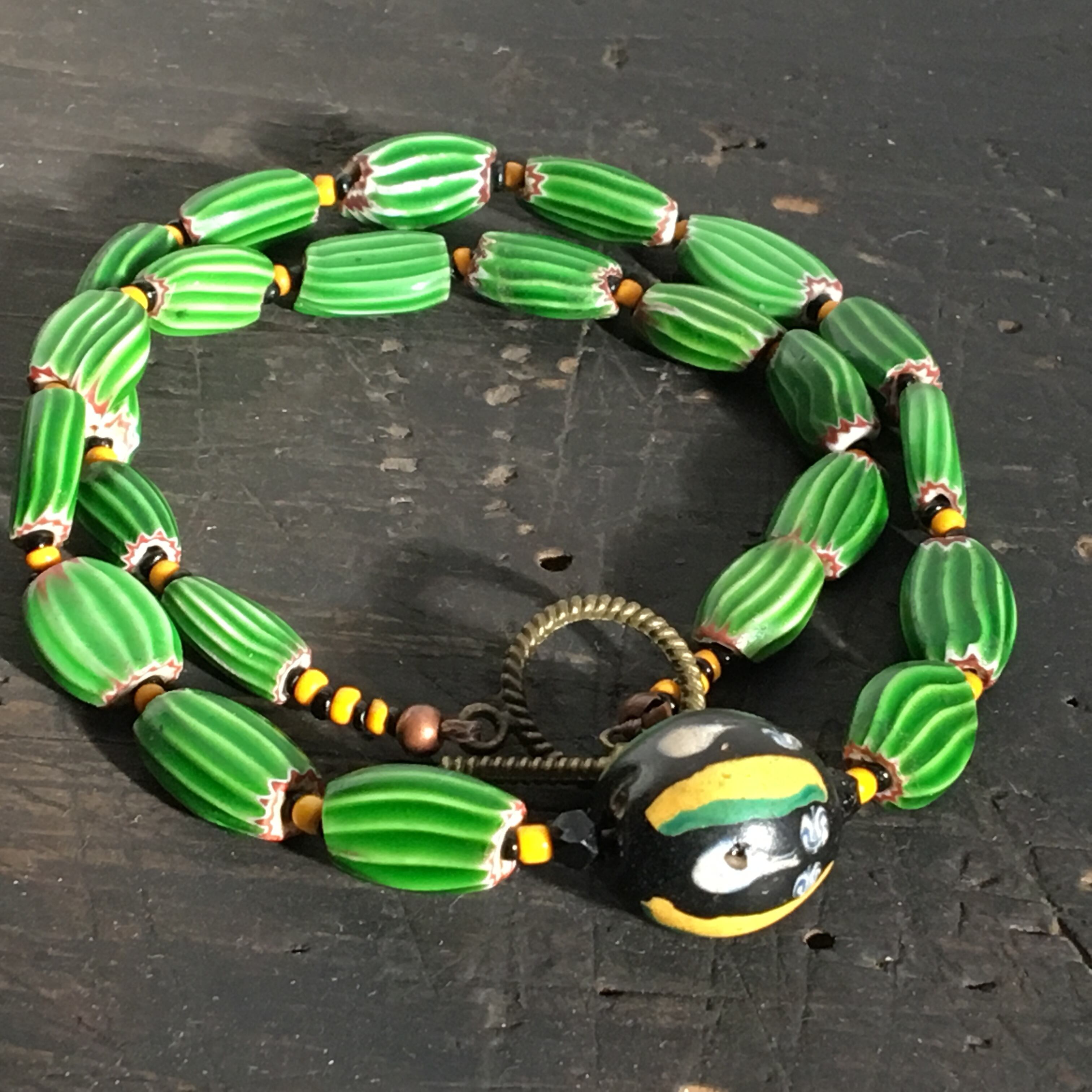緑と黄と黒系の色味で合わせたネックレス作品。
