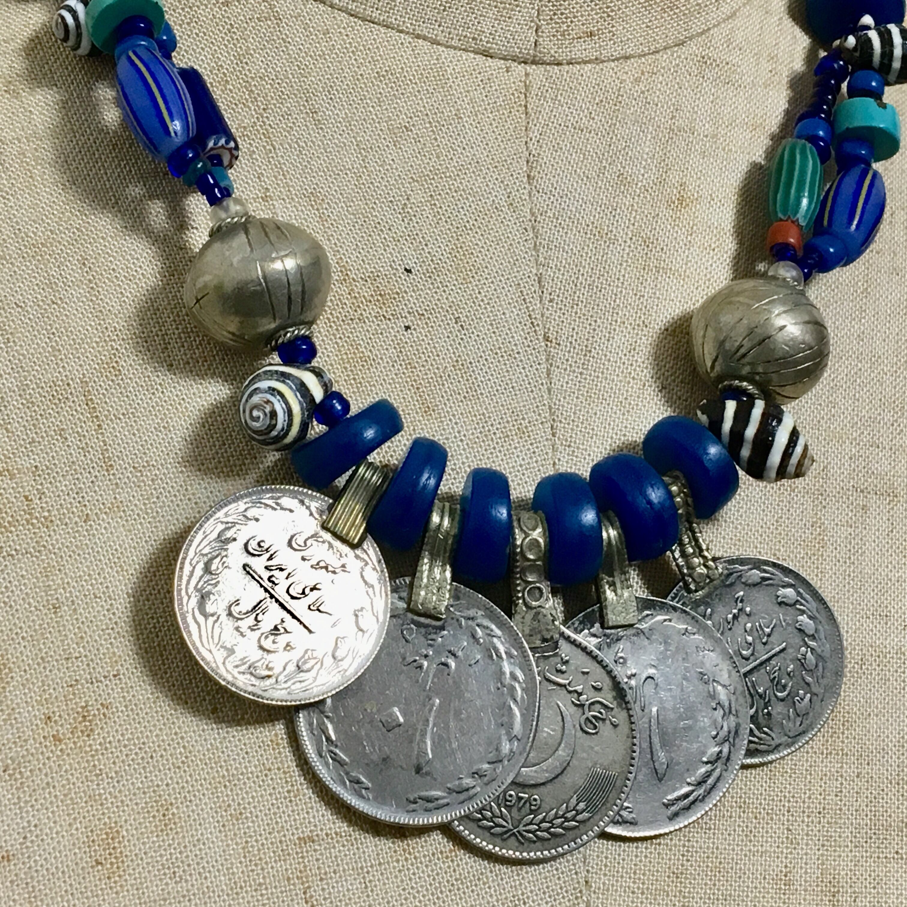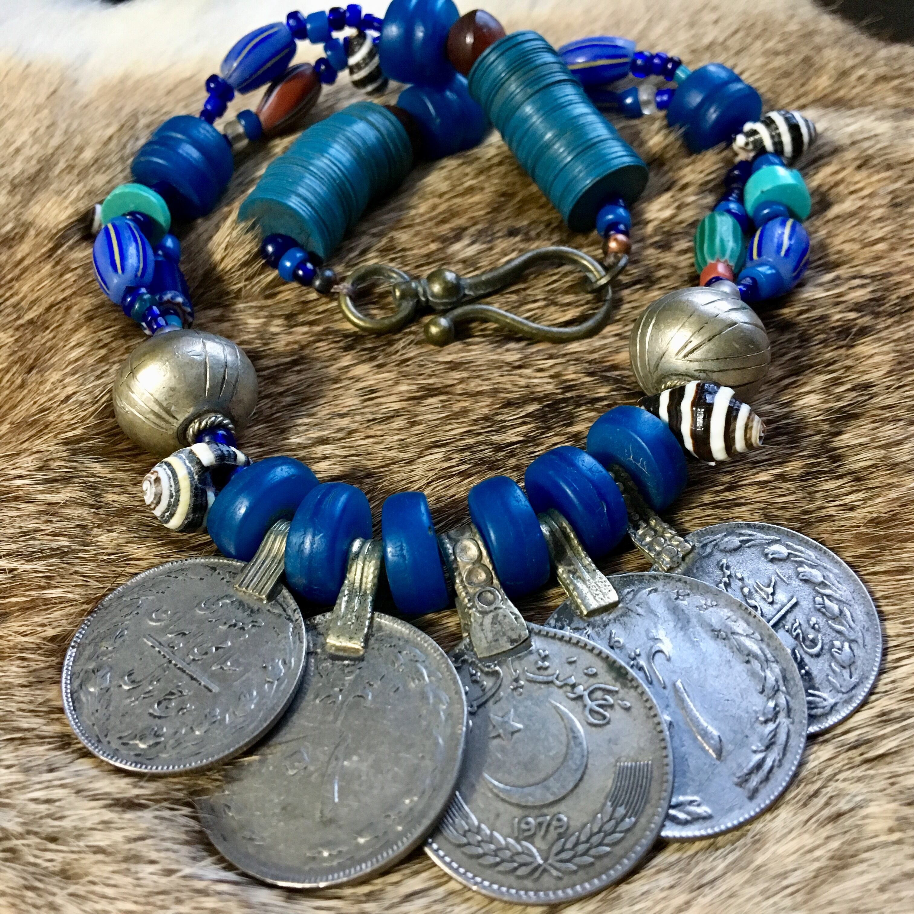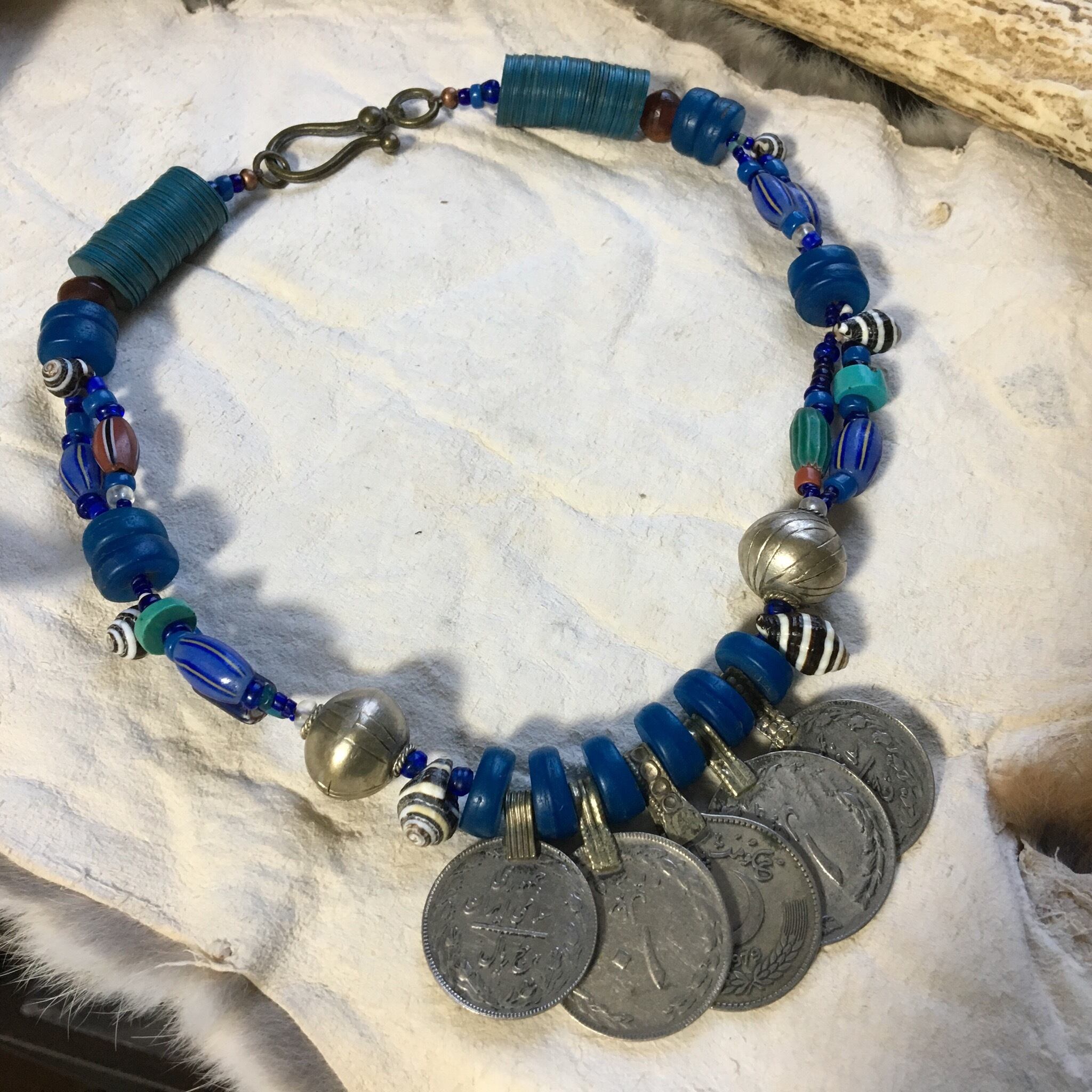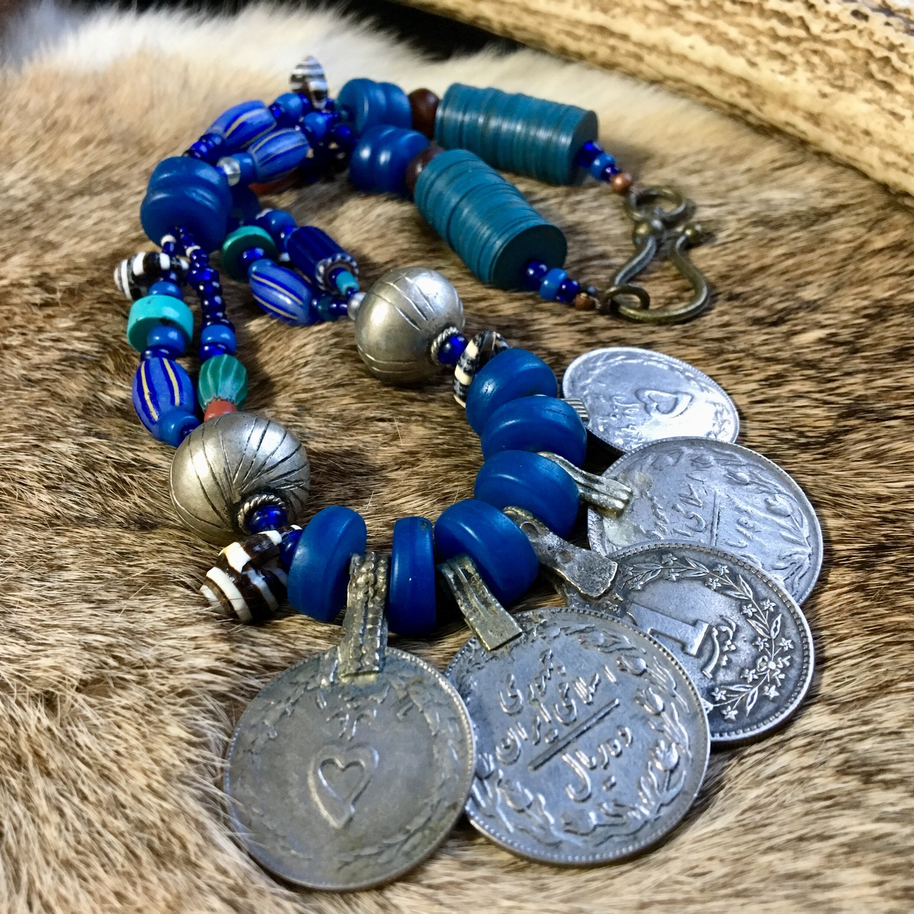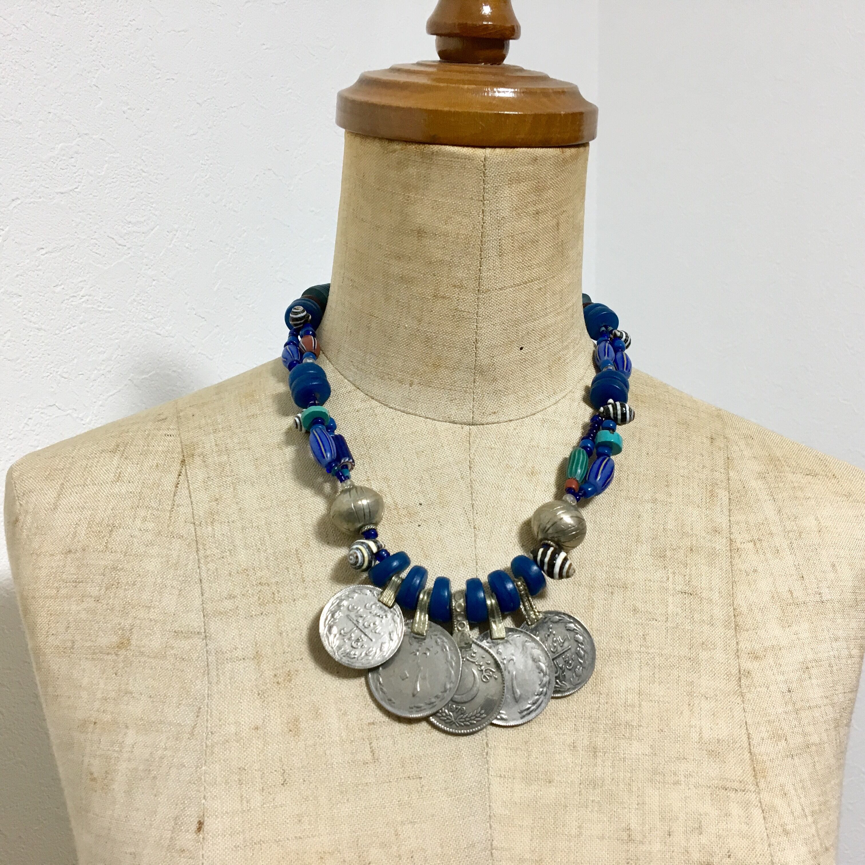 【No.284】ブルーオーシャン antique アフガニスタンコイン5枚 貝殻 オールドシルバー アンティークビーズ トライバルネックレス