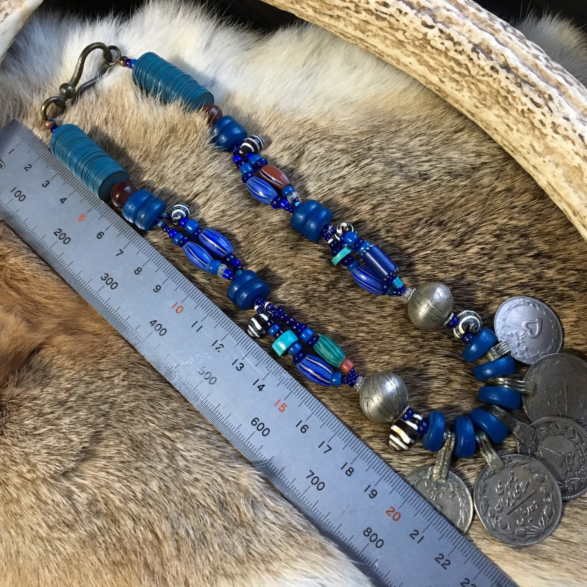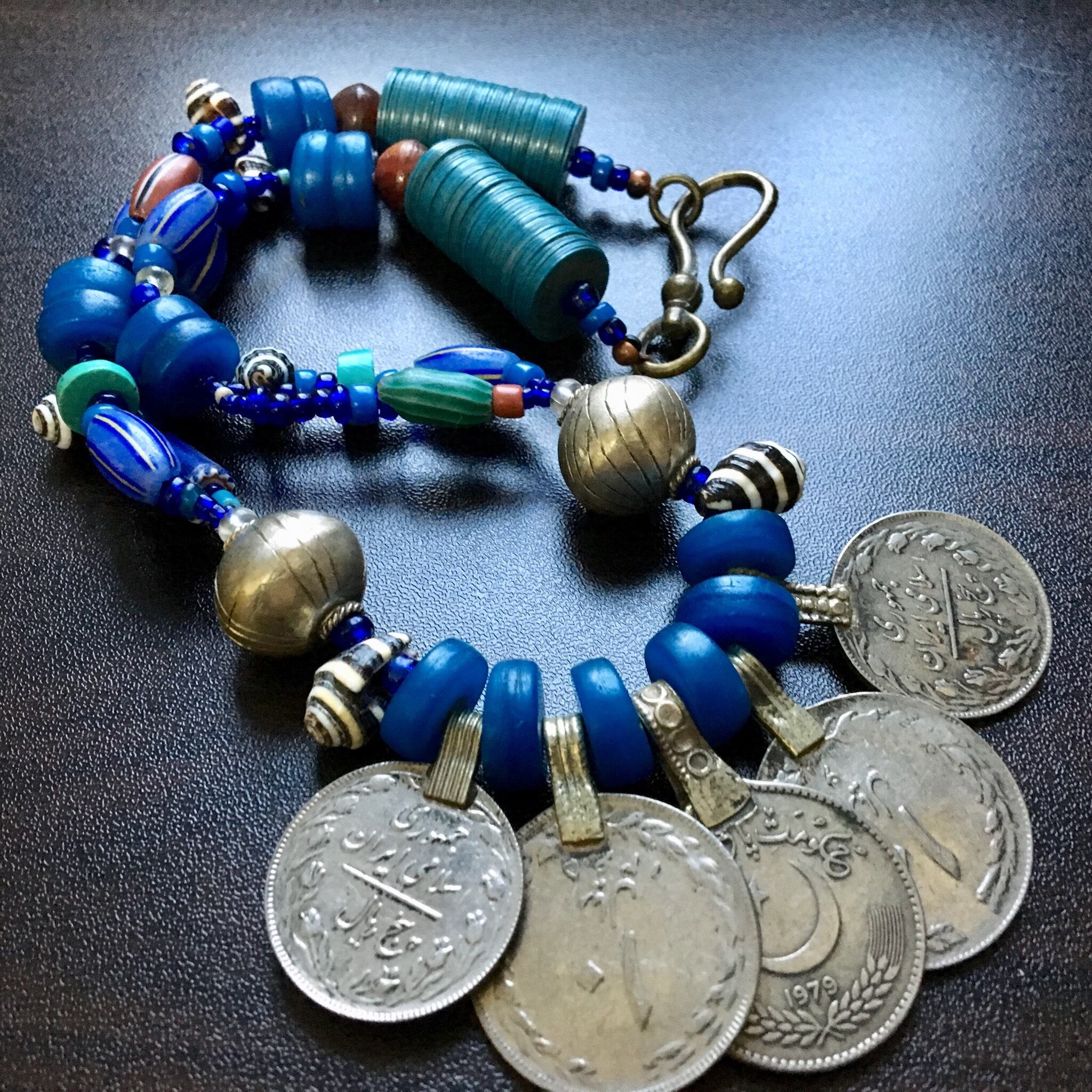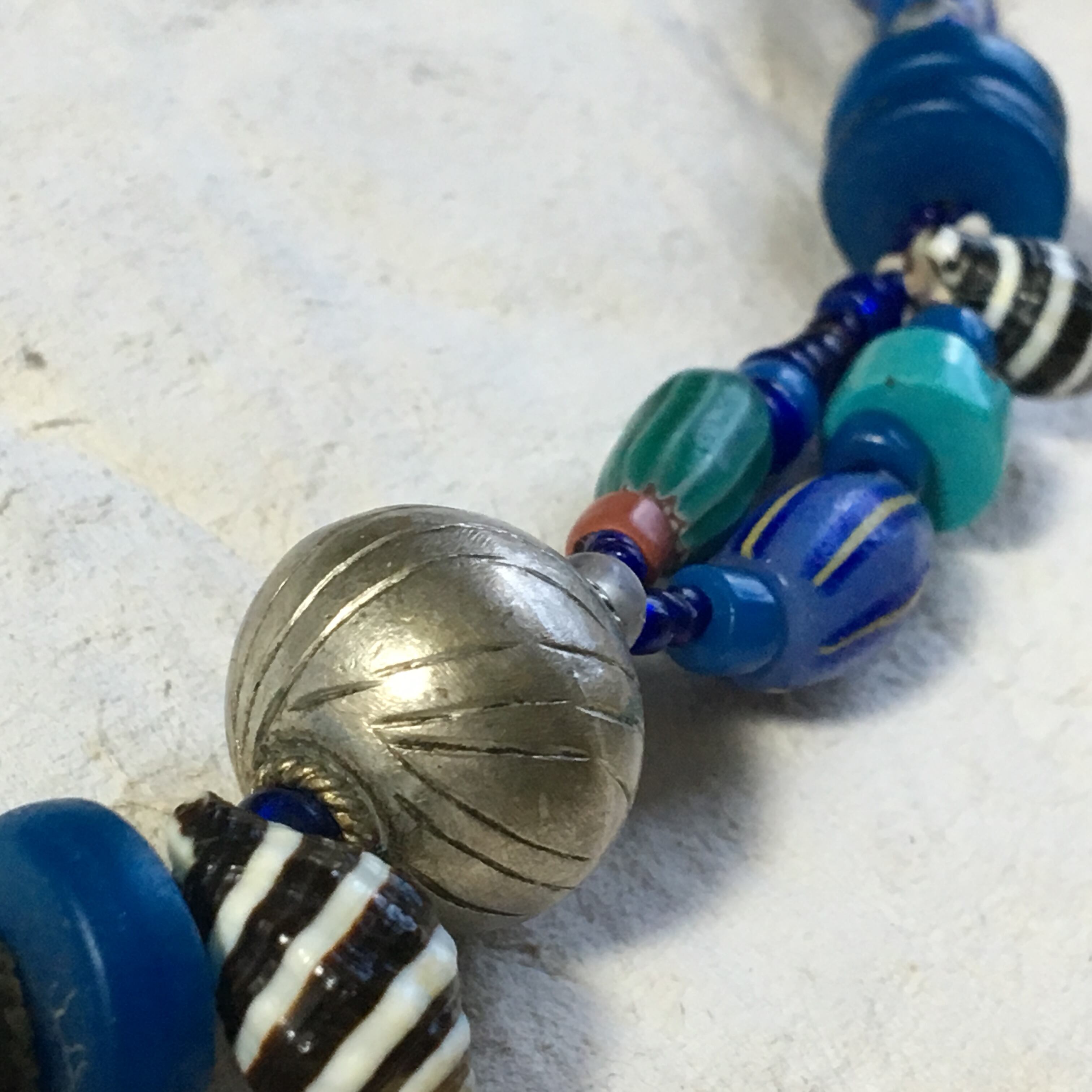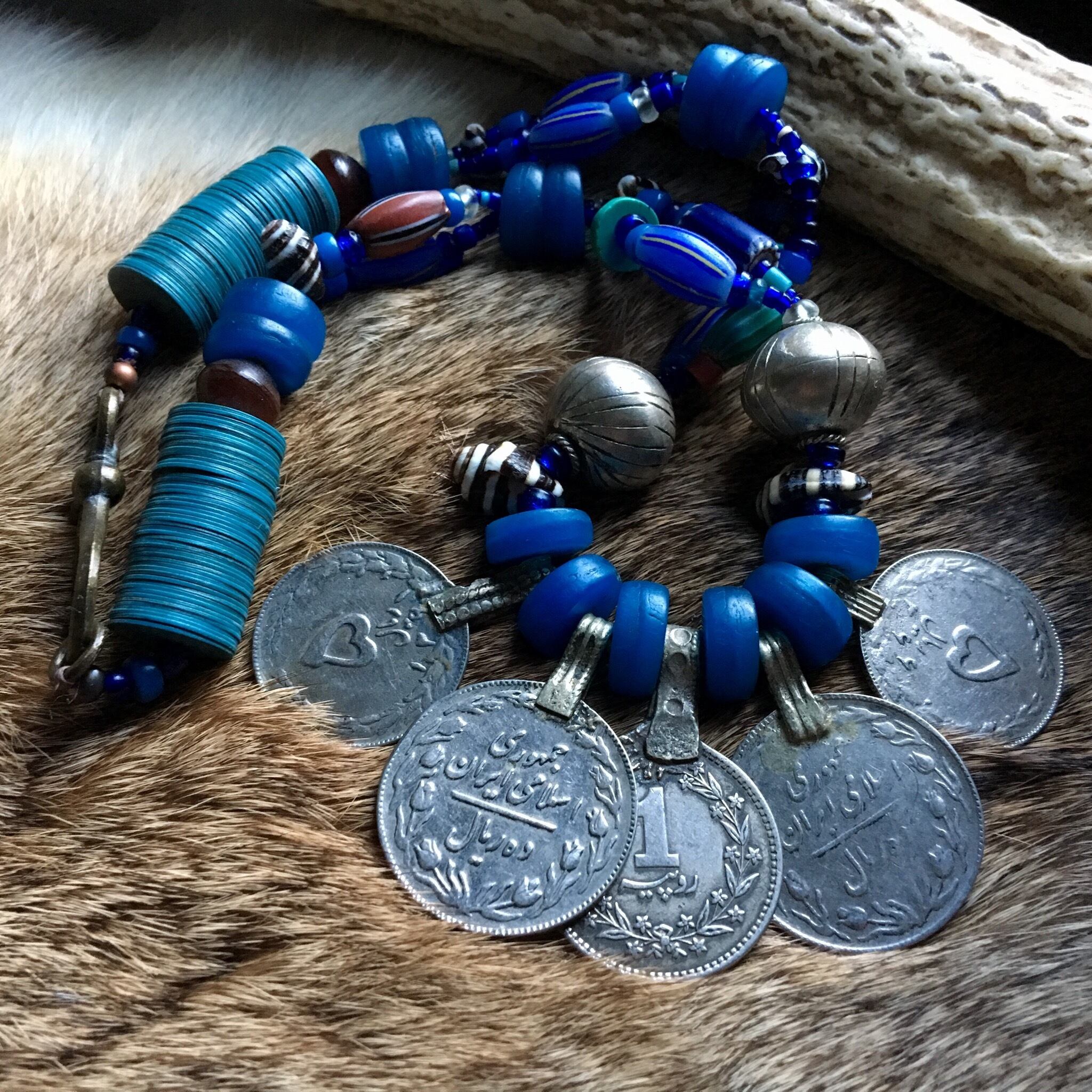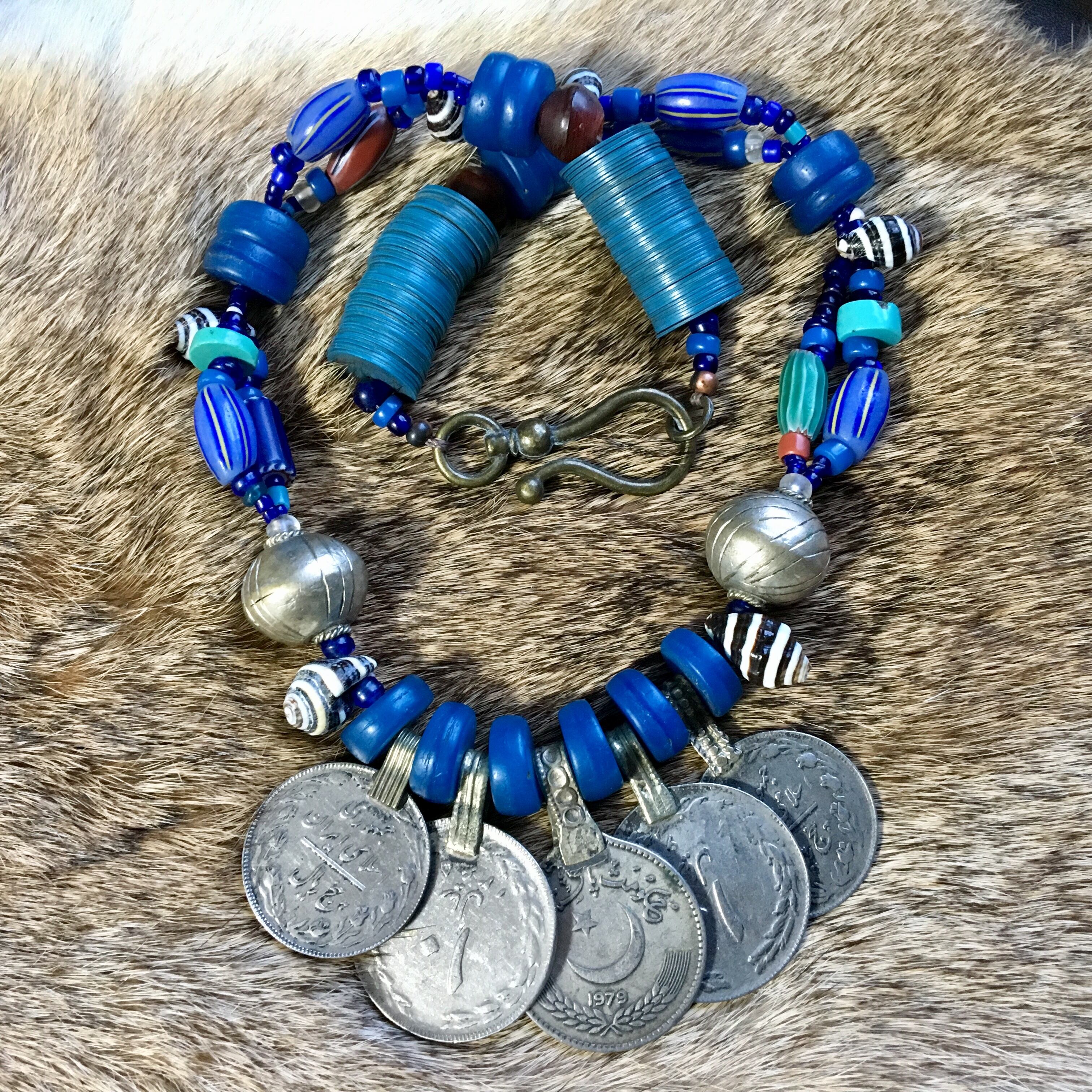 【No.284】ブルーオーシャン antique アフガニスタンコイン5枚 貝殻 オールドシルバー アンティークビーズ トライバルネックレス