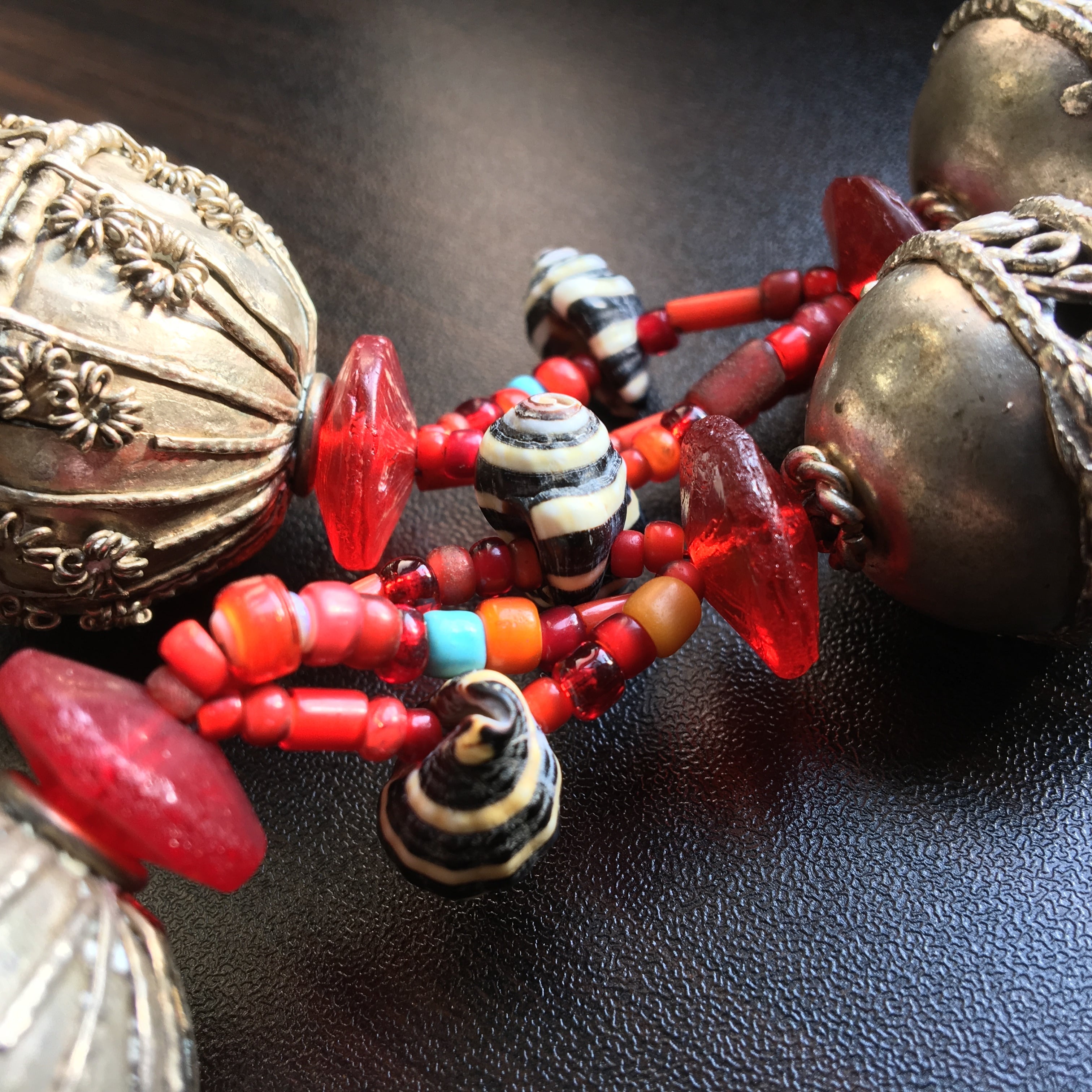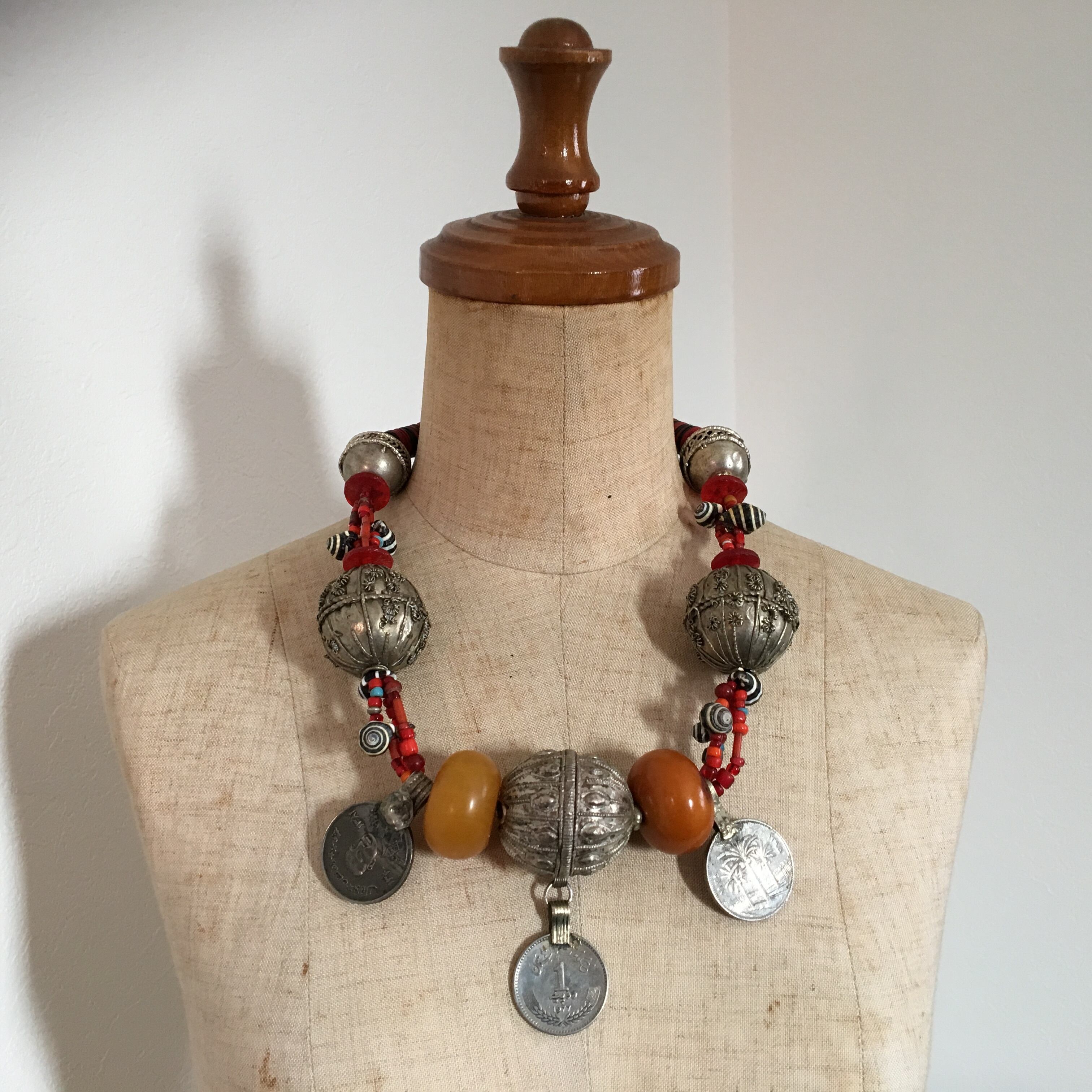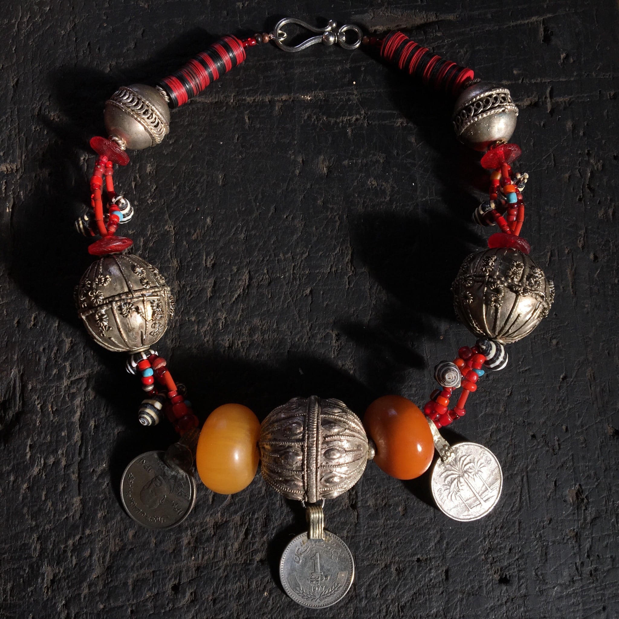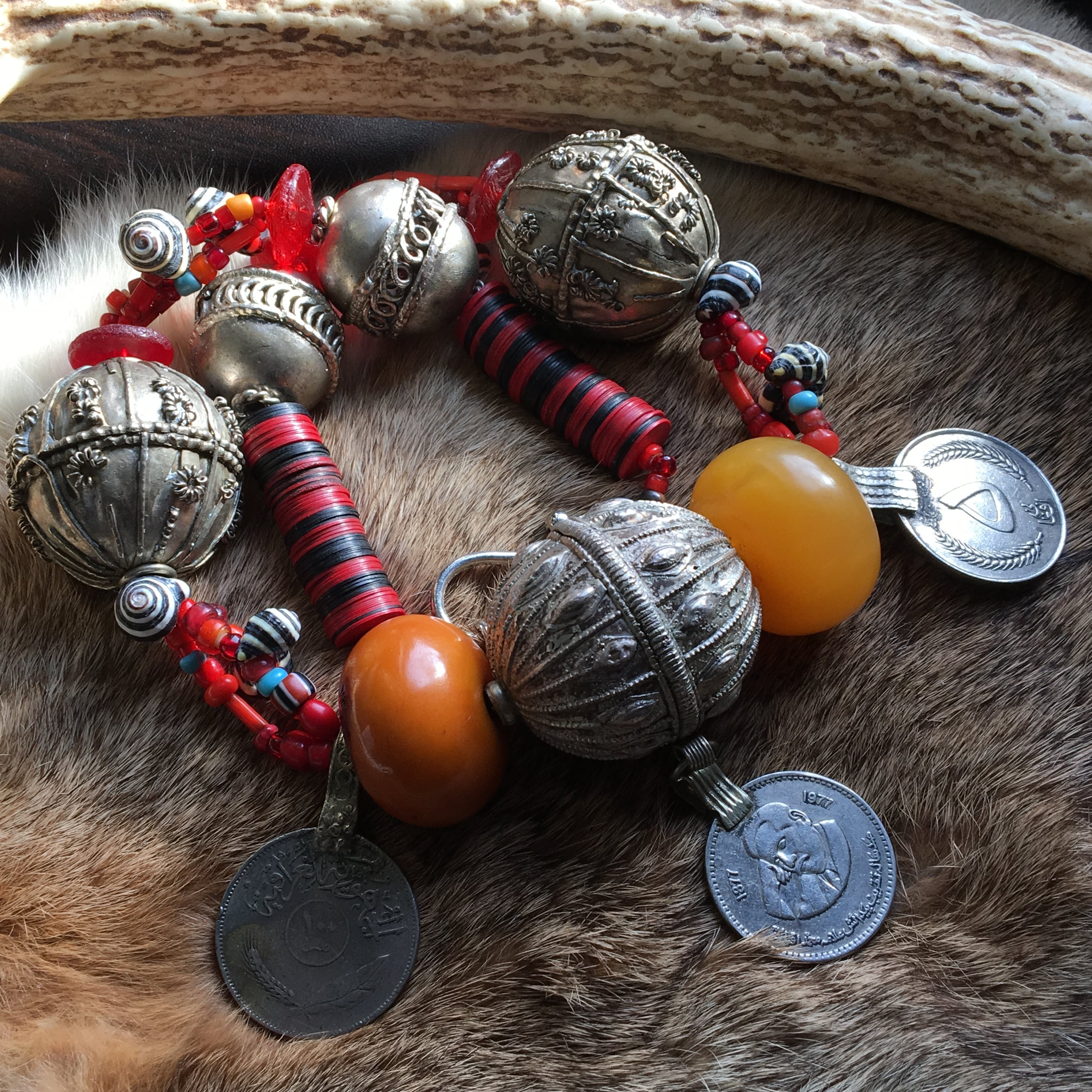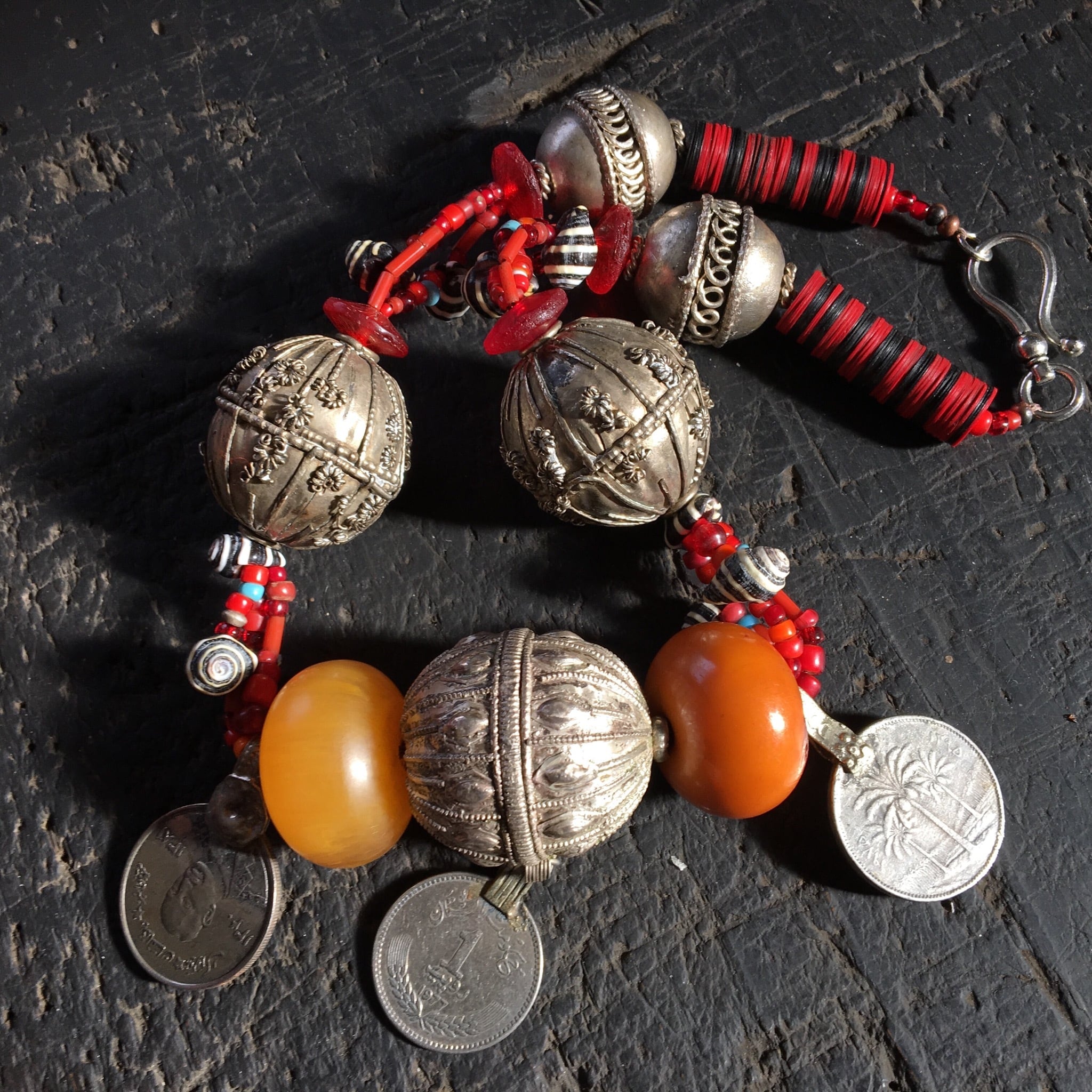 貴重なアンティークの特大イエメンシルバービーズ(中身は空洞の為、意外と軽い)にアンティークのアフリカンアンバー(フェノール樹脂)、オールドアフリカンダンスコイン、アンティークホワイトハーツ、アフリカレコード盤ビーズ、貝殻を使用した迫力抜群のトライバルネックレス作品。