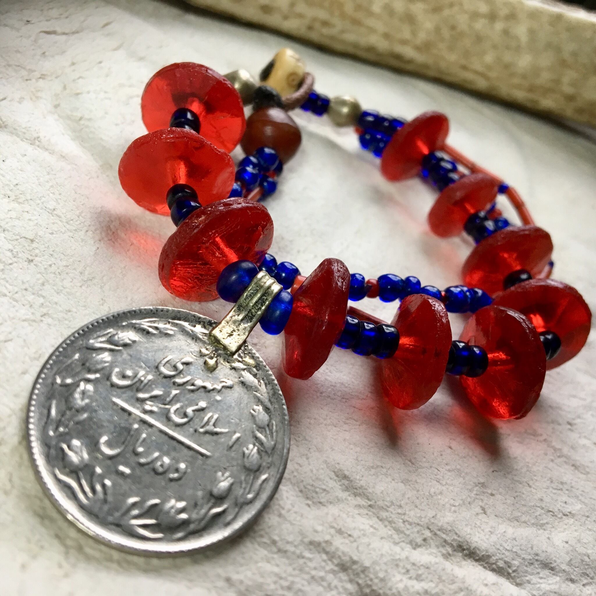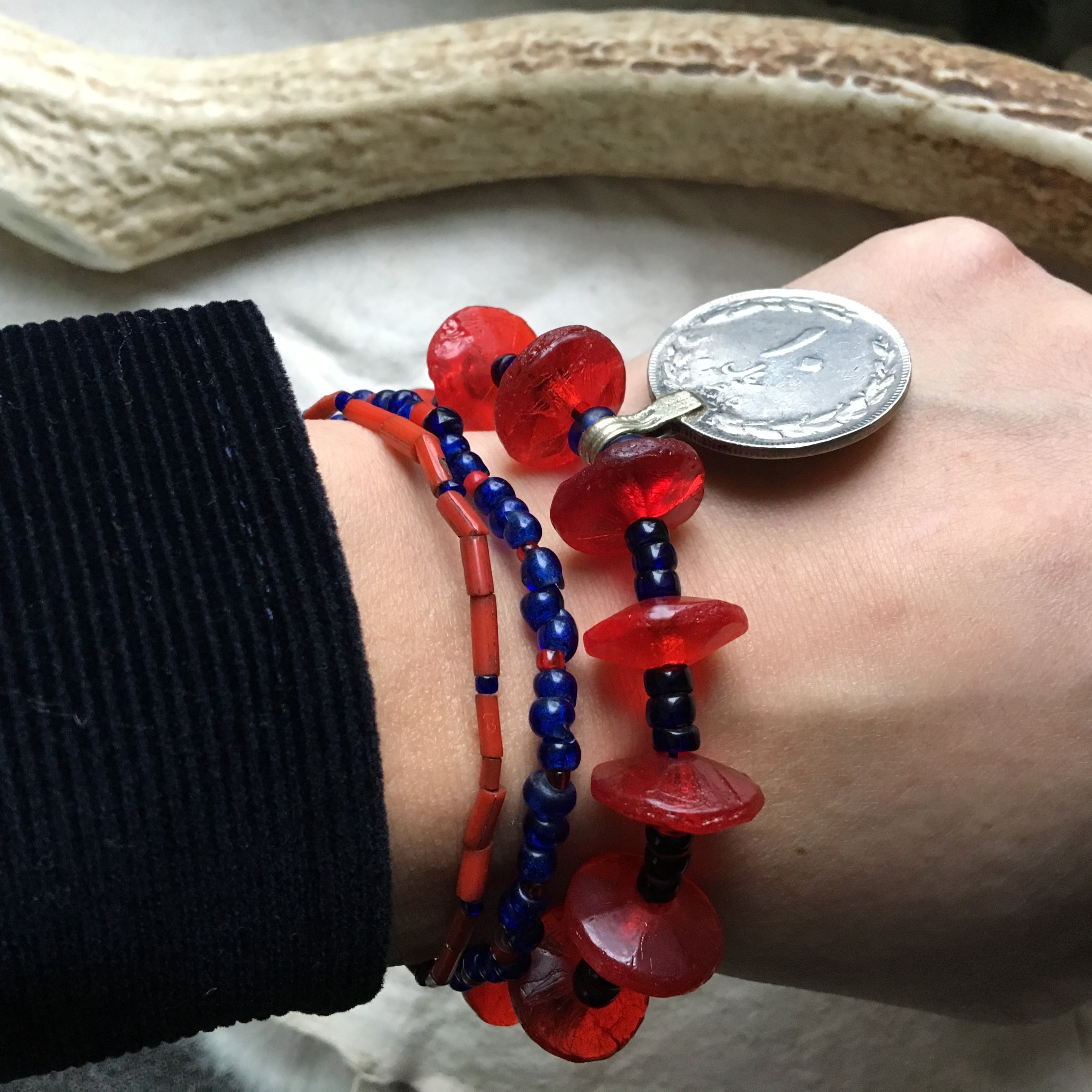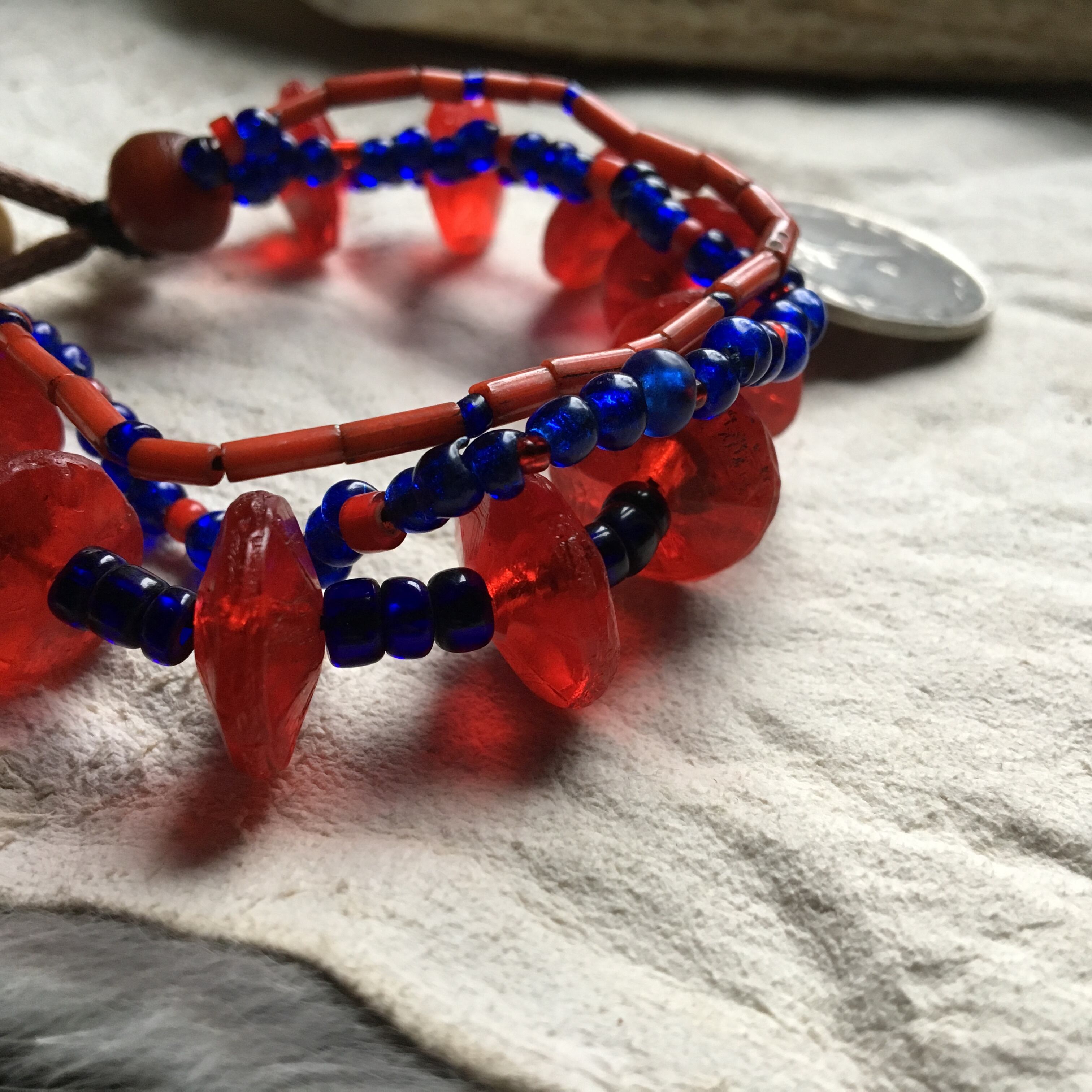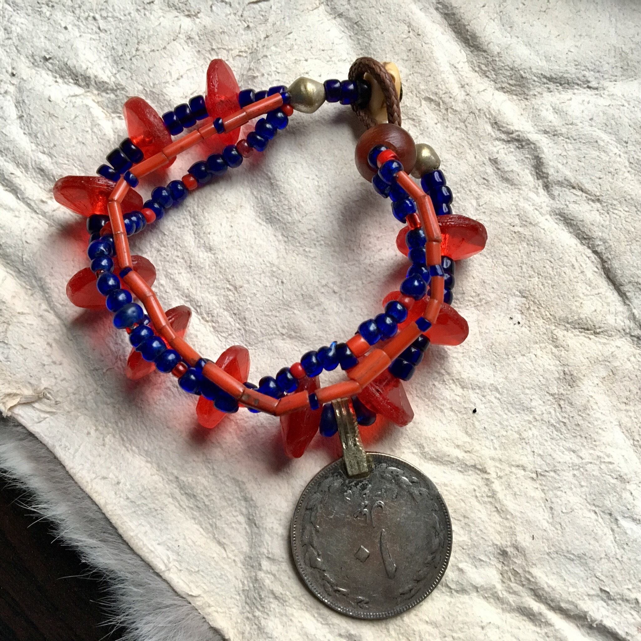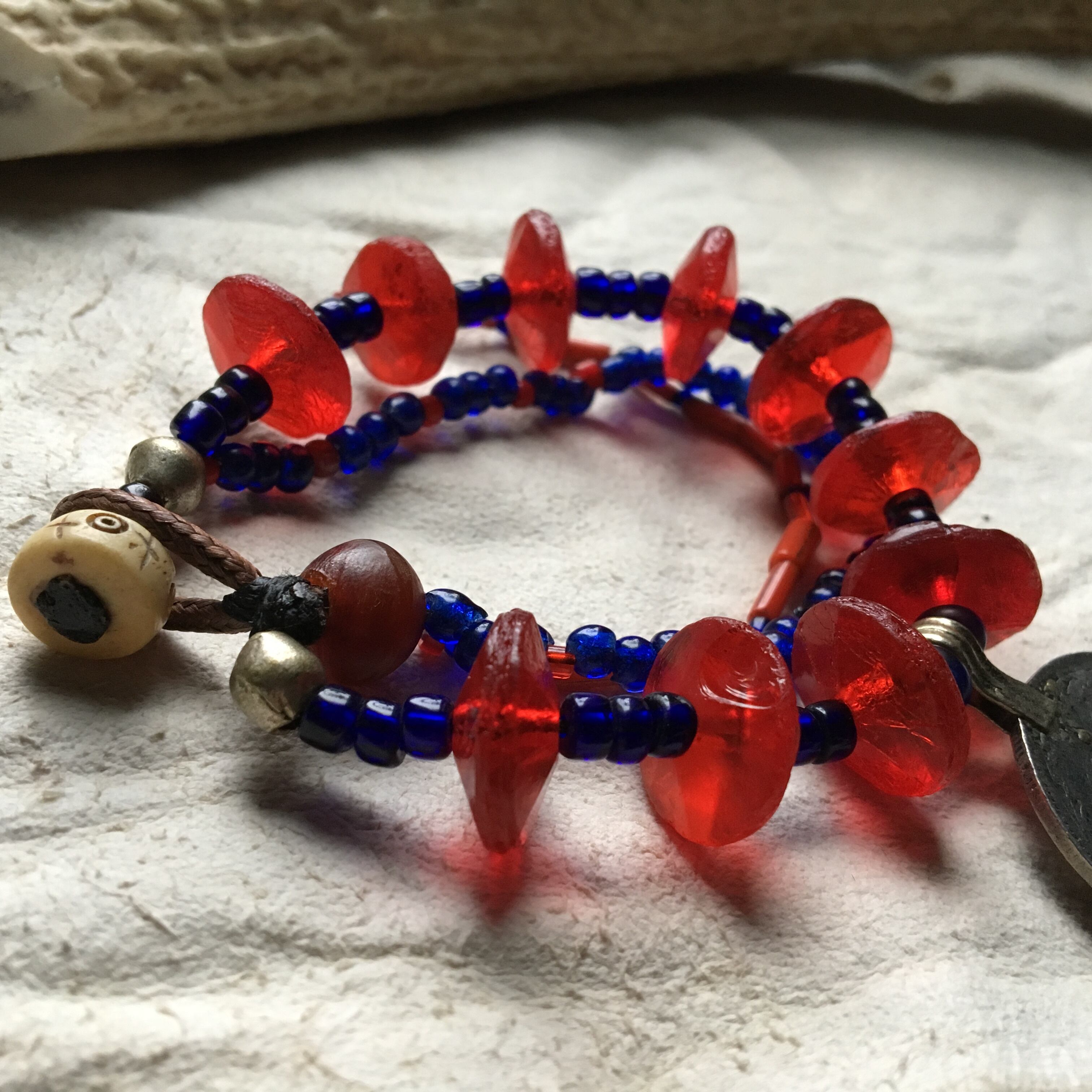 【No.296】存在感抜群 情熱の赤と青 3連 antique beads トライバル ブレスレット ビルマビーズ ベネチアビーズ アフガニスタンコイン