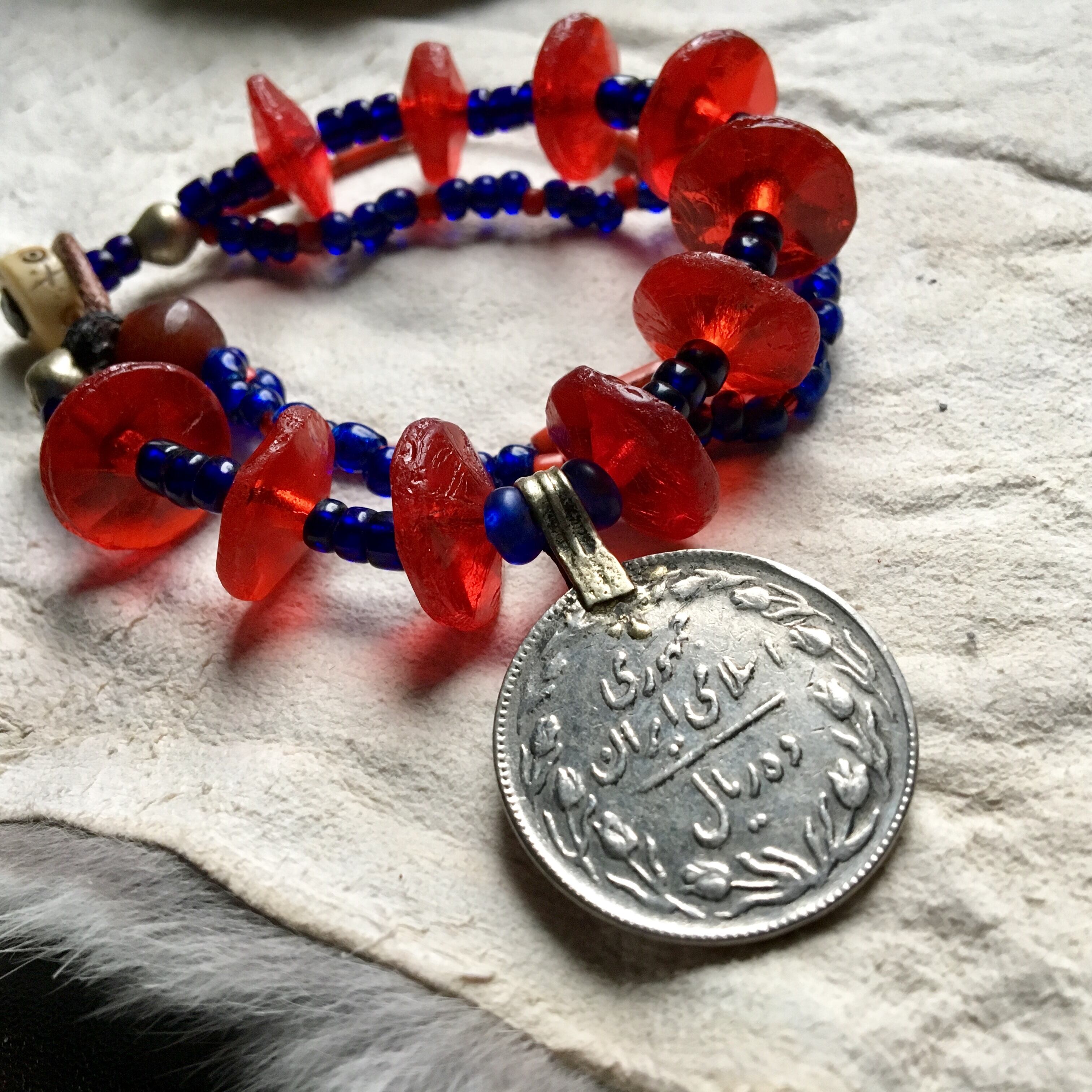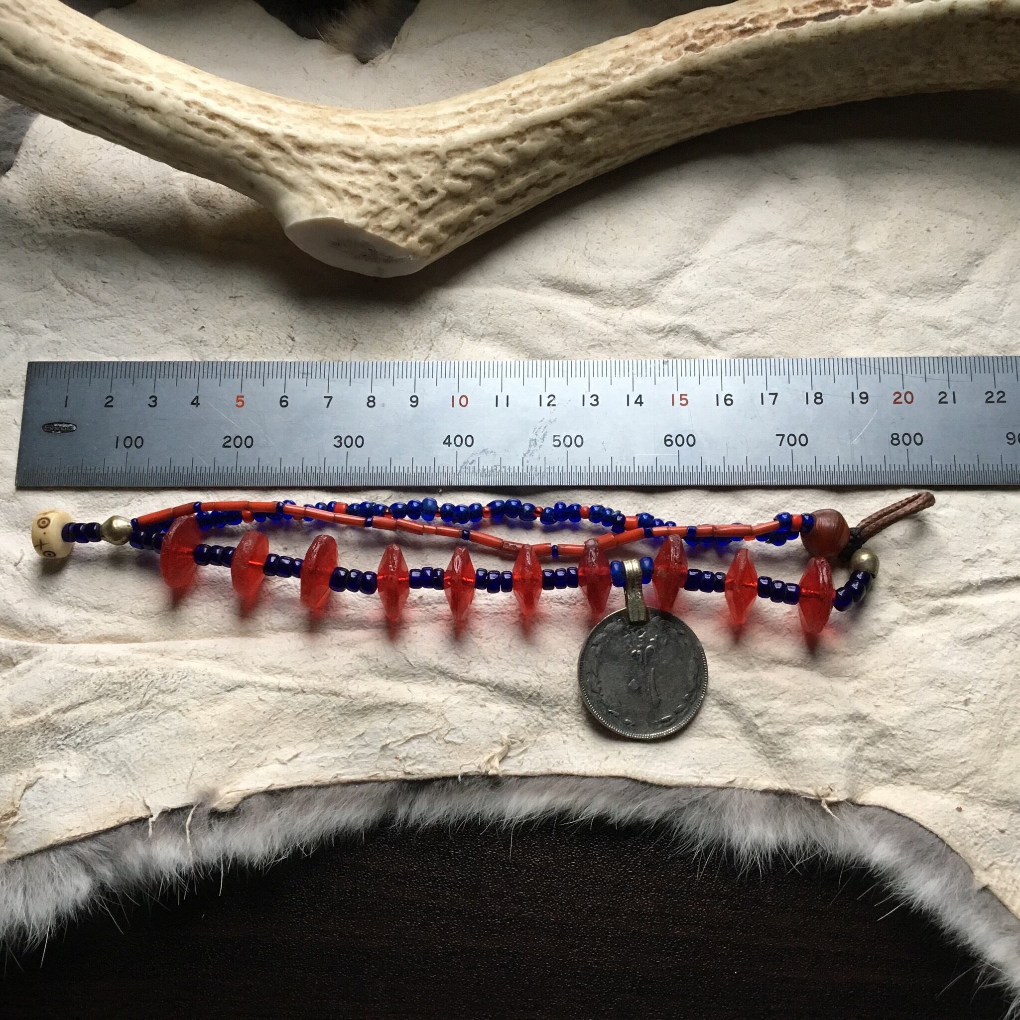 1900年代ベネチア産ビーズをふんだんに使用、青はビルマビーズ、アンティークのアフガニスタンコインをTOPに赤と青の情熱的なコントラストが光る作品。
