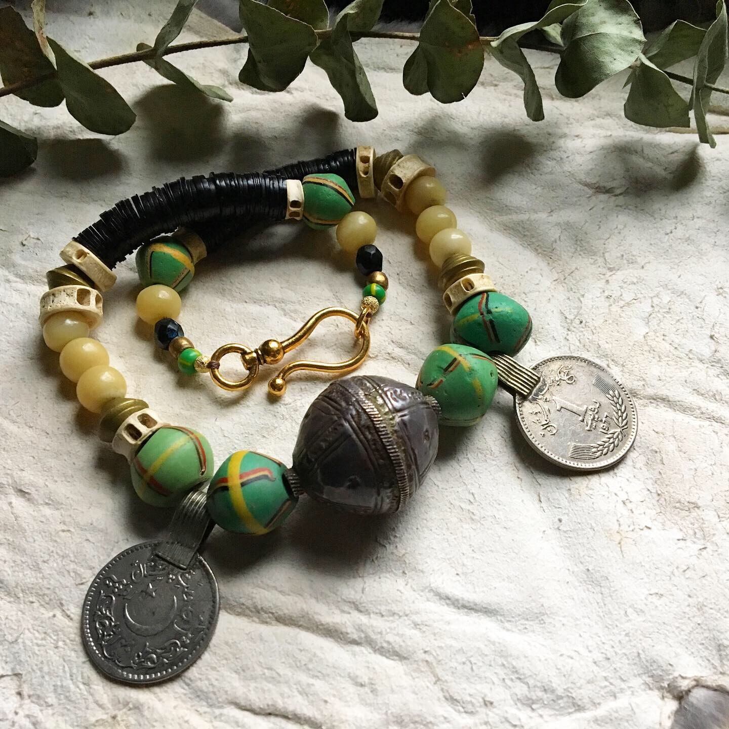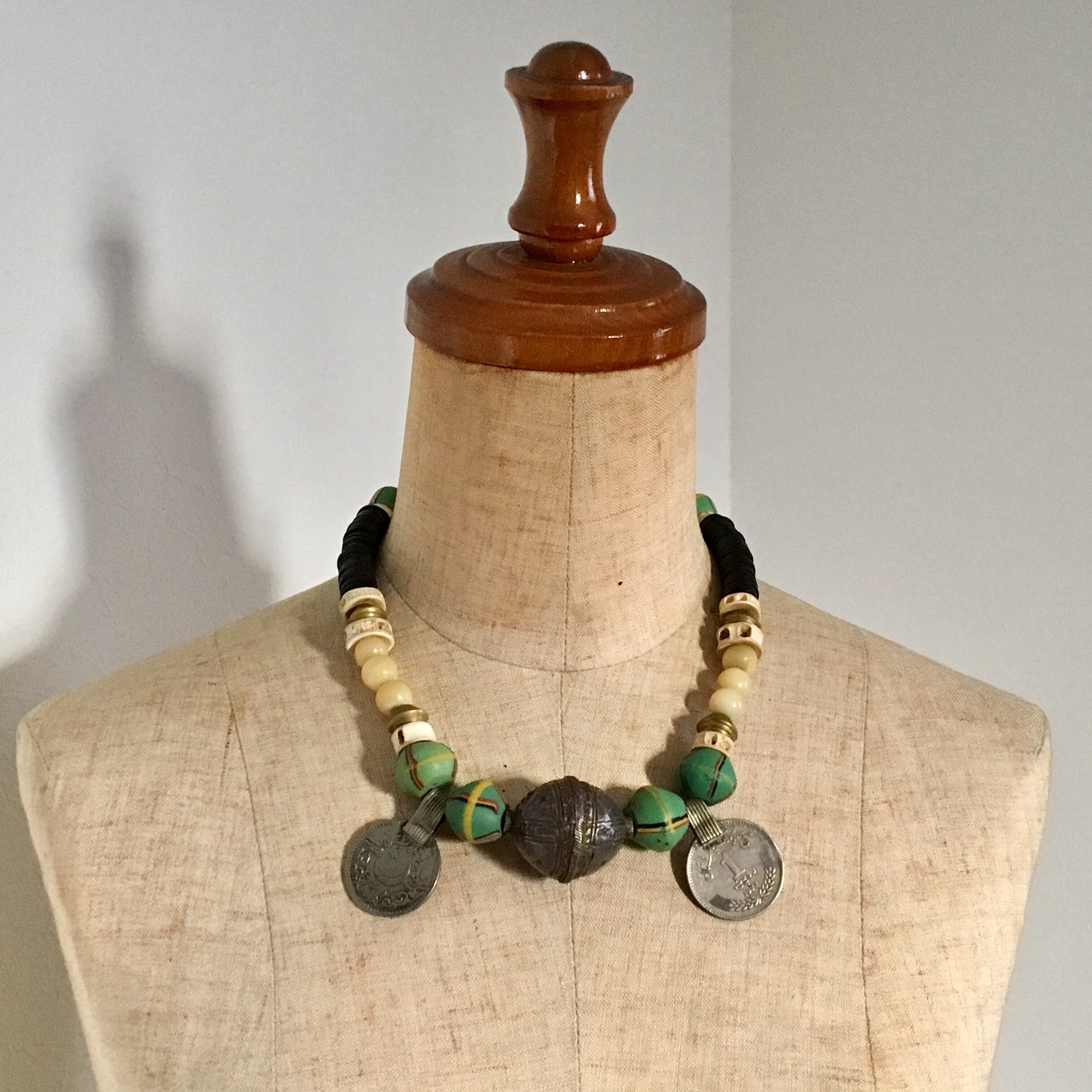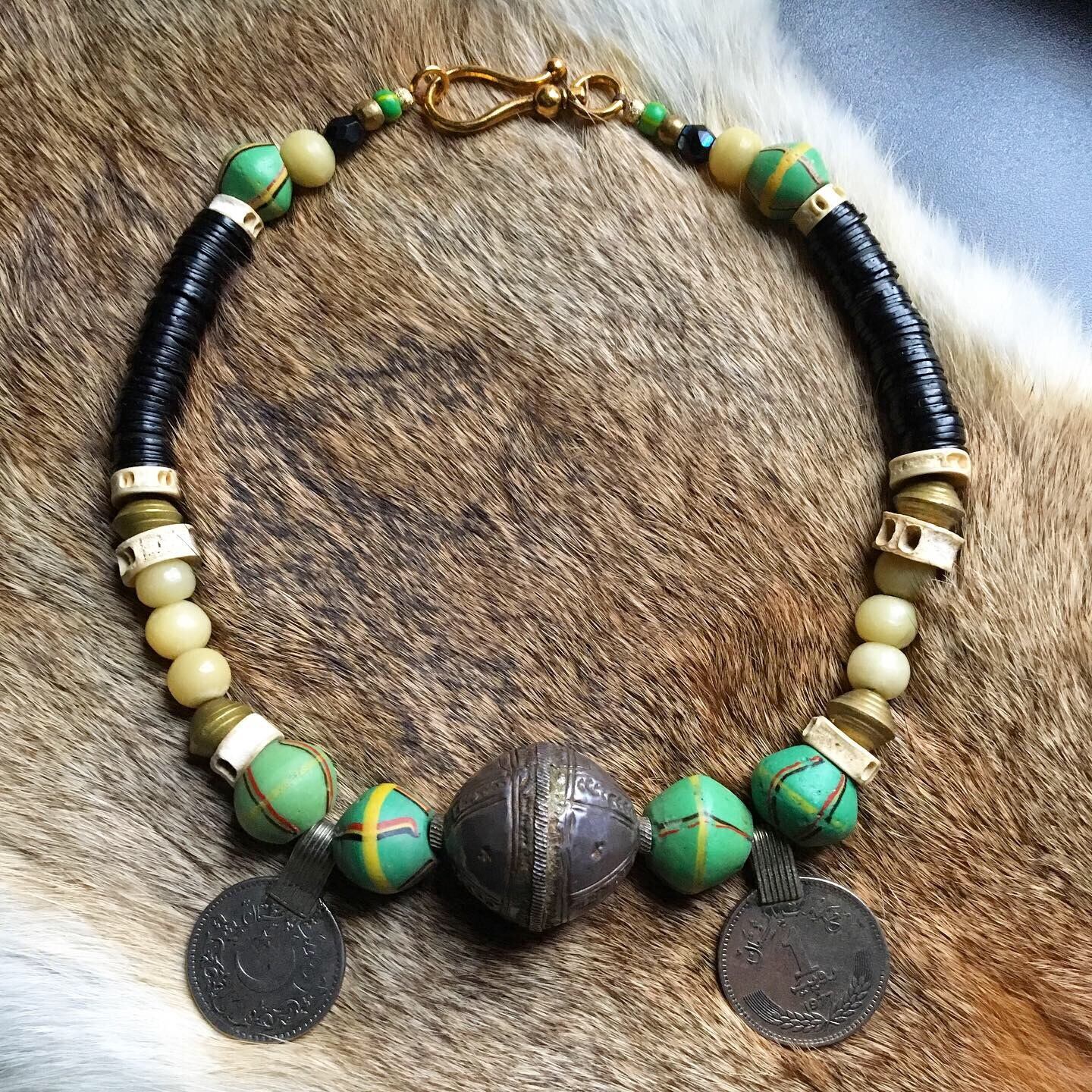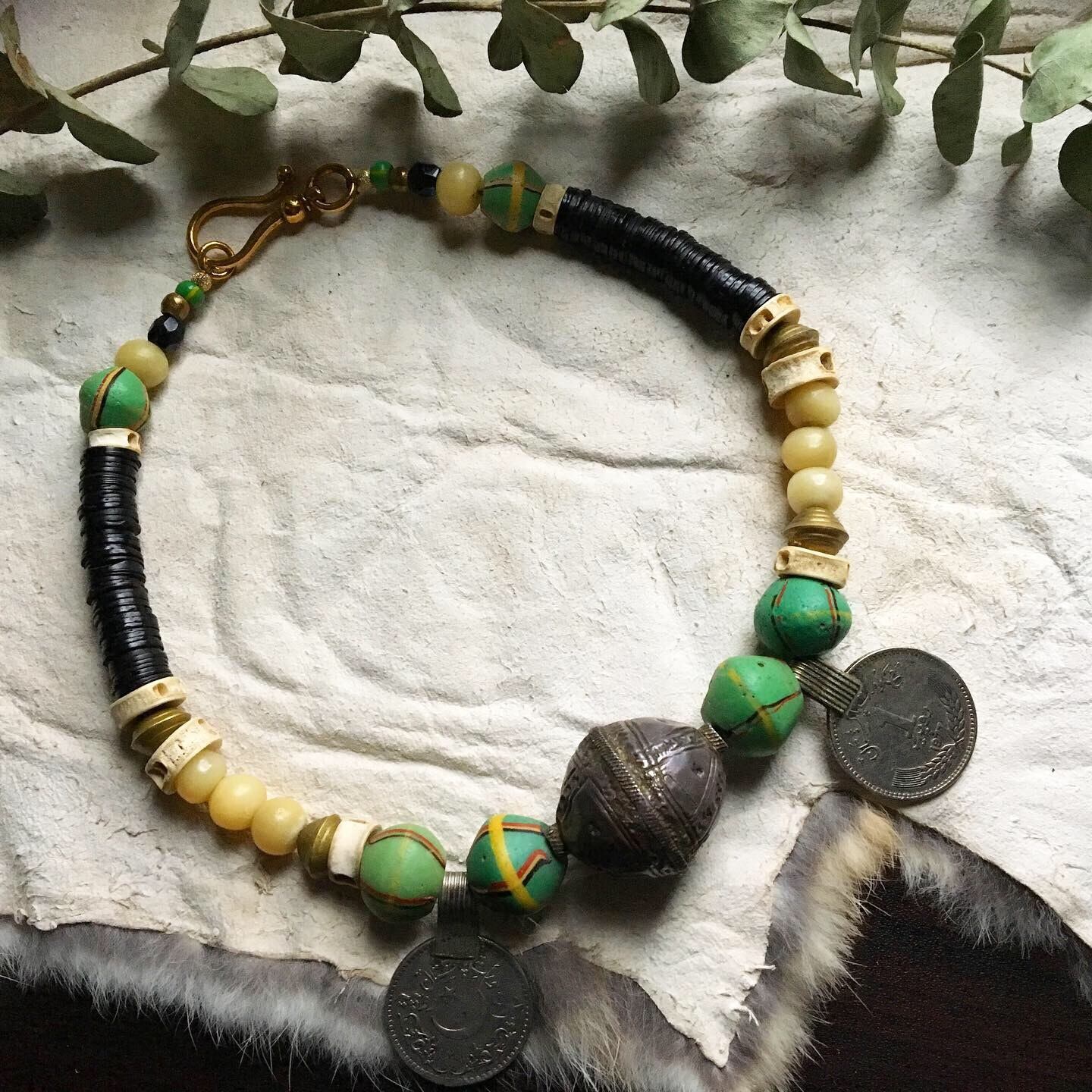 アフリカンスタイルのトライバルネックレス作品。アンティーク1900年代初頭ベネチア産、トレードキングビーズ、名前の由来のとおり、王族や位の高い人が身につけていたといいます、金と同様の価値で取引もされていたそうです。にアンティークアフリカンシルバー(中身は空洞の為、意外に軽い)、アフガニスタンコイン、レコード盤ビーズ、魚骨、骨ビーズを使用。