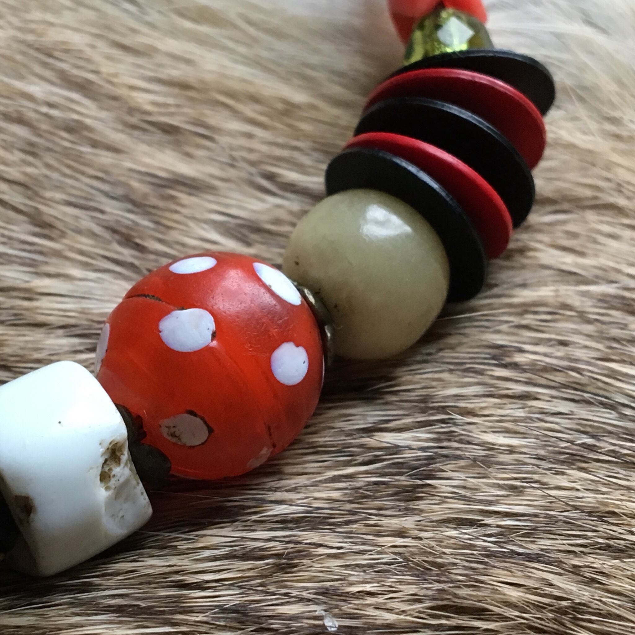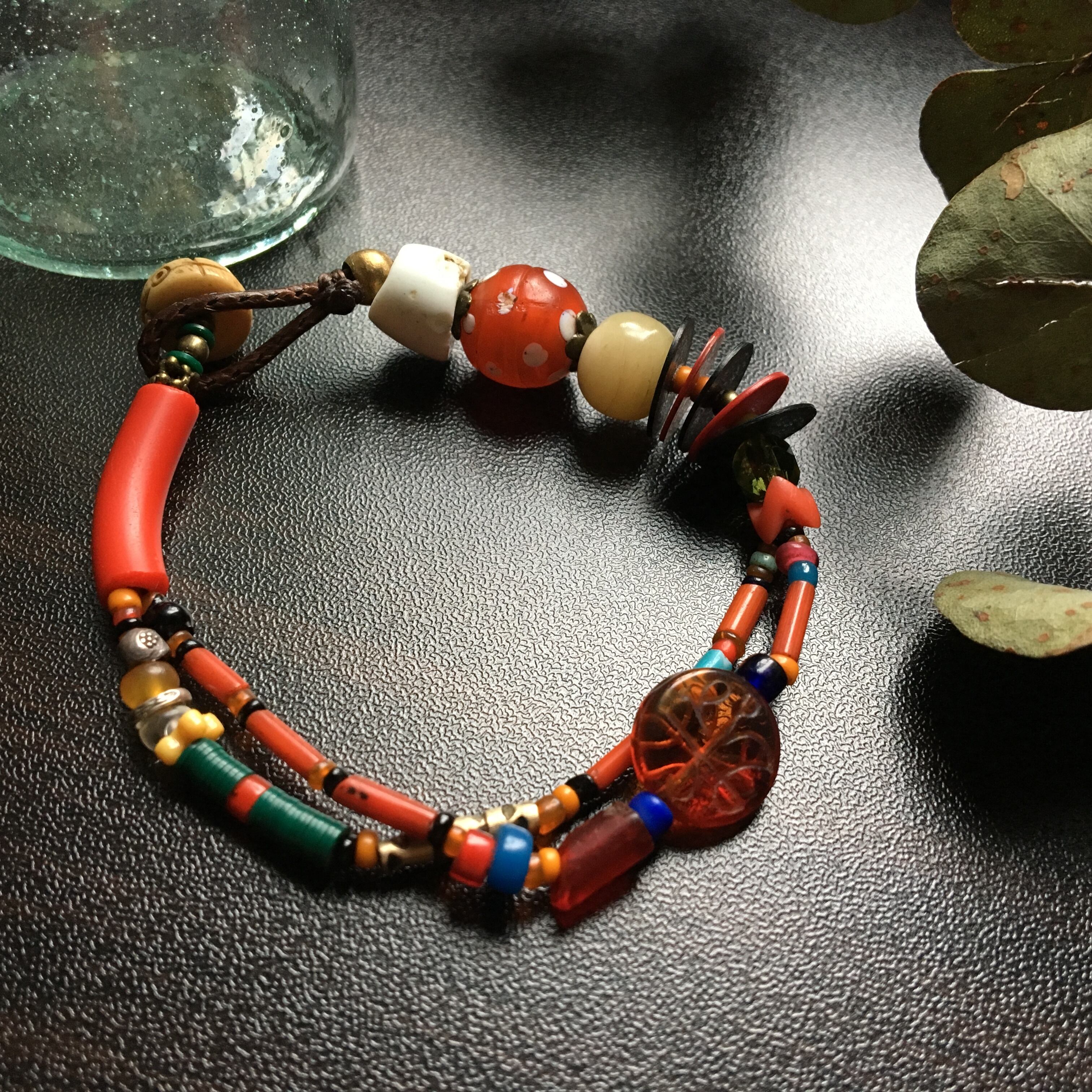 1900年代アンティークベネチア産マルチカラービーズ、アンティークボヘミアンビーズ、スネーク、エルボー、ハッジ、フラワービーズ、シードビーズ、琥珀ビーズ、骨ビーズ、アフリカンブラス、カレンシルバー、レコード盤ビーズ、留め具にはビンテージヤクボーンを使用している為、身に付けやすいのが特徴です。見ていて楽しくなります♫