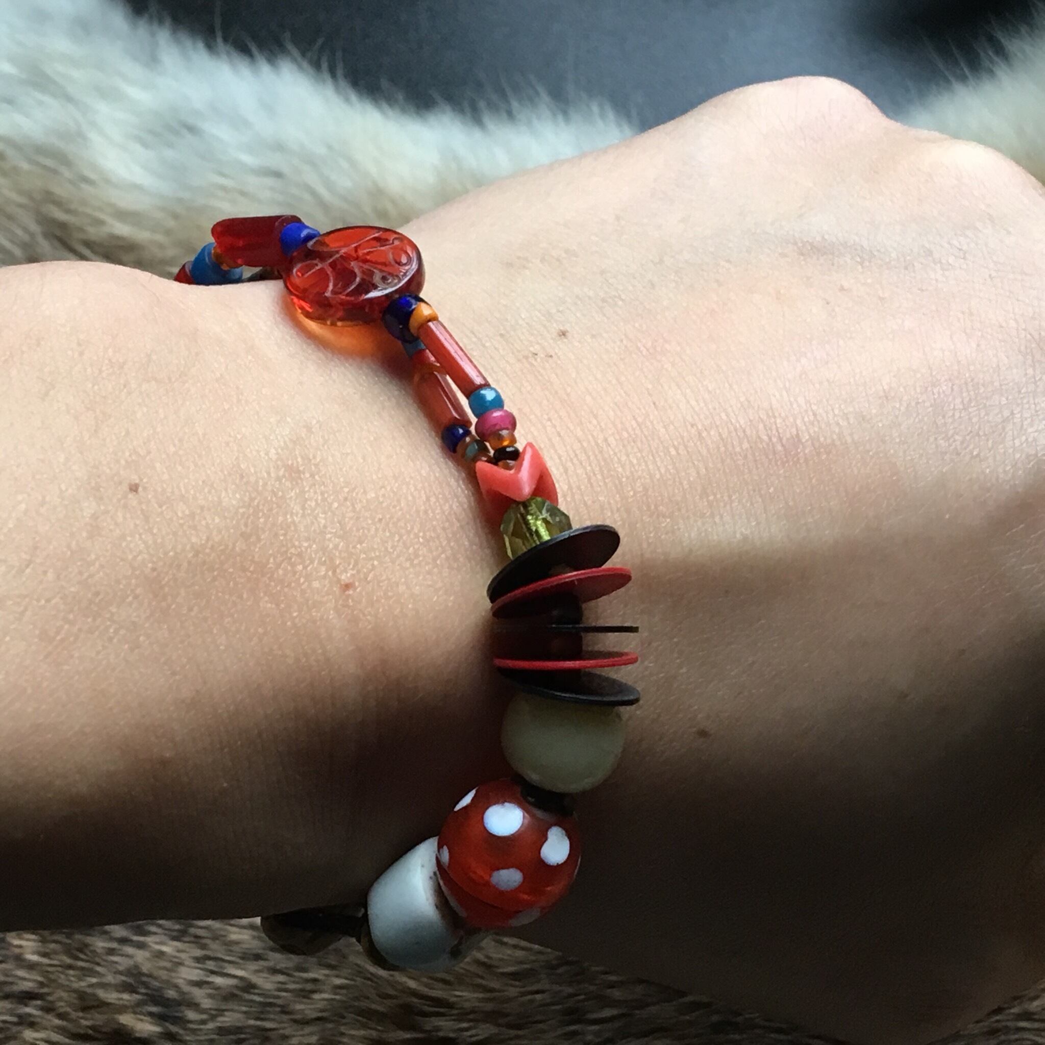 色んな素材を使ってとても楽しい気分にしてくれます。楽しめるトライバルブレスレット作品に仕上げました‼︎