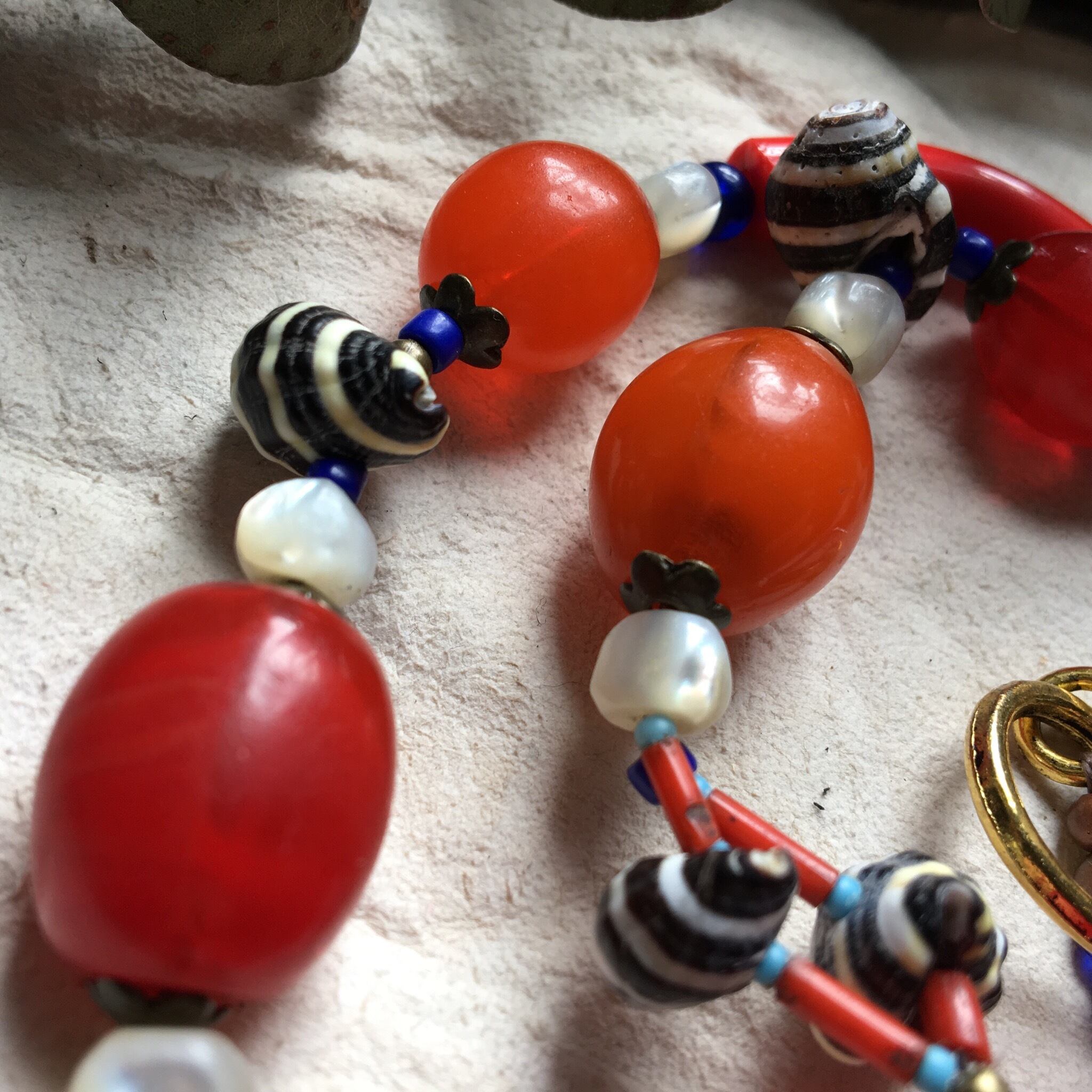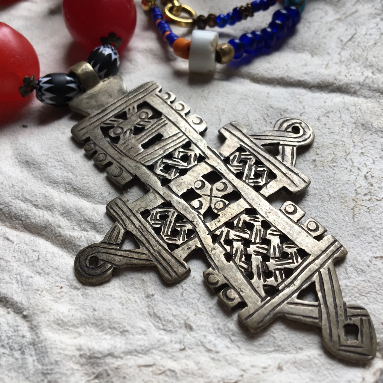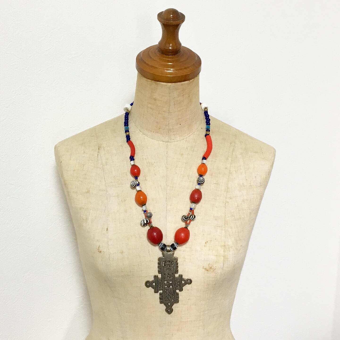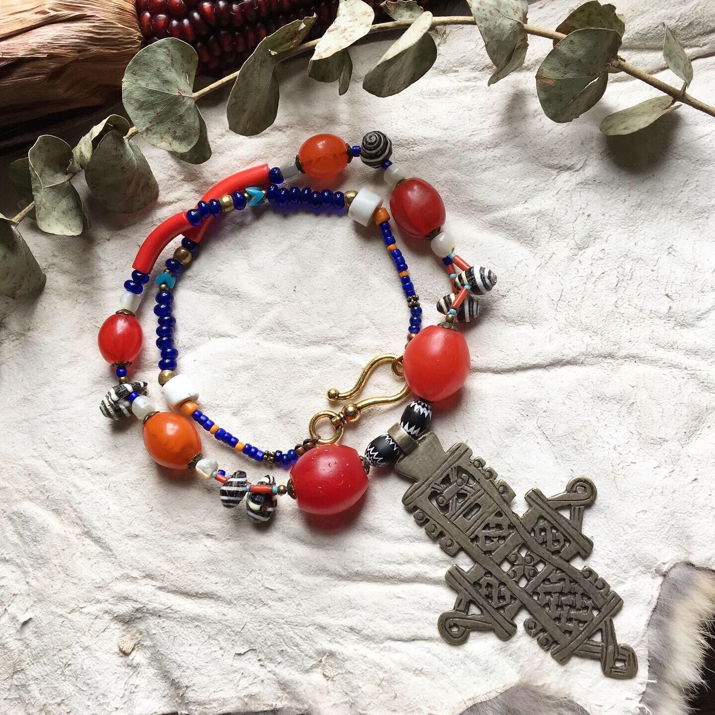 アンティークエチオピアクロス、卵型のボヘミアンアンティークエチオピアンチェリー、ロザリオから取り出したアンティークマザーオブパール、アンティークビルマブルービーズ、アンティークエルボーレッド、ヴェネチア産アンティークホワイトビーズ、貝殻、ヴェネチア産アンティークシリンダービーズを使用。