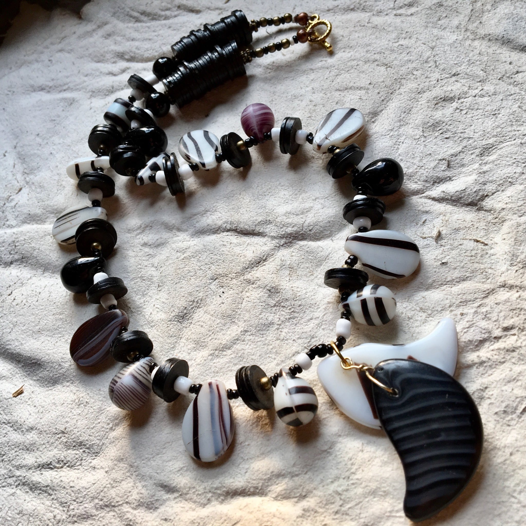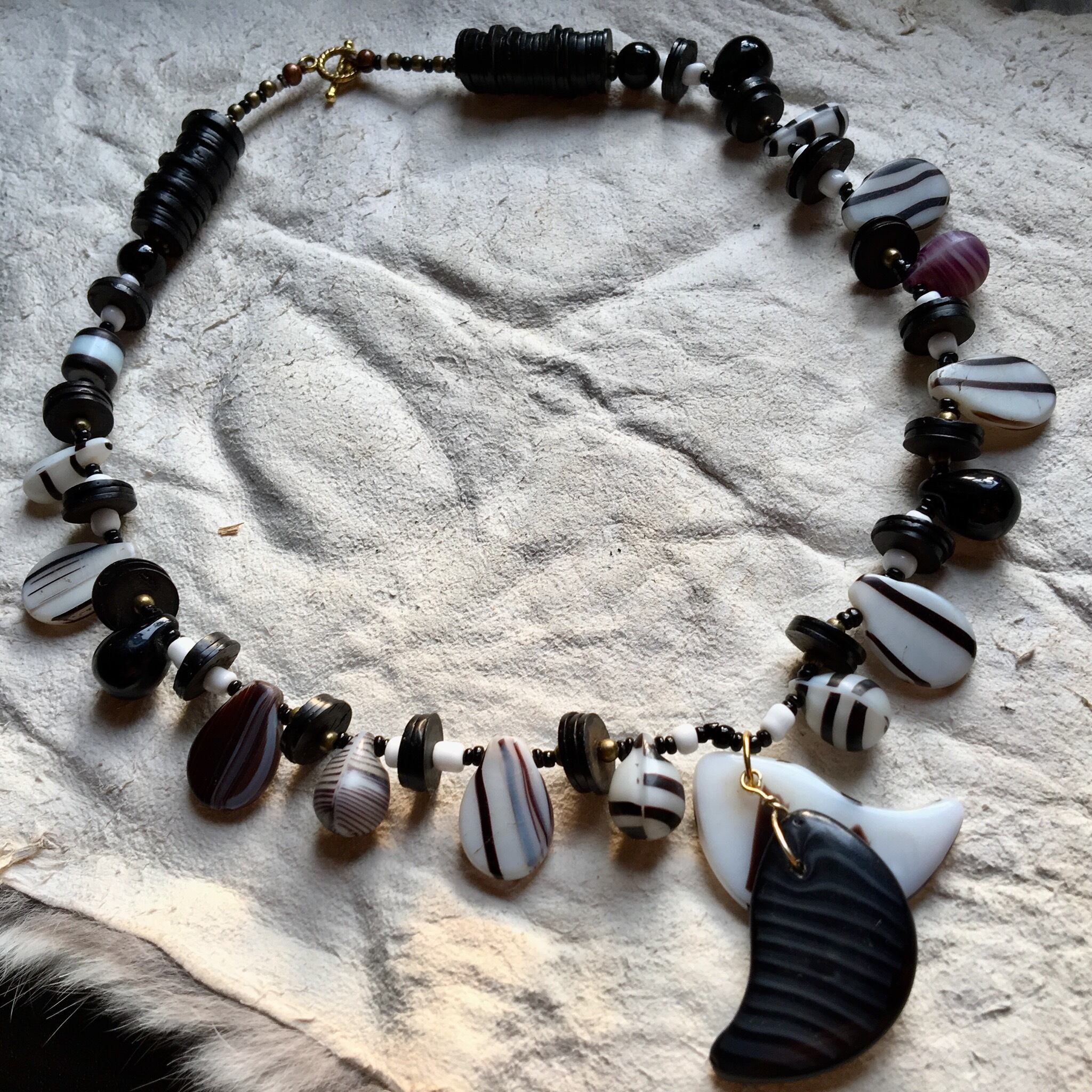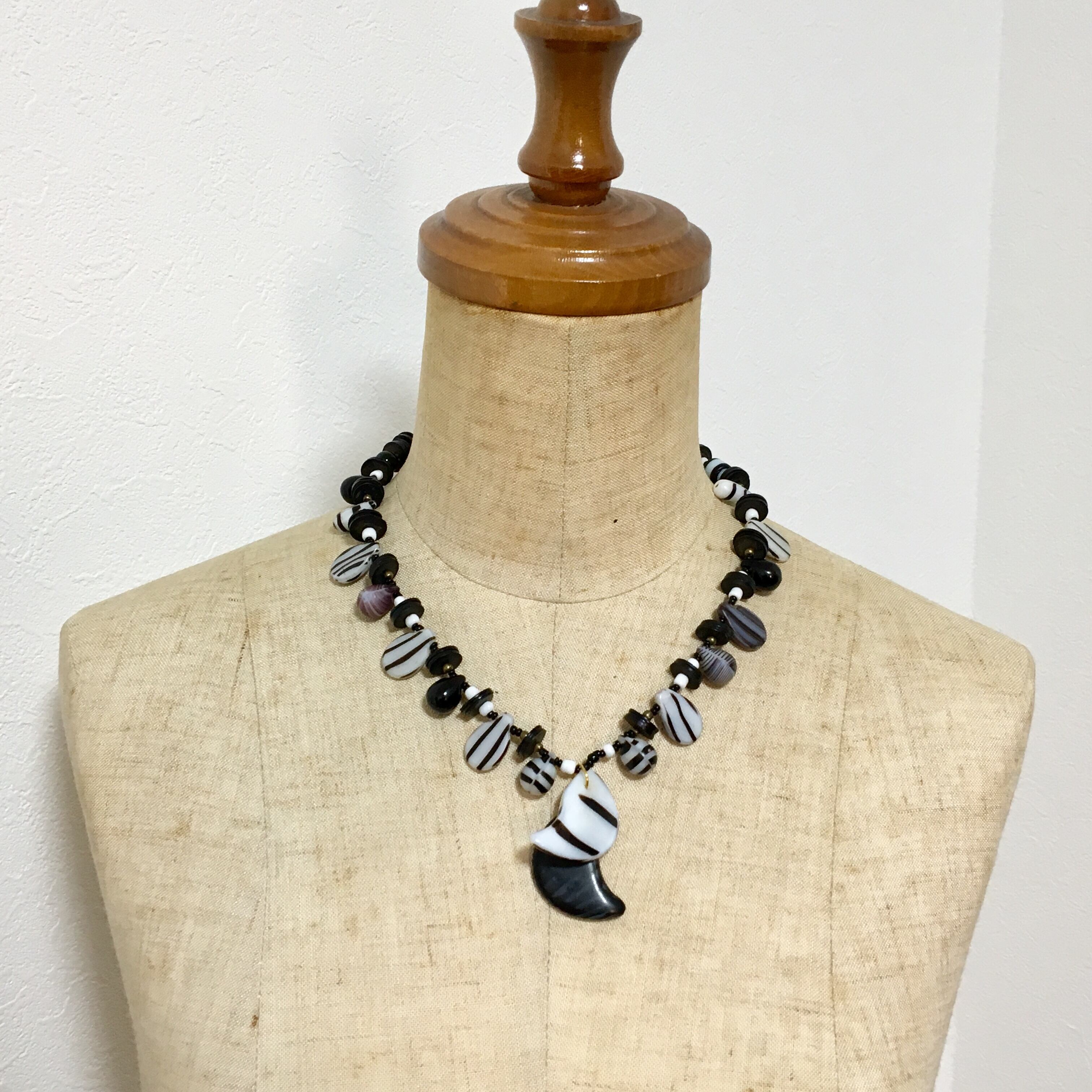 1900年代アンティークボヘミアンウェディングビーズのzebra模様で揃えたトライバルフォルムにモード感があるシックな仕上がりのネックレス作品。