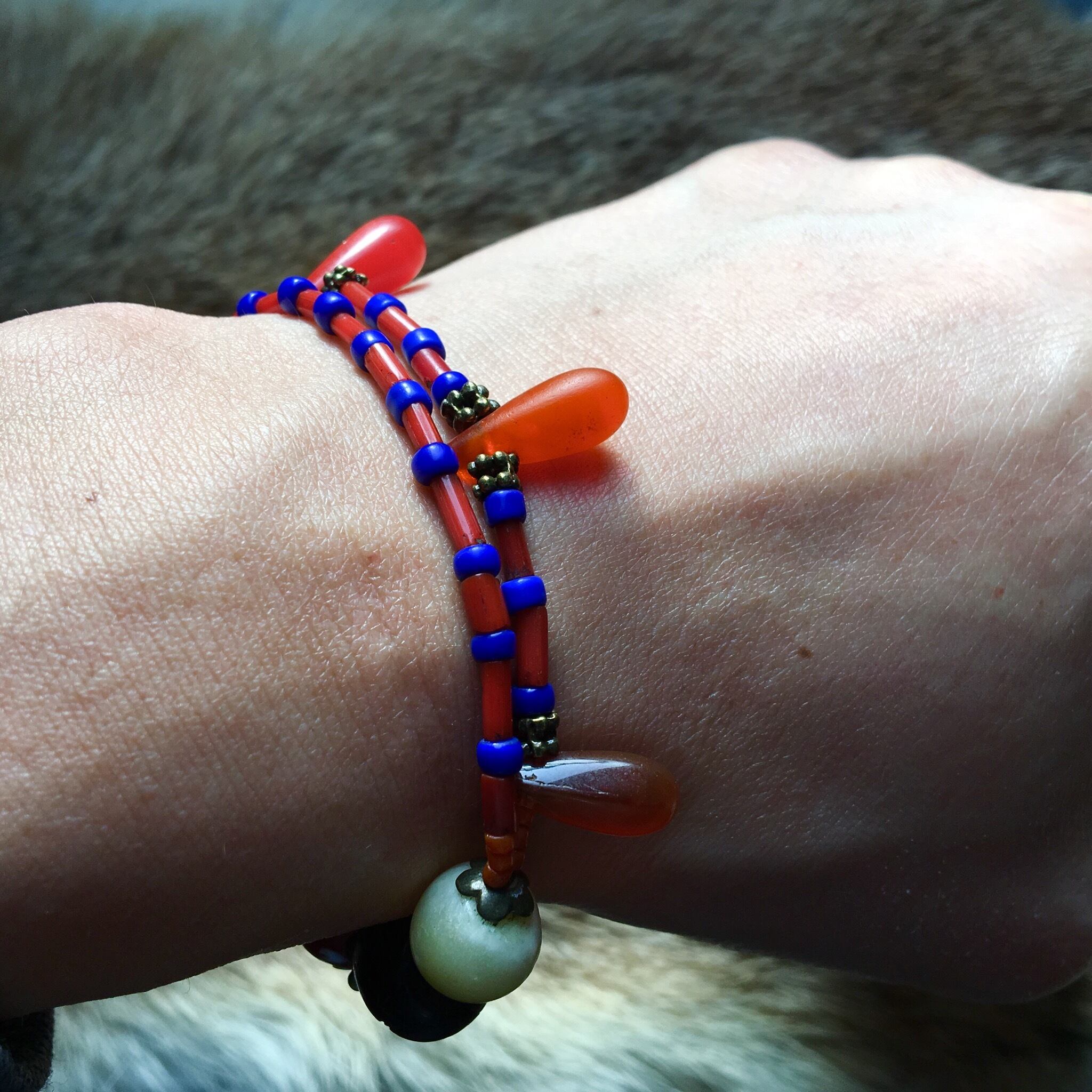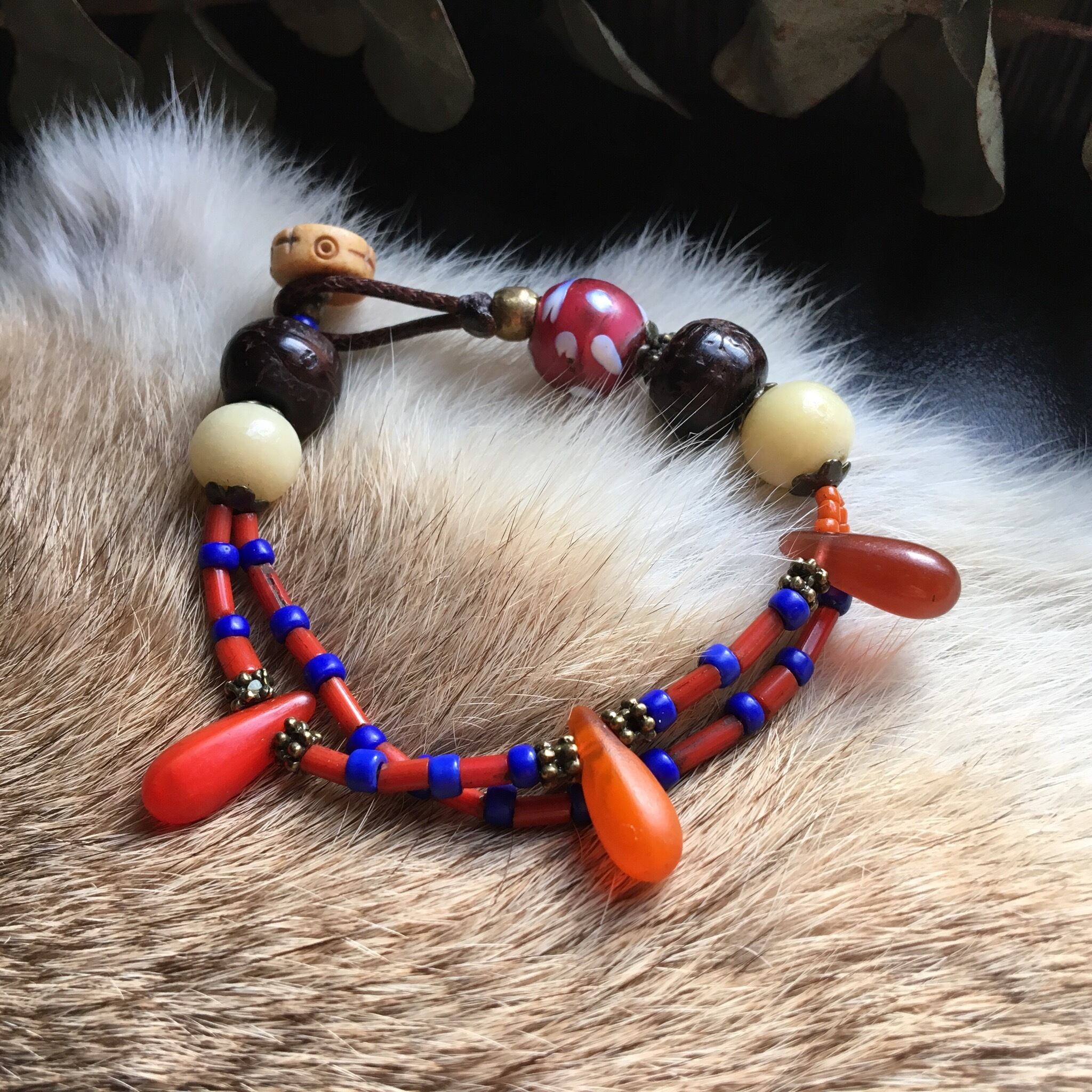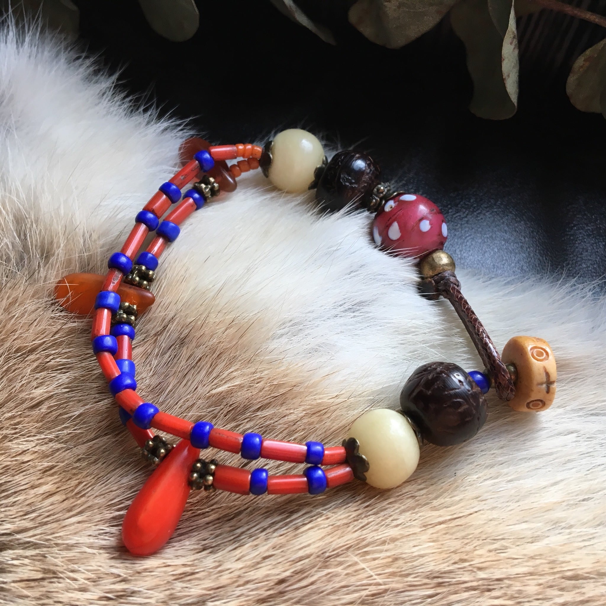 1900年代アンティークボヘミアンウェディングビーズ、アンティークベネチアスカンク、アンティークブルービーズ&シリンダー型、真鍮パーツ、菩提樹、骨ビーズ、留め具にはビンテージヤクボーンを使用した2連ブレスレット作品。