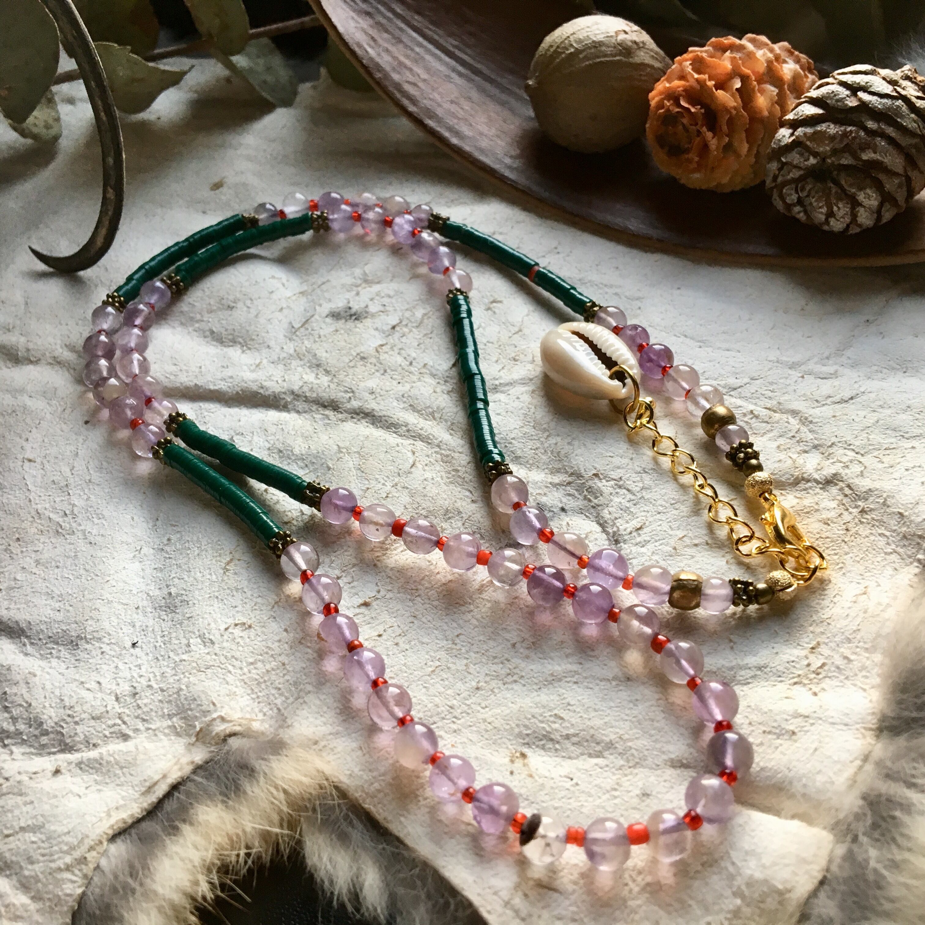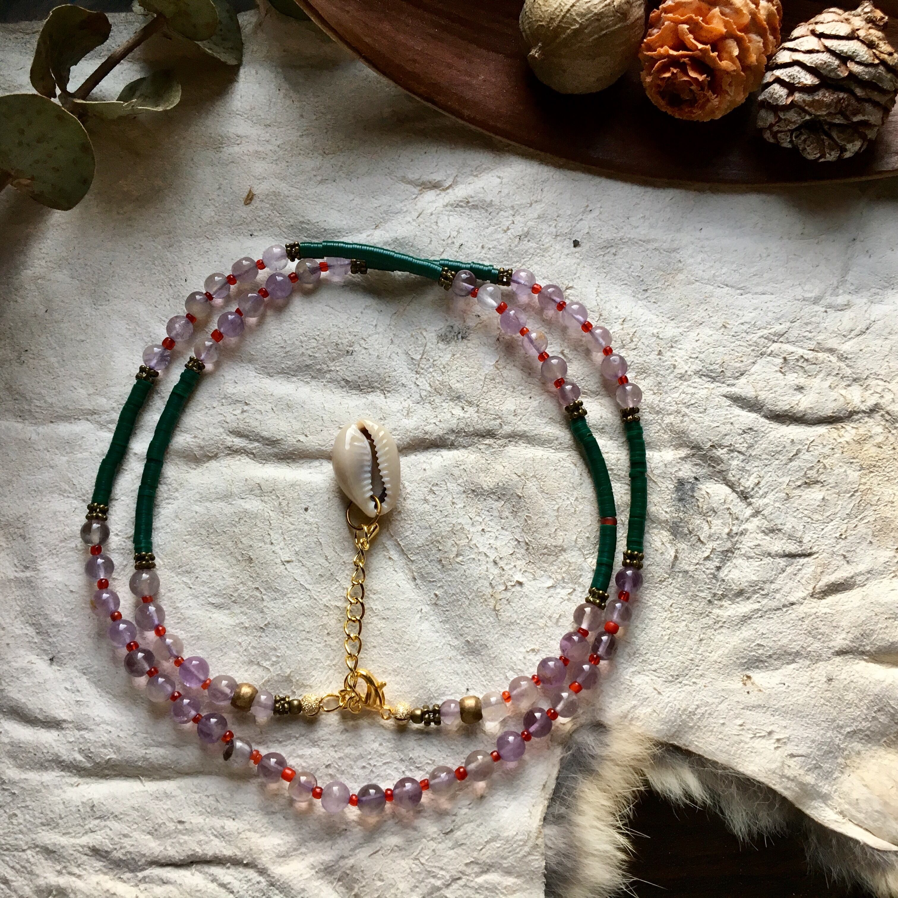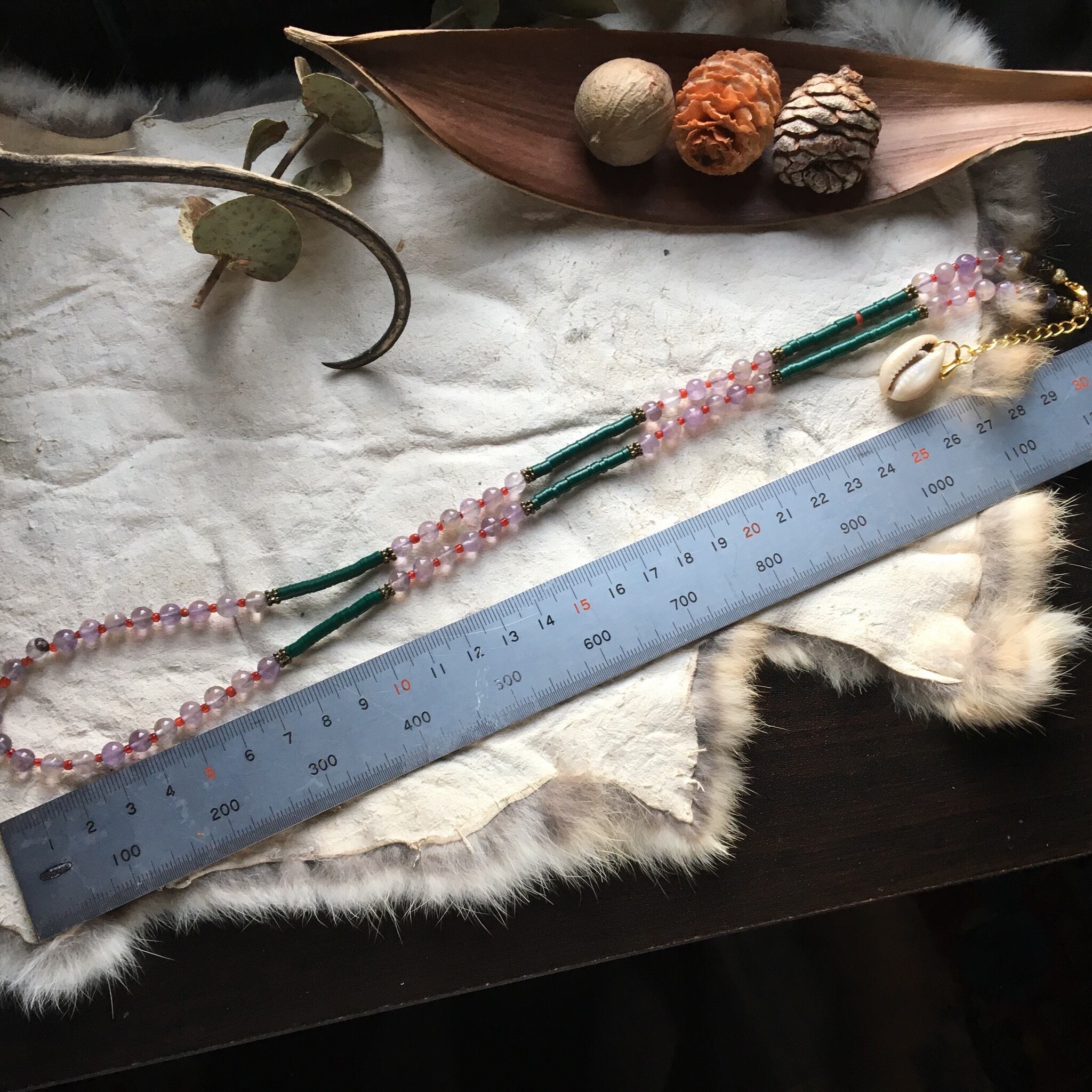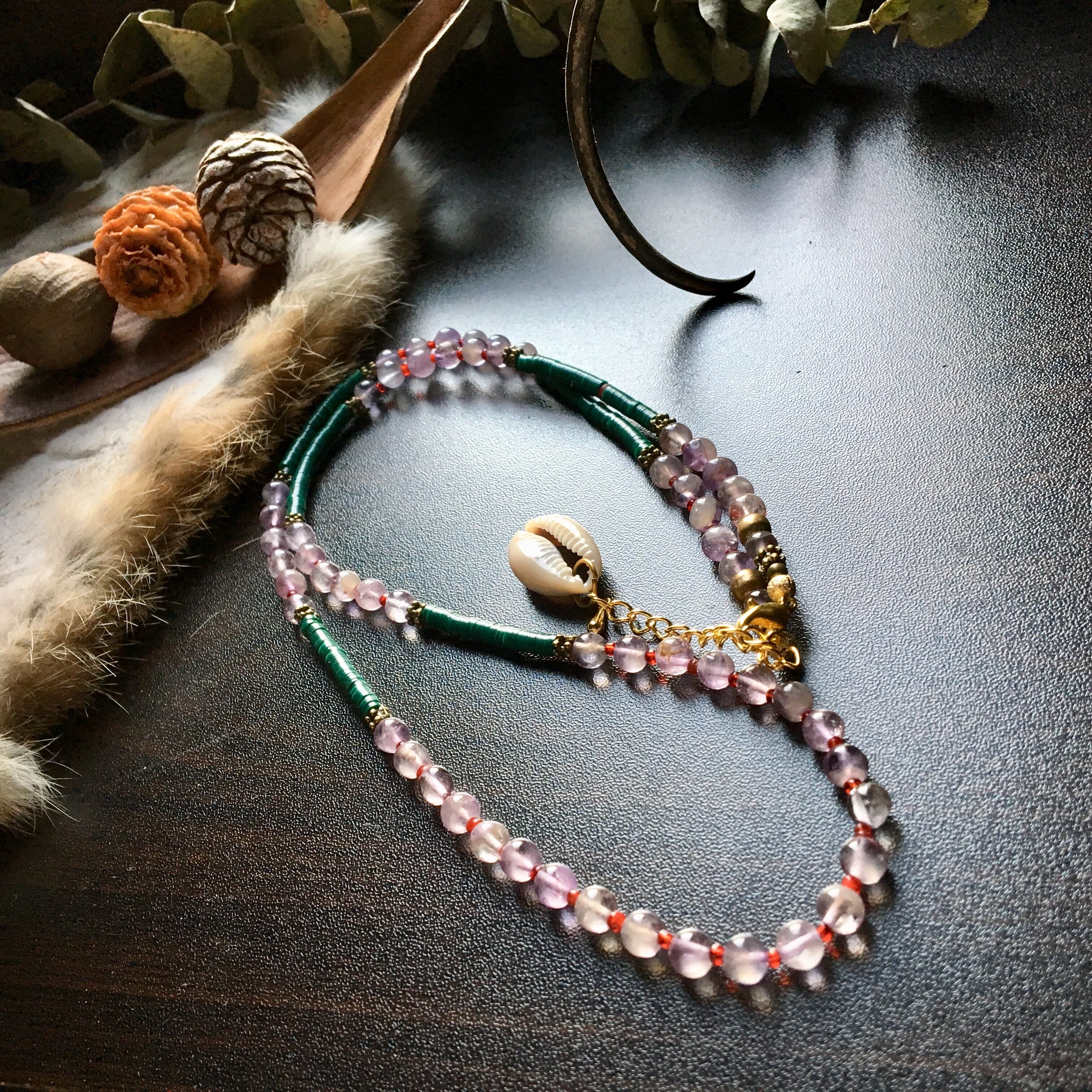 美しい輝きと歪さが美しいアメジストに1900年代アフリカレコード盤ビーズ、1900年代ベネチア産アンティークレッドシードビーズ、子安貝、ブラスを使用したロングネックレス作品。