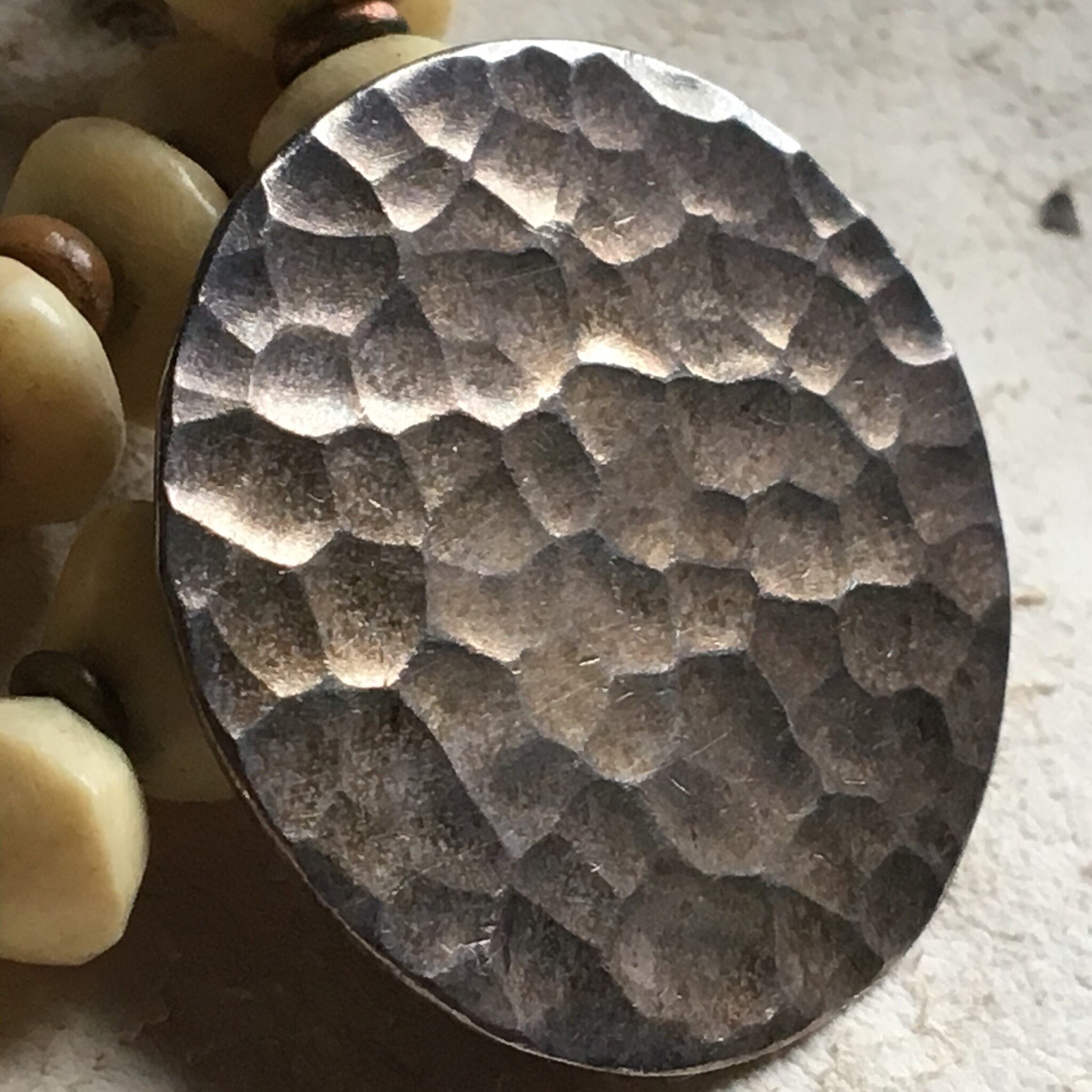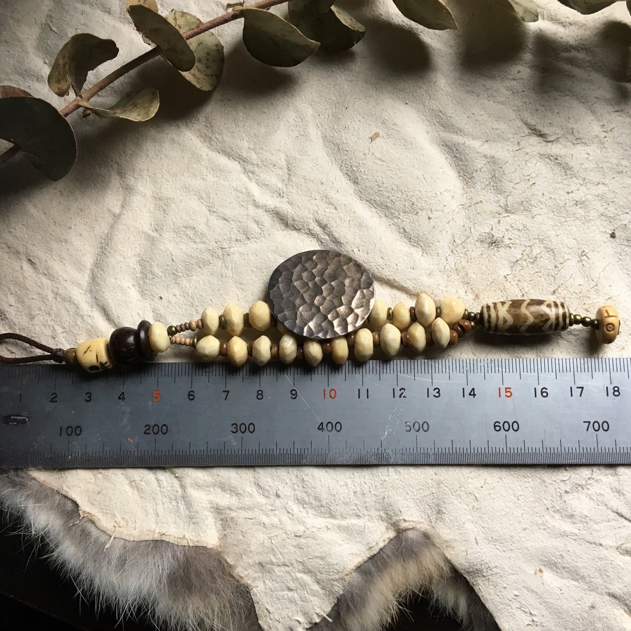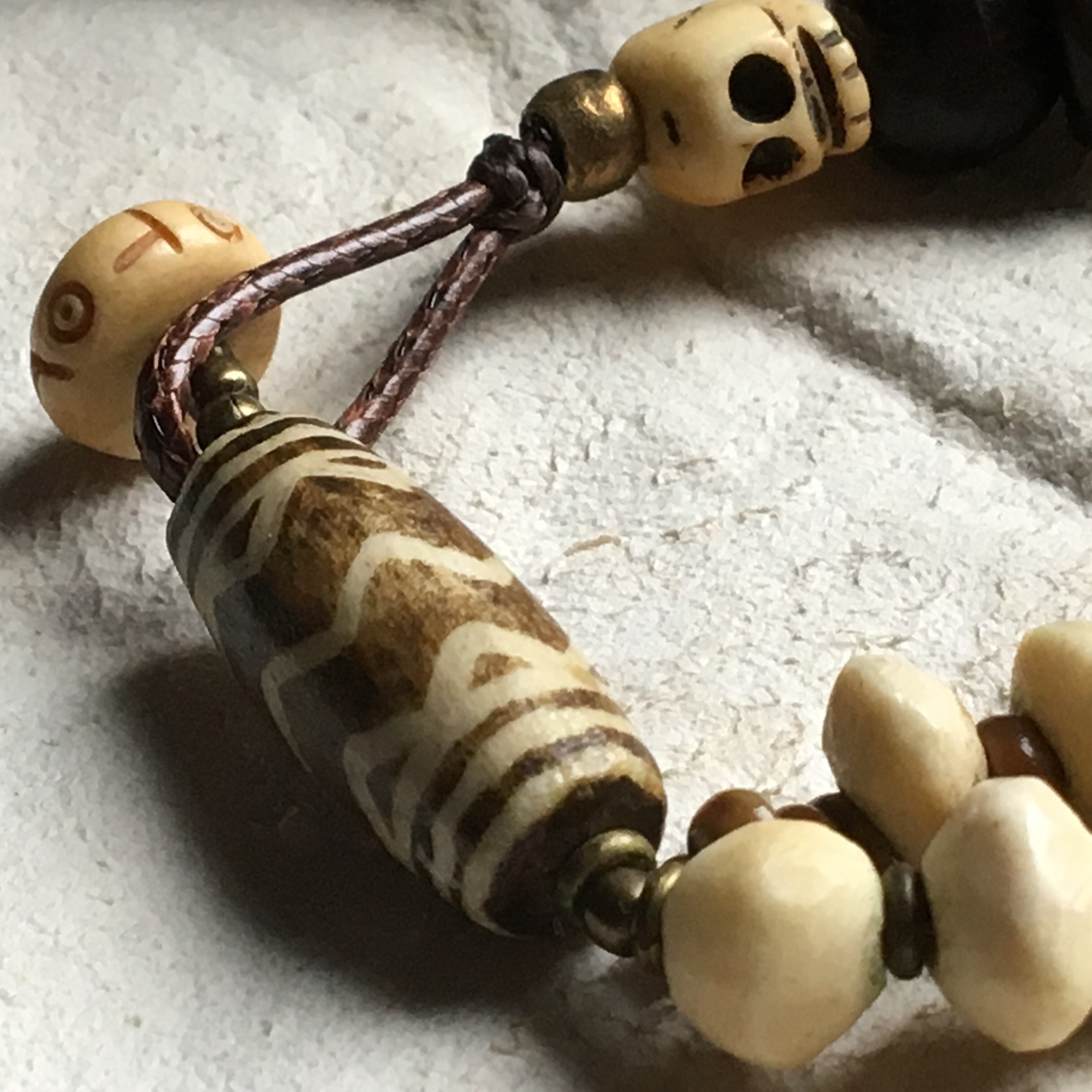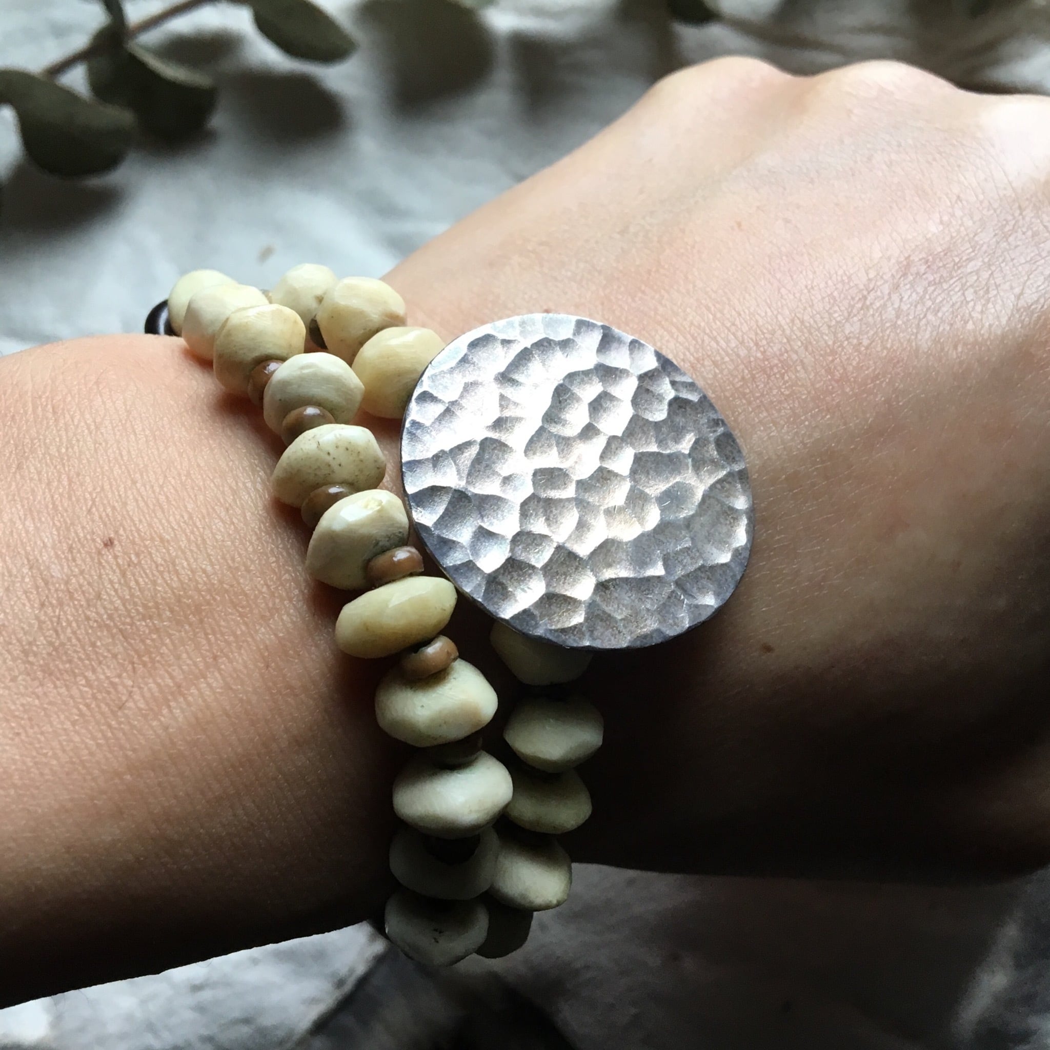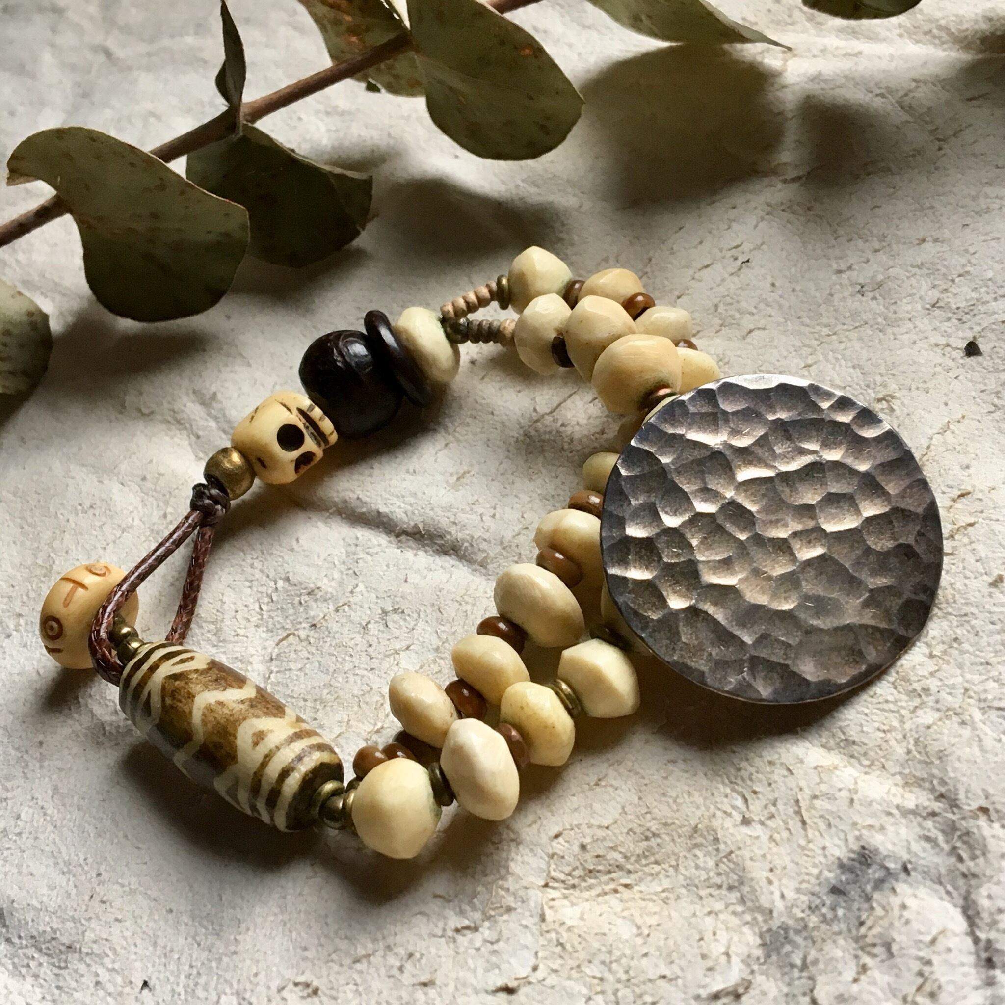 打ち付けが美しいカレンシルバーをTOPにソロバン型動物の骨、ビルマ_チン族のオパール化した椰子の木化石ビンテージプンテックビンテージ、オールドスカルボーン、ブラスの輪っかビーズ、現代菩提樹、留め具にはビンテージのヤクボーンを使用したブレスレット作品。