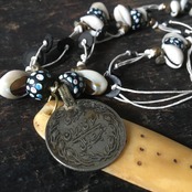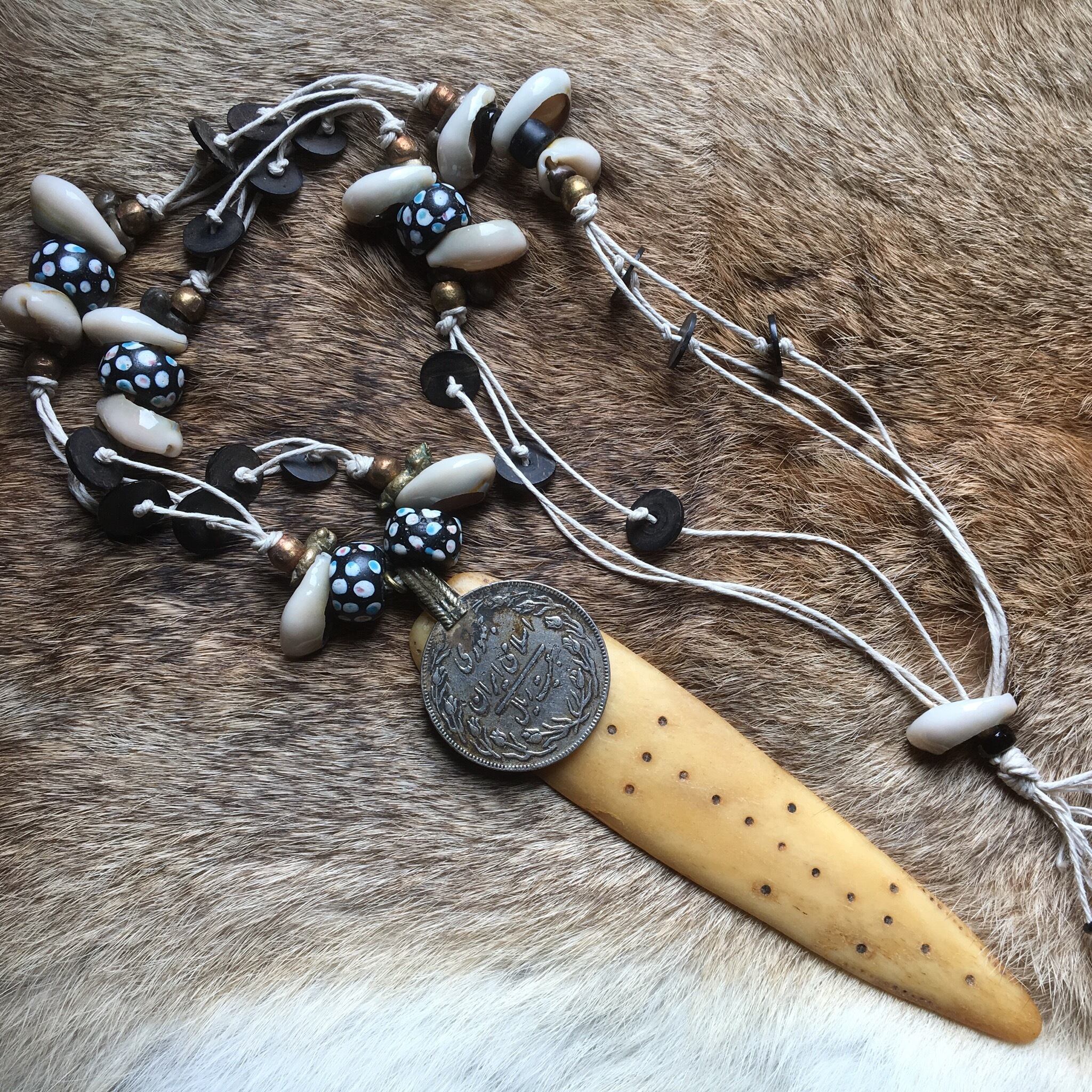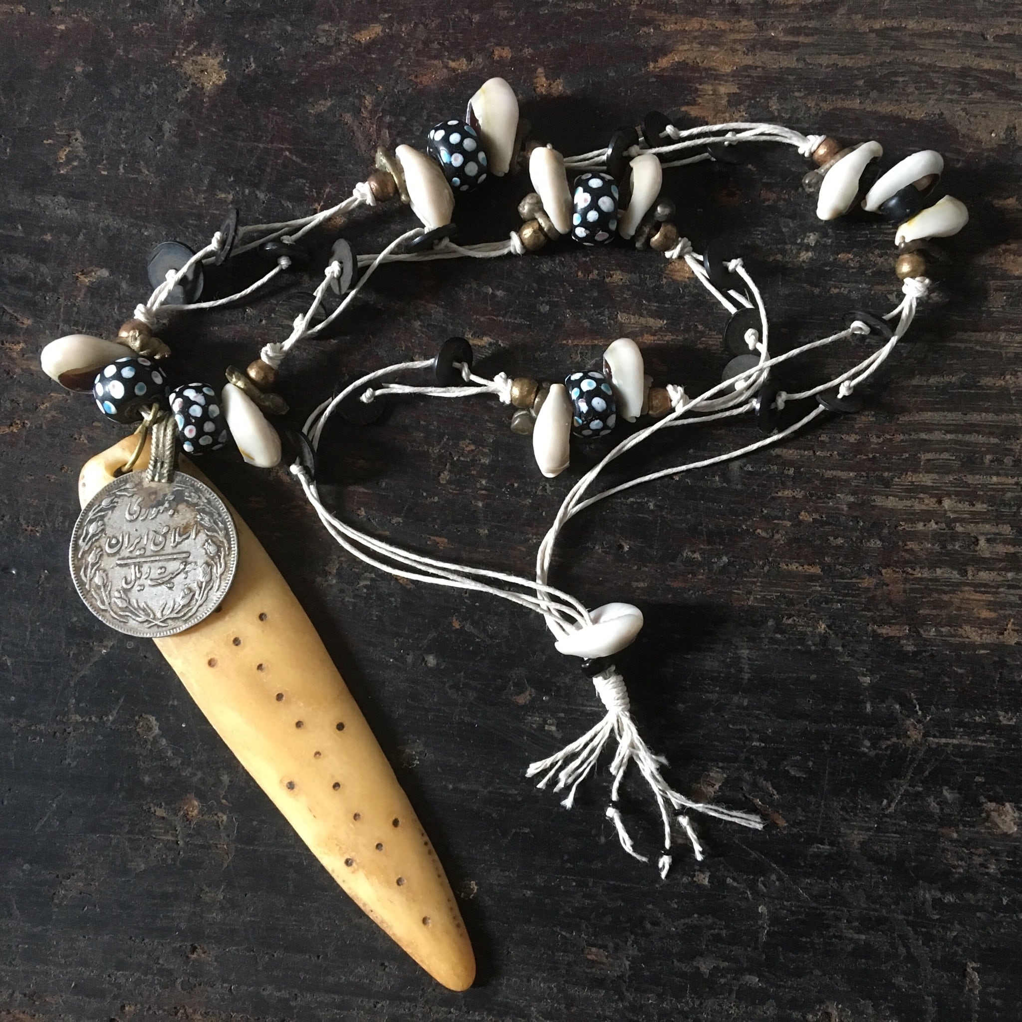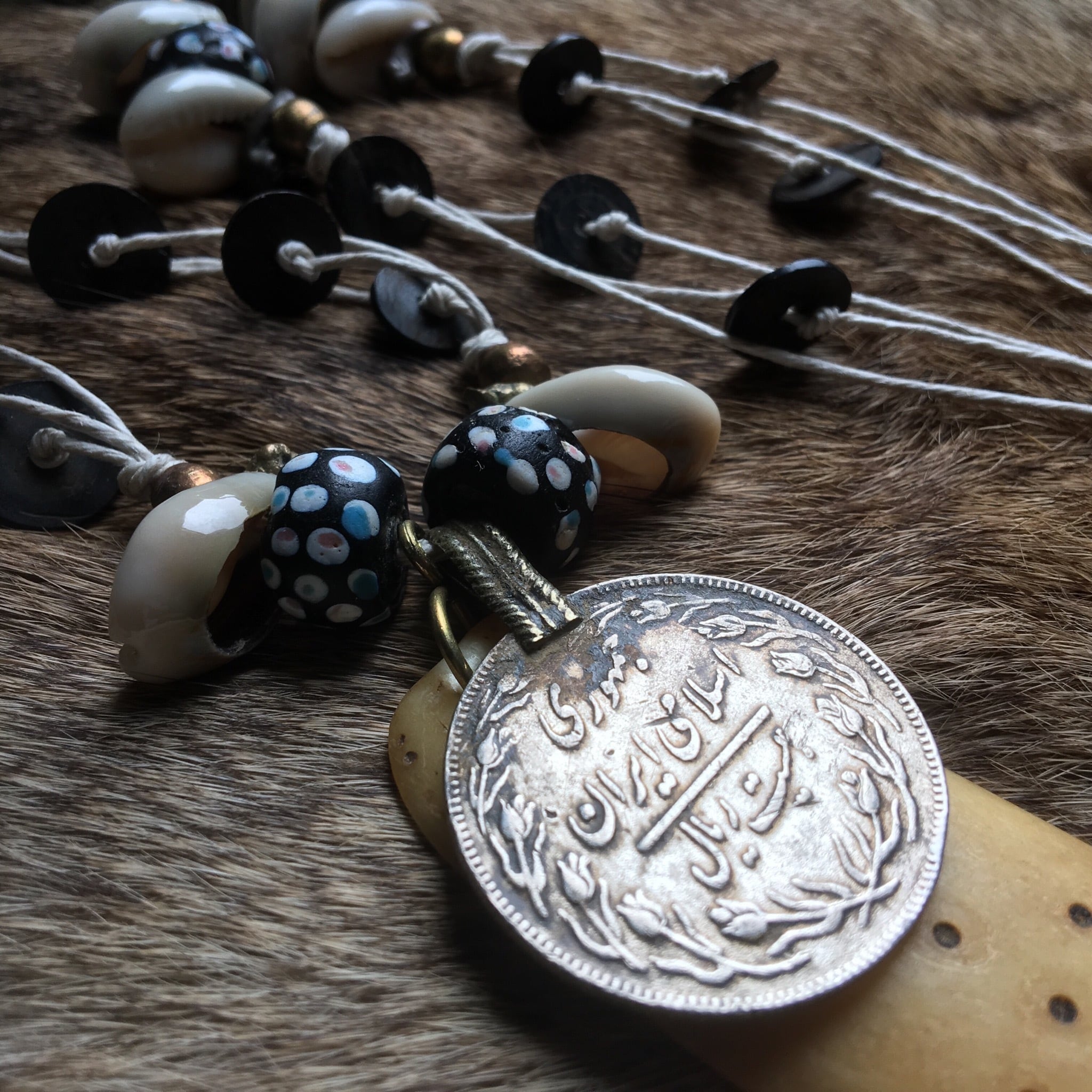 オールドアフガニスタンコインにアンティークボーンペンダント護符、オールドブラスチャーム、アンティークサウザンドアイビーズ、子安貝、アンティークレコード盤ビーズ、麻紐三連を使用したトライバルネックレス作品。