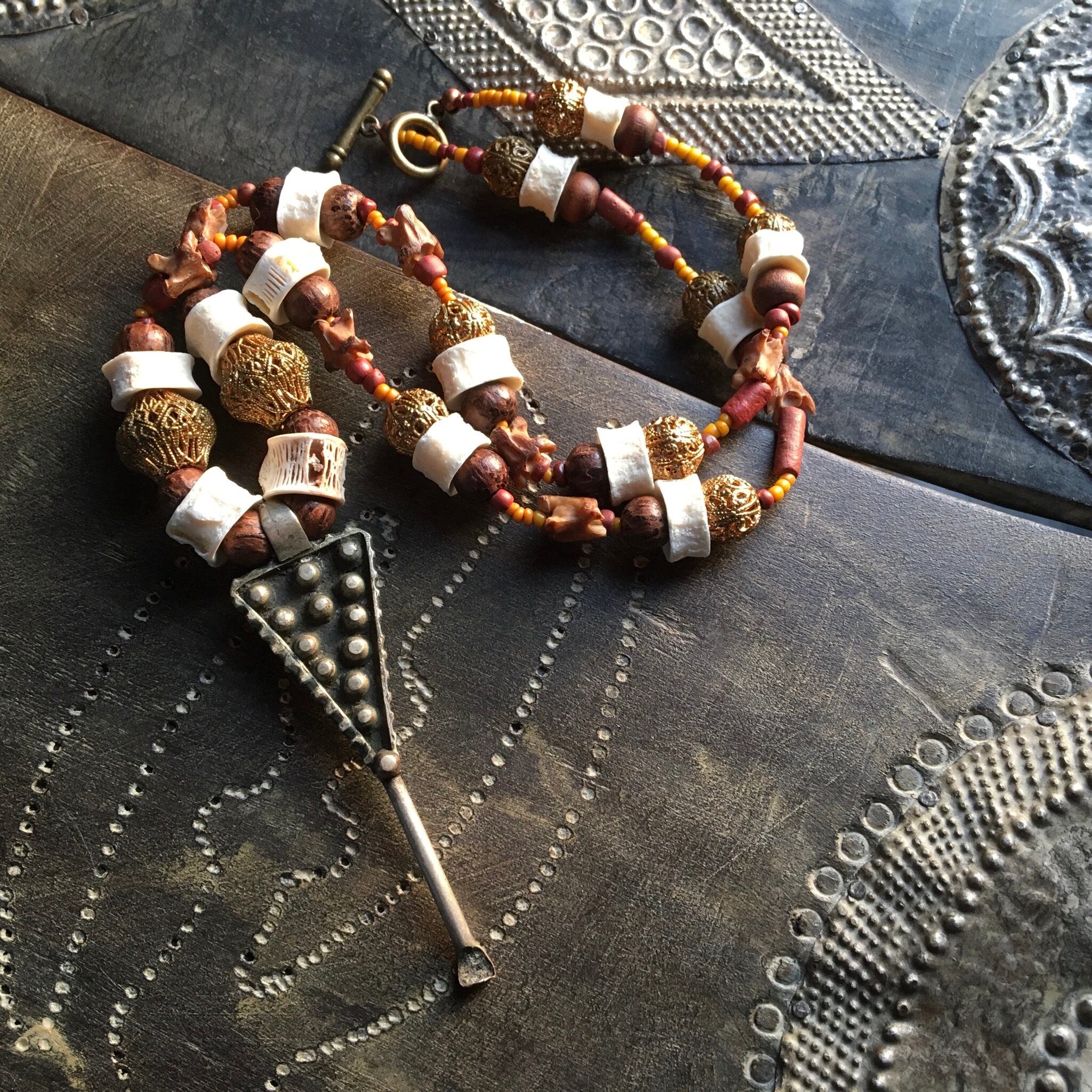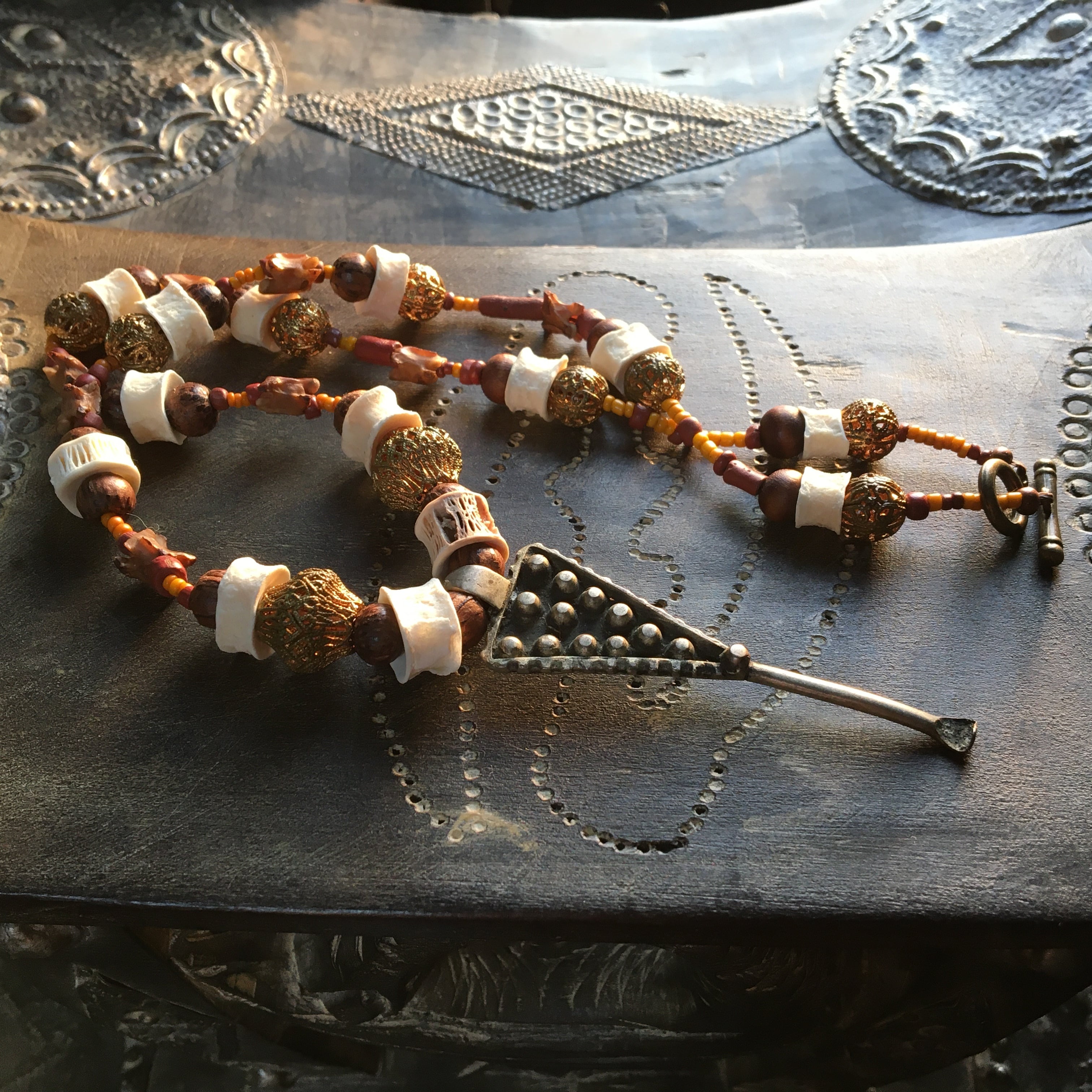 【No.382】古代インドパシフィックビーズ antique エチオピア 耳かきtop 蛇骨シードビーズ 魚の骨 ビンテージメタル ココナッツ トライバルネックレス